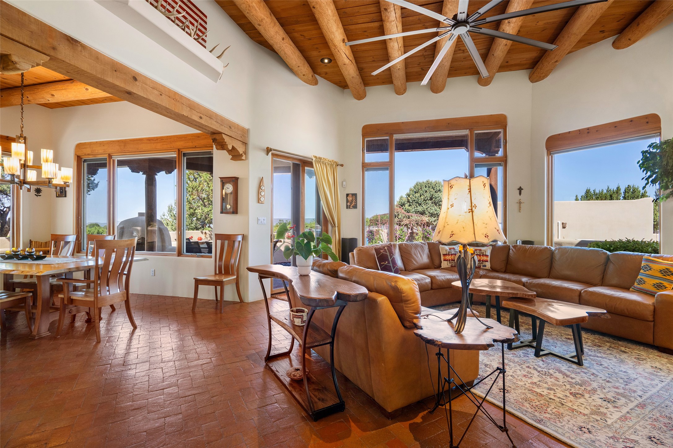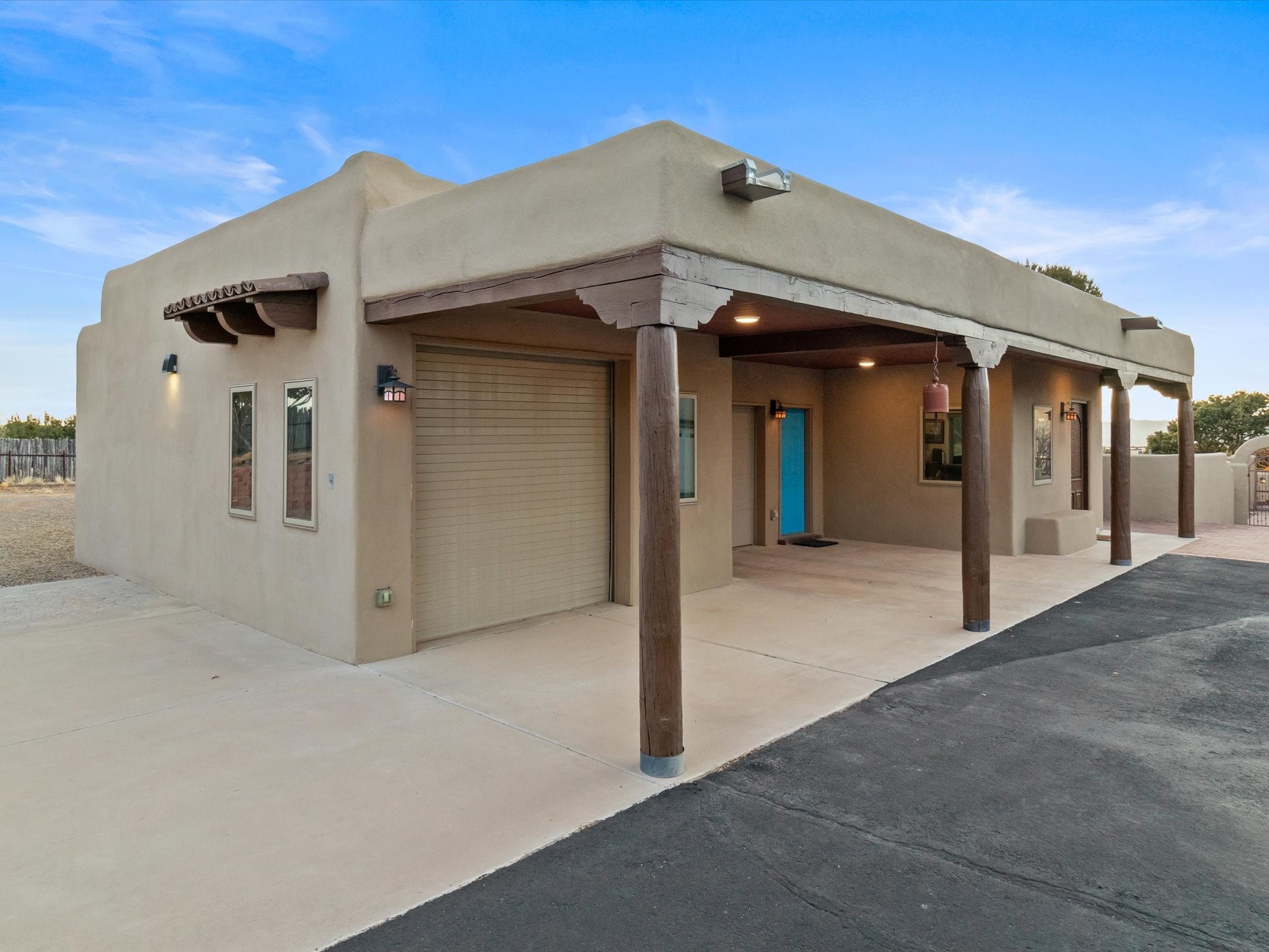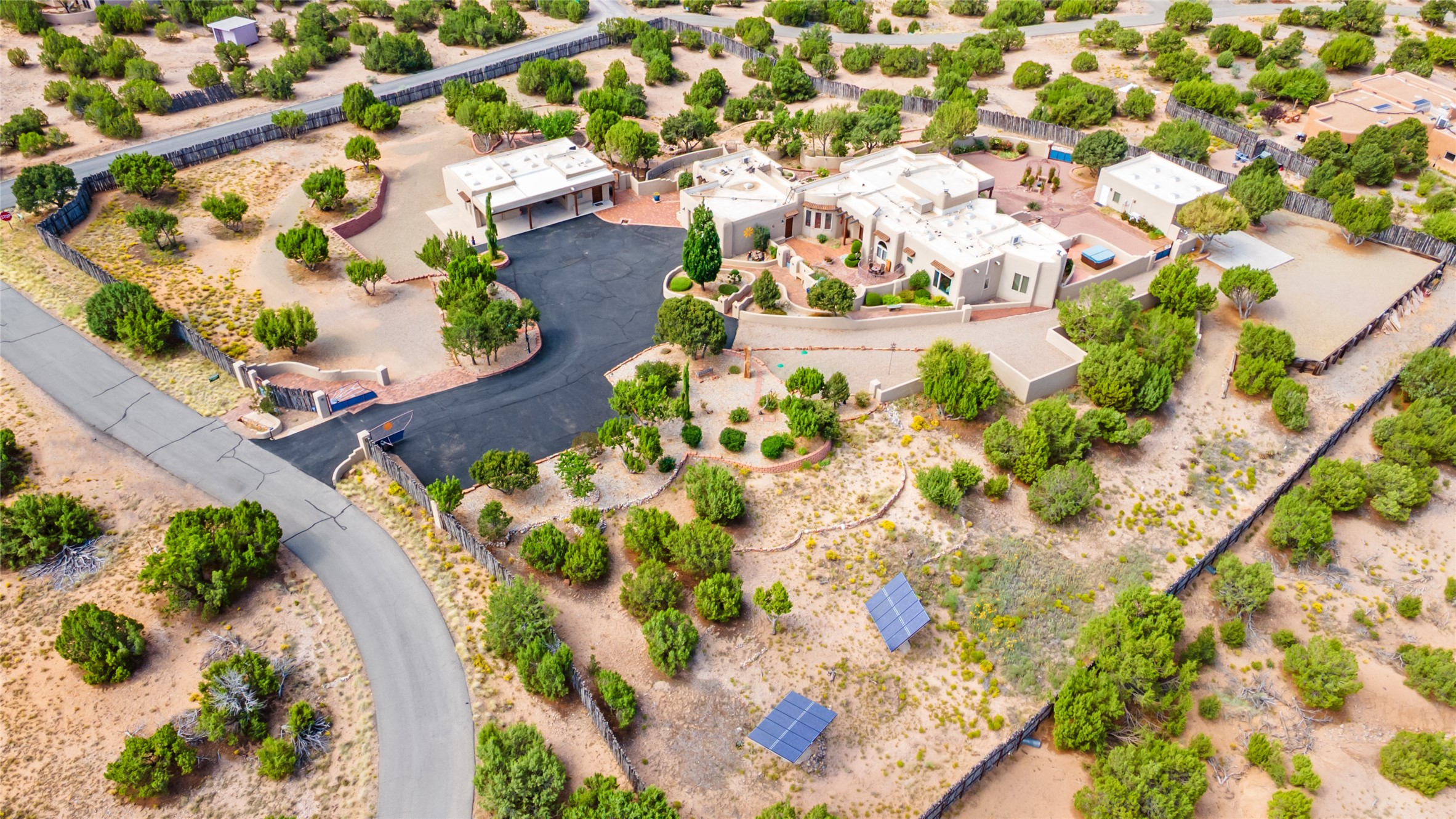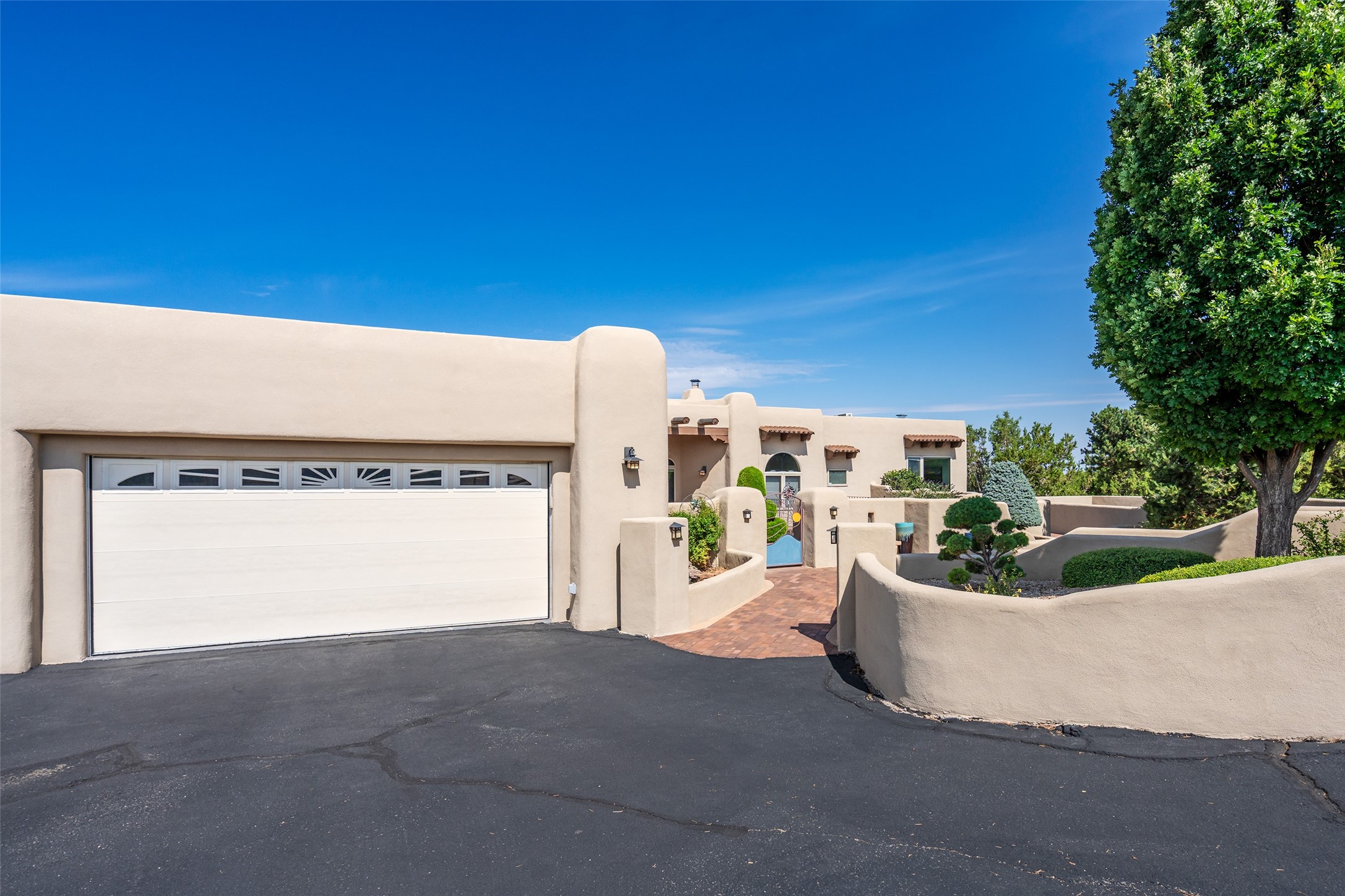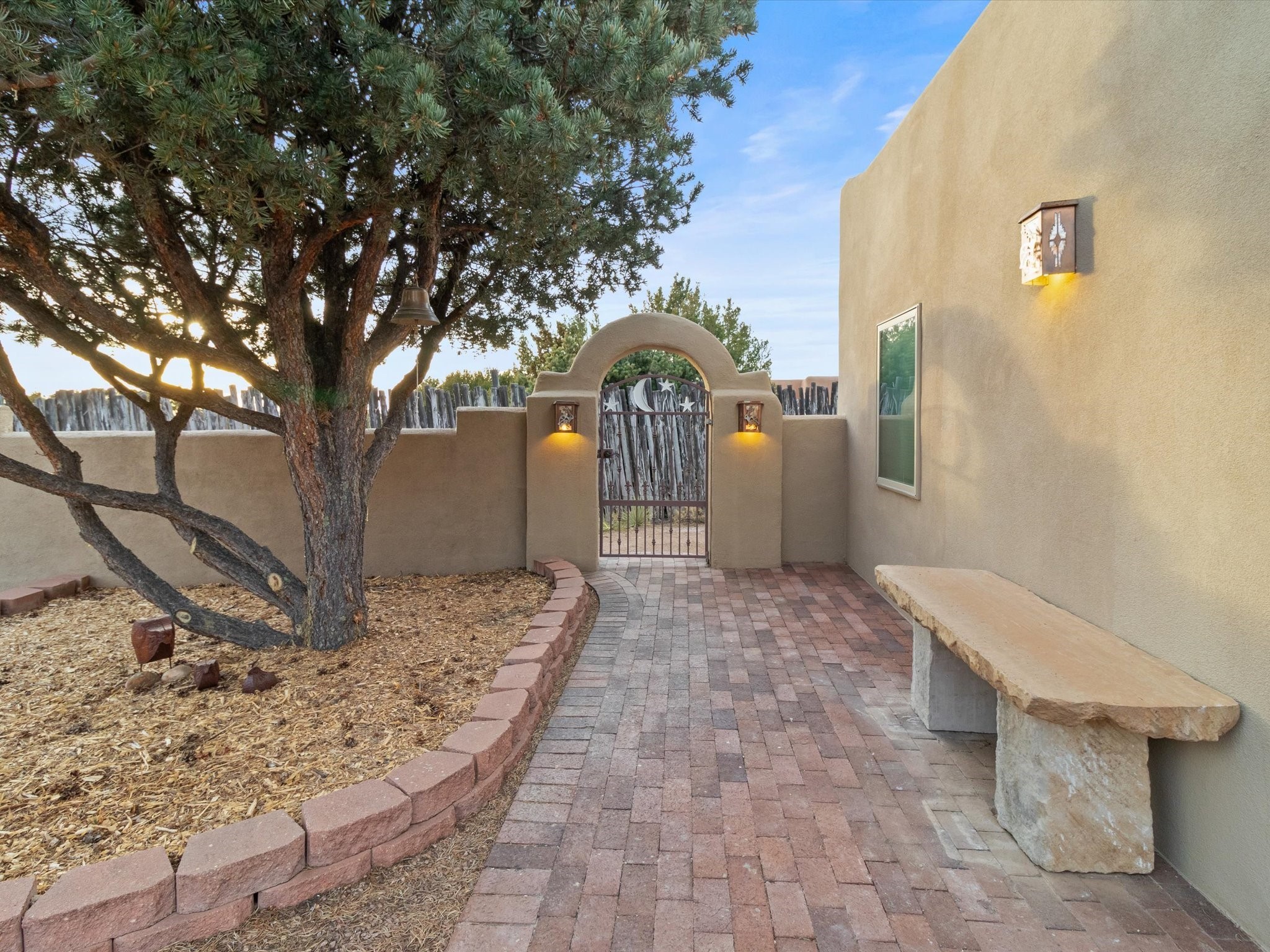 Inviting spaces inside and out, with incredible views all around. Just what you have been searching for! Quality construction placed perfectly on this 2.5 acre lot takes full advantage of our beautiful Sangre De Cristos, Ortiz, Sandia and Jemez mountains with breathtaking sunrises and sunsets. The floor plan welcomes unique and grand spacious areas of a peaceful home or generous areas for entertaining. Large pine vega beams/corbels accents throughout, large windows capture warm light and amazing mountainous views. Stylish kitchen with granite countertops, stainless steel appliances, maple cabinetry with high cabinets affixed with stunning stamped tin fronts allow versatility for all occasions. Foyer leads into a gorgeous Kiva fireplace in the living room. The master bedroom provides a relaxing oasis with its own sitting area and Kiva fireplace, a beautiful open bathroom space, walk-in closet and personal door to the portal with immediate access to an outdoor hot tub. WIRSBO PEX tubing keeps the radiant floor warm during the winter season. Outside, 3 Spanish heritage portals are enhanced with pine columns, beams/corbels and brick floors. A 2-car garage provides entry to the kitchen. The meticulously landscaped yard boasts an underground sprinkler system with a drip system keeping trees, bushes and flowers lush and beautiful. Front courtyard large area with outdoor table/chairs embraced by a raised circular iron fence.The expansive walkways challenge the square footage of the interior. Coordinating with walkways, over 1,200 linear feet of beautiful stucco walls and terraces adorn the outside. A coyote fence surrounds a spacious 2.5 acre lot with 2-sided colored entry gate requiring code access, along with a pedestrian gate similarly locked. ADT alarms wired for intruders and fire/CO1 alarms are used in the house and outbuildings. This home is truly breathtaking and an absolute must-see to appreciate all its beauty. Schedule your tour today!