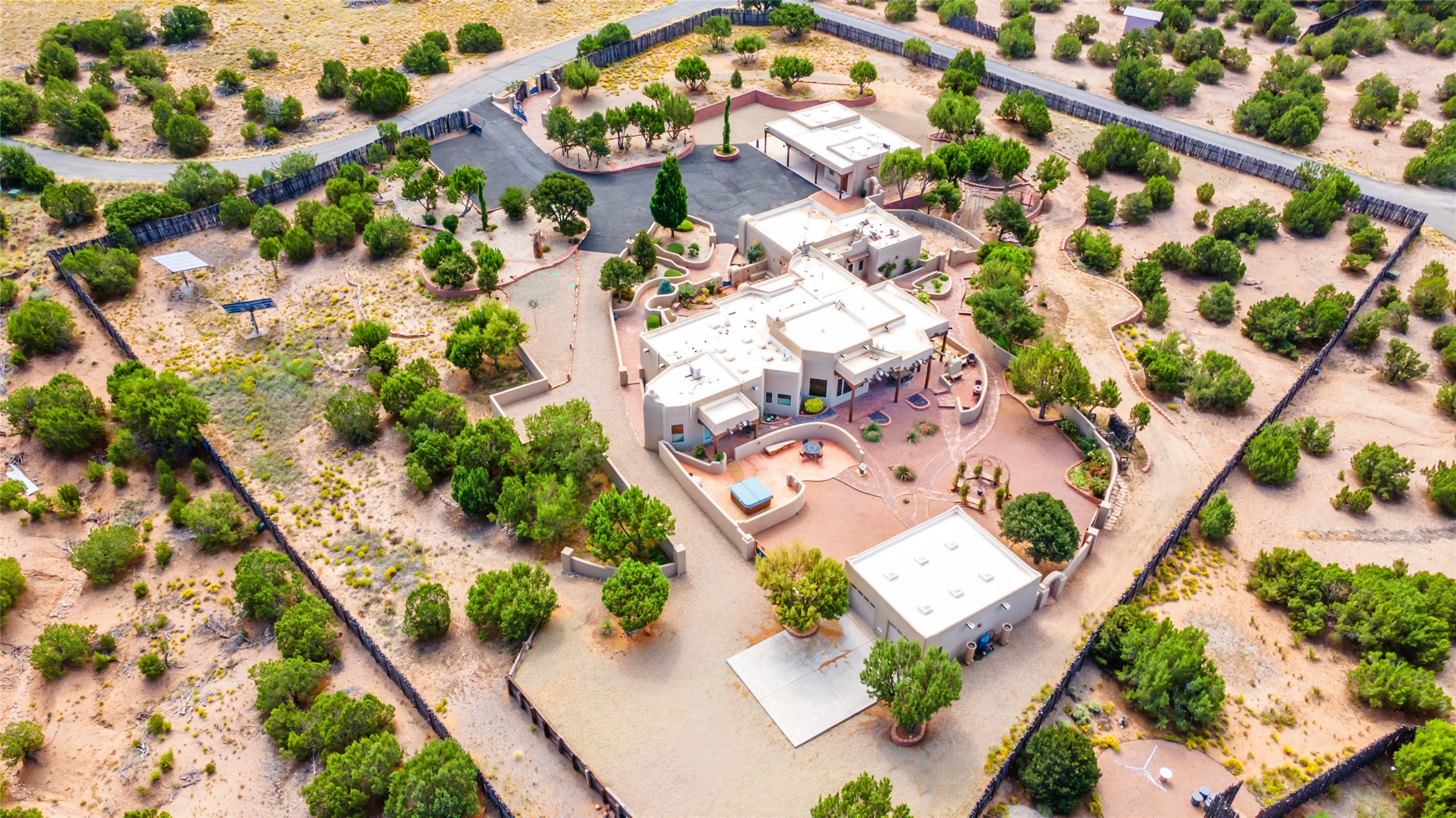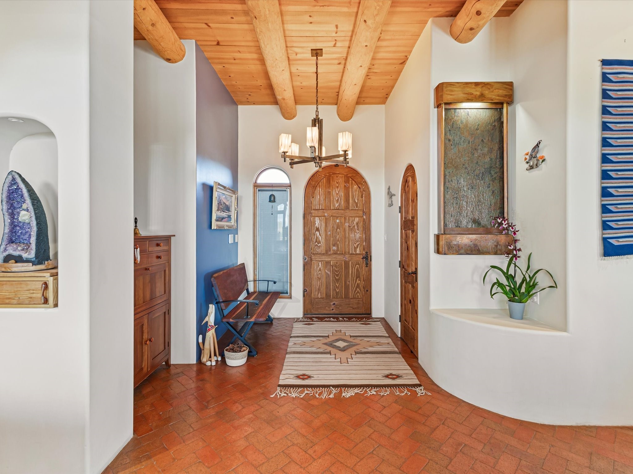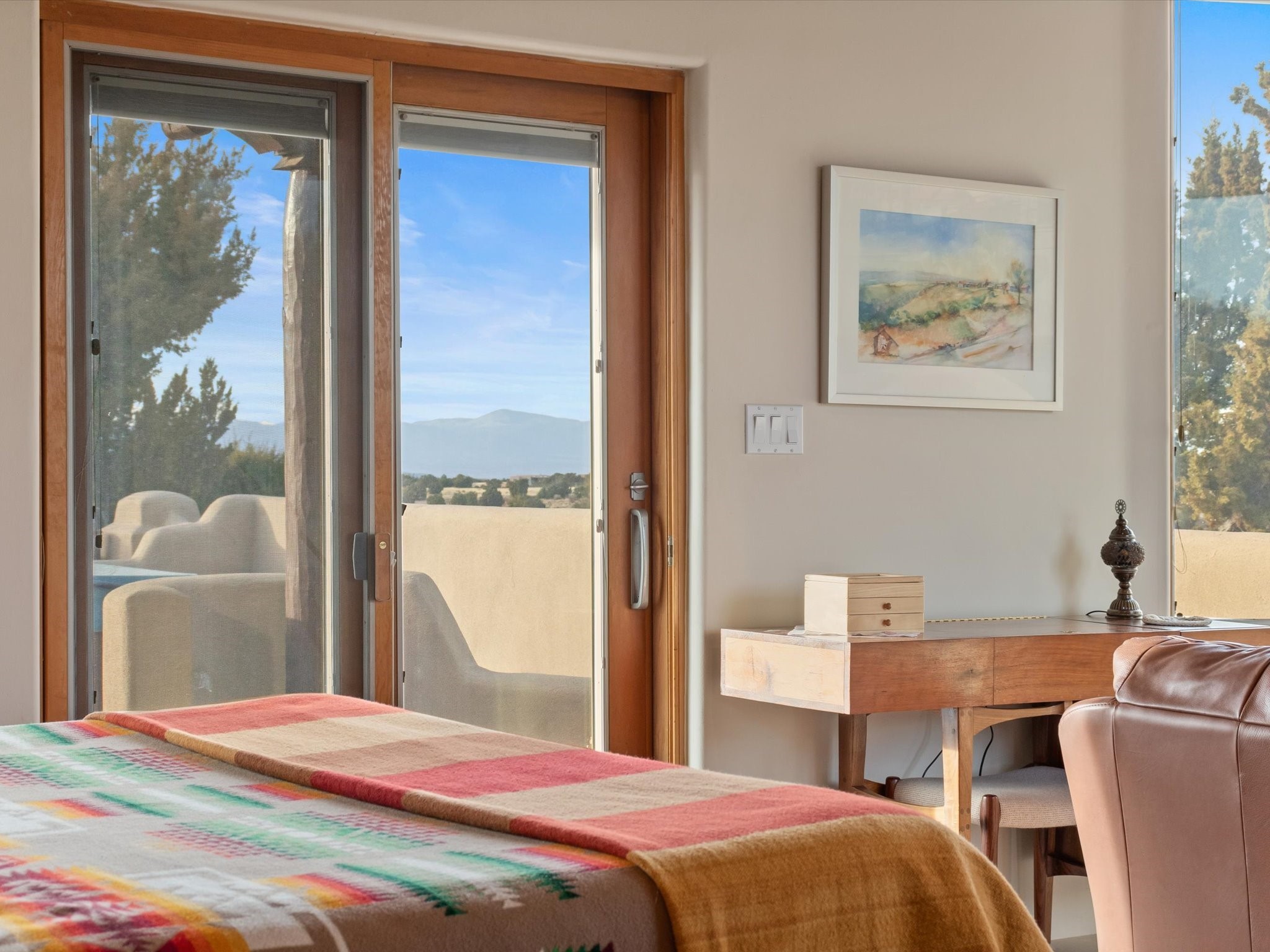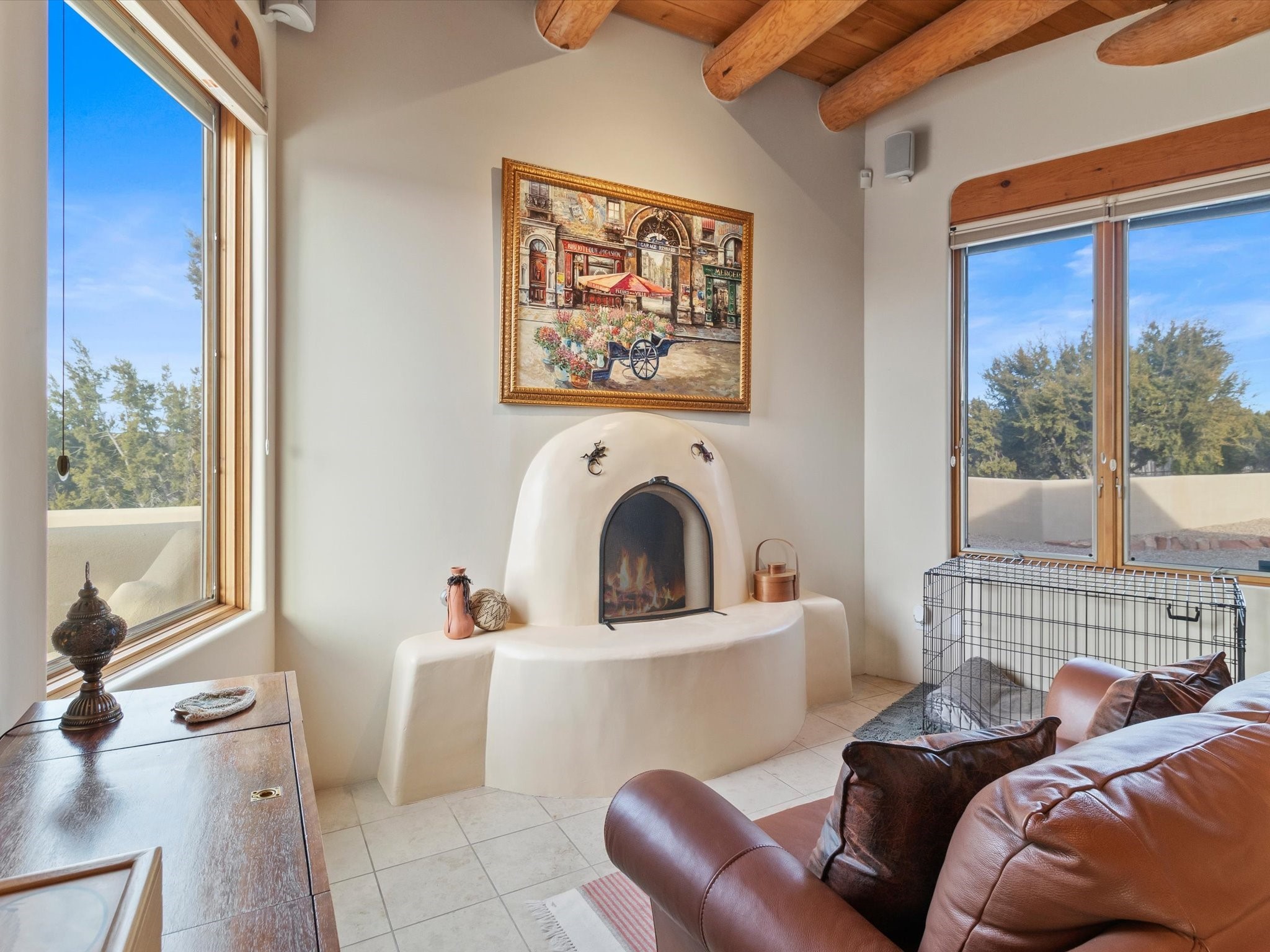 Inviting spaces inside and out, with incredible views all around. Just what you have been searching for! Quality construction placed perfectly on this 2.5 acre lot takes full advantage of our beautiful Sangre De Cristos, Ortiz, Sandia and Jemez mountains with breathtaking sunrises and sunsets. The floor plan welcomes unique and grand spacious areas of a peaceful home or generous areas for entertaining. Large pine vega beams/corbels accents throughout, large windows capture warm light and amazing mountainous views. Stylish kitchen with granite countertops, stainless steel appliances, maple cabinetry with high cabinets affixed with stunning stamped tin fronts allow versatility for all occasions. Foyer leads into a gorgeous Kiva fireplace in the living room. The master bedroom provides a relaxing oasis with its own sitting area and Kiva fireplace, a beautiful open bathroom space, walk-in closet and personal door to the portal with immediate access to an outdoor hot tub. WIRSBO PEX tubing keeps the radiant floor warm during the winter season. Outside, 3 Spanish heritage portals are enhanced with pine columns, beams/corbels and brick floors. A 2-car garage provides entry to the kitchen. The meticulously landscaped yard boasts an underground sprinkler system with a drip system keeping trees, bushes and flowers lush and beautiful. Front courtyard large area with outdoor table/chairs embraced by a raised circular iron fence.The expansive walkways challenge the square footage of the interior. Coordinating with walkways, over 1,200 linear feet of beautiful stucco walls and terraces adorn the outside. A coyote fence surrounds a spacious 2.5 acre lot with 2-sided colored entry gate requiring code access, along with a pedestrian gate similarly locked. ADT alarms wired for intruders and fire/CO1 alarms are used in the house and outbuildings. This home is truly breathtaking and an absolute must-see to appreciate all its beauty. Schedule your tour today!