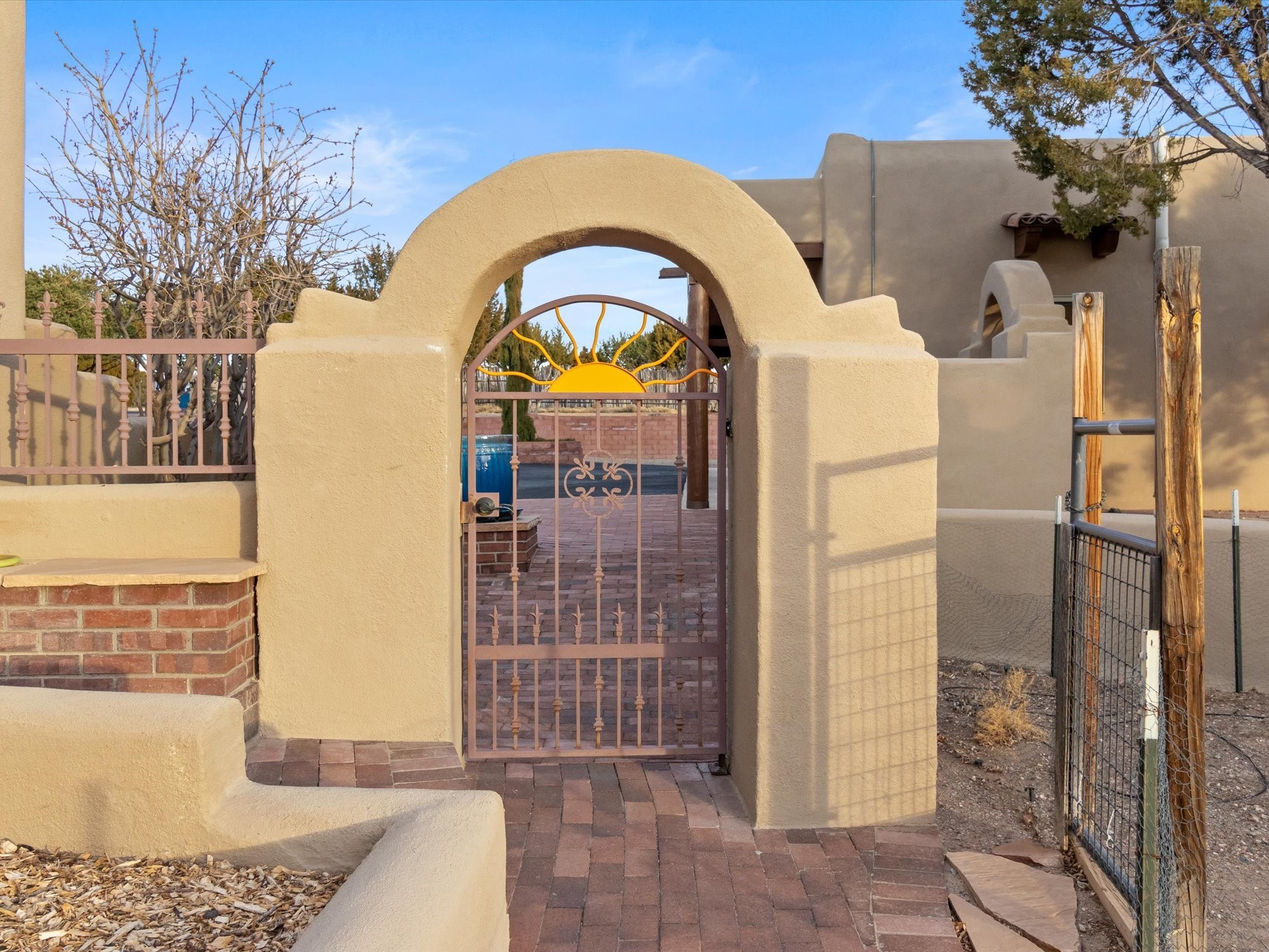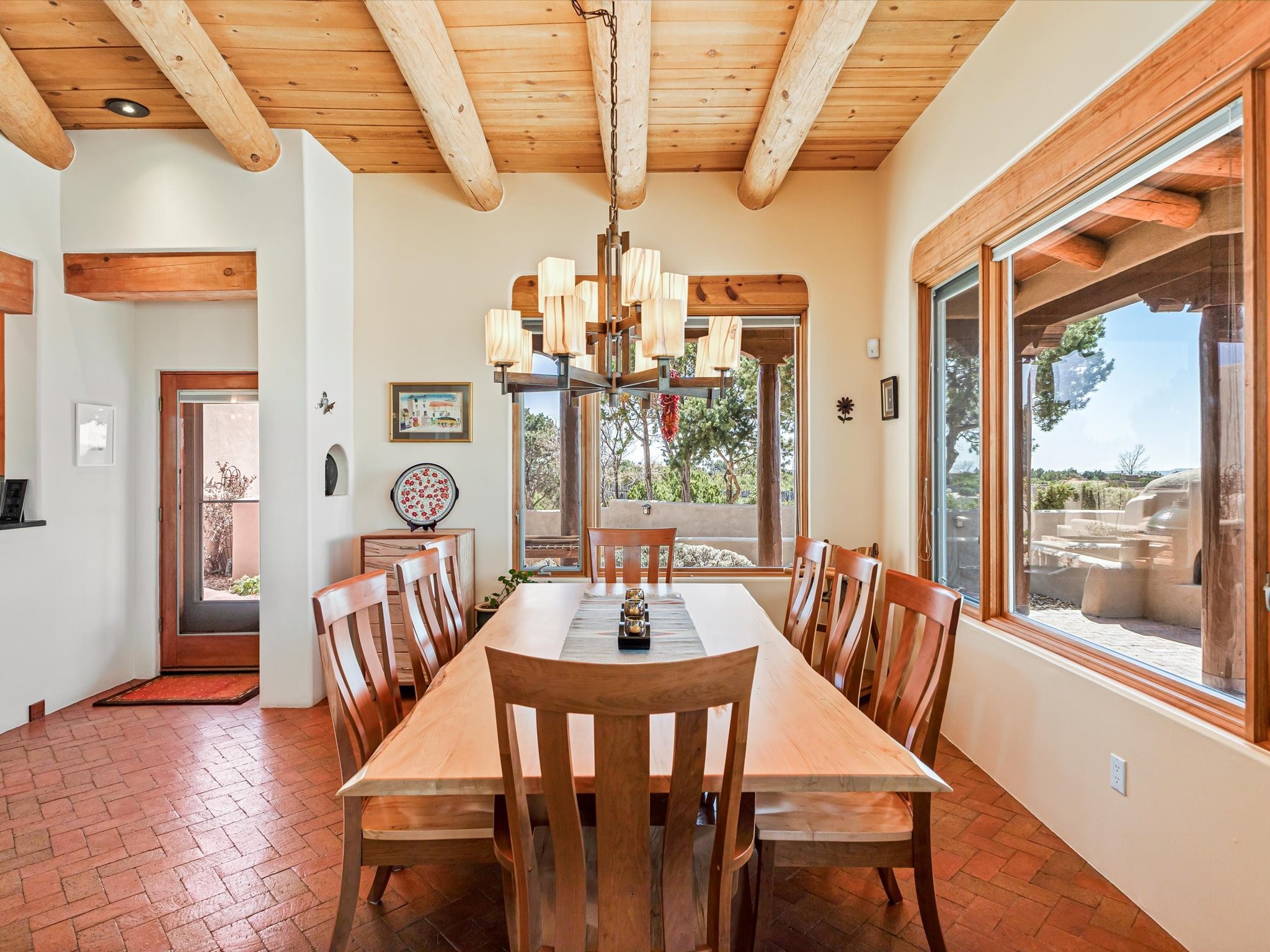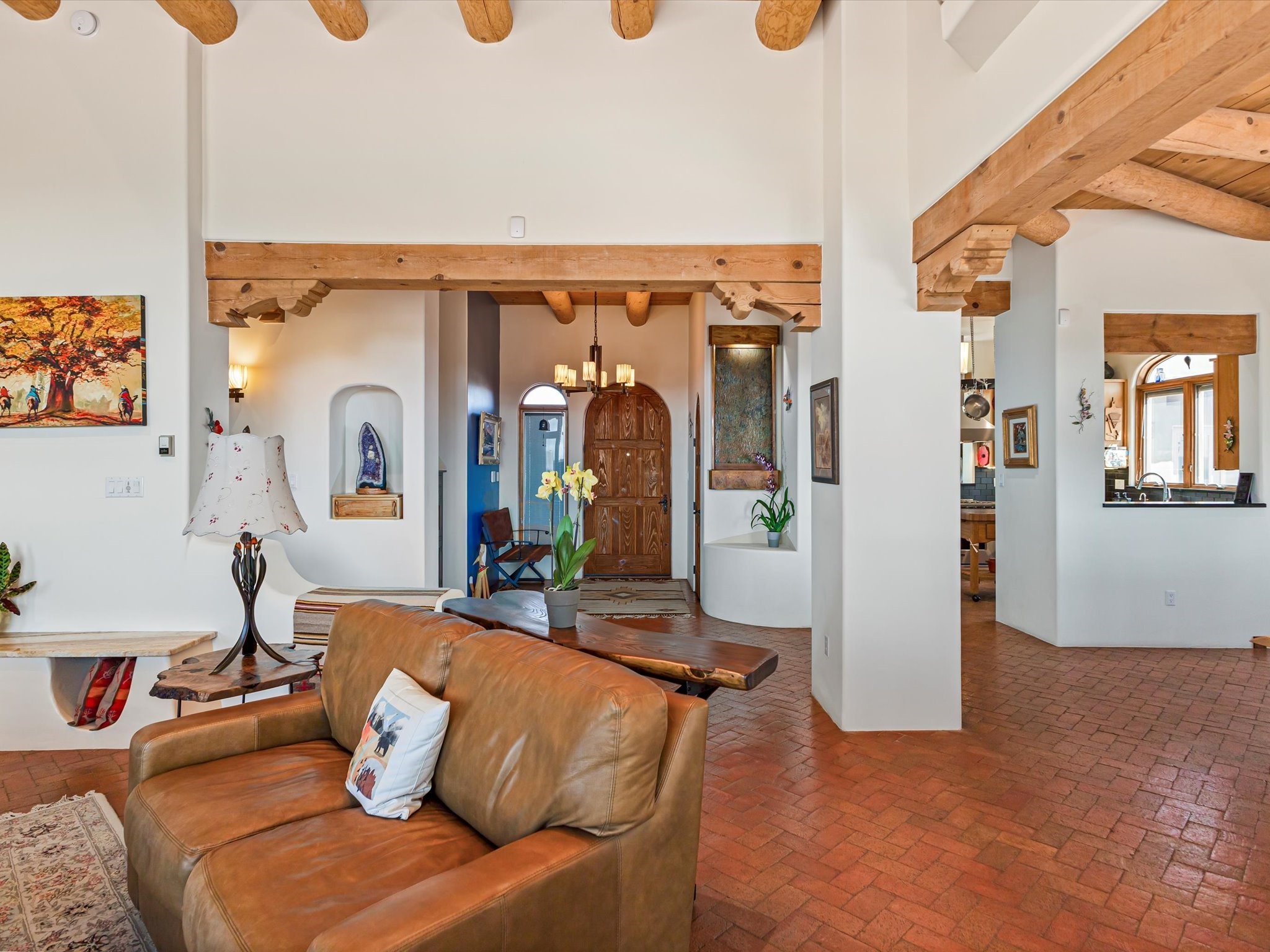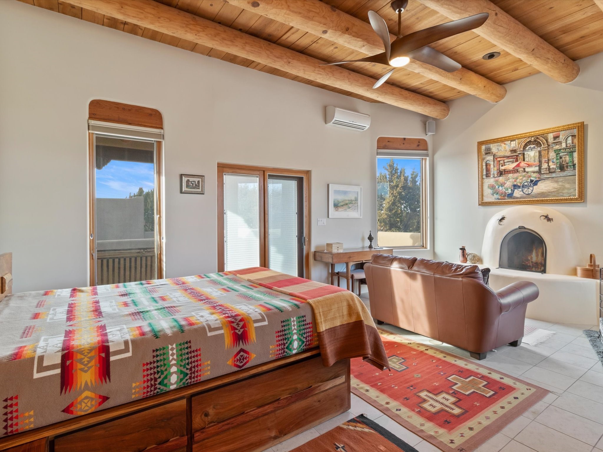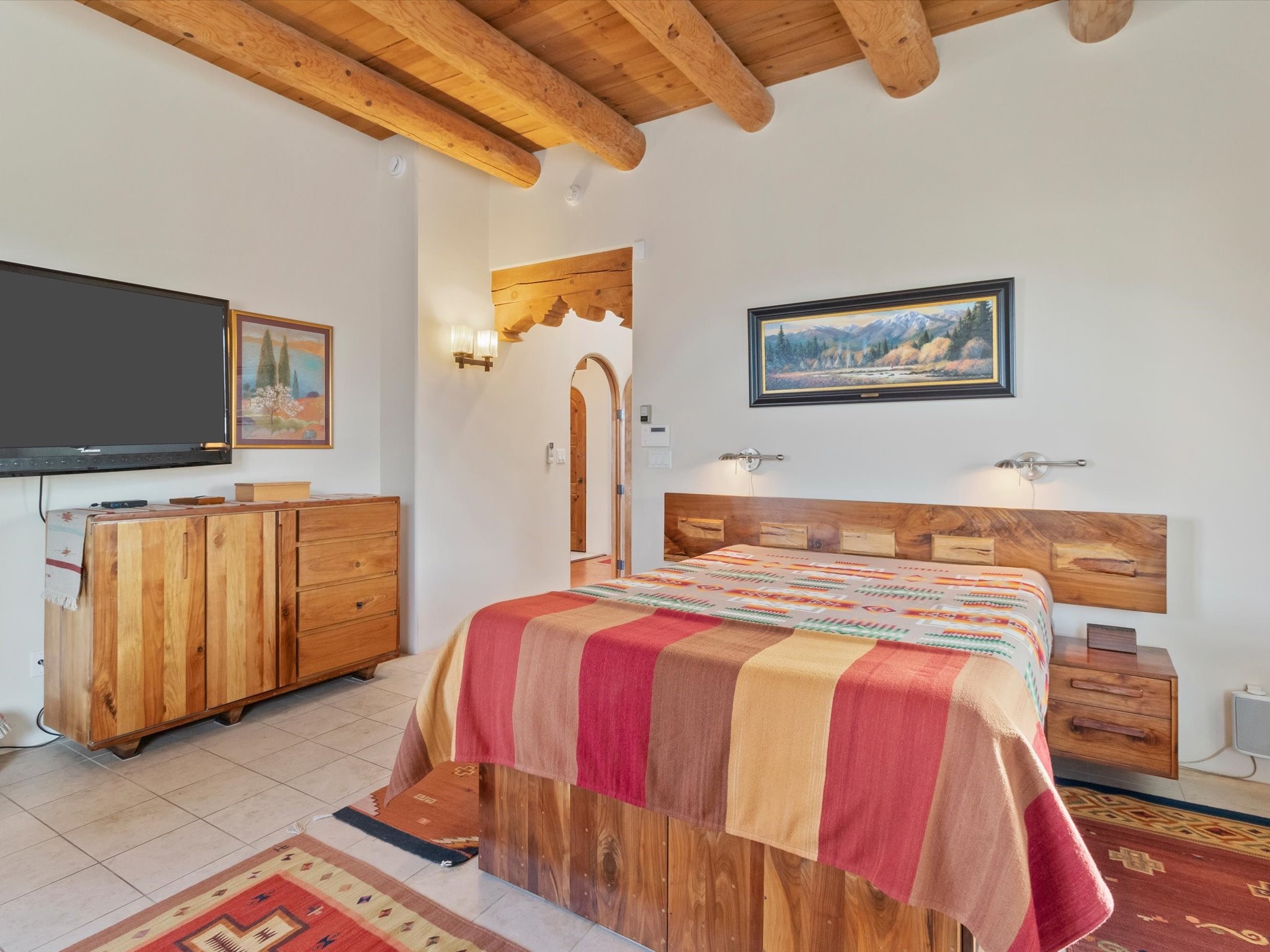 Inviting spaces inside and out, with incredible views all around. Just what you have been searching for! Quality construction placed perfectly on this 2.5 acre lot takes full advantage of our beautiful Sangre De Cristos, Ortiz, Sandia and Jemez mountains with breathtaking sunrises and sunsets. The floor plan welcomes unique and grand spacious areas of a peaceful home or generous areas for entertaining. Large pine vega beams/corbels accents throughout, large windows capture warm light and amazing mountainous views. Stylish kitchen with granite countertops, stainless steel appliances, maple cabinetry with high cabinets affixed with stunning stamped tin fronts allow versatility for all occasions. Foyer leads into a gorgeous Kiva fireplace in the living room. The master bedroom provides a relaxing oasis with its own sitting area and Kiva fireplace, a beautiful open bathroom space, walk-in closet and personal door to the portal with immediate access to an outdoor hot tub. WIRSBO PEX tubing keeps the radiant floor warm during the winter season. Outside, 3 Spanish heritage portals are enhanced with pine columns, beams/corbels and brick floors. A 2-car garage provides entry to the kitchen. The meticulously landscaped yard boasts an underground sprinkler system with a drip system keeping trees, bushes and flowers lush and beautiful. Front courtyard large area with outdoor table/chairs embraced by a raised circular iron fence.The expansive walkways challenge the square footage of the interior. Coordinating with walkways, over 1,200 linear feet of beautiful stucco walls and terraces adorn the outside. A coyote fence surrounds a spacious 2.5 acre lot with 2-sided colored entry gate requiring code access, along with a pedestrian gate similarly locked. ADT alarms wired for intruders and fire/CO1 alarms are used in the house and outbuildings. This home is truly breathtaking and an absolute must-see to appreciate all its beauty. Schedule your tour today!