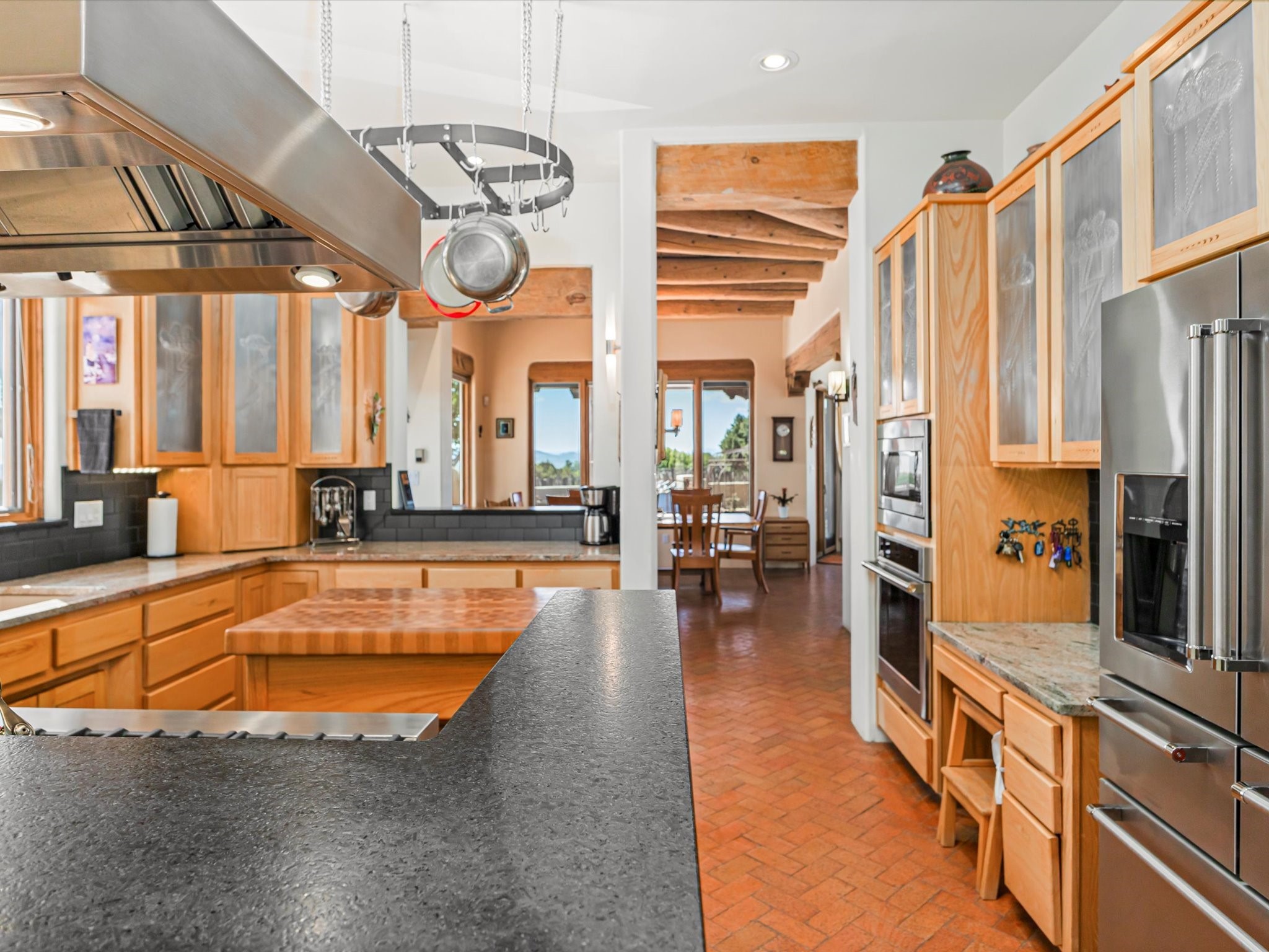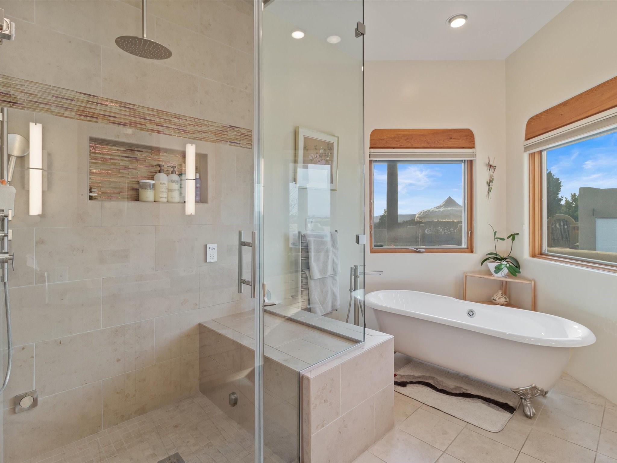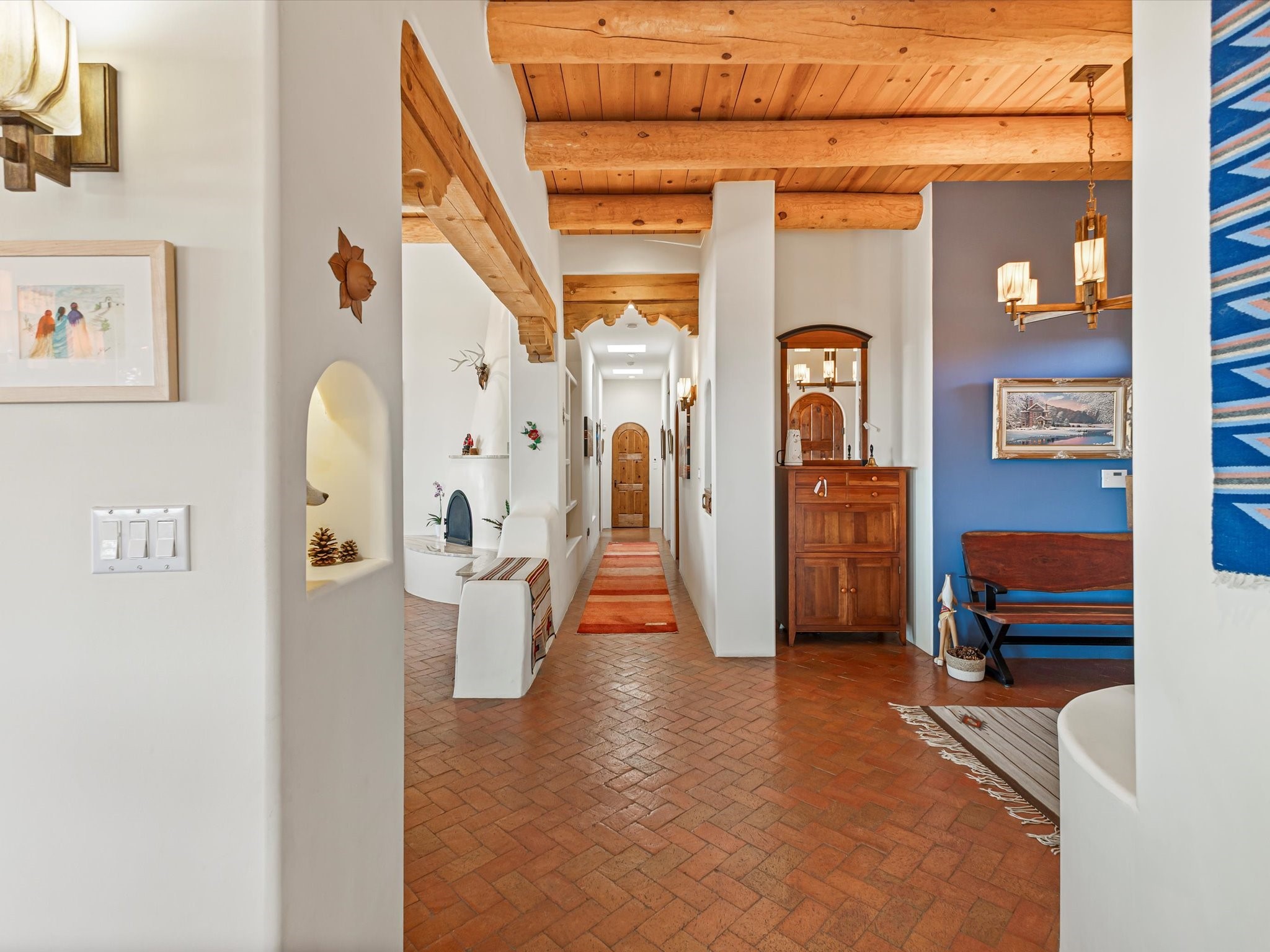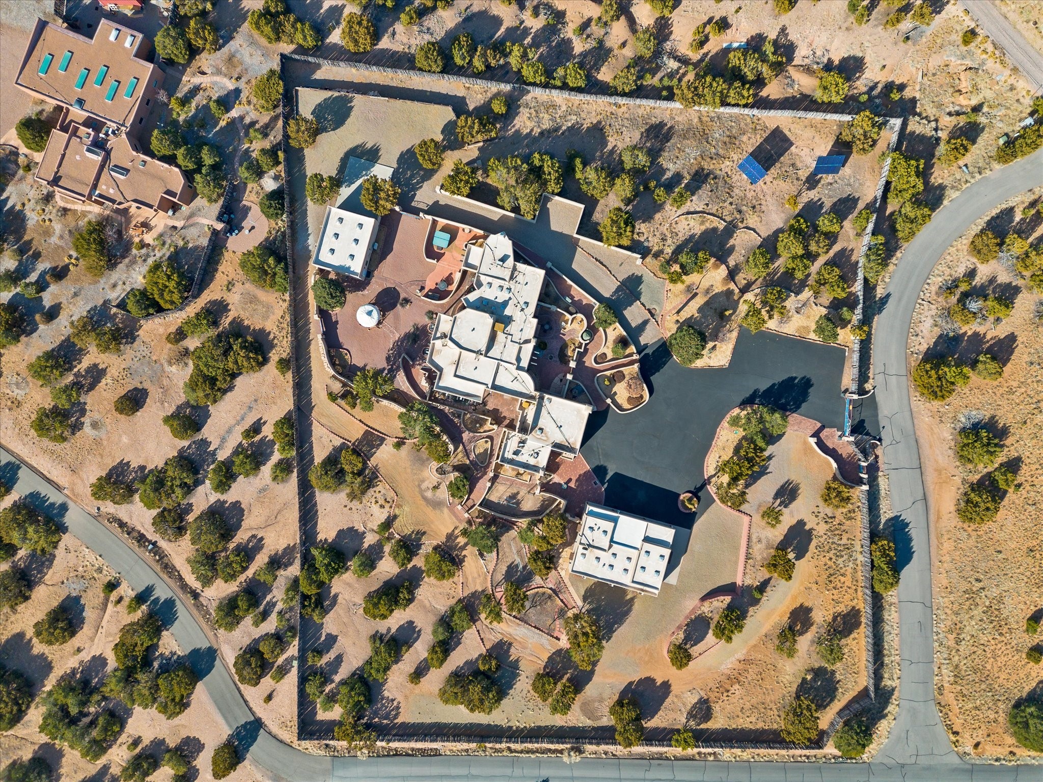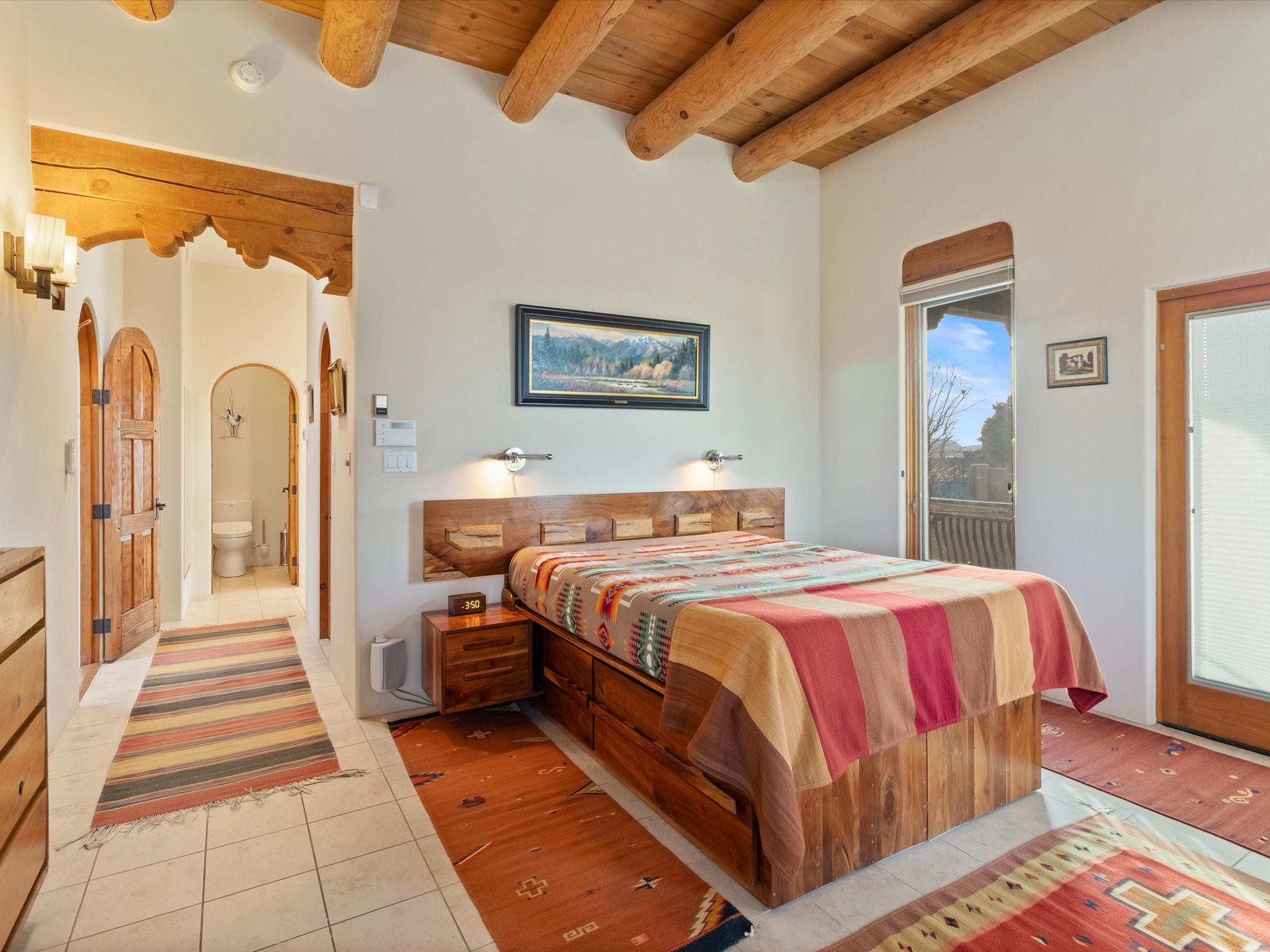 Inviting spaces inside and out, with incredible views all around. Just what you have been searching for! Quality construction placed perfectly on this 2.5 acre lot takes full advantage of our beautiful Sangre De Cristos, Ortiz, Sandia and Jemez mountains with breathtaking sunrises and sunsets. The floor plan welcomes unique and grand spacious areas of a peaceful home or generous areas for entertaining. Large pine vega beams/corbels accents throughout, large windows capture warm light and amazing mountainous views. Stylish kitchen with granite countertops, stainless steel appliances, maple cabinetry with high cabinets affixed with stunning stamped tin fronts allow versatility for all occasions. Foyer leads into a gorgeous Kiva fireplace in the living room. The master bedroom provides a relaxing oasis with its own sitting area and Kiva fireplace, a beautiful open bathroom space, walk-in closet and personal door to the portal with immediate access to an outdoor hot tub. WIRSBO PEX tubing keeps the radiant floor warm during the winter season. Outside, 3 Spanish heritage portals are enhanced with pine columns, beams/corbels and brick floors. A 2-car garage provides entry to the kitchen. The meticulously landscaped yard boasts an underground sprinkler system with a drip system keeping trees, bushes and flowers lush and beautiful. Front courtyard large area with outdoor table/chairs embraced by a raised circular iron fence.The expansive walkways challenge the square footage of the interior. Coordinating with walkways, over 1,200 linear feet of beautiful stucco walls and terraces adorn the outside. A coyote fence surrounds a spacious 2.5 acre lot with 2-sided colored entry gate requiring code access, along with a pedestrian gate similarly locked. ADT alarms wired for intruders and fire/CO1 alarms are used in the house and outbuildings. This home is truly breathtaking and an absolute must-see to appreciate all its beauty. Schedule your tour today!