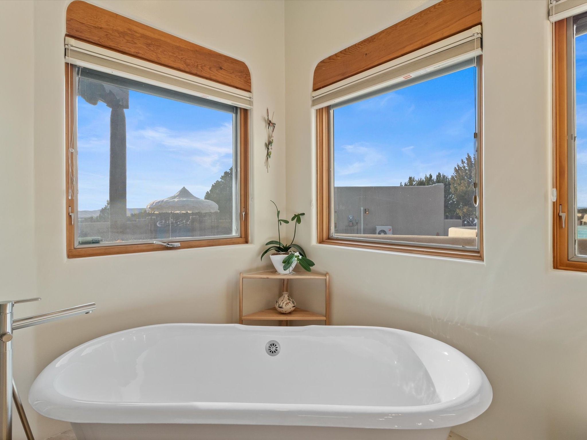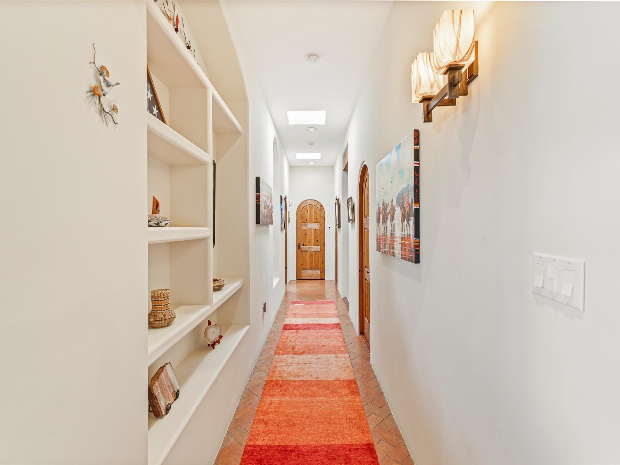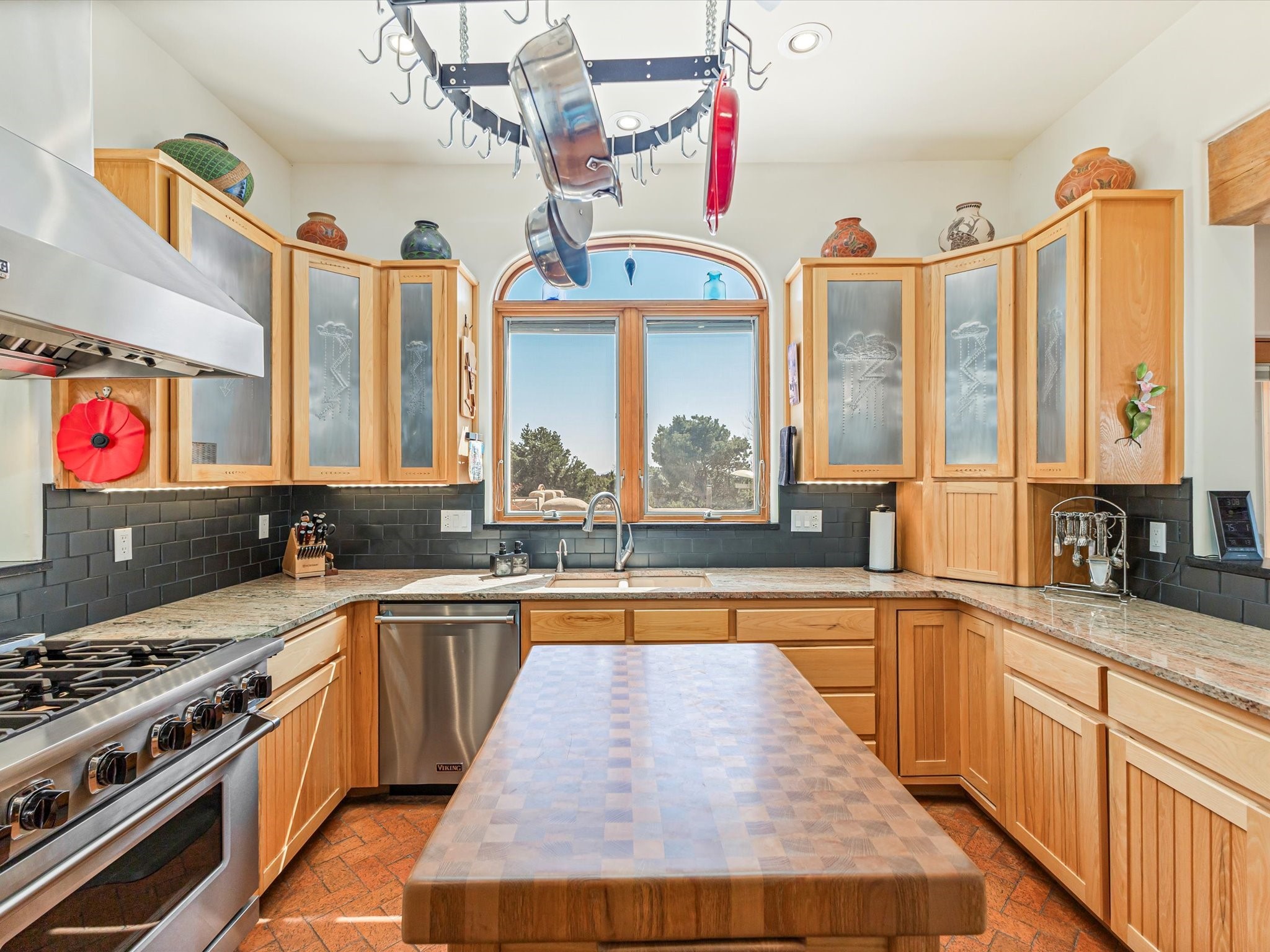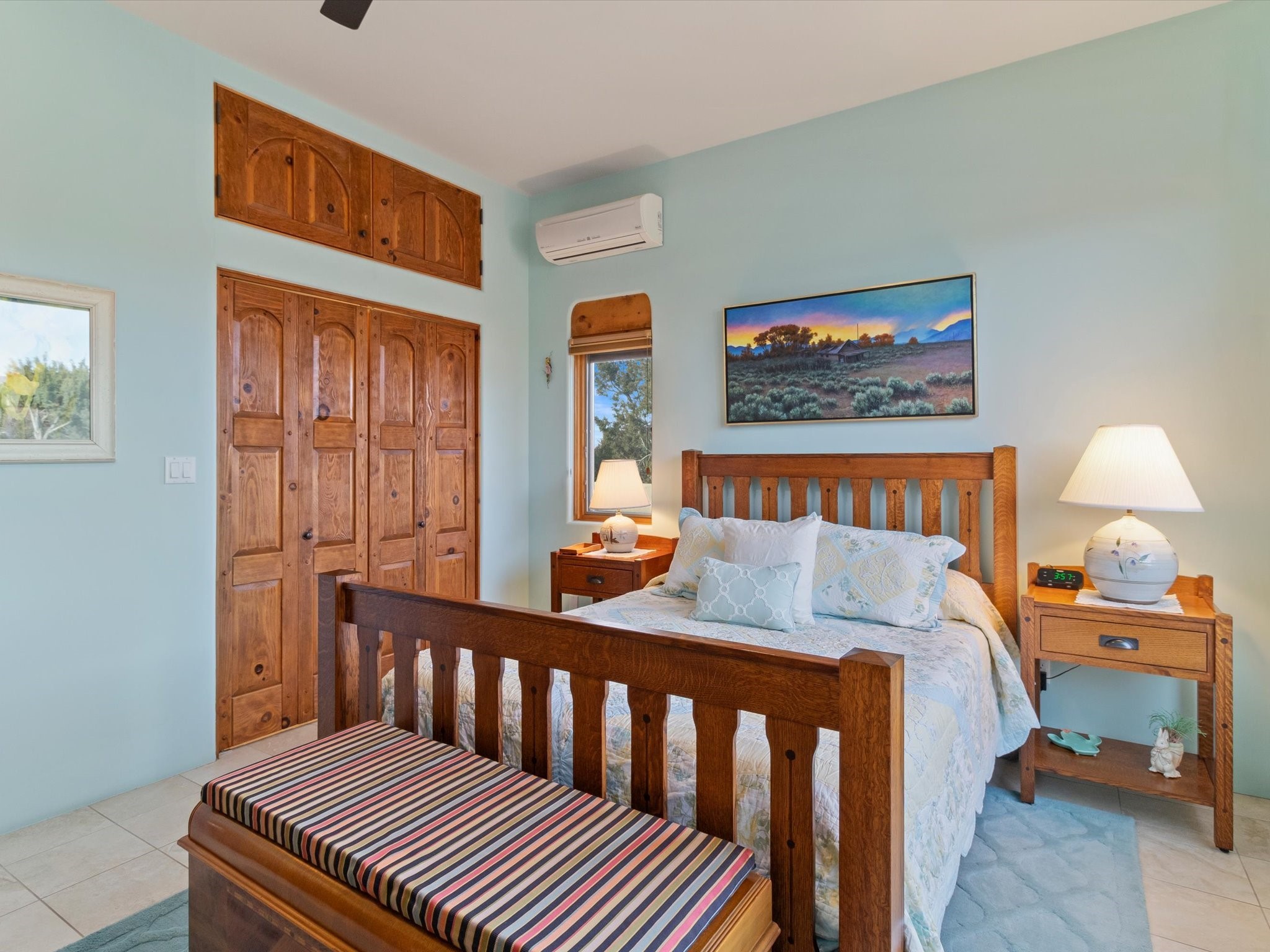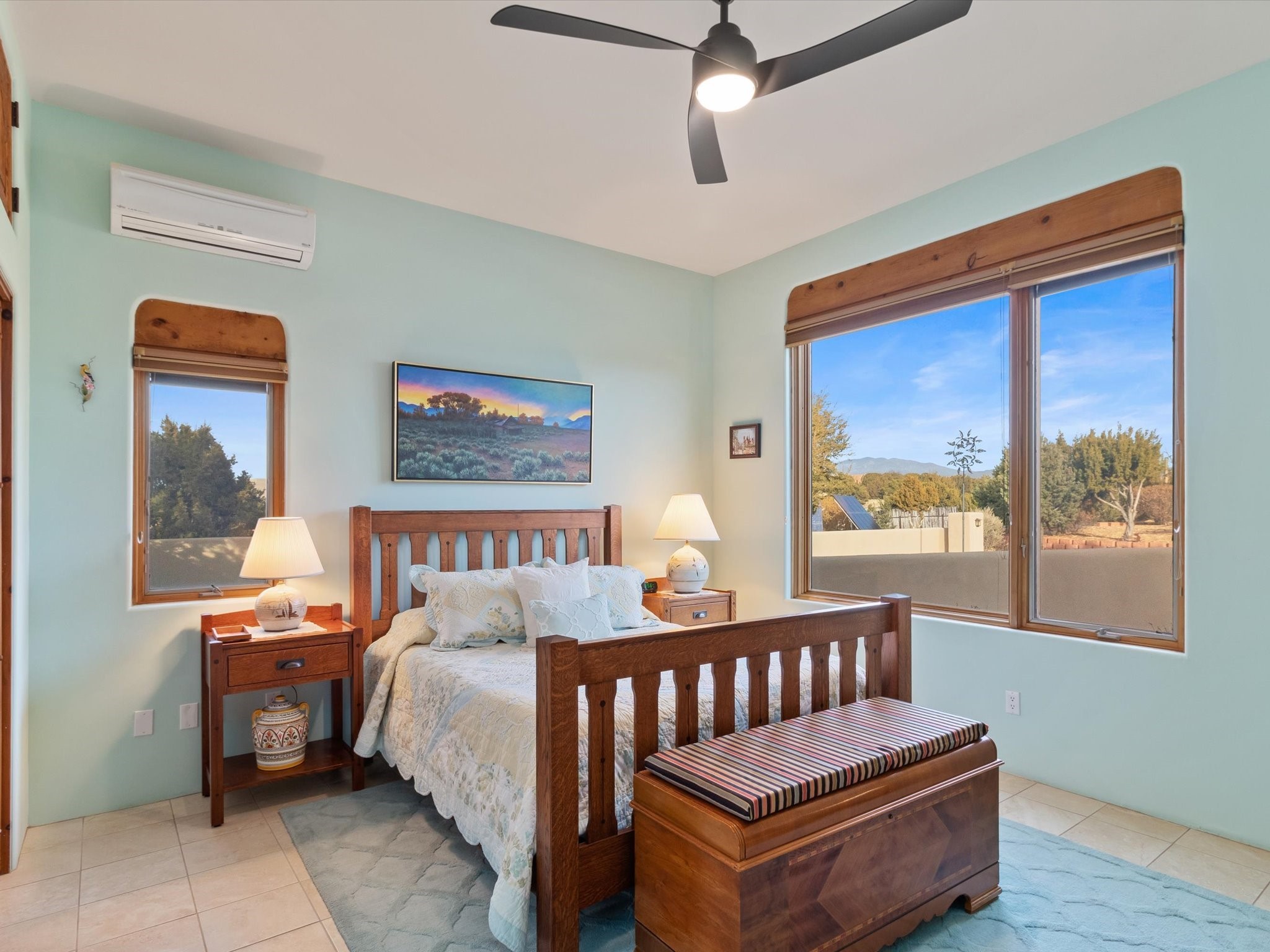 Inviting spaces inside and out, with incredible views all around. Just what you have been searching for! Quality construction placed perfectly on this 2.5 acre lot takes full advantage of our beautiful Sangre De Cristos, Ortiz, Sandia and Jemez mountains with breathtaking sunrises and sunsets. The floor plan welcomes unique and grand spacious areas of a peaceful home or generous areas for entertaining. Large pine vega beams/corbels accents throughout, large windows capture warm light and amazing mountainous views. Stylish kitchen with granite countertops, stainless steel appliances, maple cabinetry with high cabinets affixed with stunning stamped tin fronts allow versatility for all occasions. Foyer leads into a gorgeous Kiva fireplace in the living room. The master bedroom provides a relaxing oasis with its own sitting area and Kiva fireplace, a beautiful open bathroom space, walk-in closet and personal door to the portal with immediate access to an outdoor hot tub. WIRSBO PEX tubing keeps the radiant floor warm during the winter season. Outside, 3 Spanish heritage portals are enhanced with pine columns, beams/corbels and brick floors. A 2-car garage provides entry to the kitchen. The meticulously landscaped yard boasts an underground sprinkler system with a drip system keeping trees, bushes and flowers lush and beautiful. Front courtyard large area with outdoor table/chairs embraced by a raised circular iron fence.The expansive walkways challenge the square footage of the interior. Coordinating with walkways, over 1,200 linear feet of beautiful stucco walls and terraces adorn the outside. A coyote fence surrounds a spacious 2.5 acre lot with 2-sided colored entry gate requiring code access, along with a pedestrian gate similarly locked. ADT alarms wired for intruders and fire/CO1 alarms are used in the house and outbuildings. This home is truly breathtaking and an absolute must-see to appreciate all its beauty. Schedule your tour today!