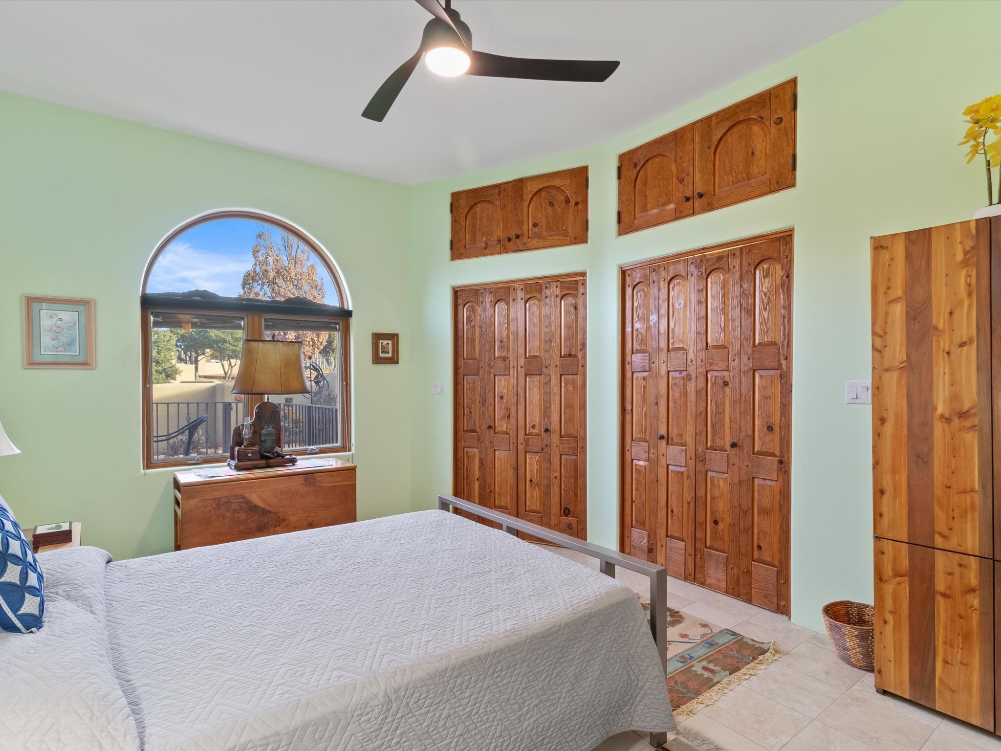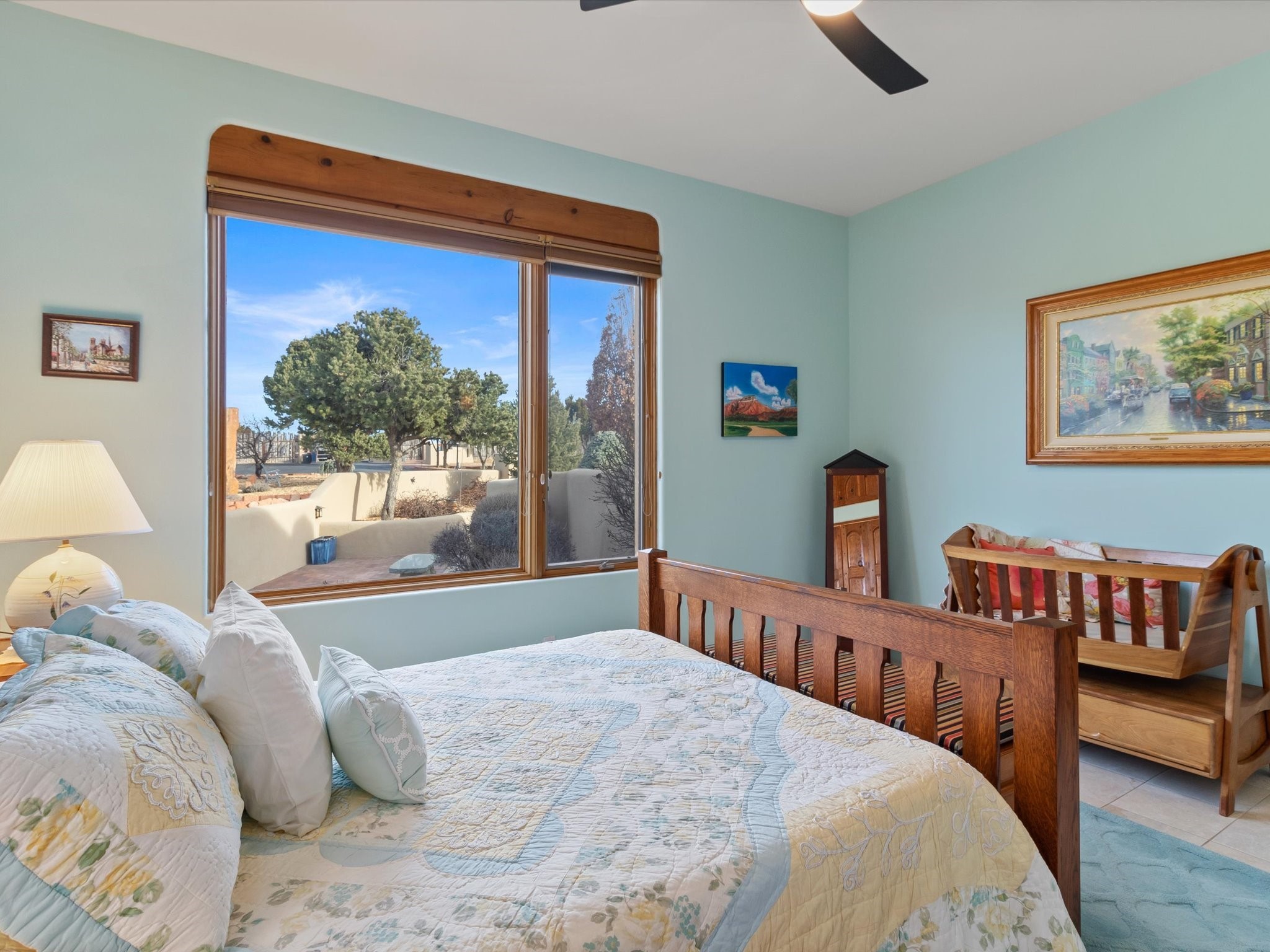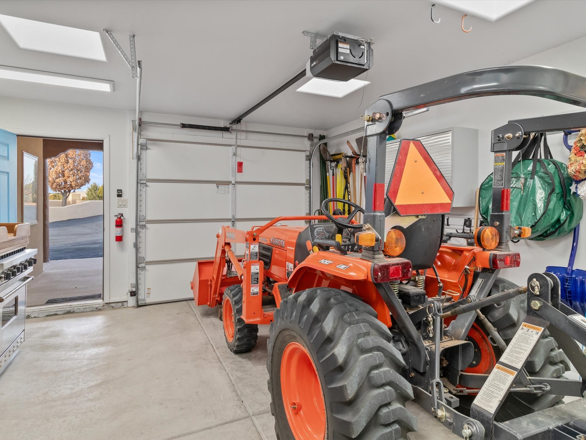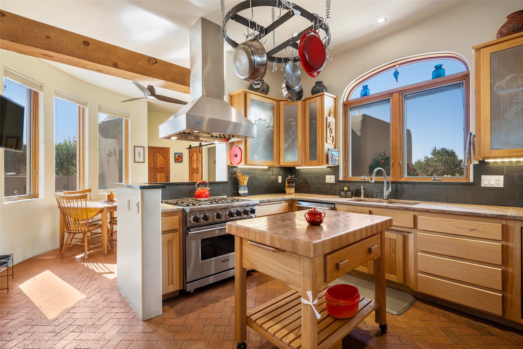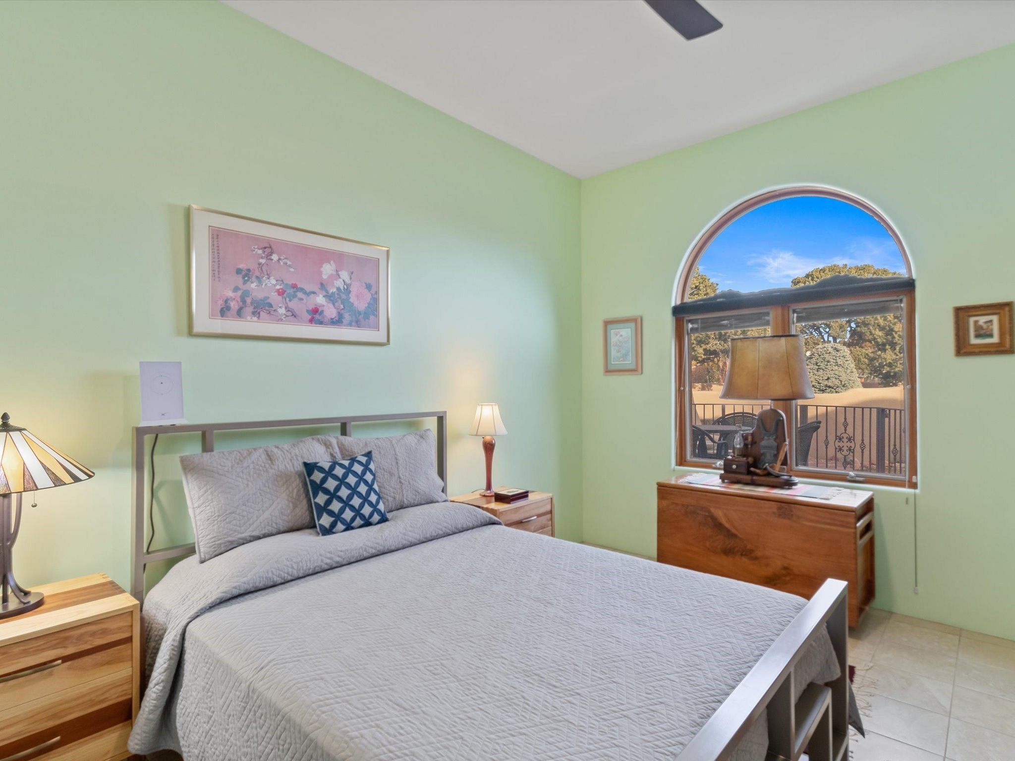 Inviting spaces inside and out, with incredible views all around. Just what you have been searching for! Quality construction placed perfectly on this 2.5 acre lot takes full advantage of our beautiful Sangre De Cristos, Ortiz, Sandia and Jemez mountains with breathtaking sunrises and sunsets. The floor plan welcomes unique and grand spacious areas of a peaceful home or generous areas for entertaining. Large pine vega beams/corbels accents throughout, large windows capture warm light and amazing mountainous views. Stylish kitchen with granite countertops, stainless steel appliances, maple cabinetry with high cabinets affixed with stunning stamped tin fronts allow versatility for all occasions. Foyer leads into a gorgeous Kiva fireplace in the living room. The master bedroom provides a relaxing oasis with its own sitting area and Kiva fireplace, a beautiful open bathroom space, walk-in closet and personal door to the portal with immediate access to an outdoor hot tub. WIRSBO PEX tubing keeps the radiant floor warm during the winter season. Outside, 3 Spanish heritage portals are enhanced with pine columns, beams/corbels and brick floors. A 2-car garage provides entry to the kitchen. The meticulously landscaped yard boasts an underground sprinkler system with a drip system keeping trees, bushes and flowers lush and beautiful. Front courtyard large area with outdoor table/chairs embraced by a raised circular iron fence.The expansive walkways challenge the square footage of the interior. Coordinating with walkways, over 1,200 linear feet of beautiful stucco walls and terraces adorn the outside. A coyote fence surrounds a spacious 2.5 acre lot with 2-sided colored entry gate requiring code access, along with a pedestrian gate similarly locked. ADT alarms wired for intruders and fire/CO1 alarms are used in the house and outbuildings. This home is truly breathtaking and an absolute must-see to appreciate all its beauty. Schedule your tour today!