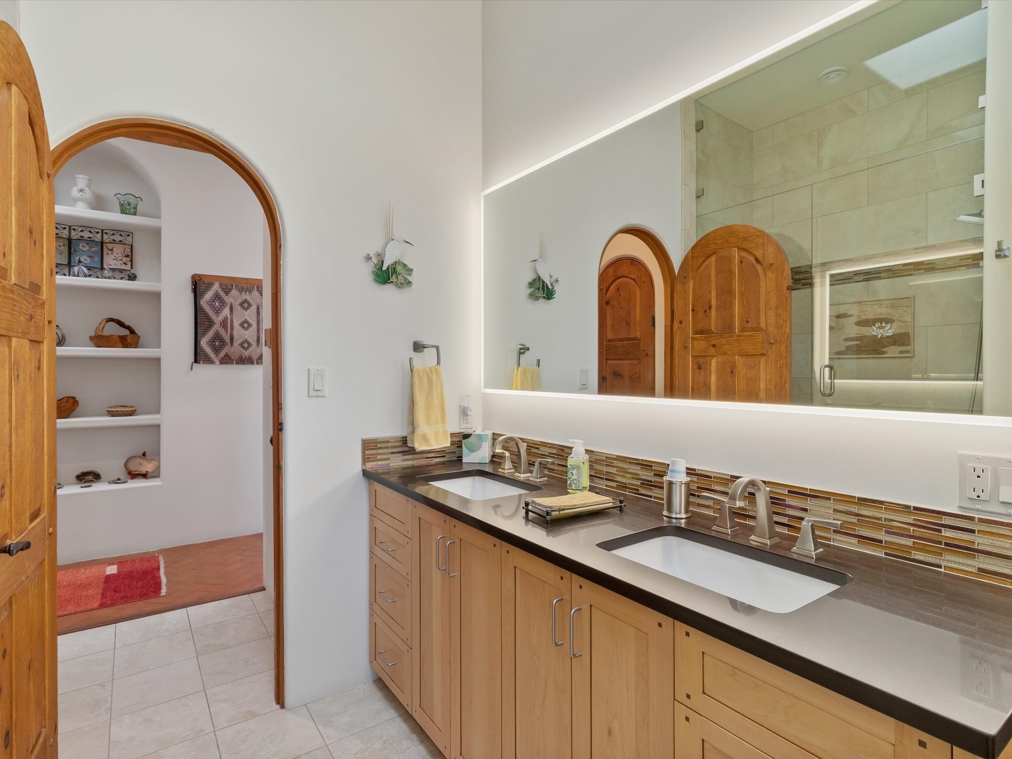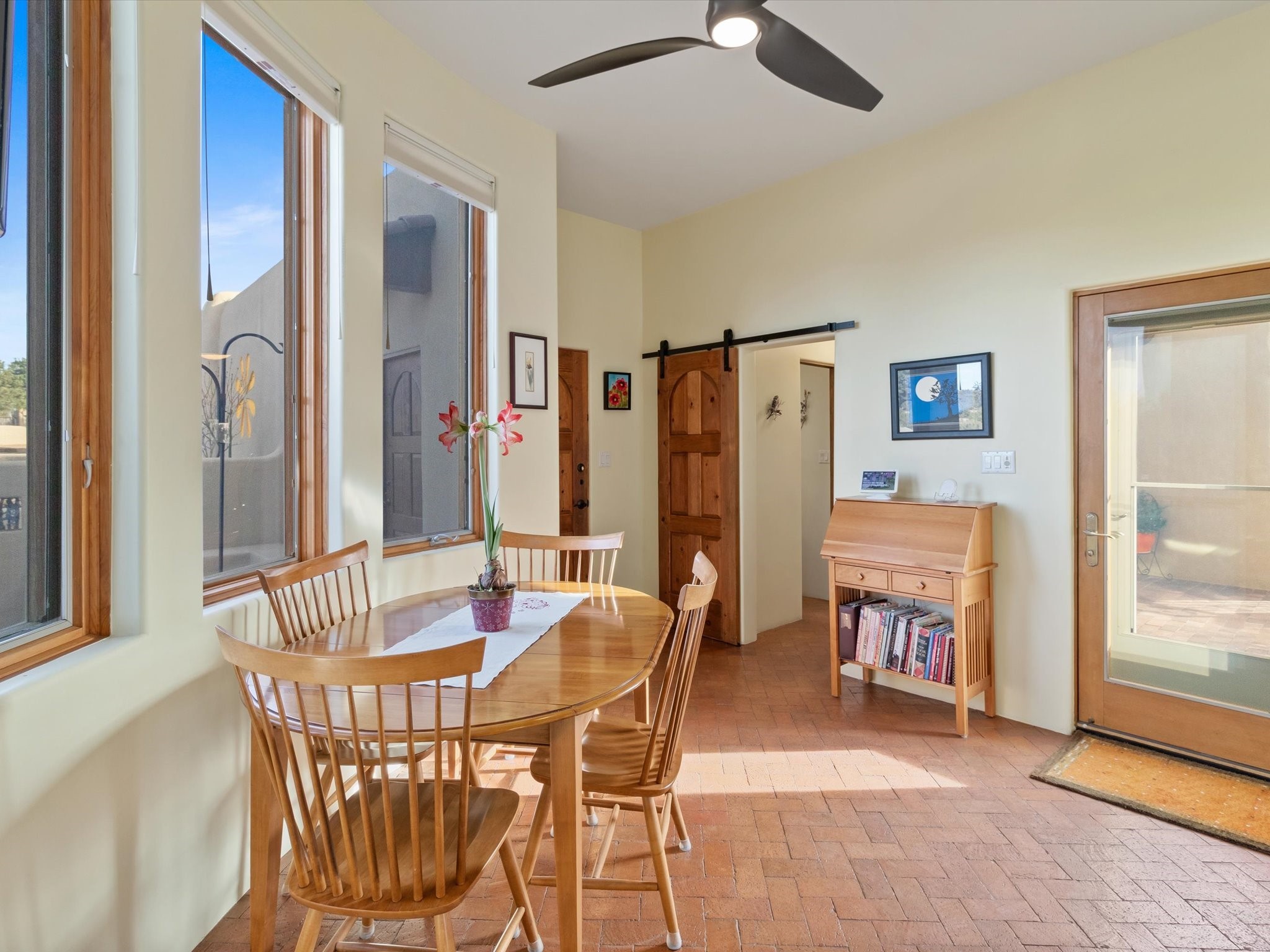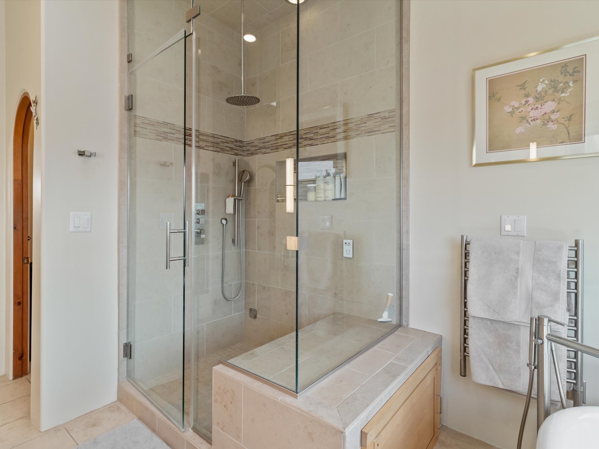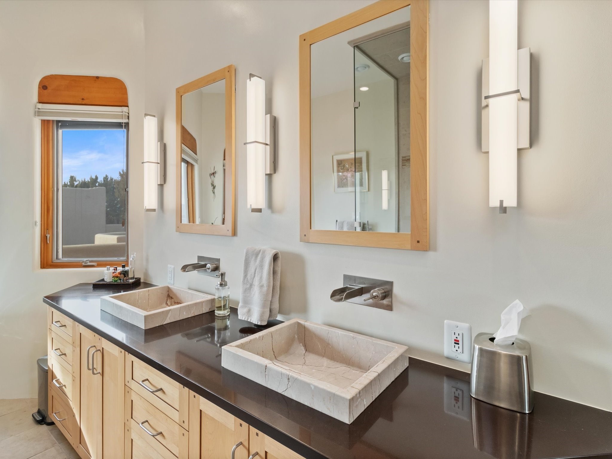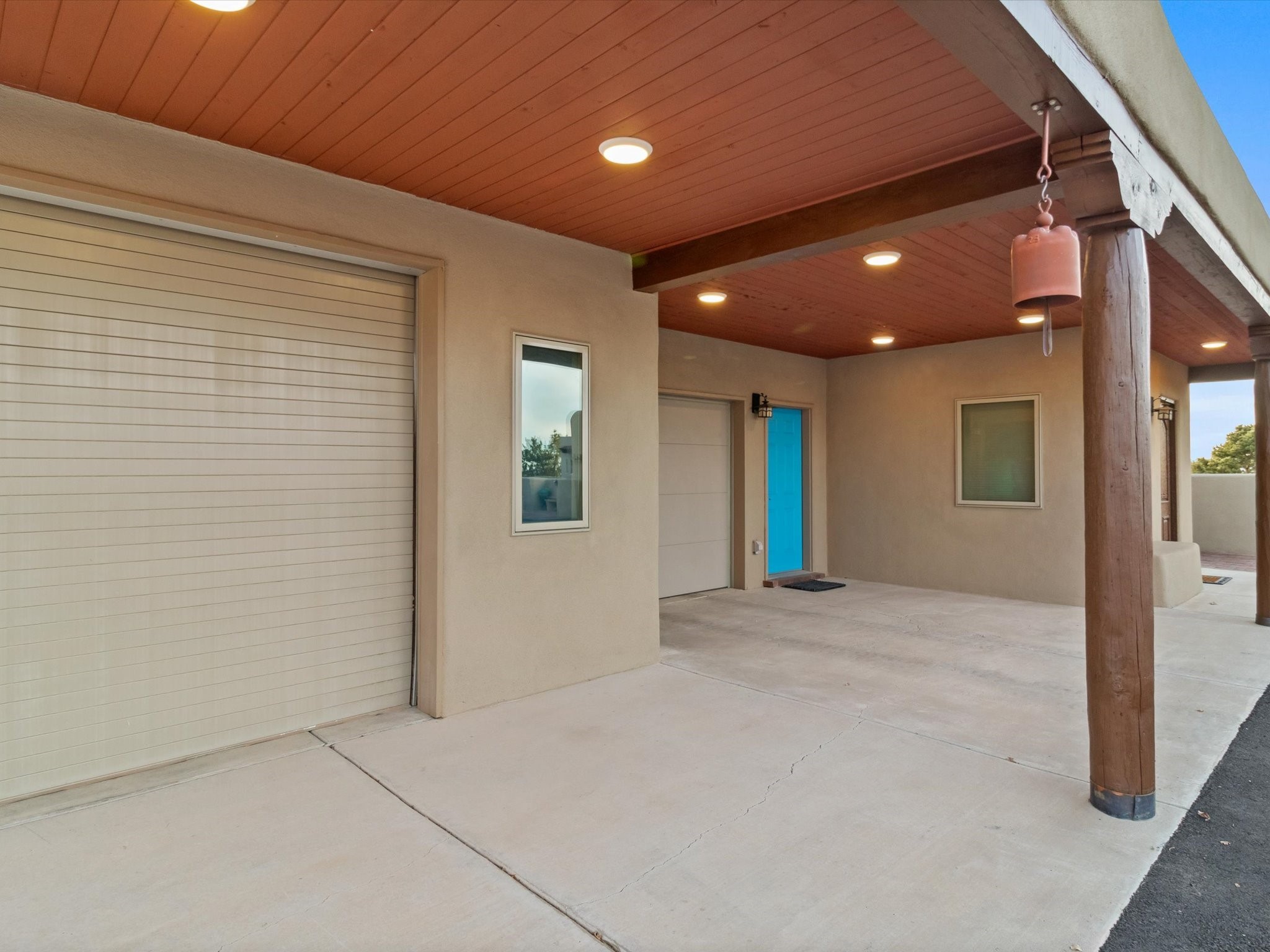 Inviting spaces inside and out, with incredible views all around. Just what you have been searching for! Quality construction placed perfectly on this 2.5 acre lot takes full advantage of our beautiful Sangre De Cristos, Ortiz, Sandia and Jemez mountains with breathtaking sunrises and sunsets. The floor plan welcomes unique and grand spacious areas of a peaceful home or generous areas for entertaining. Large pine vega beams/corbels accents throughout, large windows capture warm light and amazing mountainous views. Stylish kitchen with granite countertops, stainless steel appliances, maple cabinetry with high cabinets affixed with stunning stamped tin fronts allow versatility for all occasions. Foyer leads into a gorgeous Kiva fireplace in the living room. The master bedroom provides a relaxing oasis with its own sitting area and Kiva fireplace, a beautiful open bathroom space, walk-in closet and personal door to the portal with immediate access to an outdoor hot tub. WIRSBO PEX tubing keeps the radiant floor warm during the winter season. Outside, 3 Spanish heritage portals are enhanced with pine columns, beams/corbels and brick floors. A 2-car garage provides entry to the kitchen. The meticulously landscaped yard boasts an underground sprinkler system with a drip system keeping trees, bushes and flowers lush and beautiful. Front courtyard large area with outdoor table/chairs embraced by a raised circular iron fence.The expansive walkways challenge the square footage of the interior. Coordinating with walkways, over 1,200 linear feet of beautiful stucco walls and terraces adorn the outside. A coyote fence surrounds a spacious 2.5 acre lot with 2-sided colored entry gate requiring code access, along with a pedestrian gate similarly locked. ADT alarms wired for intruders and fire/CO1 alarms are used in the house and outbuildings. This home is truly breathtaking and an absolute must-see to appreciate all its beauty. Schedule your tour today!