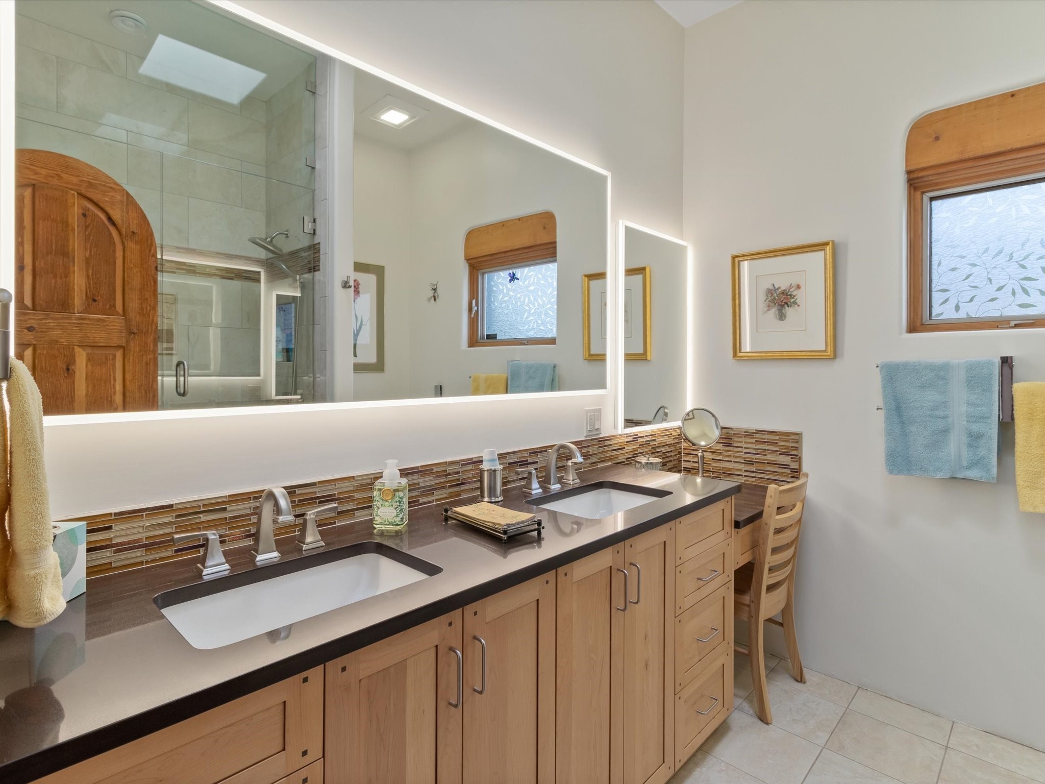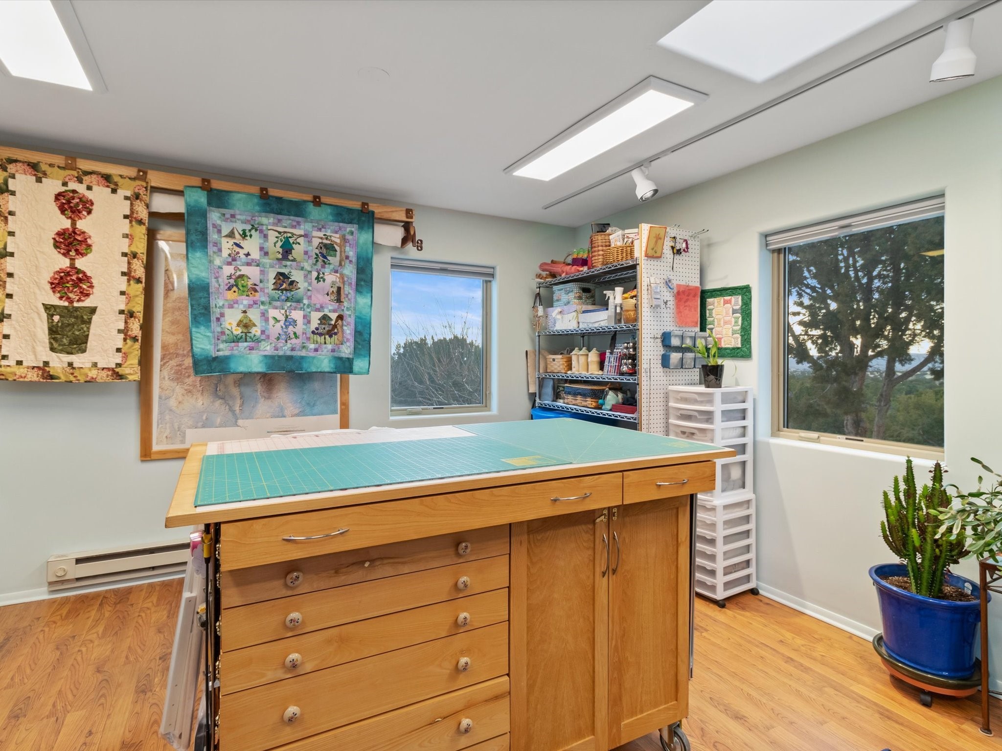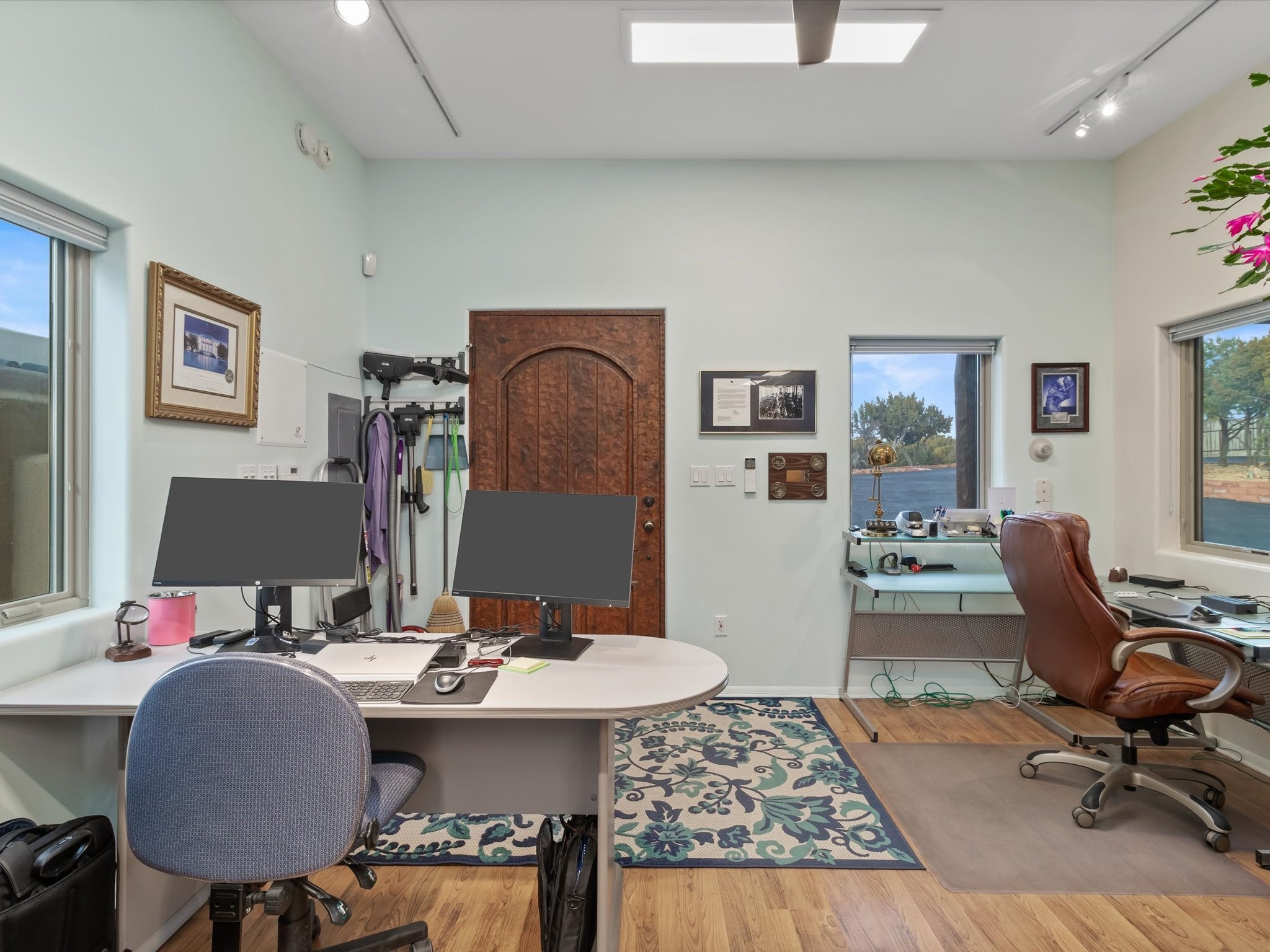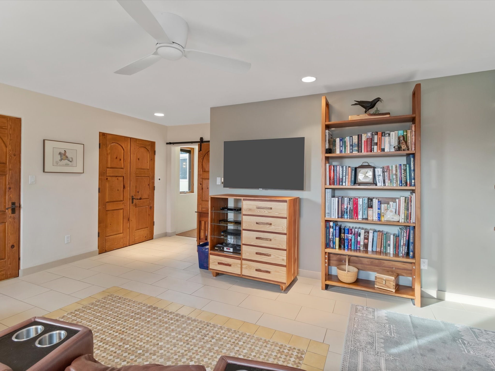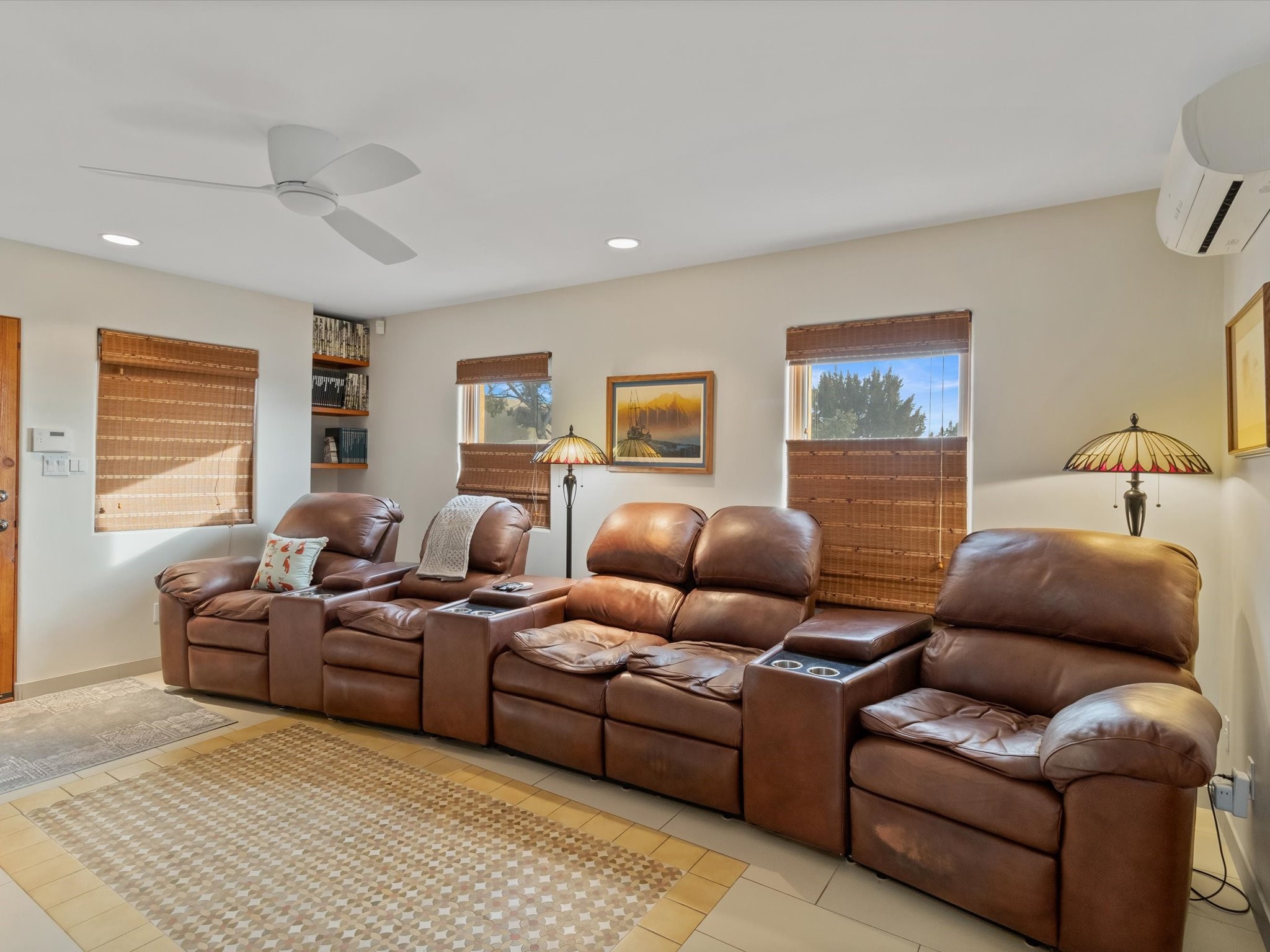 Inviting spaces inside and out, with incredible views all around. Just what you have been searching for! Quality construction placed perfectly on this 2.5 acre lot takes full advantage of our beautiful Sangre De Cristos, Ortiz, Sandia and Jemez mountains with breathtaking sunrises and sunsets. The floor plan welcomes unique and grand spacious areas of a peaceful home or generous areas for entertaining. Large pine vega beams/corbels accents throughout, large windows capture warm light and amazing mountainous views. Stylish kitchen with granite countertops, stainless steel appliances, maple cabinetry with high cabinets affixed with stunning stamped tin fronts allow versatility for all occasions. Foyer leads into a gorgeous Kiva fireplace in the living room. The master bedroom provides a relaxing oasis with its own sitting area and Kiva fireplace, a beautiful open bathroom space, walk-in closet and personal door to the portal with immediate access to an outdoor hot tub. WIRSBO PEX tubing keeps the radiant floor warm during the winter season. Outside, 3 Spanish heritage portals are enhanced with pine columns, beams/corbels and brick floors. A 2-car garage provides entry to the kitchen. The meticulously landscaped yard boasts an underground sprinkler system with a drip system keeping trees, bushes and flowers lush and beautiful. Front courtyard large area with outdoor table/chairs embraced by a raised circular iron fence.The expansive walkways challenge the square footage of the interior. Coordinating with walkways, over 1,200 linear feet of beautiful stucco walls and terraces adorn the outside. A coyote fence surrounds a spacious 2.5 acre lot with 2-sided colored entry gate requiring code access, along with a pedestrian gate similarly locked. ADT alarms wired for intruders and fire/CO1 alarms are used in the house and outbuildings. This home is truly breathtaking and an absolute must-see to appreciate all its beauty. Schedule your tour today!
