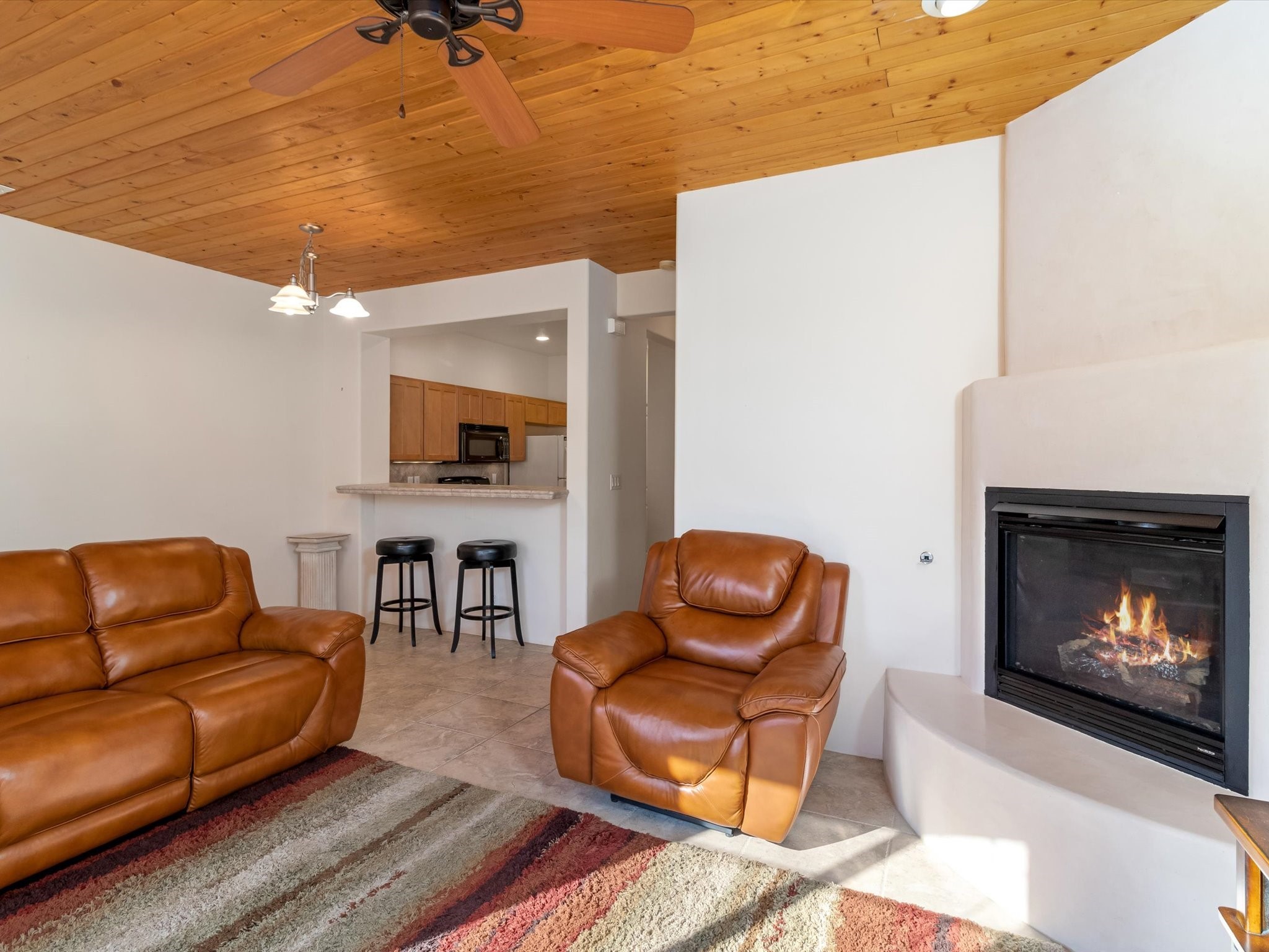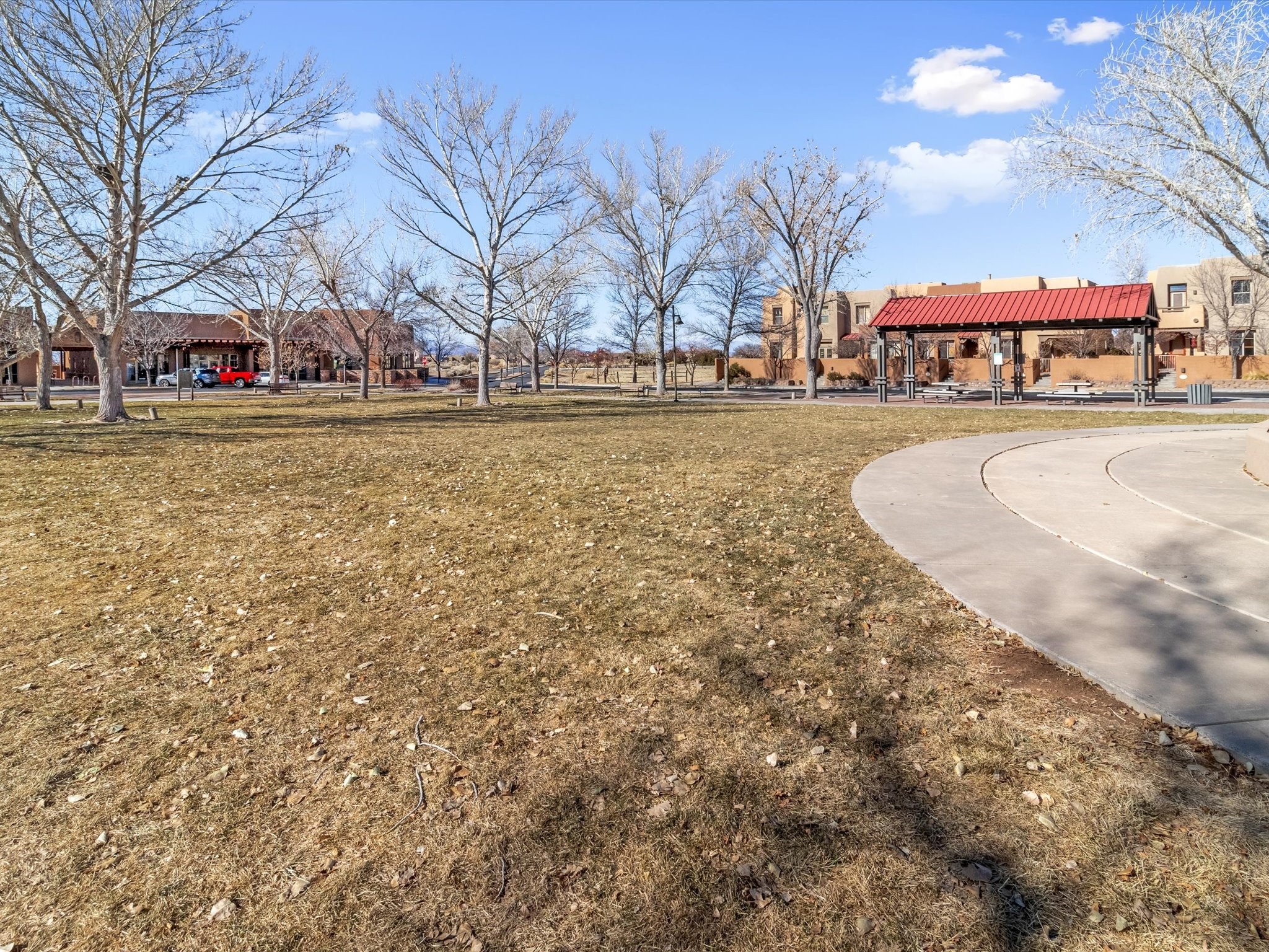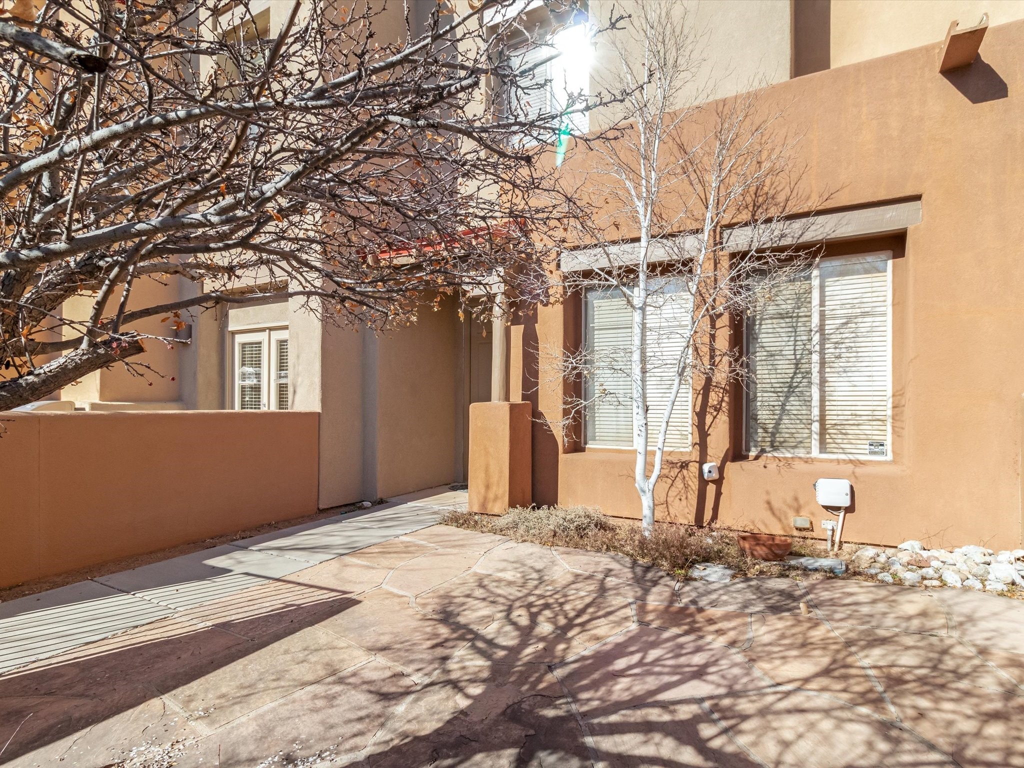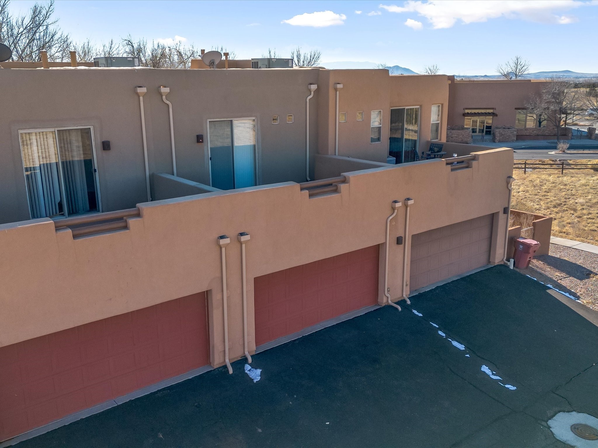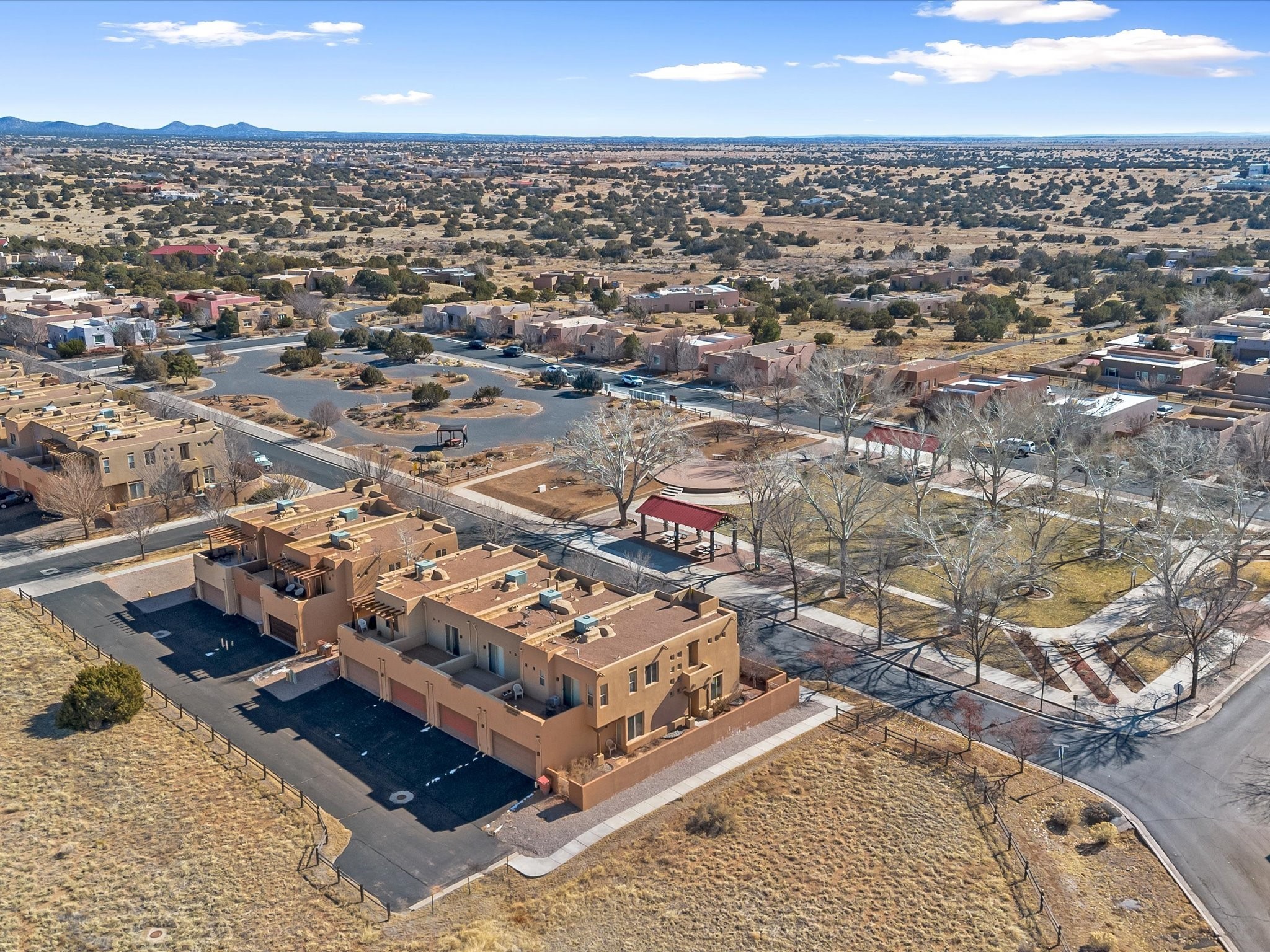 Welcome to this comfortable and warm townhome, gently lived in and located directly across from Rancho Viejo Village Park Plaza. As you step inside, you're greeted by charming tongue and groove ceilings that open up to a spacious living area--ideal for easy entertaining and everyday living. This home features 2 bedrooms, each with their own en-suite bathrooms, offering privacy and convenience. The primary bedroom opens to a large deck with stunning views, perfect for relaxing outdoors. Enjoy the natural light that floods each room, creating a bright and welcoming atmosphere. The thoughtful floor plan provides excellent separation between the bedrooms, ensuring peace and privacy. A generous front courtyard adds to the charm, offering an inviting space for outdoor gatherings or quiet moments in the fresh air. The home is surrounded by beautiful trails and ample open space for outdoor activities, and is conveniently located near Santa Fe Community College with easy access to I-25 for quick commutes. This townhome is a perfect blend of comfort, convenience, and scenic beauty. Don't wait to schedule a private showing today!