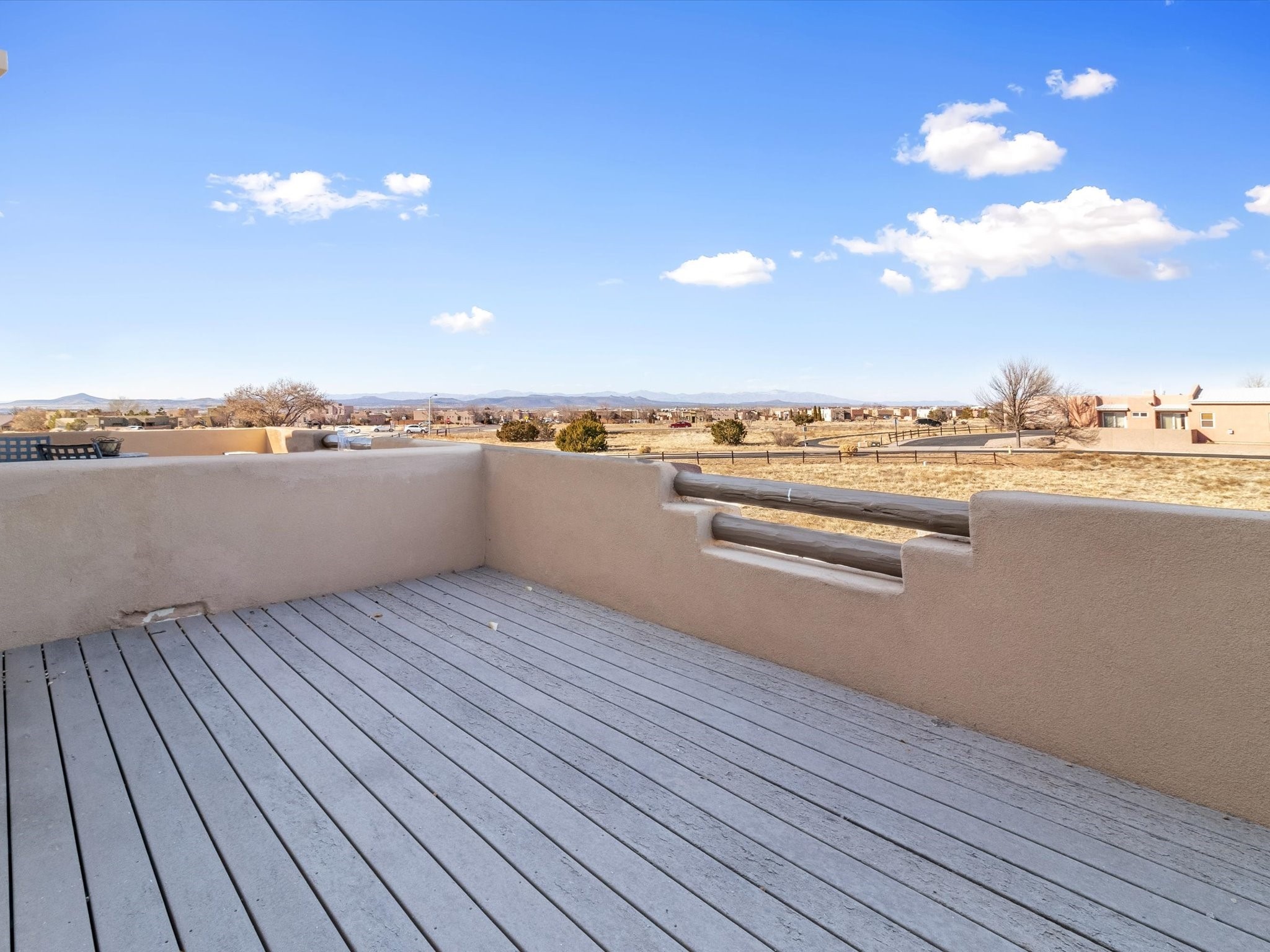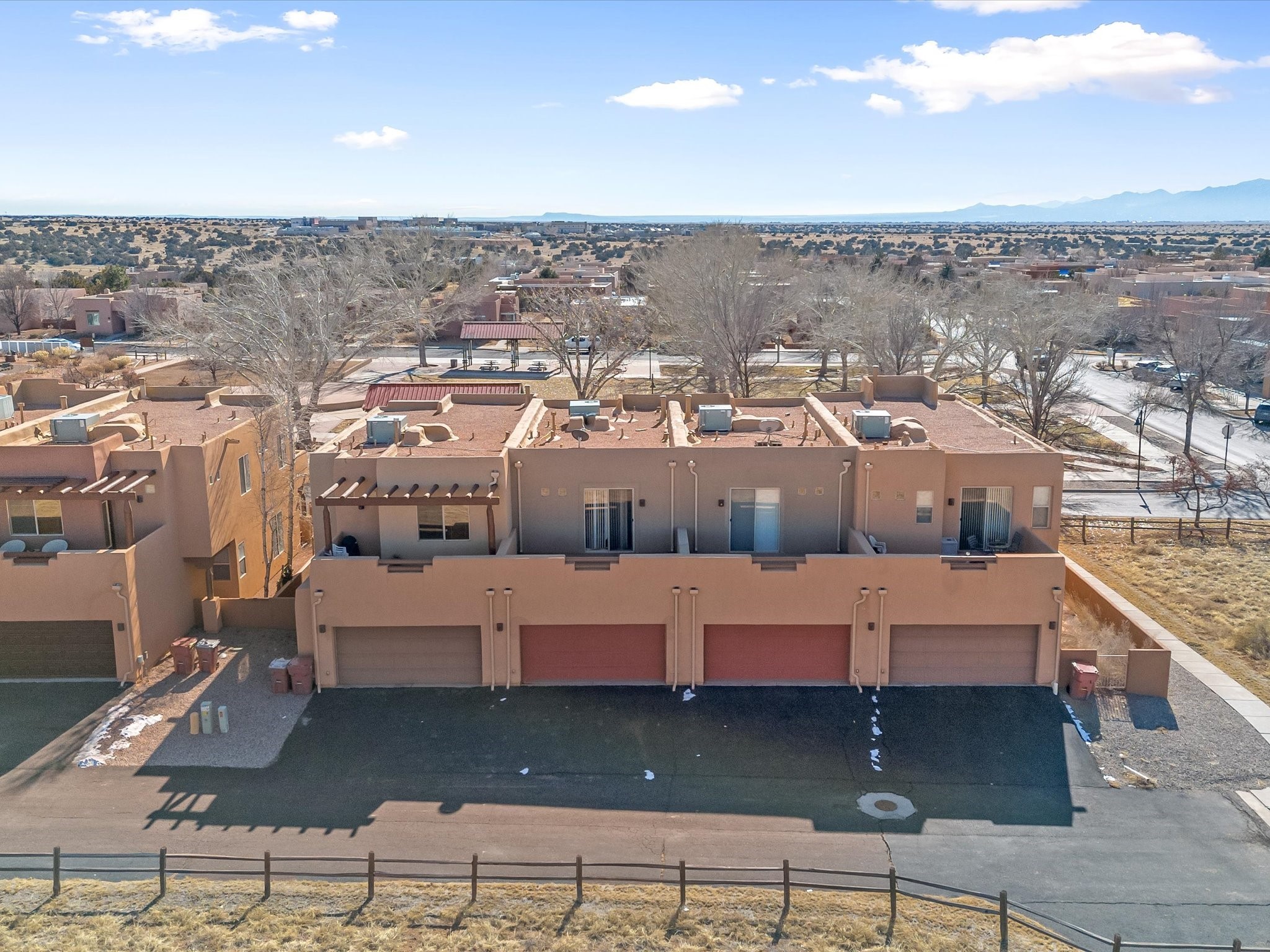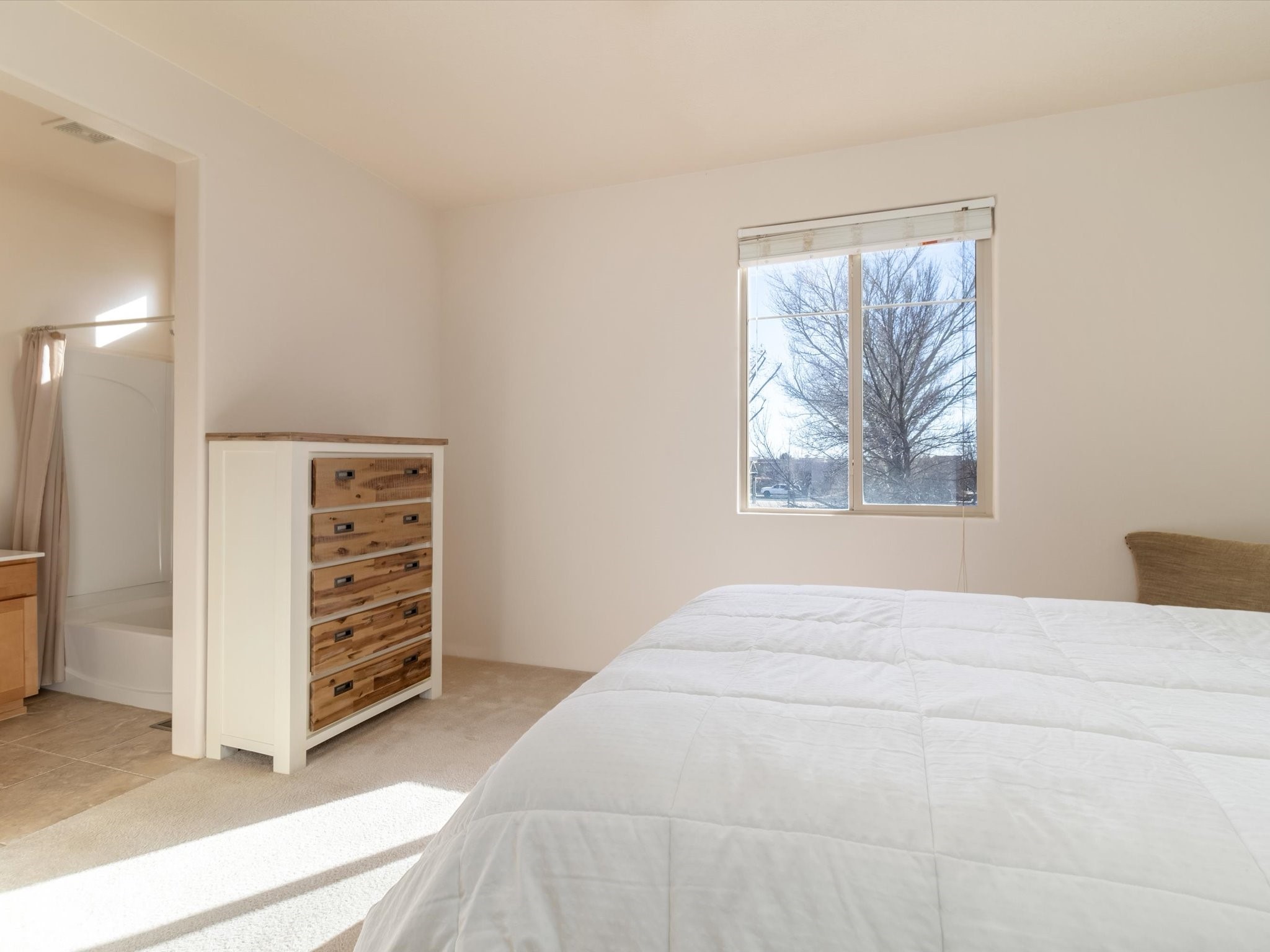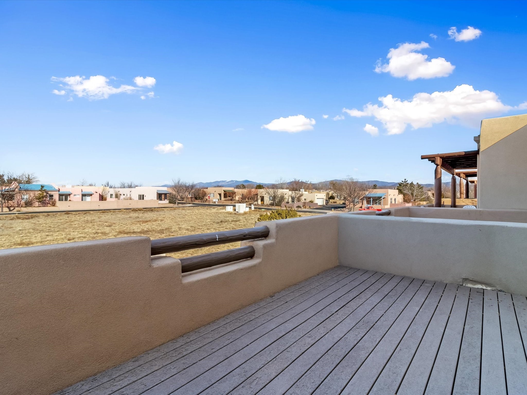 Welcome to this comfortable and warm townhome, gently lived in and located directly across from Rancho Viejo Village Park Plaza. As you step inside, you're greeted by charming tongue and groove ceilings that open up to a spacious living area--ideal for easy entertaining and everyday living. This home features 2 bedrooms, each with their own en-suite bathrooms, offering privacy and convenience. The primary bedroom opens to a large deck with stunning views, perfect for relaxing outdoors. Enjoy the natural light that floods each room, creating a bright and welcoming atmosphere. The thoughtful floor plan provides excellent separation between the bedrooms, ensuring peace and privacy. A generous front courtyard adds to the charm, offering an inviting space for outdoor gatherings or quiet moments in the fresh air. The home is surrounded by beautiful trails and ample open space for outdoor activities, and is conveniently located near Santa Fe Community College with easy access to I-25 for quick commutes. This townhome is a perfect blend of comfort, convenience, and scenic beauty. Don't wait to schedule a private showing today!