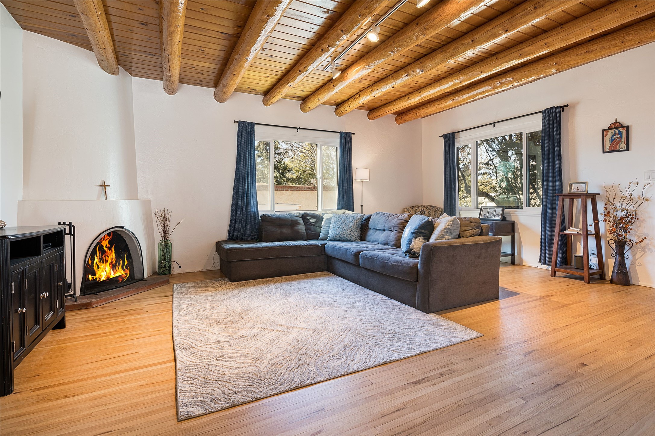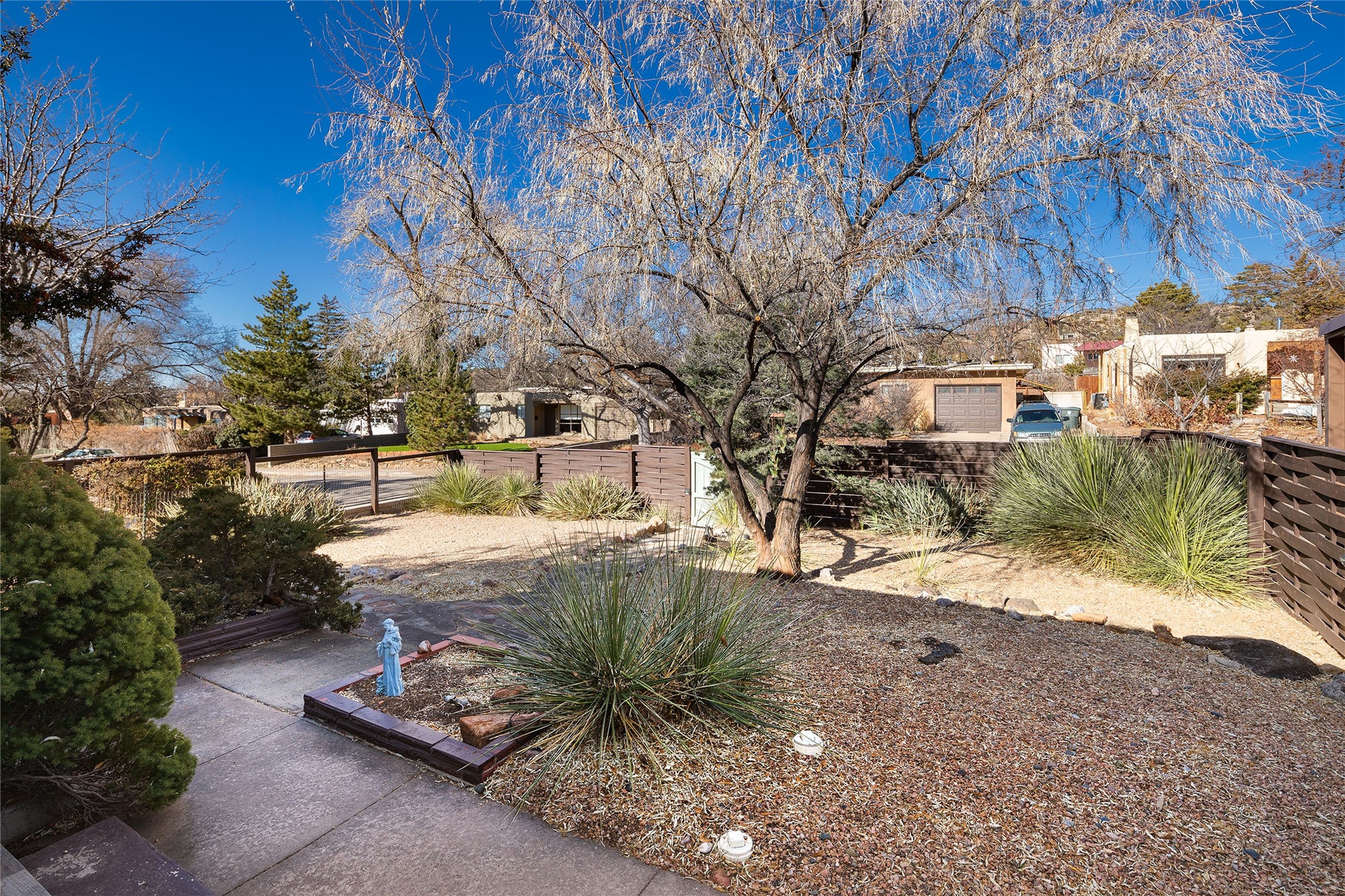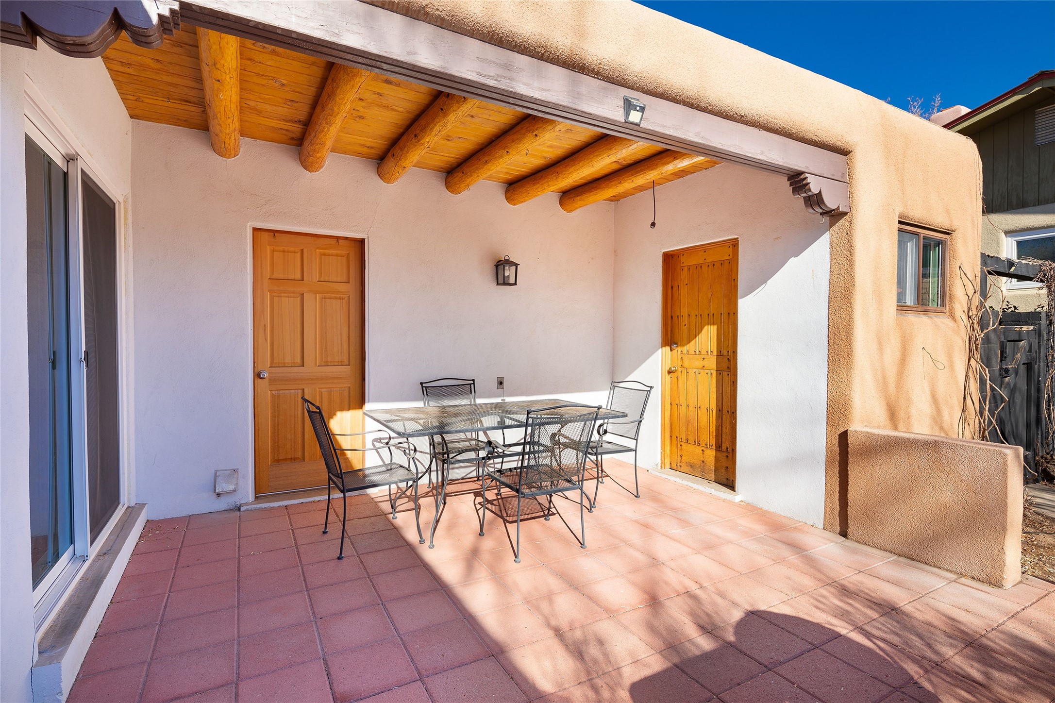 Located on one of the most iconic streets in Casa Solana, within walking distance to the Plaza, shopping and restaurants, this exceptional, updated Stamm-built home, excites and captivates with timeliness Santa Fe architecture, perfectly blended with a modern flare and impresses with updated, expansive front and backyard outdoor living areas. Ideal as a primary residence or the ultimate secondary home retreat, this one of a kind, in-town residence, incorporates the unique blend of contemporary design features and updates, with the inherent warmth of a quality Santa Fe home. This special 3 bedroom, 2 bath home, with a one car garage, plus a carport and an attached heated storage room, is one of the finest homes in Casa Solana. Ideal for entertaining, the open-concept floor plan offers a spacious living room with courtyard views and a cozy kiva fireplace and dining room, located directly off the kitchen, with access to the vast outdoor entertainment areas through sliding glass doors. The updated, well-appointed modern kitchen delights with stainless Samsung appliances and a pantry, accessed from the adjacent laundry room with ample storage. The owner's suite enjoys tranquil views of the beautifully landscaped backyard and an updated ensuite bath. The two guest bedrooms share an updated full bath with spa-like marble-top vanity. The extraordinary outdoor living areas are truly a rarity, starting with the impressive, landscaped, fully enclosed front entrance courtyard and the massive backyard, which is also fully enclosed and ideal for endless outdoor activities. Exceptional features include exquisite hardwood and tile flooring throughout the main living areas, rich wood plank ceilings with vigas in the living room, soft natural light throughout, central heating air conditioning and a one-car garage with an attached workshop space or extra storage. This home is a true rare offering and not to be missed!