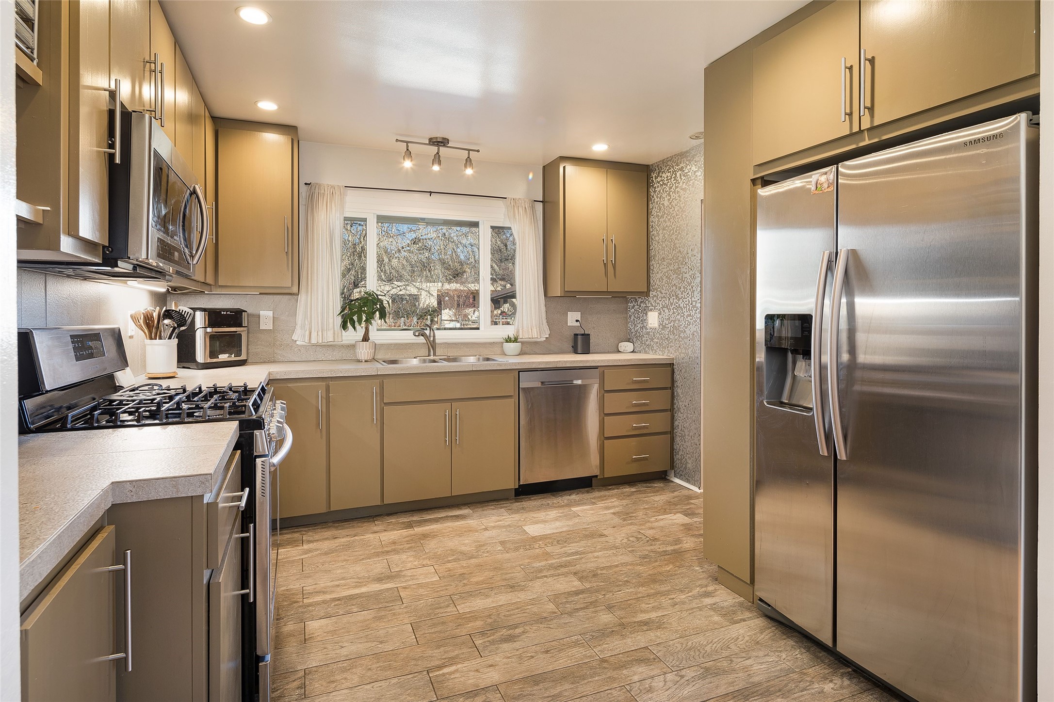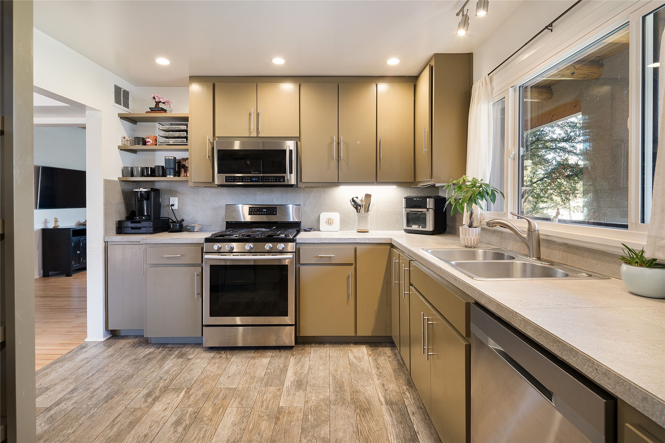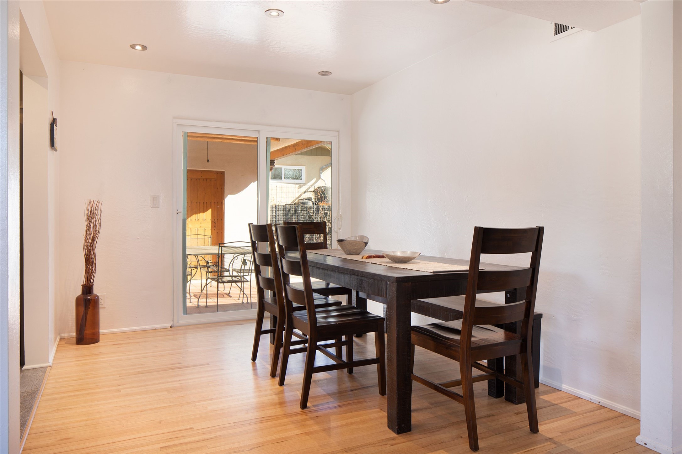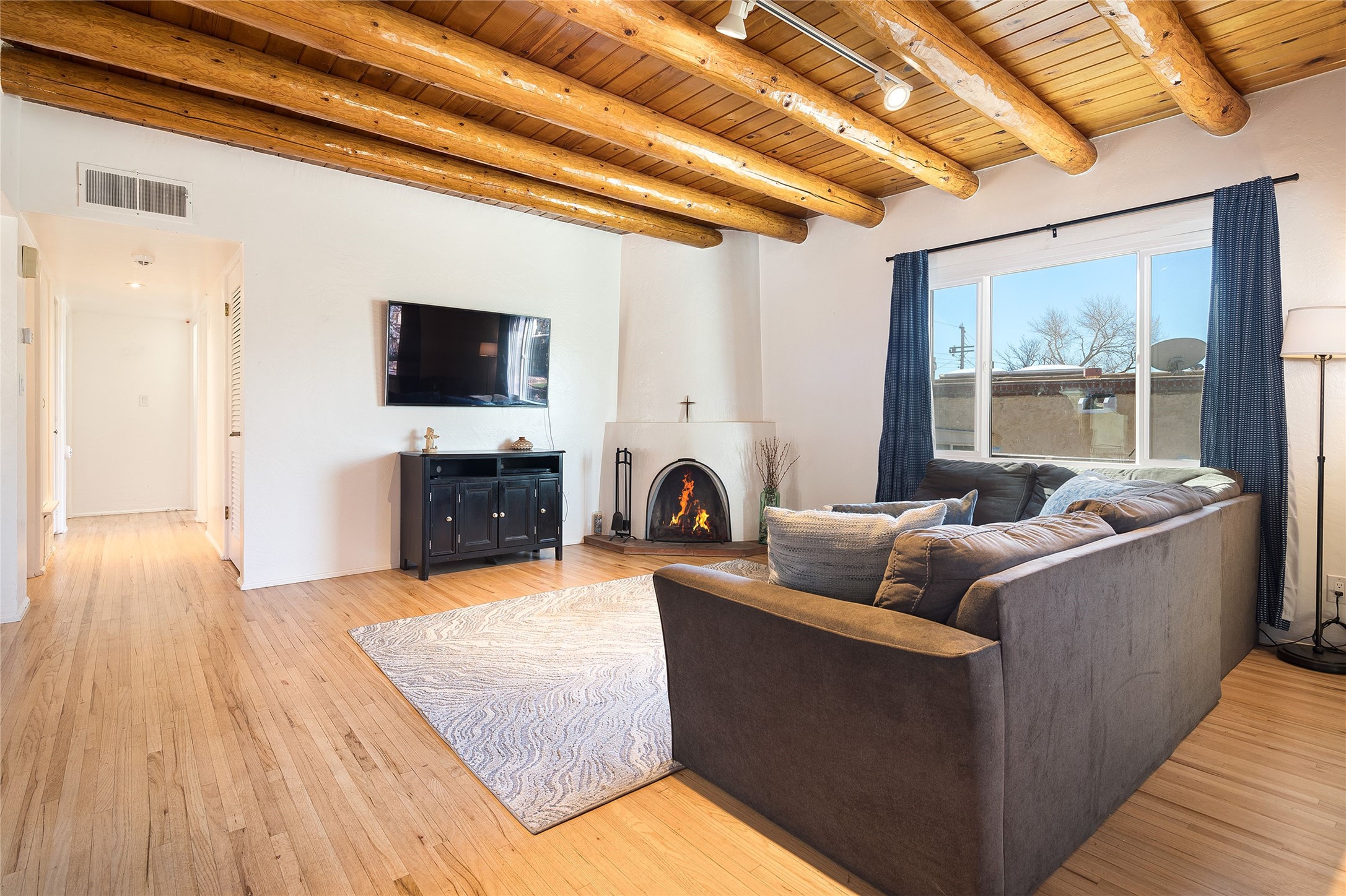 Located on one of the most iconic streets in Casa Solana, within walking distance to the Plaza, shopping and restaurants, this exceptional, updated Stamm-built home, excites and captivates with timeliness Santa Fe architecture, perfectly blended with a modern flare and impresses with updated, expansive front and backyard outdoor living areas. Ideal as a primary residence or the ultimate secondary home retreat, this one of a kind, in-town residence, incorporates the unique blend of contemporary design features and updates, with the inherent warmth of a quality Santa Fe home. This special 3 bedroom, 2 bath home, with a one car garage, plus a carport and an attached heated storage room, is one of the finest homes in Casa Solana. Ideal for entertaining, the open-concept floor plan offers a spacious living room with courtyard views and a cozy kiva fireplace and dining room, located directly off the kitchen, with access to the vast outdoor entertainment areas through sliding glass doors. The updated, well-appointed modern kitchen delights with stainless Samsung appliances and a pantry, accessed from the adjacent laundry room with ample storage. The owner's suite enjoys tranquil views of the beautifully landscaped backyard and an updated ensuite bath. The two guest bedrooms share an updated full bath with spa-like marble-top vanity. The extraordinary outdoor living areas are truly a rarity, starting with the impressive, landscaped, fully enclosed front entrance courtyard and the massive backyard, which is also fully enclosed and ideal for endless outdoor activities. Exceptional features include exquisite hardwood and tile flooring throughout the main living areas, rich wood plank ceilings with vigas in the living room, soft natural light throughout, central heating air conditioning and a one-car garage with an attached workshop space or extra storage. This home is a true rare offering and not to be missed!