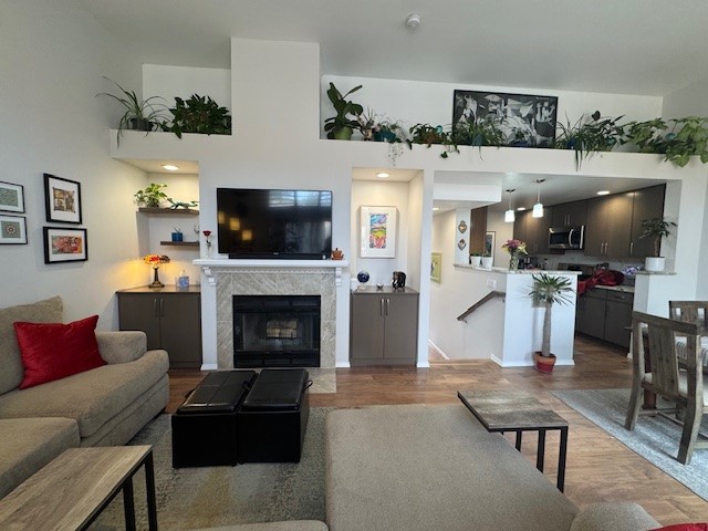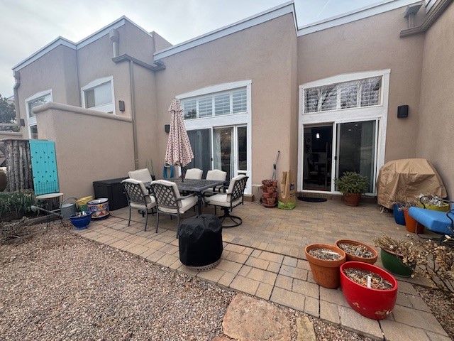 This 2 Bed/2Bath condo is walking distance to the Plaza with full access to restaurants, events, galleries and trails. The home also includes high ceilings with tons of natural light, an open concept living, dining, & kitchen area, with custom cabinetry, high-end appliances, and granite countertops. Walk out patio for entertaining, enjoying the spacious patio with privacy hill behind. There is central air conditioning, fireplace, shuttered windows, bamboo floors. The upstairs, conveniently separated from secondary bedroom has fantastic views and includes an outside balcony with unobstructed views of Zozobra at Ft. Marcy, and stunning Santa Fe skies. There is one reserved carport space plus an extra parking place, all behind a gated entry.
