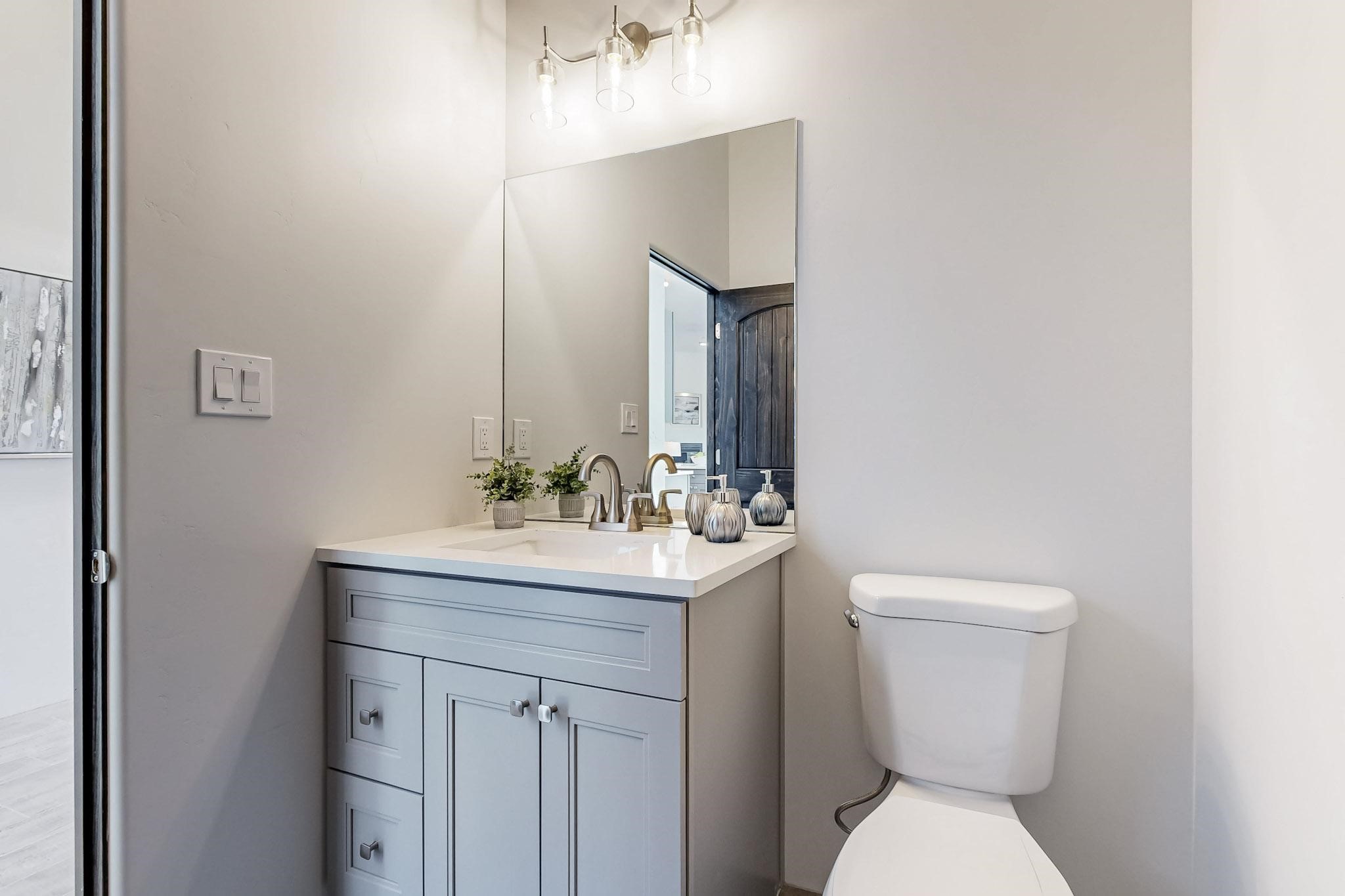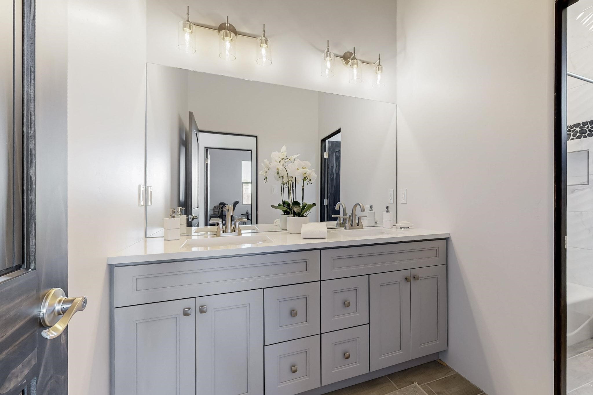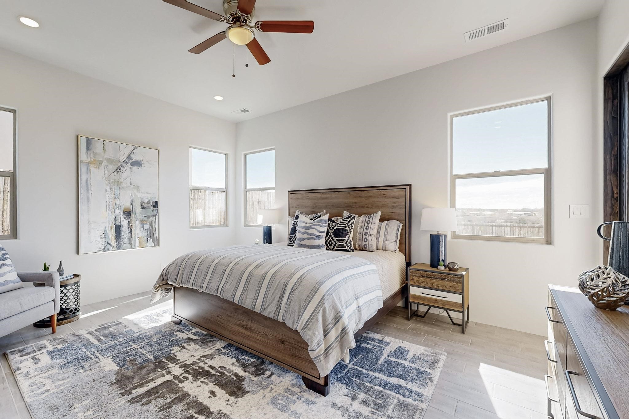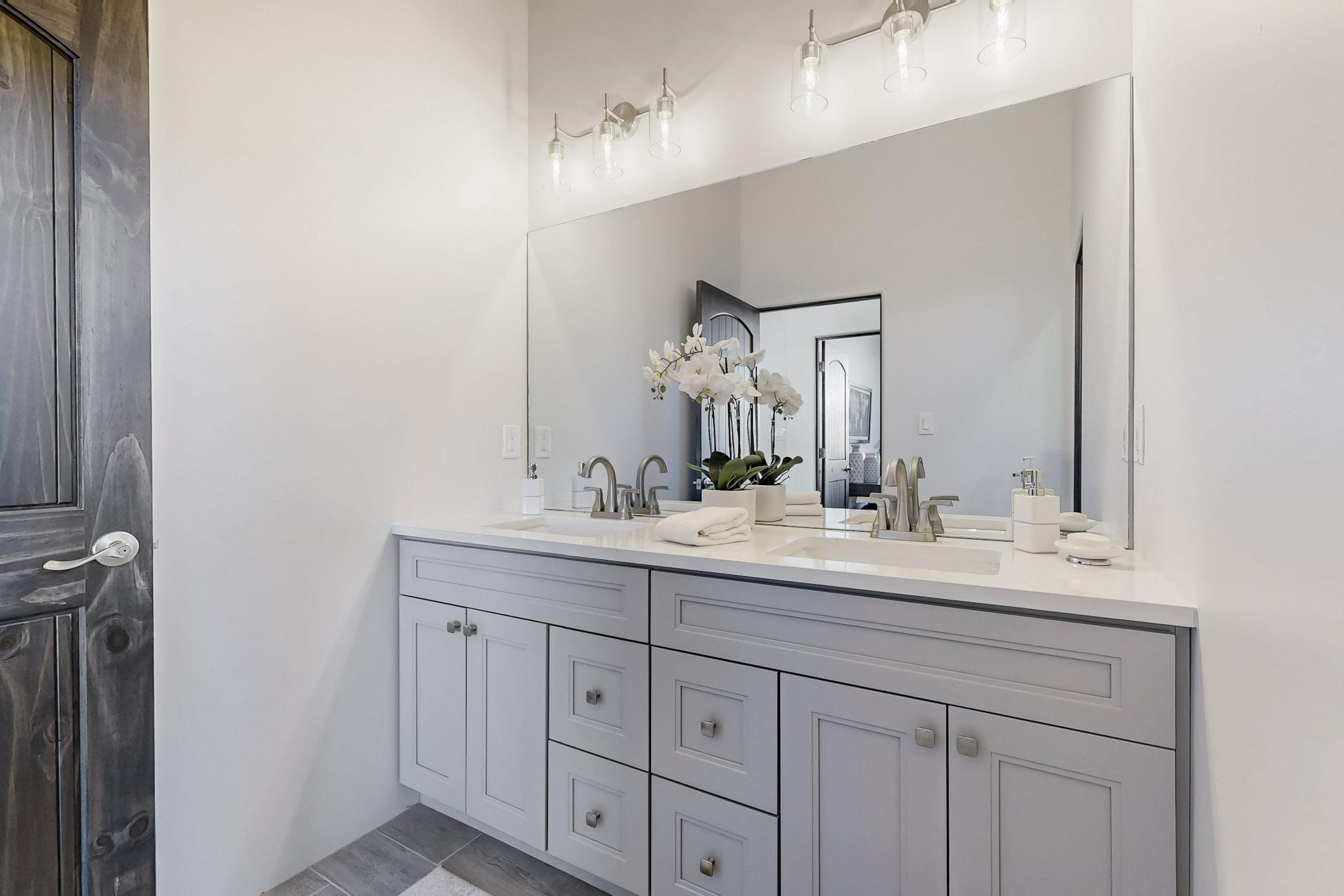 Step into luxury at 28 La Pradera, a 2350 square foot contemporary home designed for comfort, entertaining and breathtaking 180-degree territorial views. A brick-paved covered entry leads to an eight-foot high solid wood door opening into a soaring atrium with clerestory windows. To the right of the entry is a bedroom with a full bath that would be perfect for a home office. To the left is a second bedroom with a walk-in closet. A hall closet provides extra storage. Across is a sliding barn door accessing a large butler's pantry that connects to the kitchen with a swinging door. Open kitchen design with quartz countertops, 17-foot-tall skylight with clerestory windows on all four sides and wired for a chandelier. A powder room has direct access to the rear portal. Also, a secure room for a safe and storage of valuables. The generous owner's suite has wonderful views and double counters and sinks, a free-standing tub, a separate shower with marble and rainfall tile, linen closet, and a 72 sq. ft. walk-in closet. The two-car garage has an epoxied floor and a large room for holiday storage or gift wrapping.
