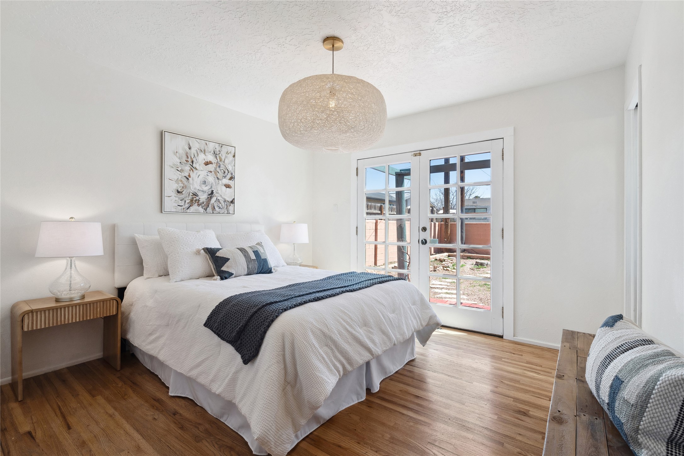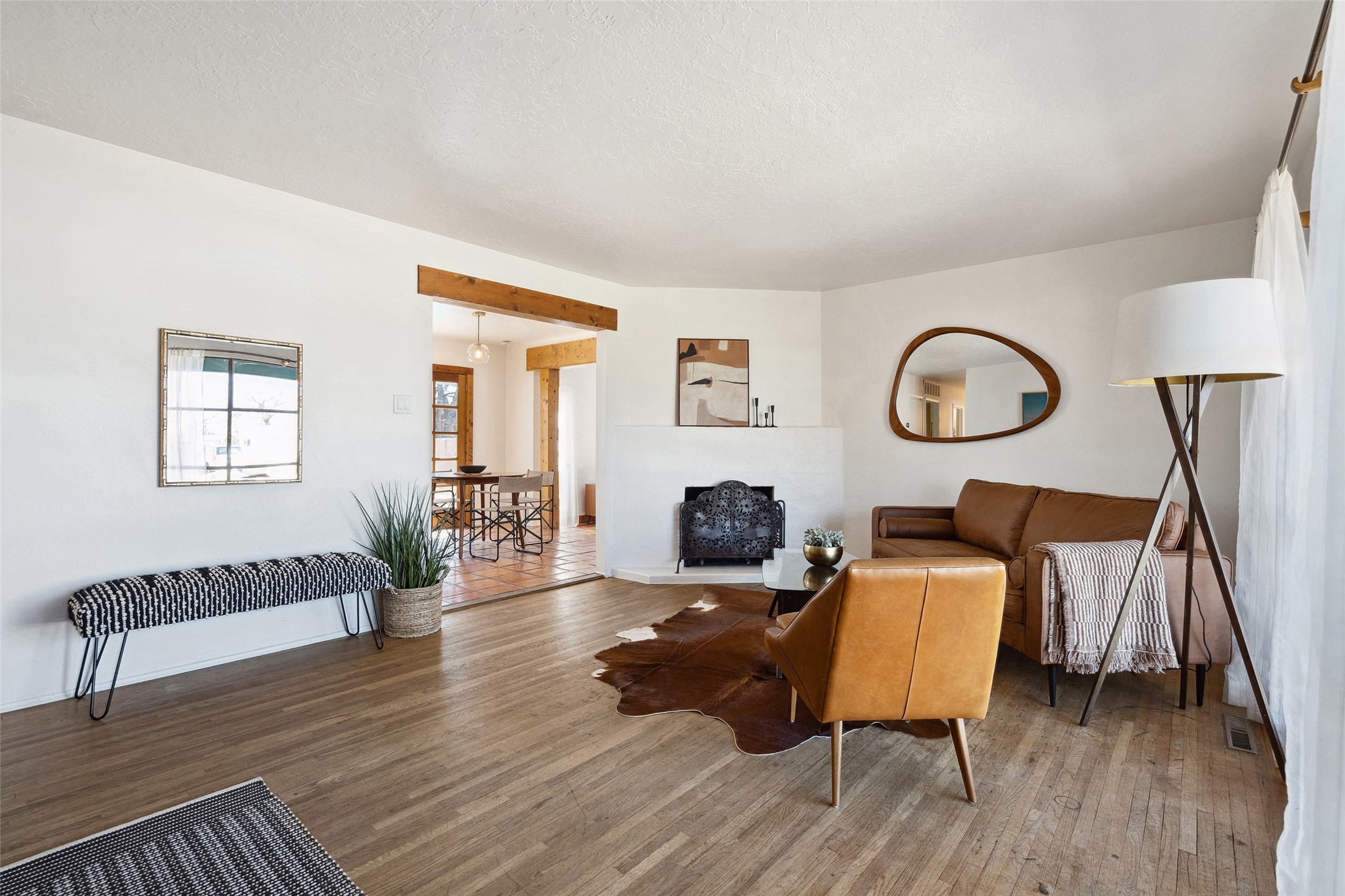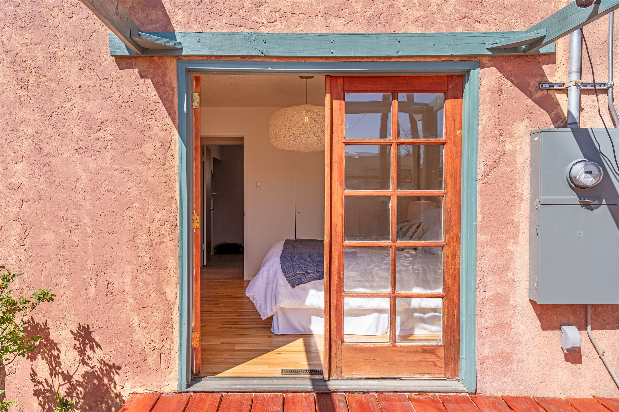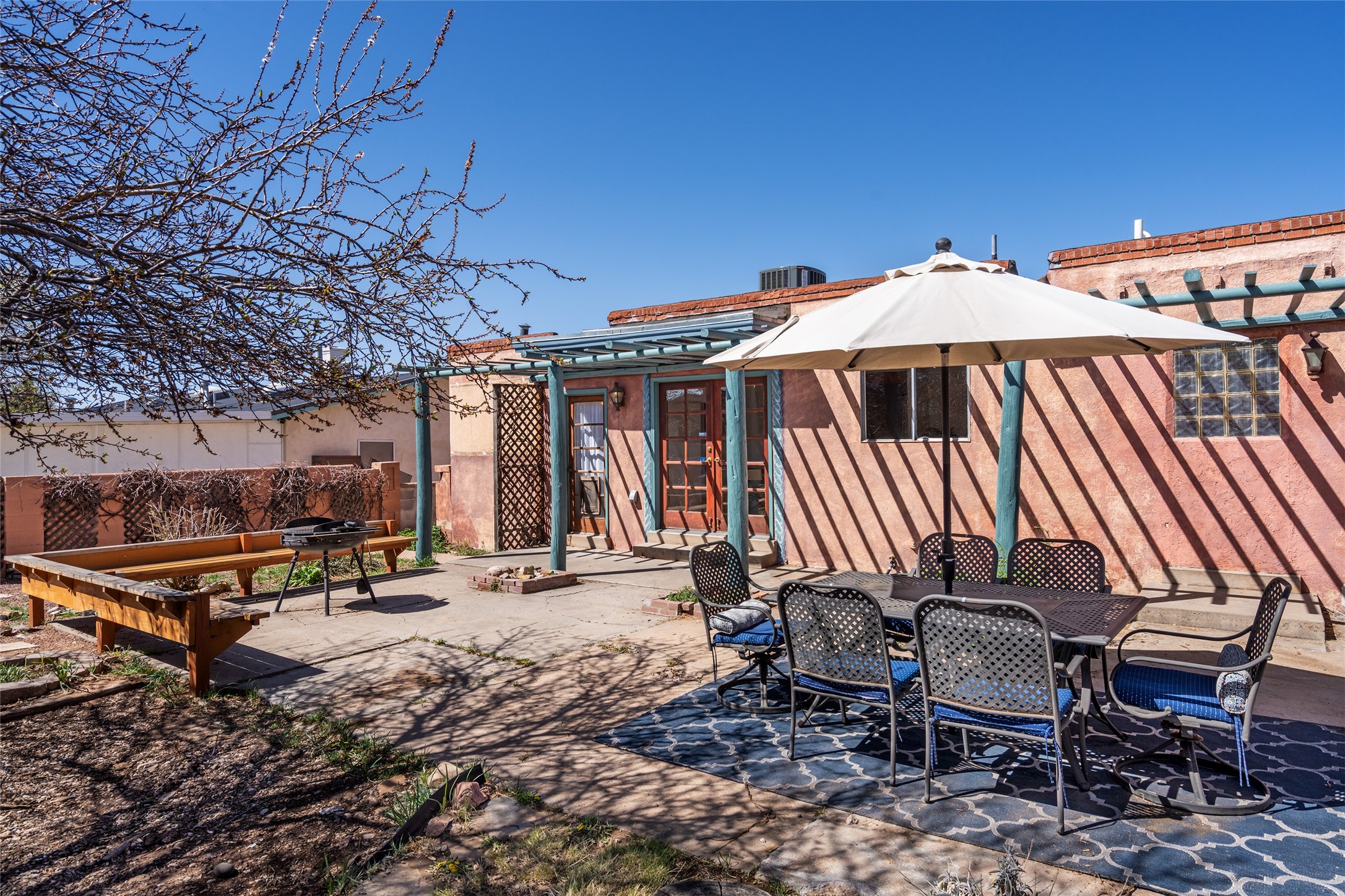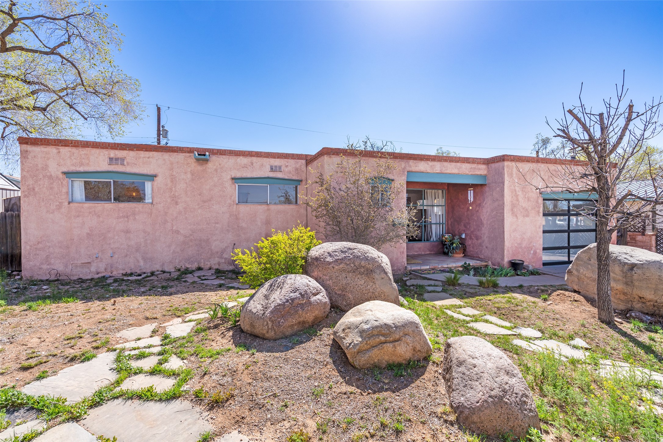 This inviting Stamm-built, territorial style home located in the midtown La Resolana neighborhood offers both charm and convenience. Its central location provides easy access to downtown, parks, and major shopping centers. The main living area features a cozy fireplace and abundant natural light from large casement windows. French doors in the dining area and primary bedroom open onto a spacious backyard, ideal for outdoor dining, entertaining, and gardening. Traditional features such as wooden lintels, original hardwood floors, and saltillo tile add to the home's appeal. With 3 bedrooms, 2 bathrooms, and a converted garage studio that shares the home's heating and air conditioning, this home provides ample space for comfortable living. This sweet home is waiting for its next owner. Schedule a showing today!