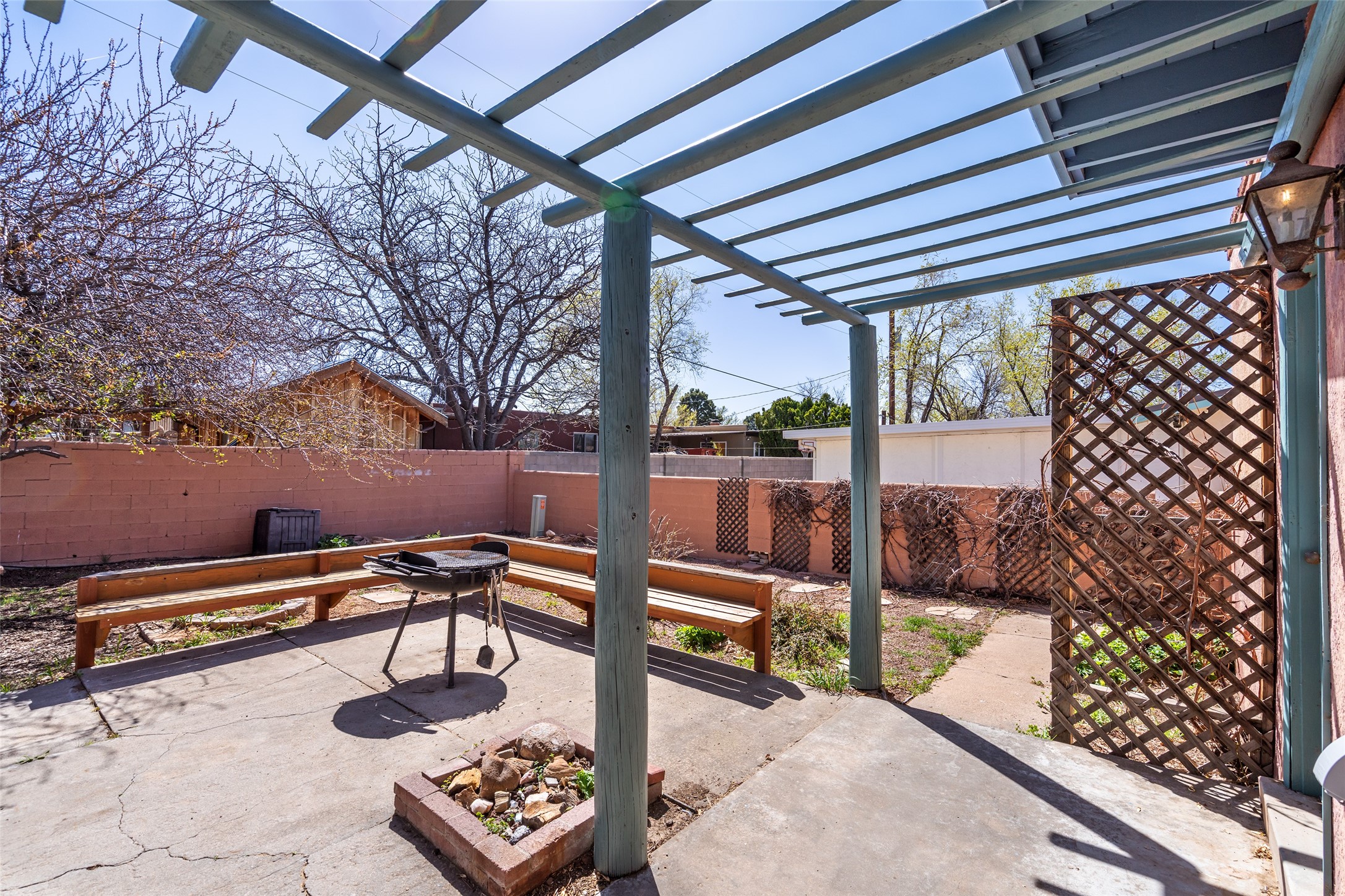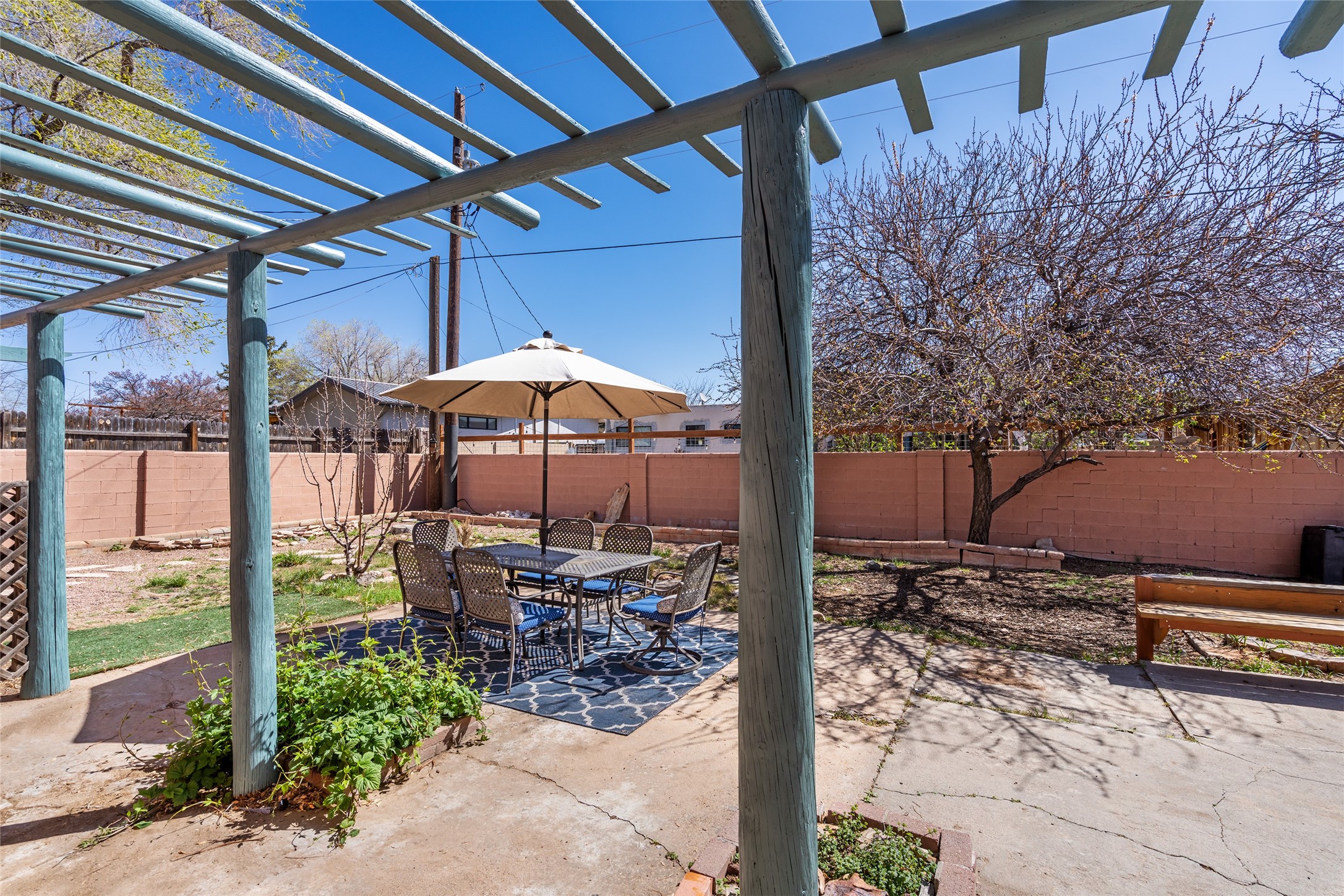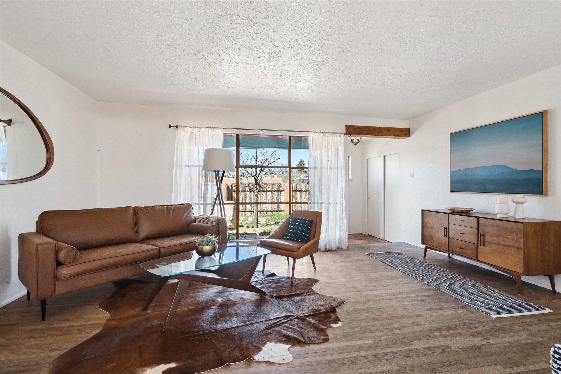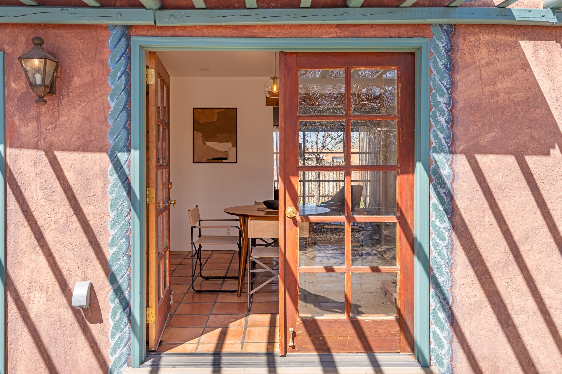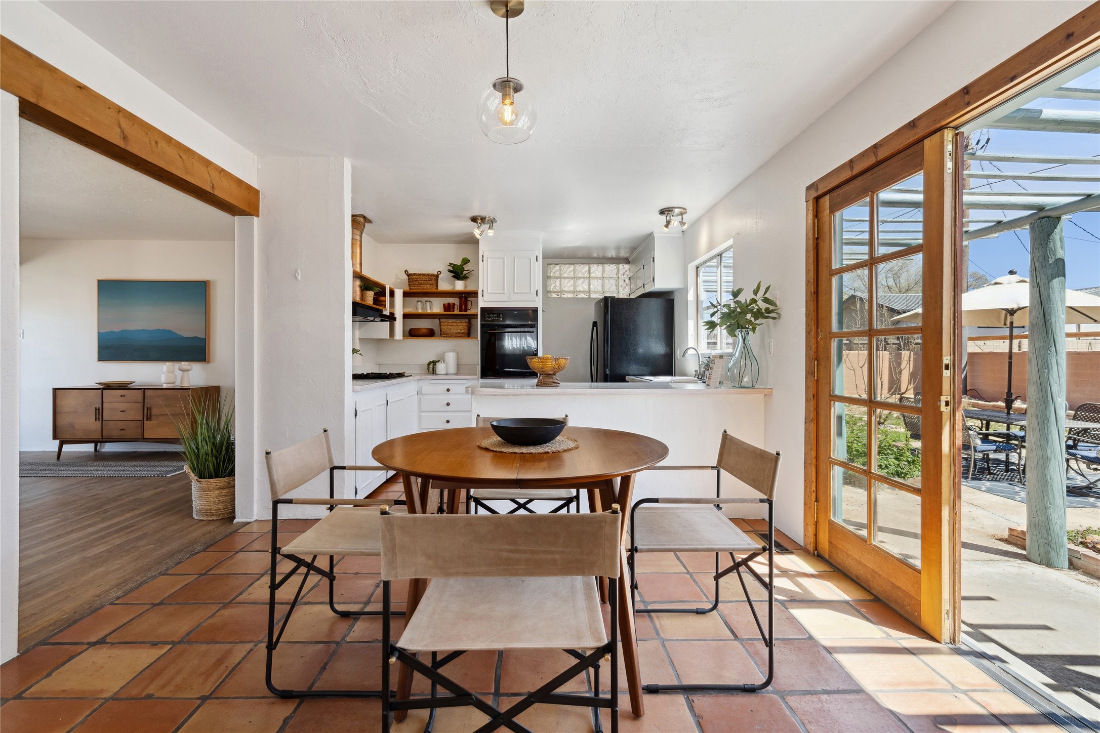 This inviting Stamm-built, territorial style home located in the midtown La Resolana neighborhood offers both charm and convenience. Its central location provides easy access to downtown, parks, and major shopping centers. The main living area features a cozy fireplace and abundant natural light from large casement windows. French doors in the dining area and primary bedroom open onto a spacious backyard, ideal for outdoor dining, entertaining, and gardening. Traditional features such as wooden lintels, original hardwood floors, and saltillo tile add to the home's appeal. With 3 bedrooms, 2 bathrooms, and a converted garage studio that shares the home's heating and air conditioning, this home provides ample space for comfortable living. This sweet home is waiting for its next owner. Schedule a showing today!