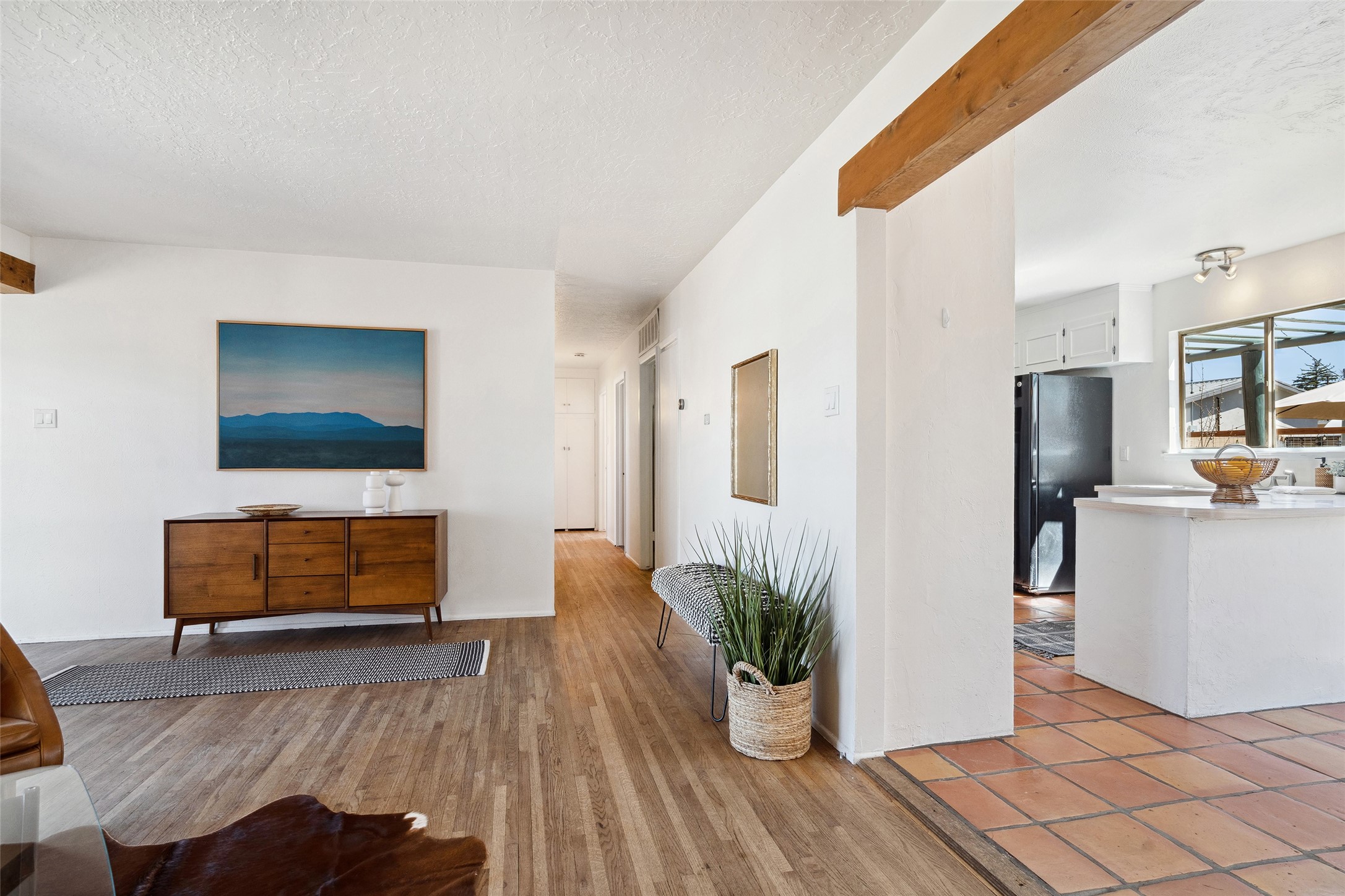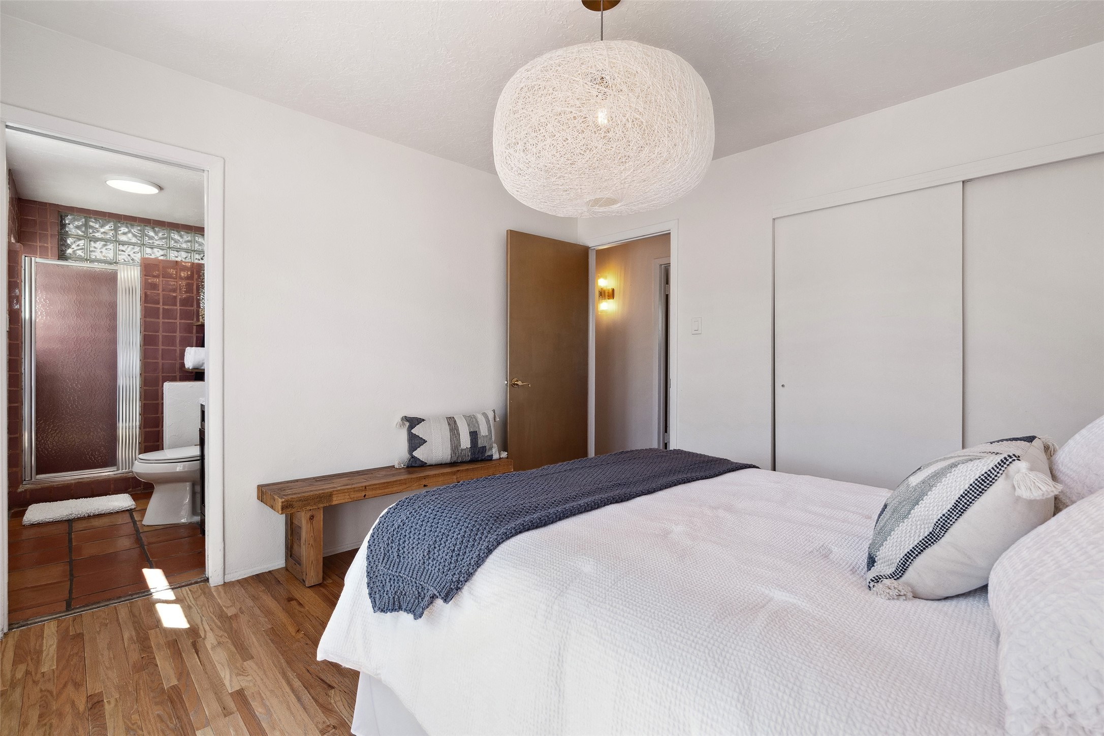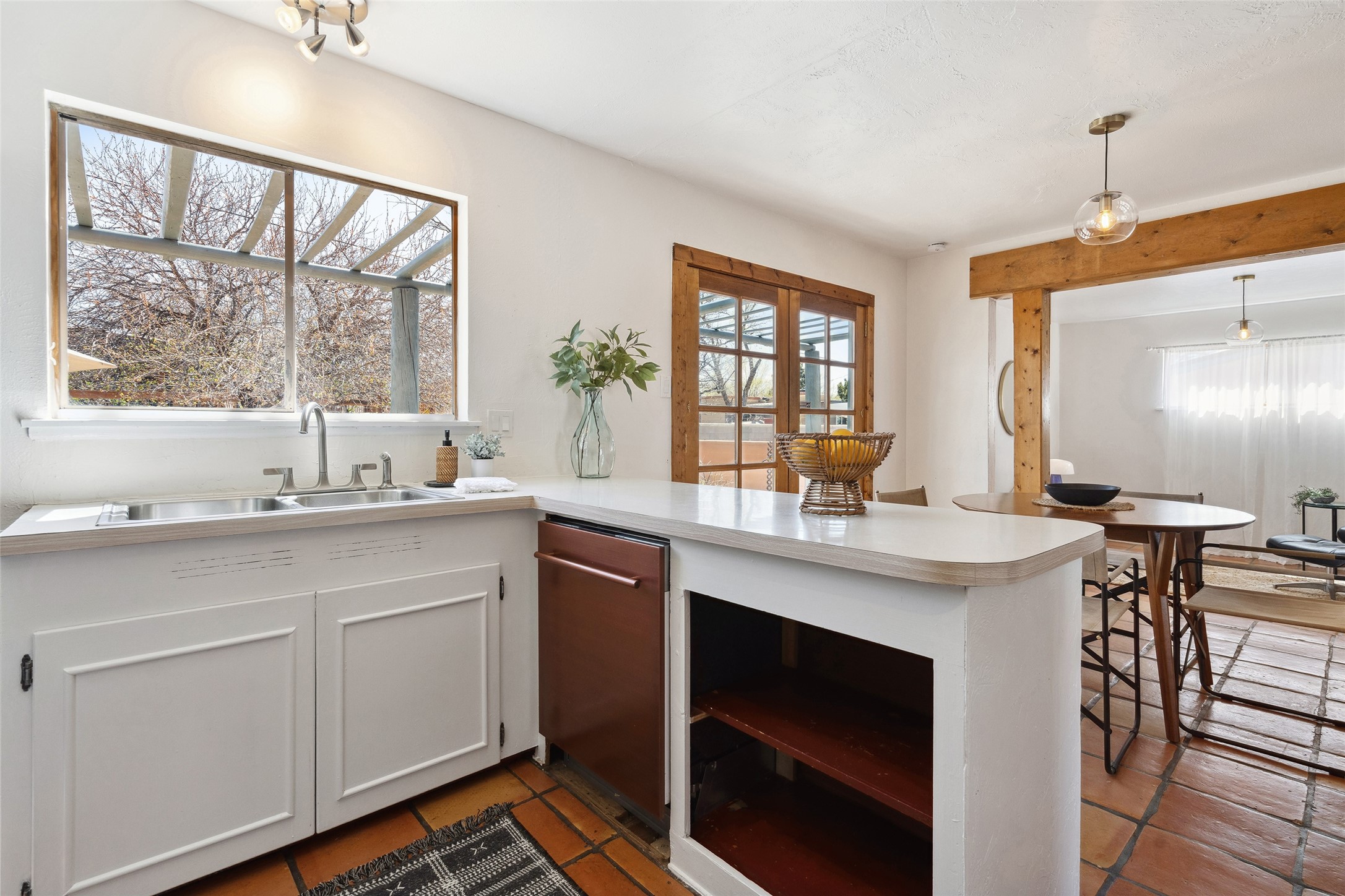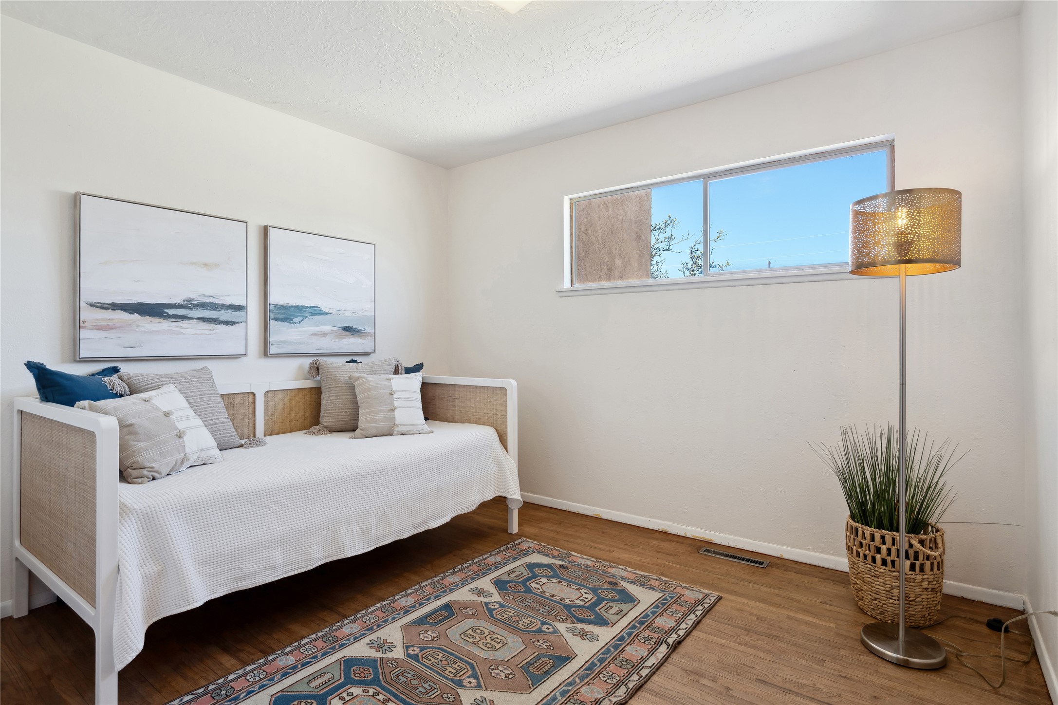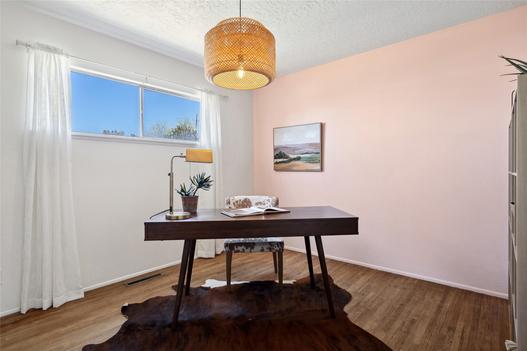 This inviting Stamm-built, territorial style home located in the midtown La Resolana neighborhood offers both charm and convenience. Its central location provides easy access to downtown, parks, and major shopping centers. The main living area features a cozy fireplace and abundant natural light from large casement windows. French doors in the dining area and primary bedroom open onto a spacious backyard, ideal for outdoor dining, entertaining, and gardening. Traditional features such as wooden lintels, original hardwood floors, and saltillo tile add to the home's appeal. With 3 bedrooms, 2 bathrooms, and a converted garage studio that shares the home's heating and air conditioning, this home provides ample space for comfortable living. This sweet home is waiting for its next owner. Schedule a showing today!