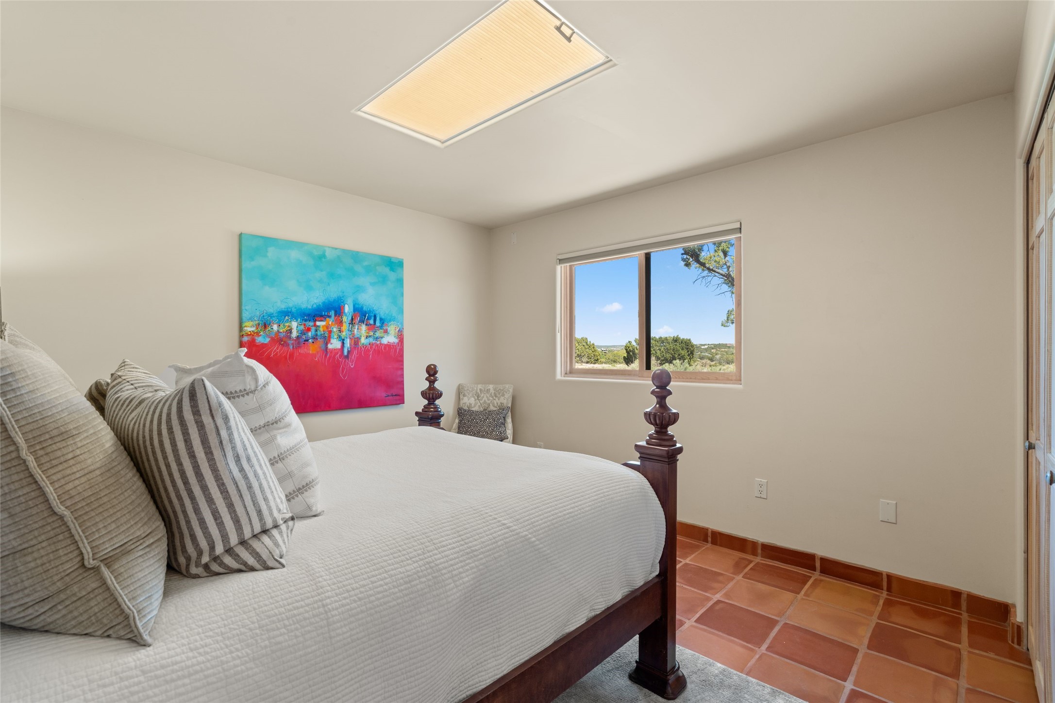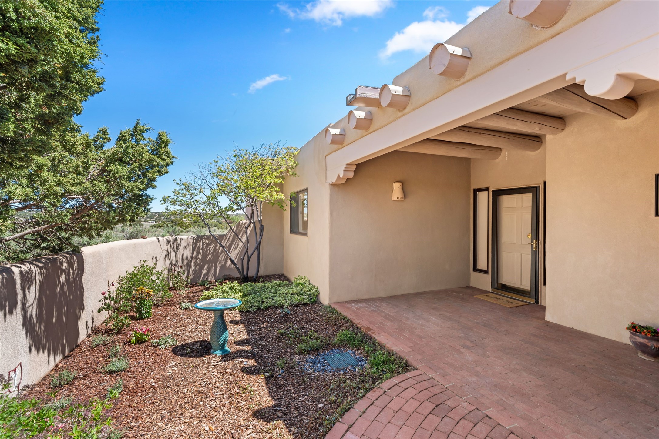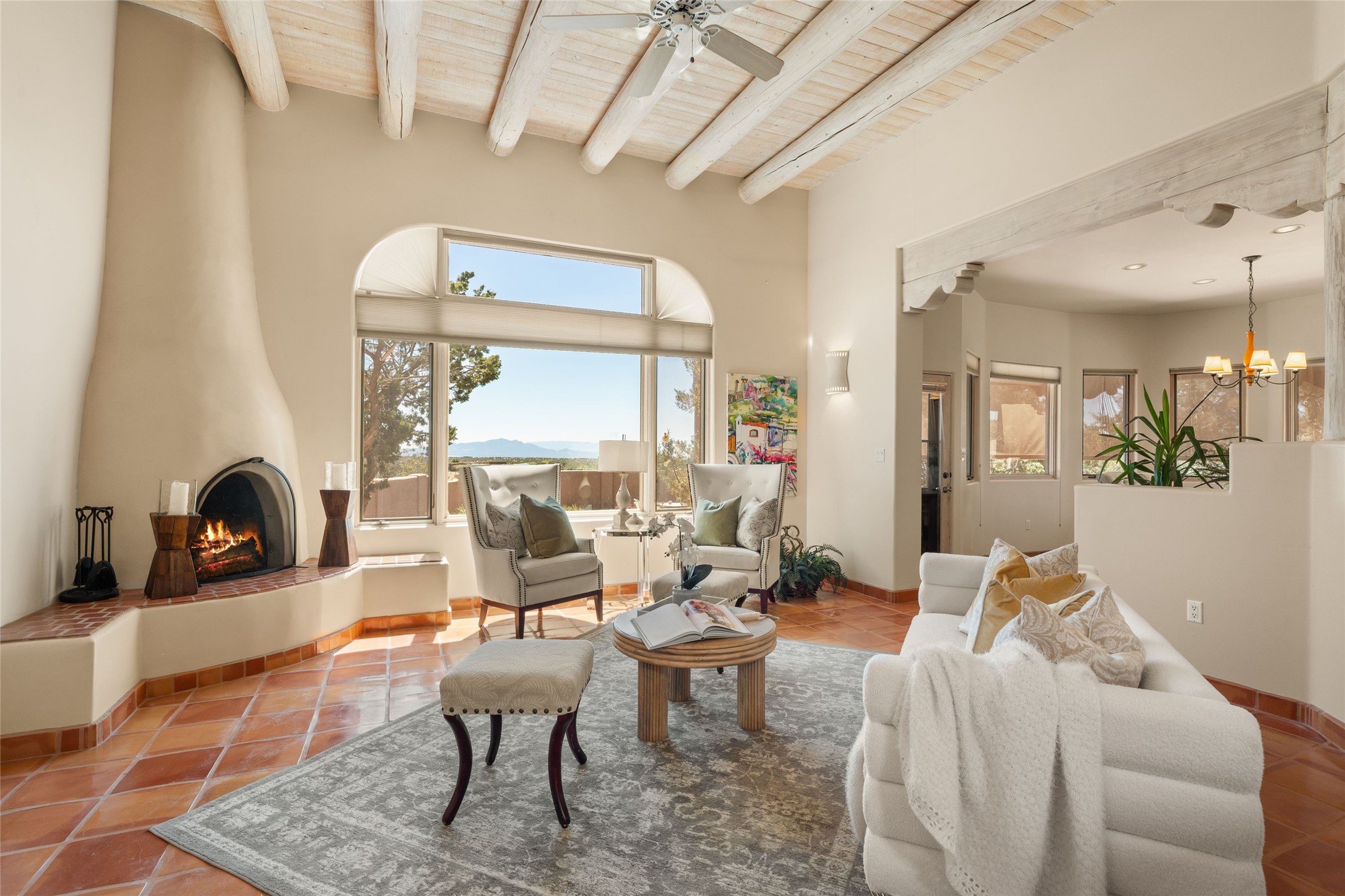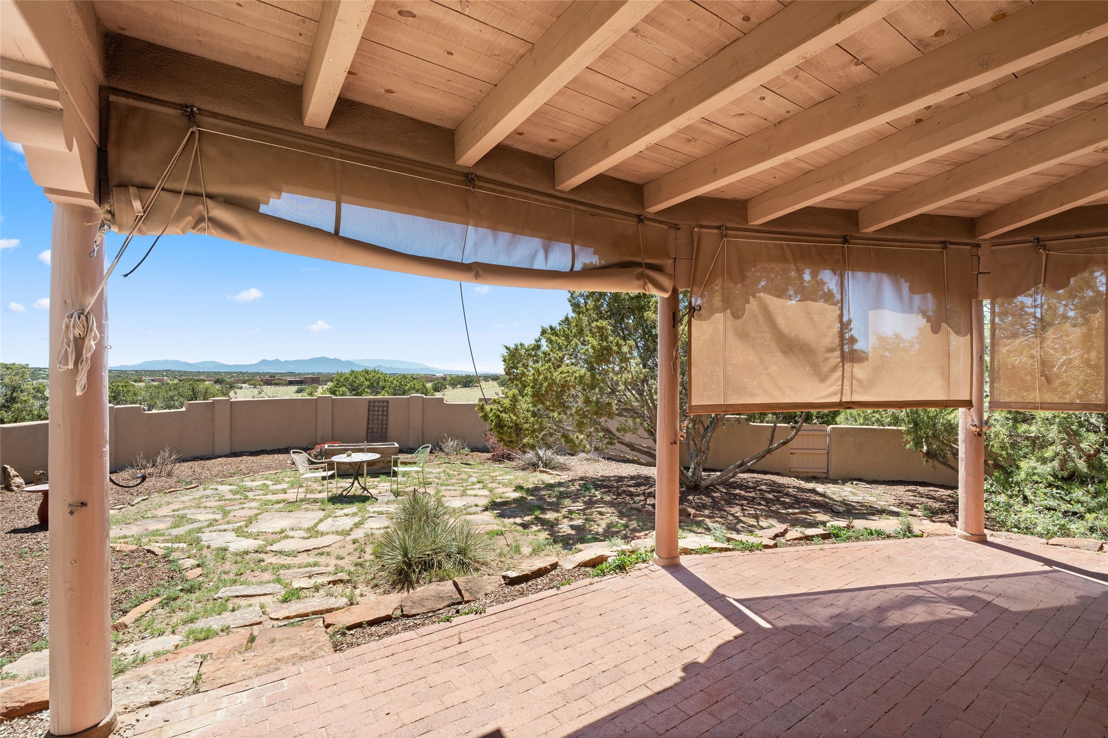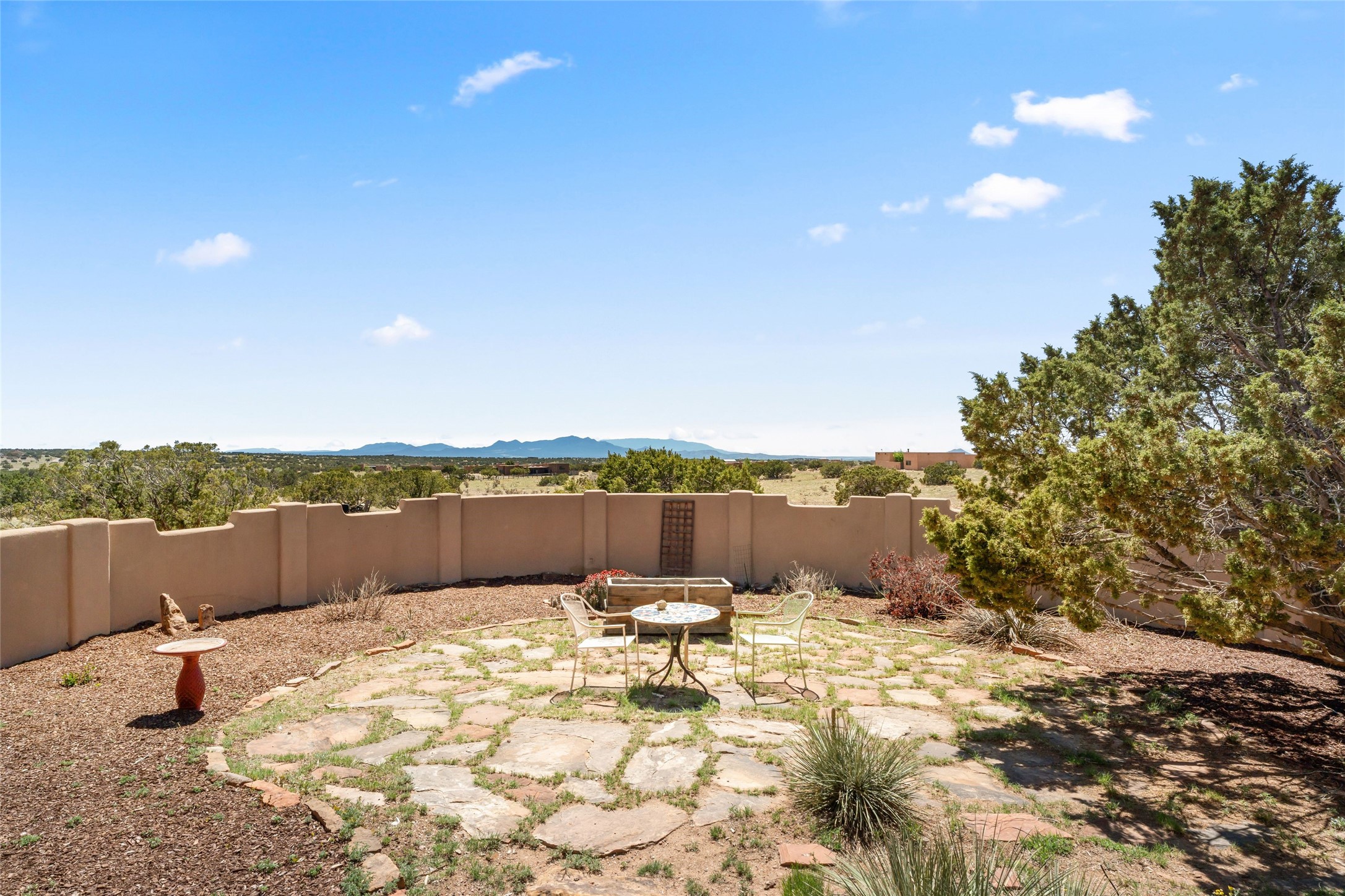 Come enjoy peace and solitude with the VIEWS, VIEWS, and more VIEWS of the Ortiz & Sandia Mountains. A single level home and separate studio on five acres, 3 bedroom, 3 bath, with custom whitewashed wood doors, Saltillo tile radiant heated floors, and an island in the kitchen is MOVE-IN ready. The additional studio (artist/musician or you choose!) also with Saltillo tile floors has its own half bath and heated garage/workshop. High ceilings, and open concept with wonderful light to enjoy, two car garage on the main house, one car garage or workshop off the studio and 2300 +/- square foot in total. Six minutes to the La Tienda for easy grocery shopping, coffee with a friend, Santa Fe Brewing, or mailing off your packages. Downtown Santa Fe is about 15 +/- minutes for your in-town socializing. Septic, HOA and Title are completed - Easy to view.Septic, HOA and Title are completed - Easy to view.