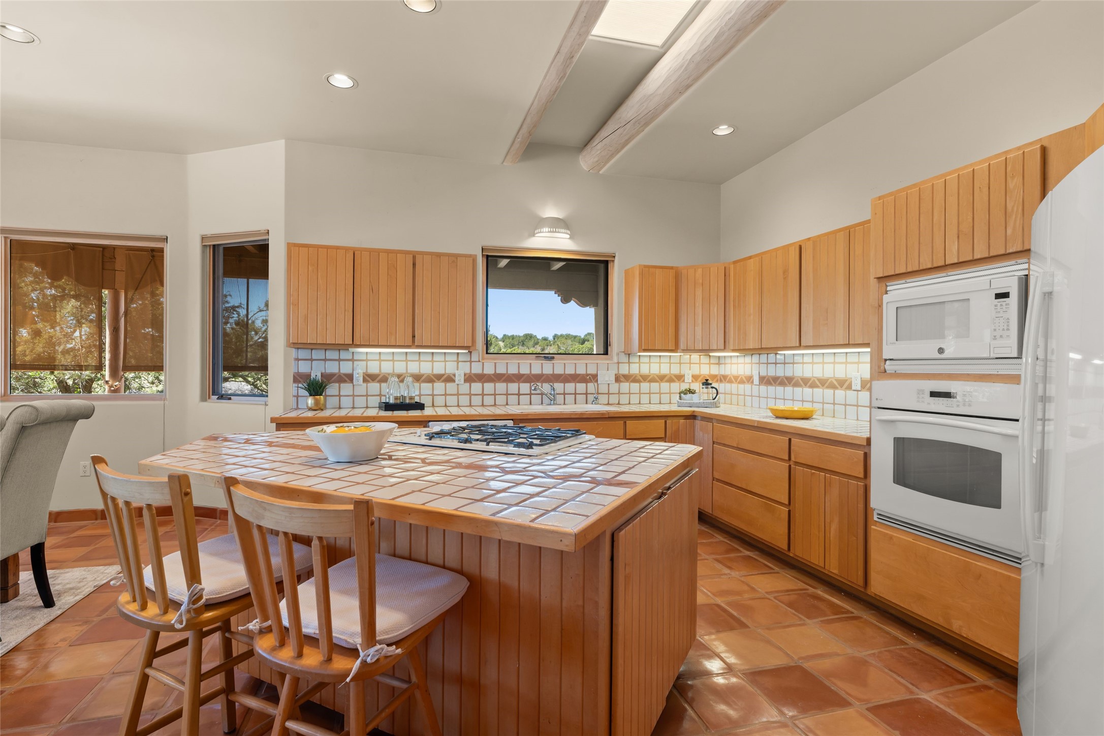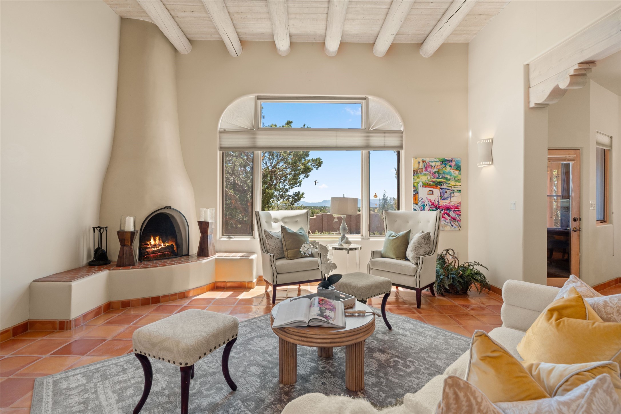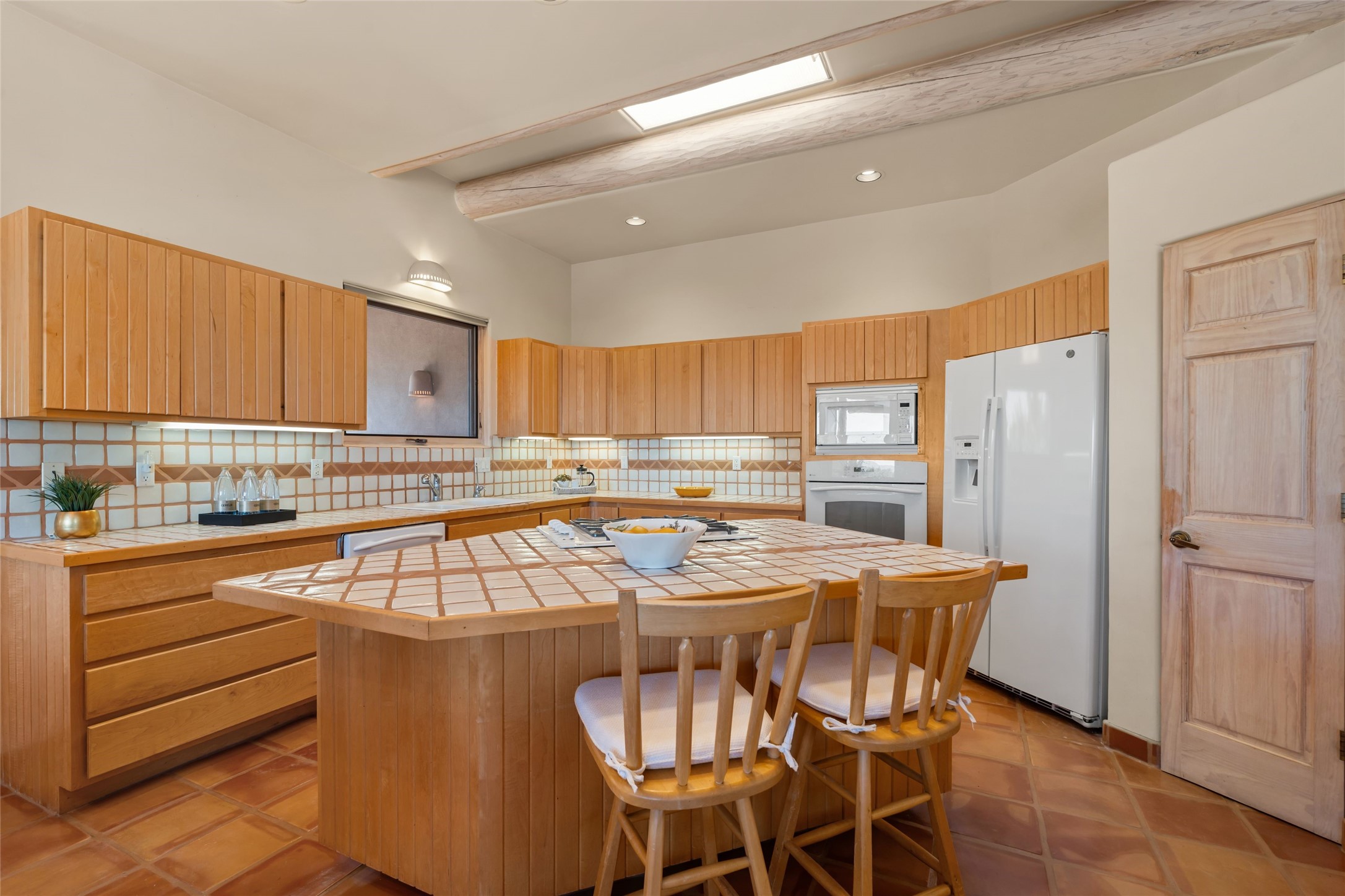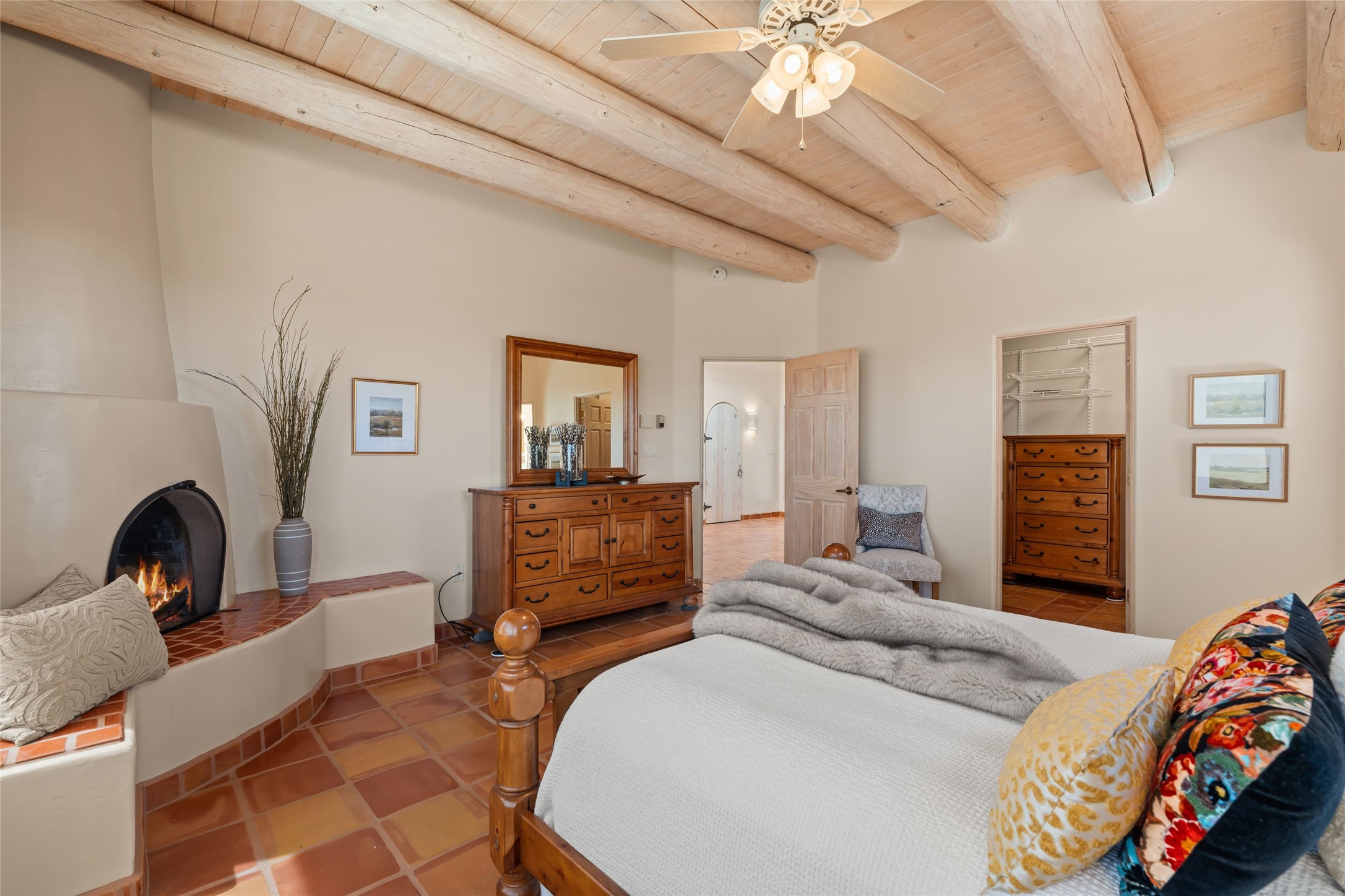 Come enjoy peace and solitude with the VIEWS, VIEWS, and more VIEWS of the Ortiz & Sandia Mountains. A single level home and separate studio on five acres, 3 bedroom, 3 bath, with custom whitewashed wood doors, Saltillo tile radiant heated floors, and an island in the kitchen is MOVE-IN ready. The additional studio (artist/musician or you choose!) also with Saltillo tile floors has its own half bath and heated garage/workshop. High ceilings, and open concept with wonderful light to enjoy, two car garage on the main house, one car garage or workshop off the studio and 2300 +/- square foot in total. Six minutes to the La Tienda for easy grocery shopping, coffee with a friend, Santa Fe Brewing, or mailing off your packages. Downtown Santa Fe is about 15 +/- minutes for your in-town socializing. Septic, HOA and Title are completed - Easy to view.Septic, HOA and Title are completed - Easy to view.