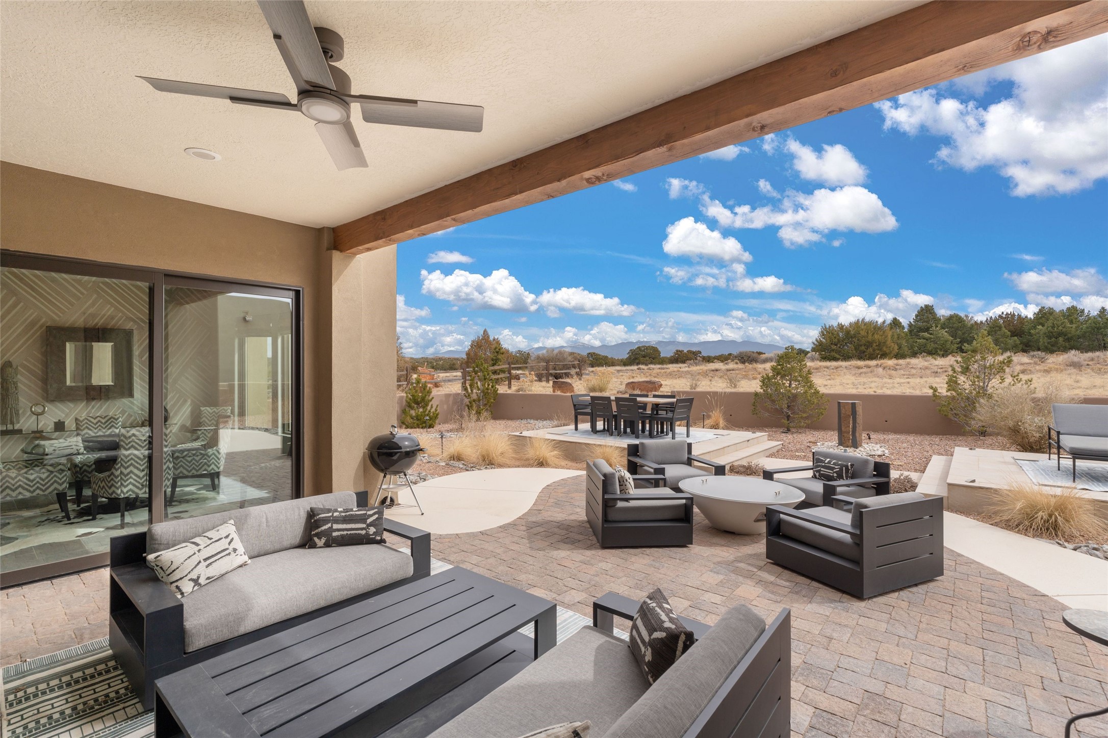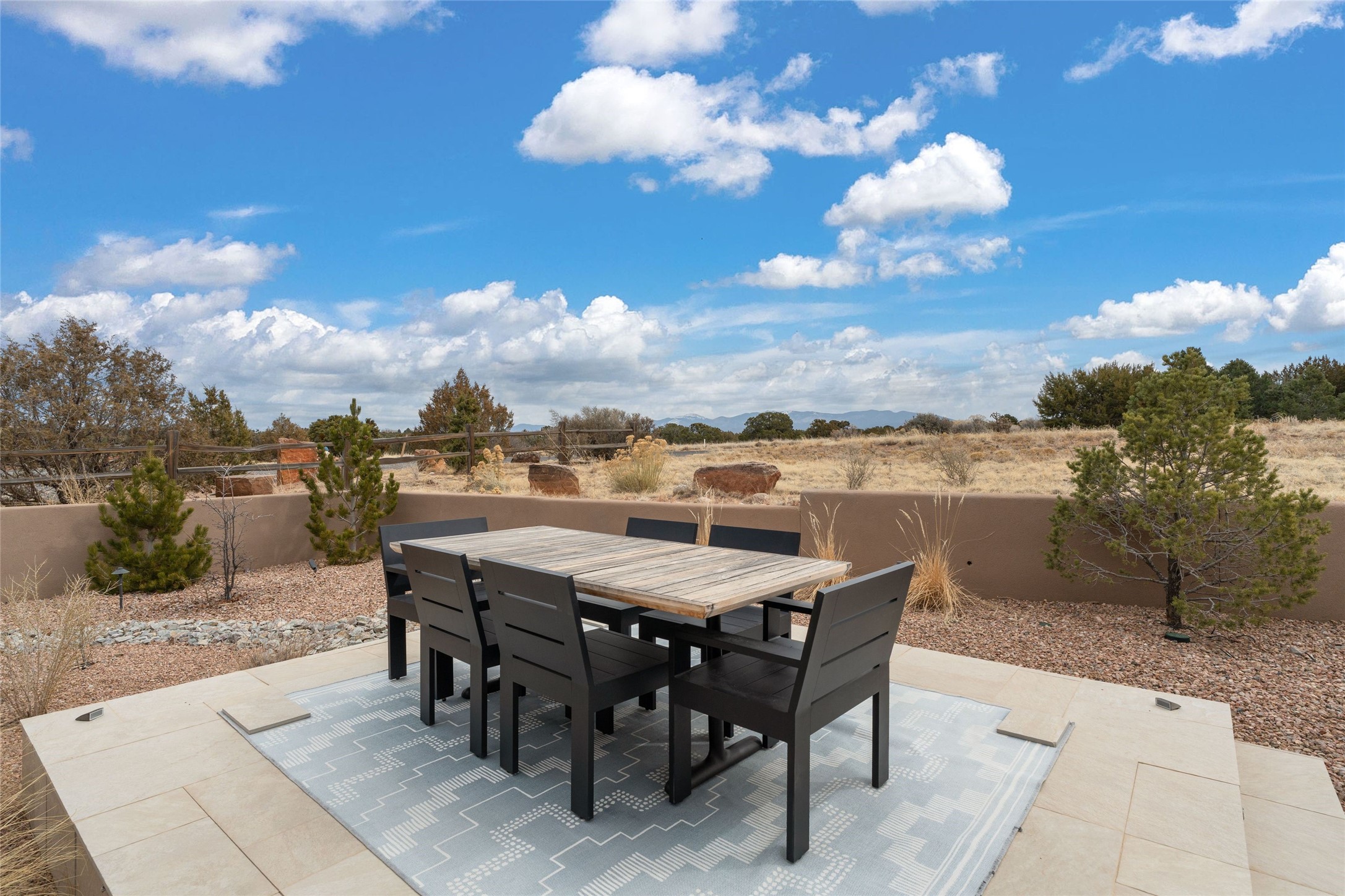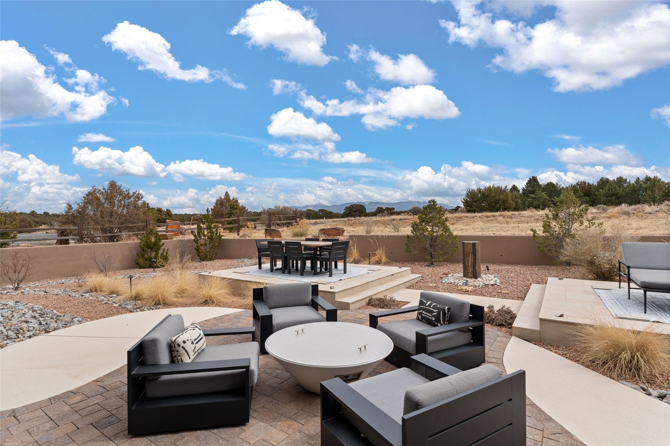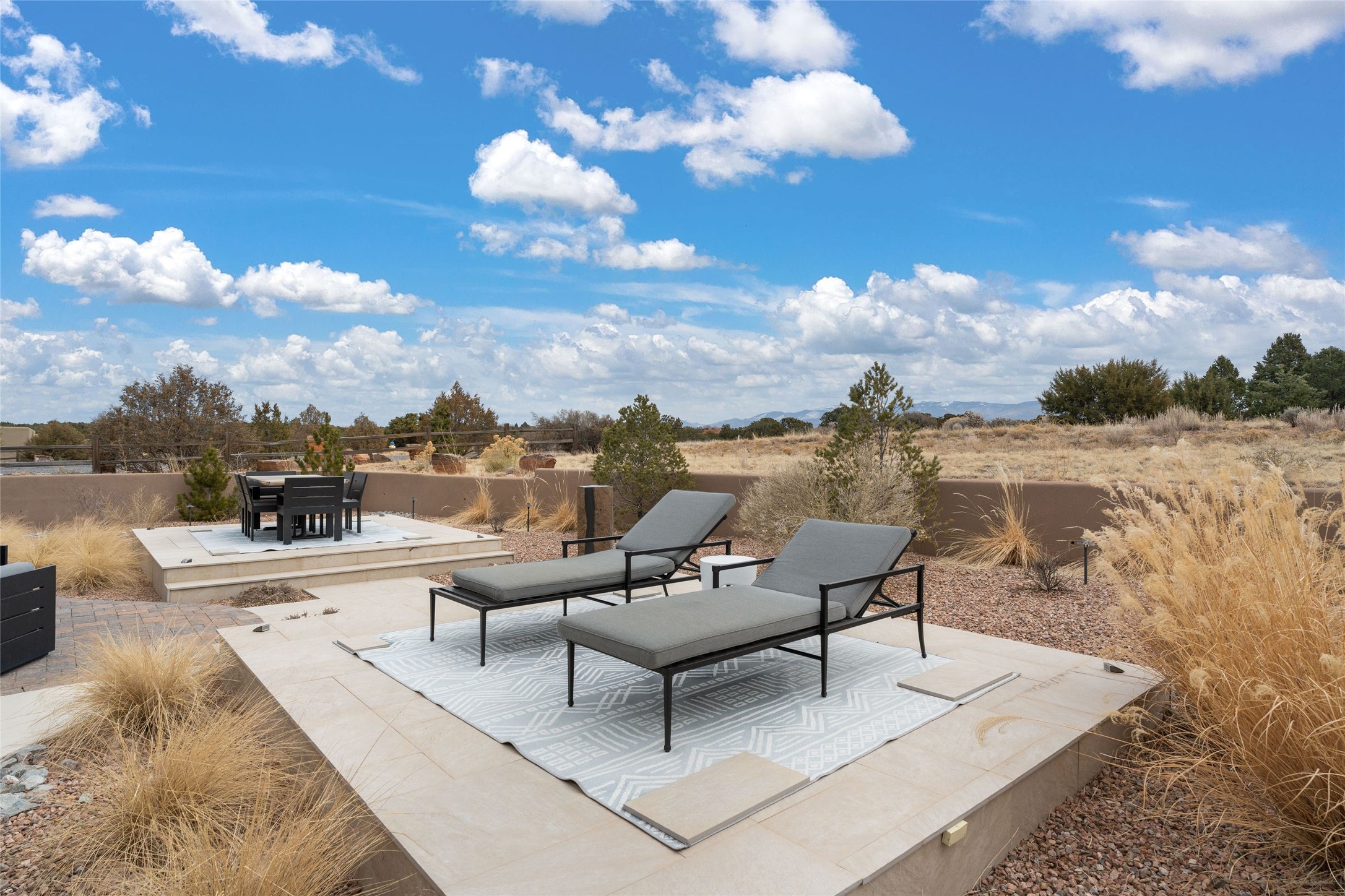 This immaculate home in Las Campanas offers a wonderful blend of privacy, space, and striking Sangre de Cristo Mountain views. Set on one of the most desirable lots in the neighborhood, the home's outdoor living spaces are a highlight. Thoughtfully designed, it balances traditional Santa Fe elements--vigas and beams--with a clean, contemporary finish. The open, light-filled interior features upgraded lighting, designer window treatments, and desirable finishes throughout. With three bedrooms and four bathrooms, including a guest suite with its own living area, the home offers both flexibility and function. A spacious additional room off the main living area provides options for a media room, library, office, or game room. The bright kitchen boasts white quartz countertops, light wood cabinetry, and a spacious pantry. The beautifully landscaped outdoor spaces with brick and stone lined dining and relaxation areas flow from the interior creating seamless indoor-outdoor living. Located just minutes from The Club at Las Campanas, the home offers convenient access to dining, golf, the Spa and Fitness Center, tennis, and pickleball, for the owner who chooses to join the Club. The current owner's Equity Golf membership is available for purchase by the new owner of the beautiful home.
