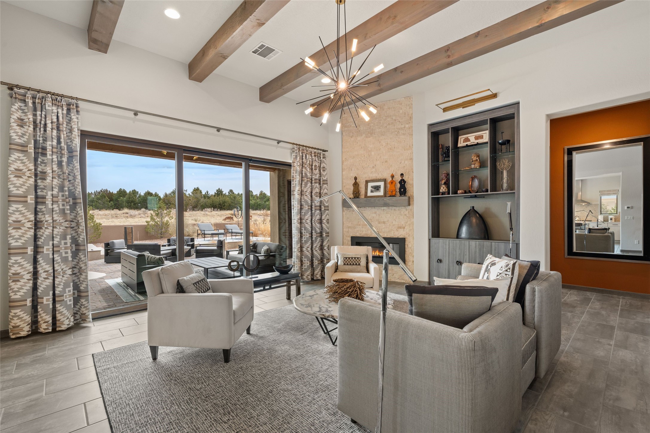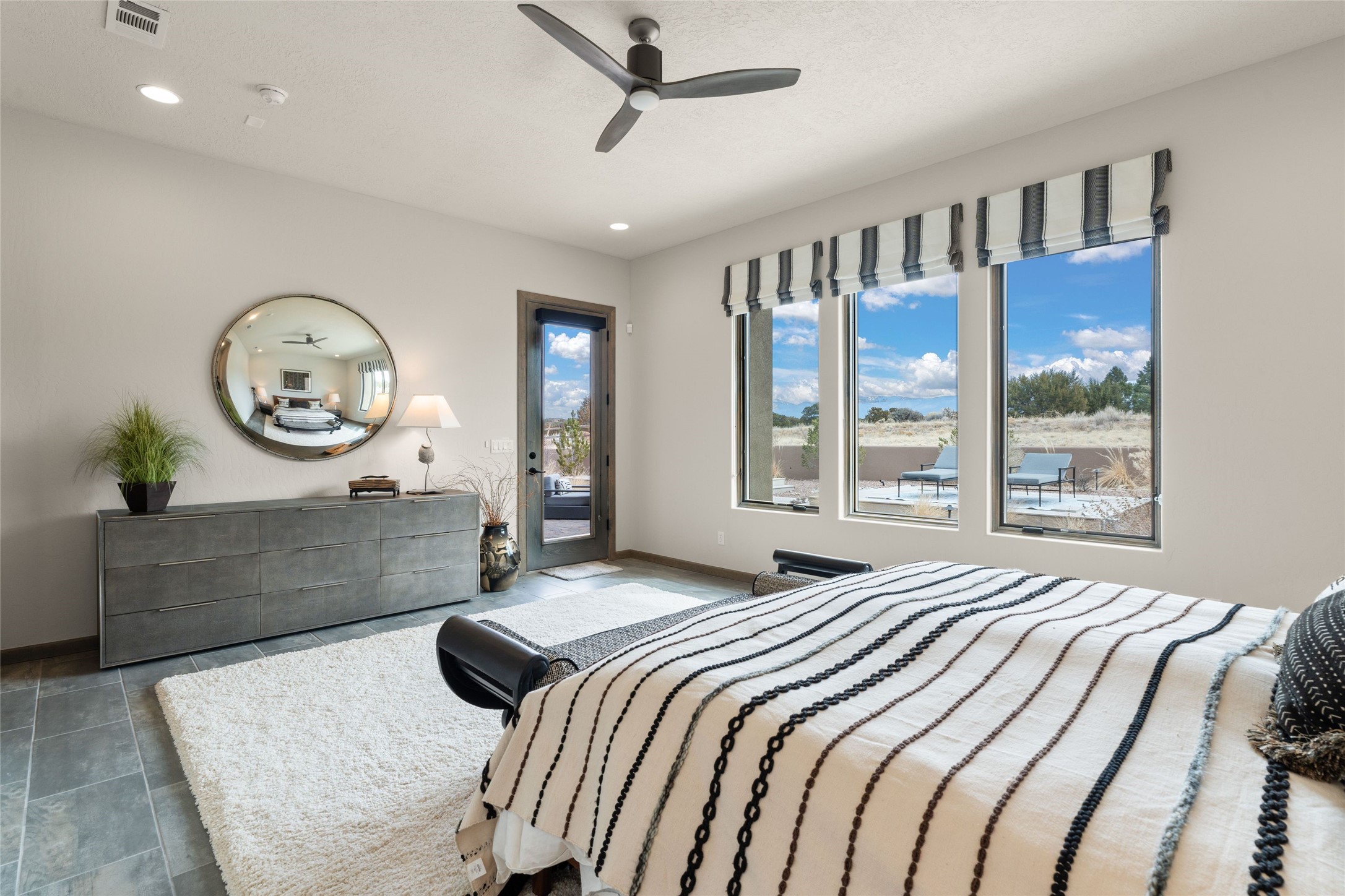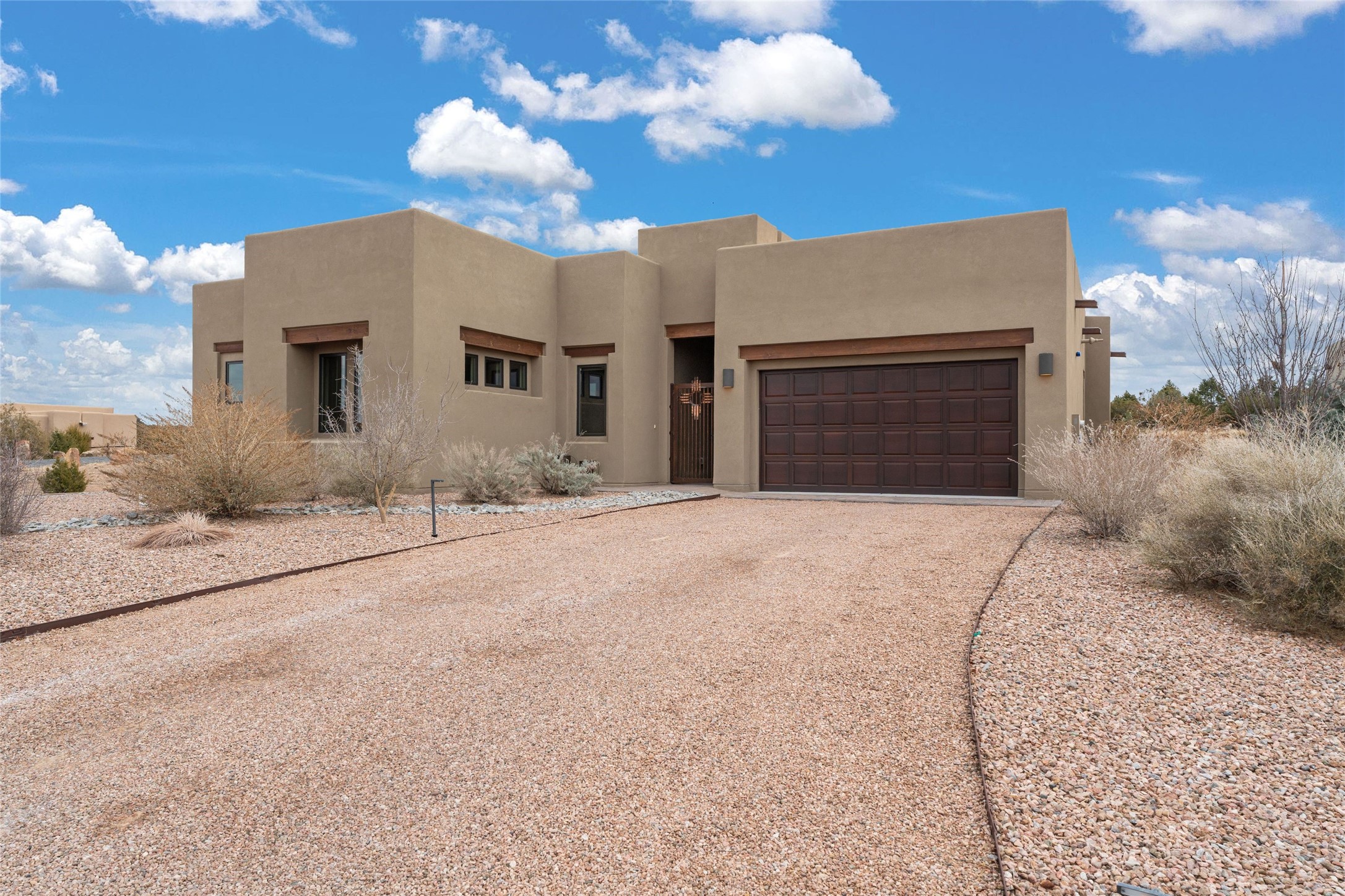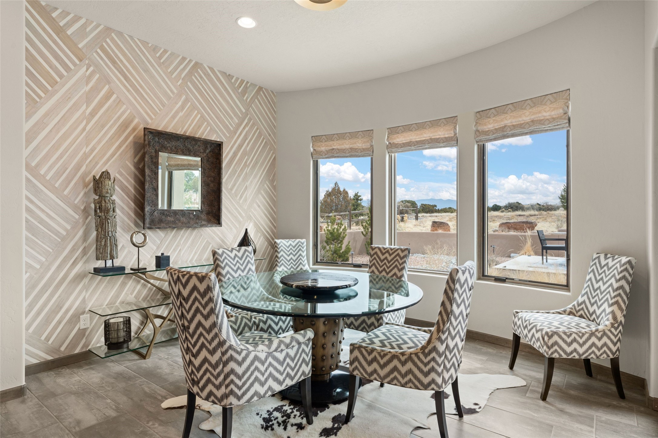 This immaculate home in Las Campanas offers a wonderful blend of privacy, space, and striking Sangre de Cristo Mountain views. Set on one of the most desirable lots in the neighborhood, the home's outdoor living spaces are a highlight. Thoughtfully designed, it balances traditional Santa Fe elements--vigas and beams--with a clean, contemporary finish. The open, light-filled interior features upgraded lighting, designer window treatments, and desirable finishes throughout. With three bedrooms and four bathrooms, including a guest suite with its own living area, the home offers both flexibility and function. A spacious additional room off the main living area provides options for a media room, library, office, or game room. The bright kitchen boasts white quartz countertops, light wood cabinetry, and a spacious pantry. The beautifully landscaped outdoor spaces with brick and stone lined dining and relaxation areas flow from the interior creating seamless indoor-outdoor living. Located just minutes from The Club at Las Campanas, the home offers convenient access to dining, golf, the Spa and Fitness Center, tennis, and pickleball, for the owner who chooses to join the Club. The current owner's Equity Golf membership is available for purchase by the new owner of the beautiful home.