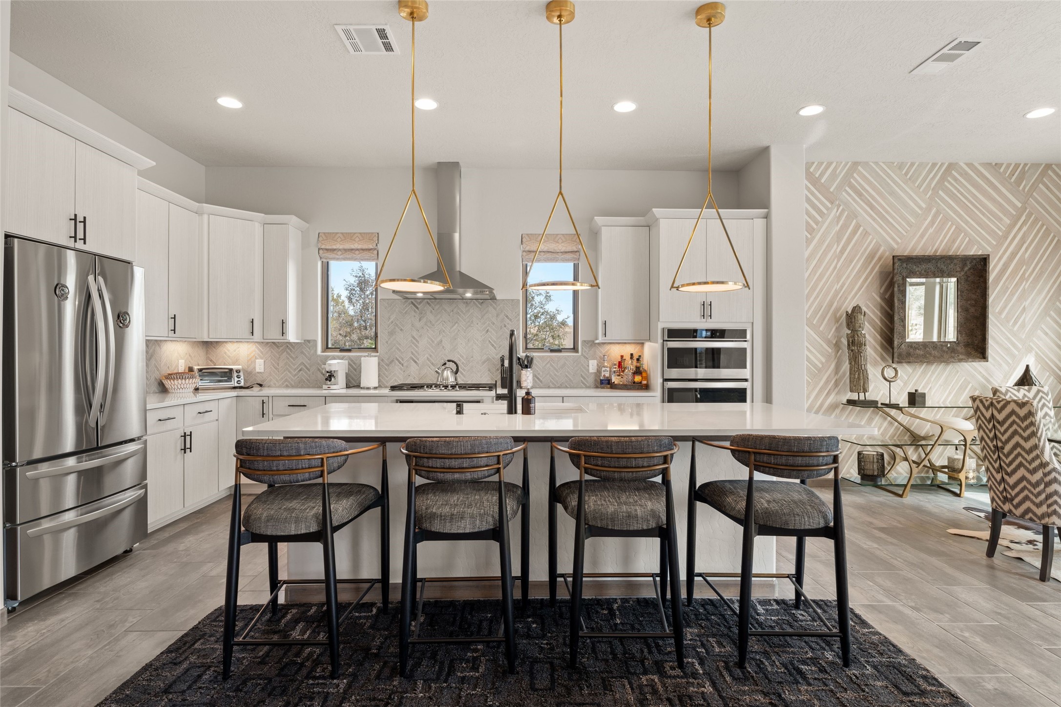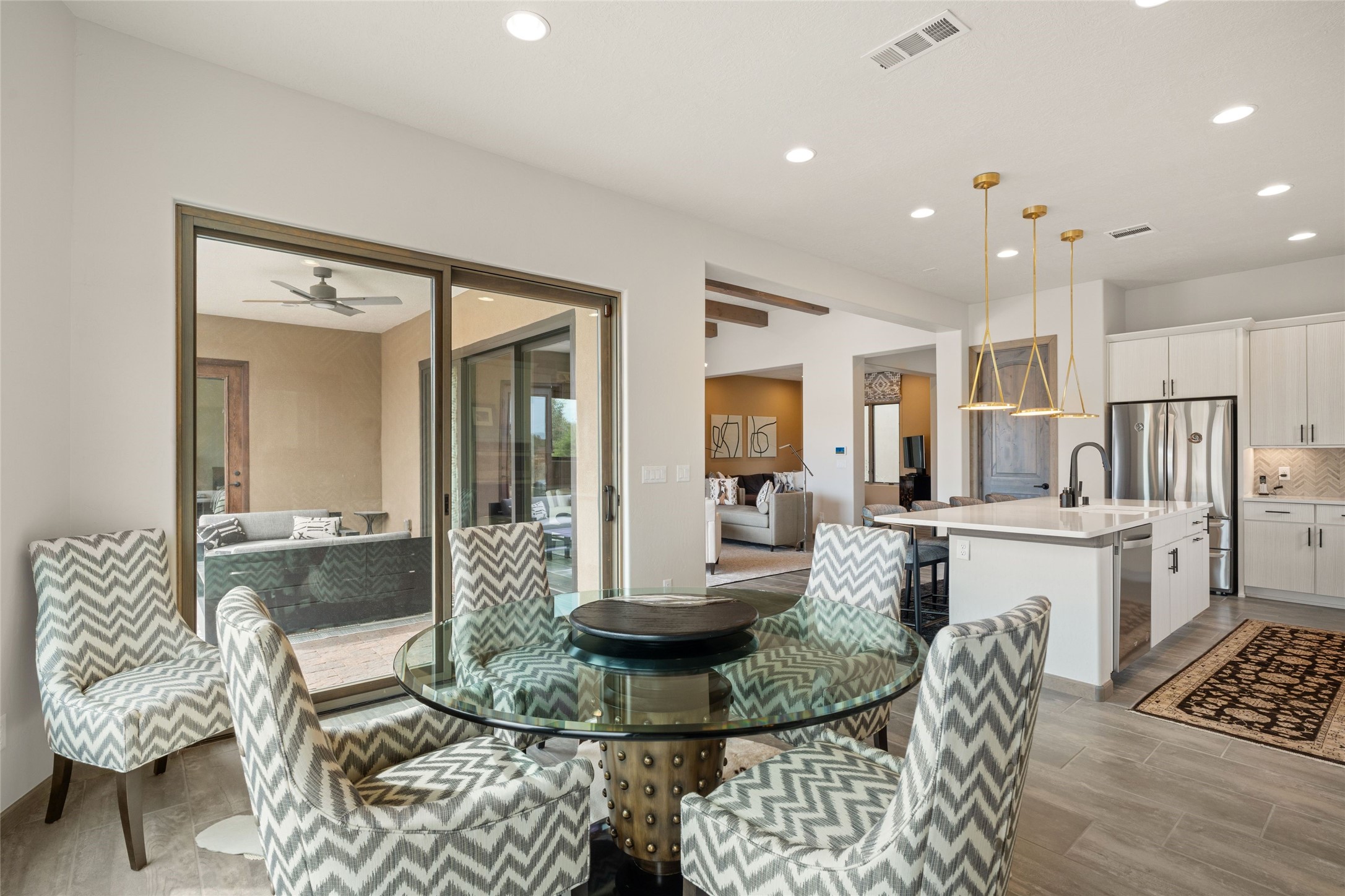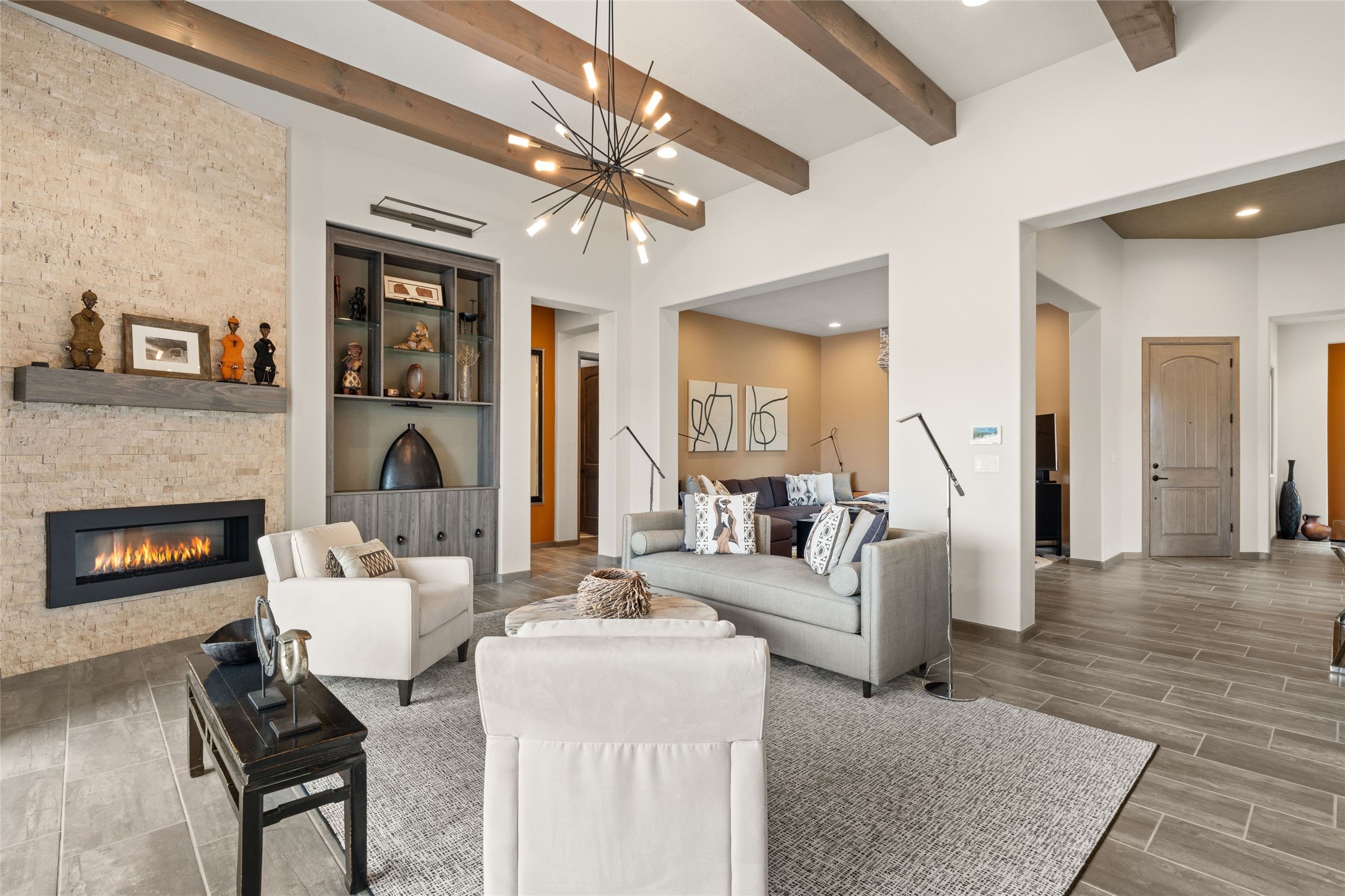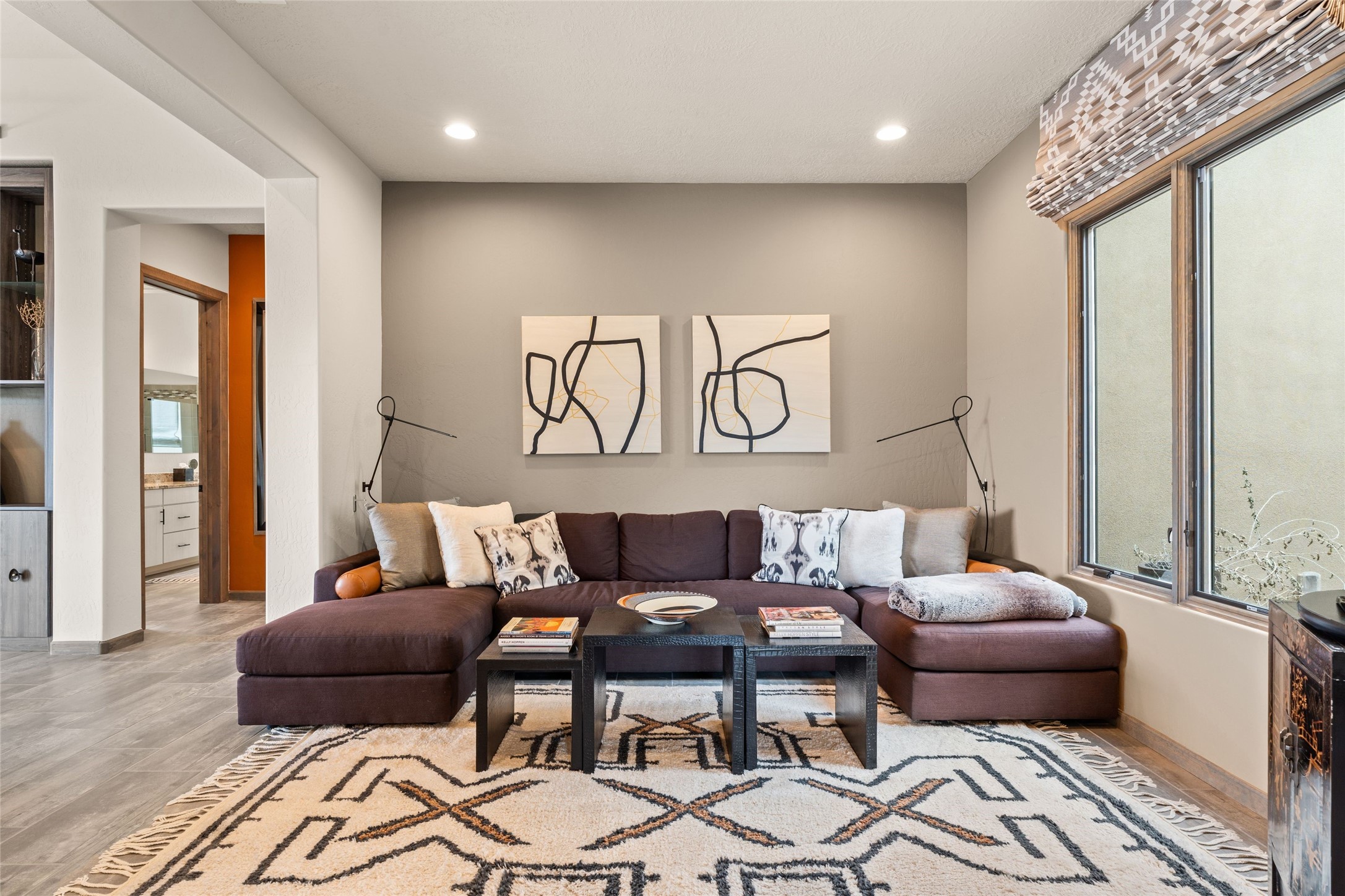 This immaculate home in Las Campanas offers a wonderful blend of privacy, space, and striking Sangre de Cristo Mountain views. Set on one of the most desirable lots in the neighborhood, the home's outdoor living spaces are a highlight. Thoughtfully designed, it balances traditional Santa Fe elements--vigas and beams--with a clean, contemporary finish. The open, light-filled interior features upgraded lighting, designer window treatments, and desirable finishes throughout. With three bedrooms and four bathrooms, including a guest suite with its own living area, the home offers both flexibility and function. A spacious additional room off the main living area provides options for a media room, library, office, or game room. The bright kitchen boasts white quartz countertops, light wood cabinetry, and a spacious pantry. The beautifully landscaped outdoor spaces with brick and stone lined dining and relaxation areas flow from the interior creating seamless indoor-outdoor living. Located just minutes from The Club at Las Campanas, the home offers convenient access to dining, golf, the Spa and Fitness Center, tennis, and pickleball, for the owner who chooses to join the Club. The current owner's Equity Golf membership is available for purchase by the new owner of the beautiful home.
