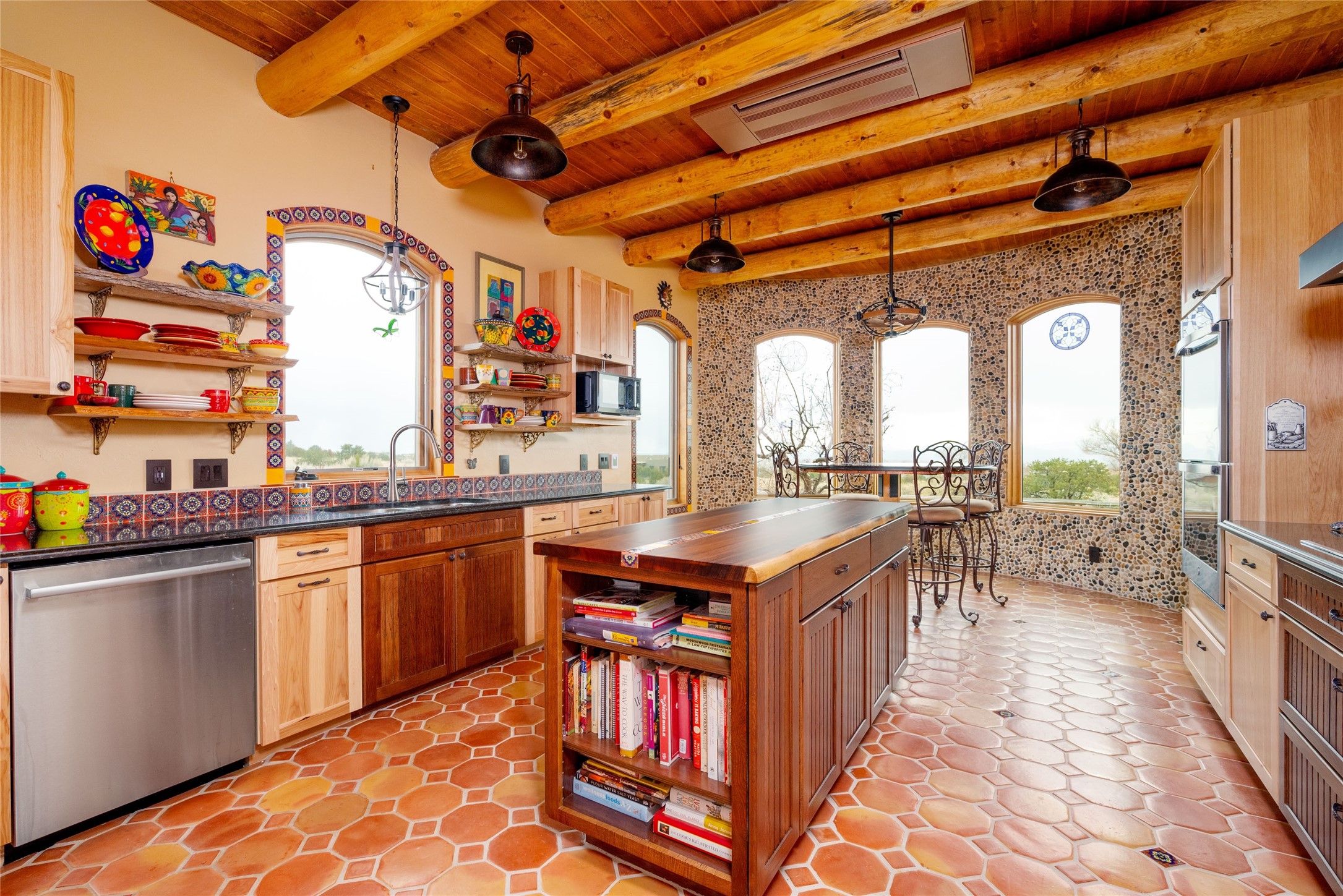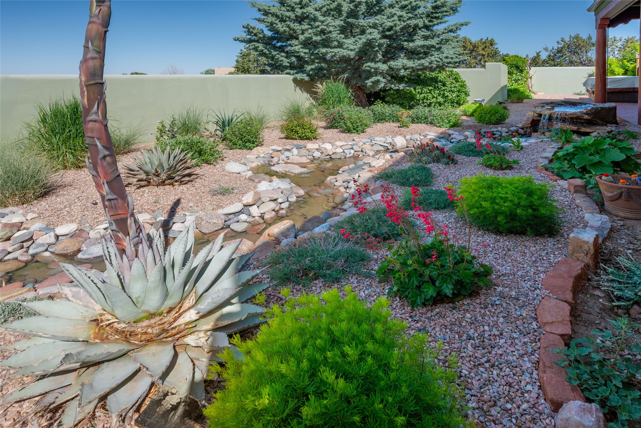 Nestled in the foothills on 1.83 acres with spectacular views, La Sierra is ideally situated between Dos Griegos and Eldorado. This stunning home offers a blend of traditional Southwest charm and modern updates, featuring 3 bedrooms, 3 baths, an attached guest quarters with kitchen, 2 offices, and an 868 sq. ft. heated garage. Constructed with Insulated Concrete Forms (ICF), the home boasts thick adobe-style finished walls, plastered interiors, vigas, and beams.The home has undergone an extensive remodel, including updates to the kitchen, primary bedroom and bath, guest bath, guest quarters, interior and exterior paint, landscaping, mechanical systems, and a new TPO roof. The kitchen features brand-new custom cabinets with pullouts, granite countertops, tile floors, a handmade island wood countertop with tile inlay, new appliances, updated lighting, and picturesque windows framing breathtaking views.The primary suite is elegantly updated with new hardware, granite countertops, stone sinks, faucets, lighting, paint, and tile flooring. It includes a separate bathtub, a walk-in shower, and a private door leading to the outdoor spa. Additionally, the suite offers two spacious walk-in closets. The guest bath has been enhanced with fresh paint, new tile, a vanity, sink, faucet, and mirror.The attached guest quarters provide a separate courtyard entrance and interior access for guest flexibility. This space includes a full bath, one bedroom, and a newly remodeled kitchen with updated cabinets, countertops, sink, appliances, wood and laminate flooring, and fresh interior paint.The home is equipped with a cutting-edge mechanical system, including boiler for radiant floor heating and exchange system for domestic hot water, powered by a 17.5 kW photovoltaic solar system, which is owned (not leased) and designed to achieve a "net-zero" PNM bill. The property is completely electric, including a stylish southwestern fireplace.The oversized 868 sq. ft. heated garage includes a designated workspace with power for a wood shop or hobby area, a private office with inside access, electric outlet ready for electric vehicle charging station, and a freezer.The thoughtfully designed xeriscaping features stone walls, lined driveways, gravel, and drip irrigation, all sustained by 9,000 gallons of rainwater harvesting tanks. The outdoor living spaces include a beautifully landscaped courtyard entry and a backyard patio with stunning views, retractable wind screens, and newly installed stone fountains and a stream.Conveniently located just minutes from La Tienda shopping center and less than a 10-minute drive on I-25 to Santa Fe, this remarkable home offers an unbeatable combination of elegance, sustainability, and convenience.