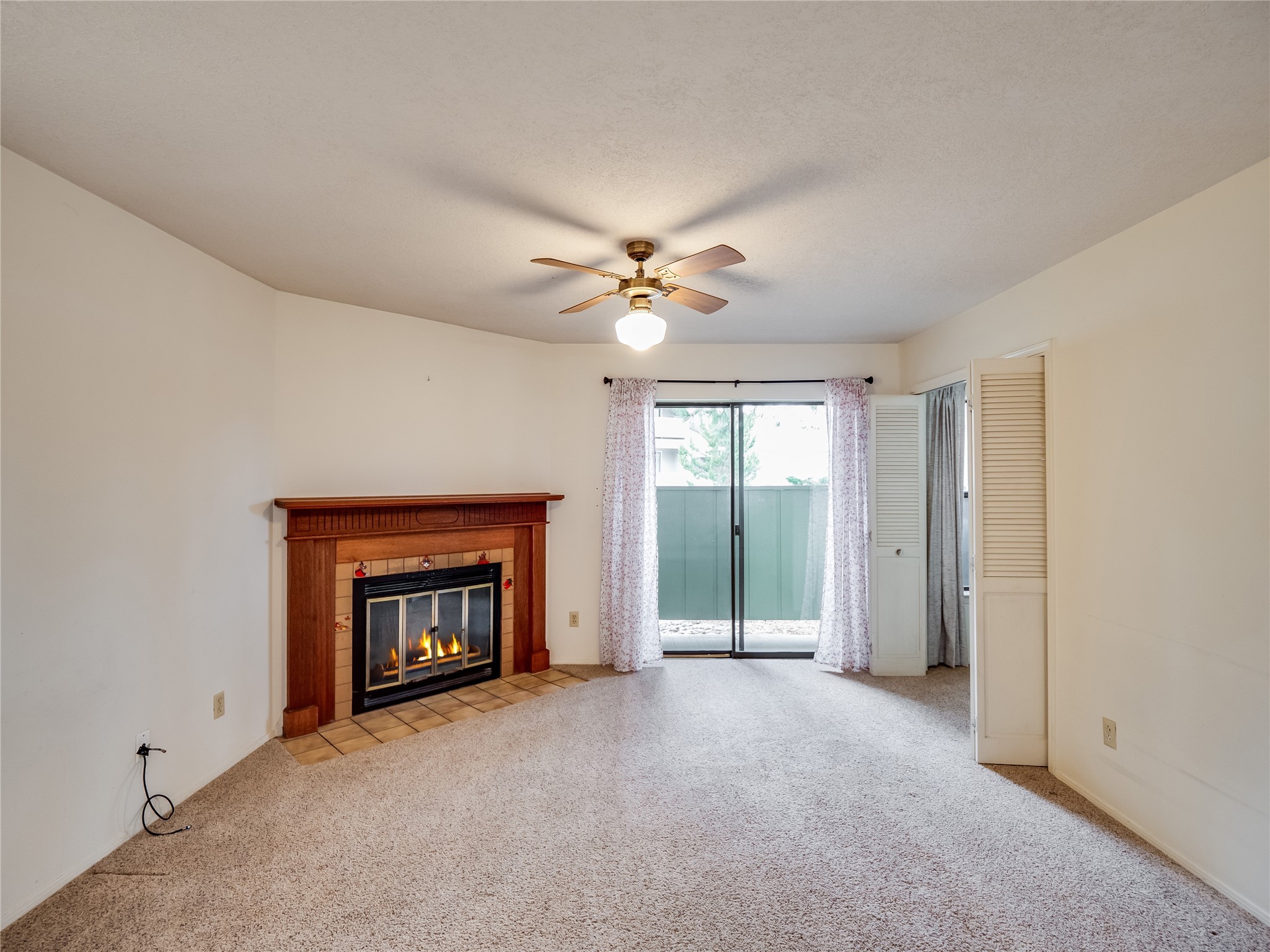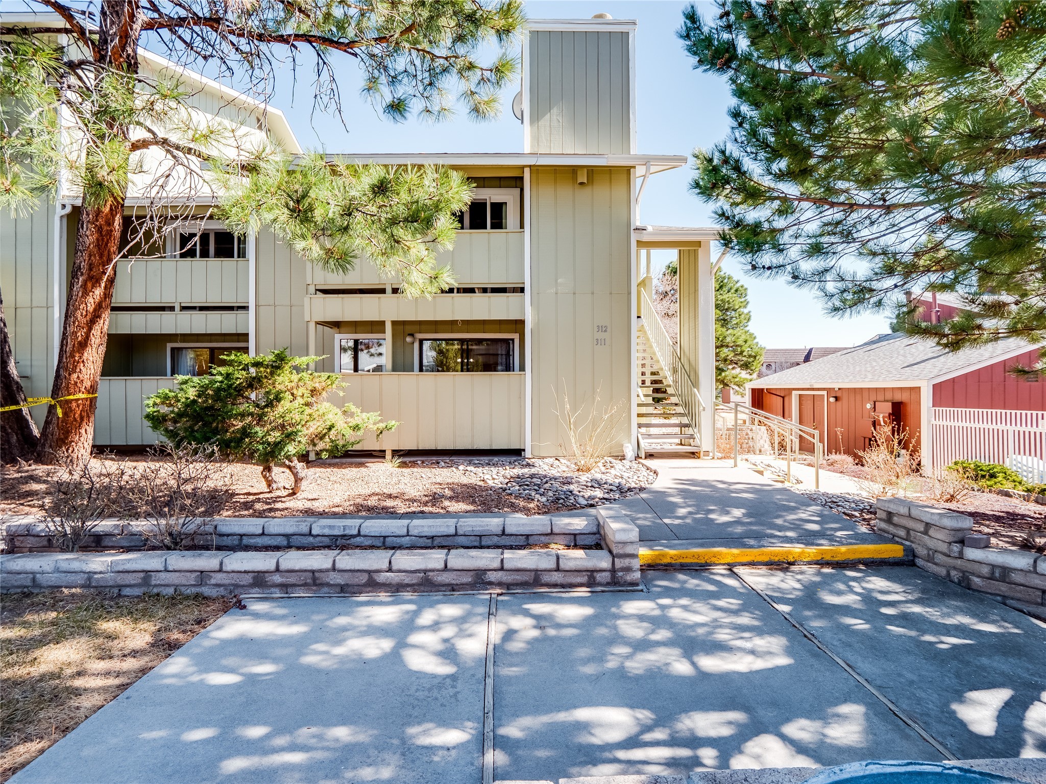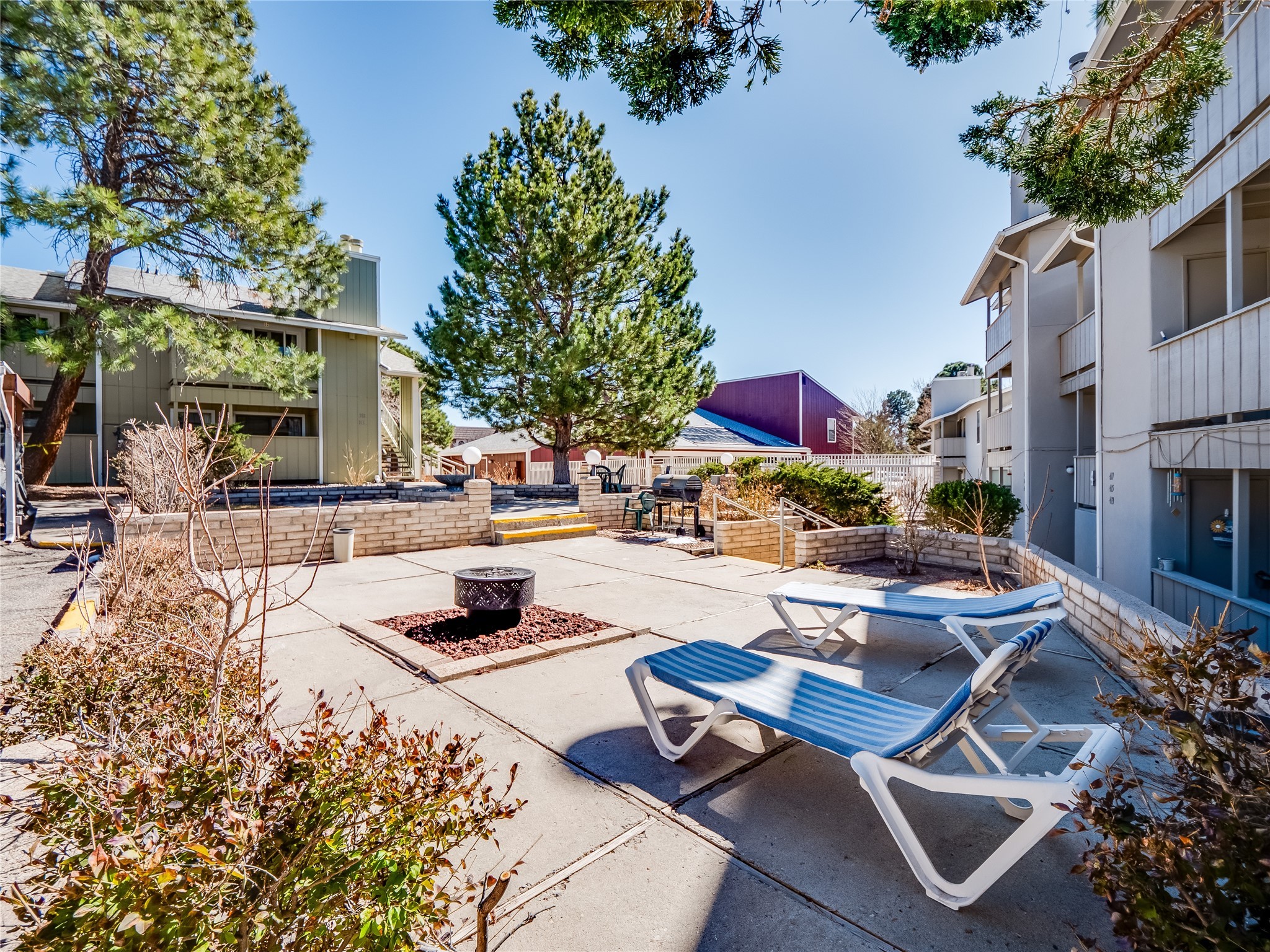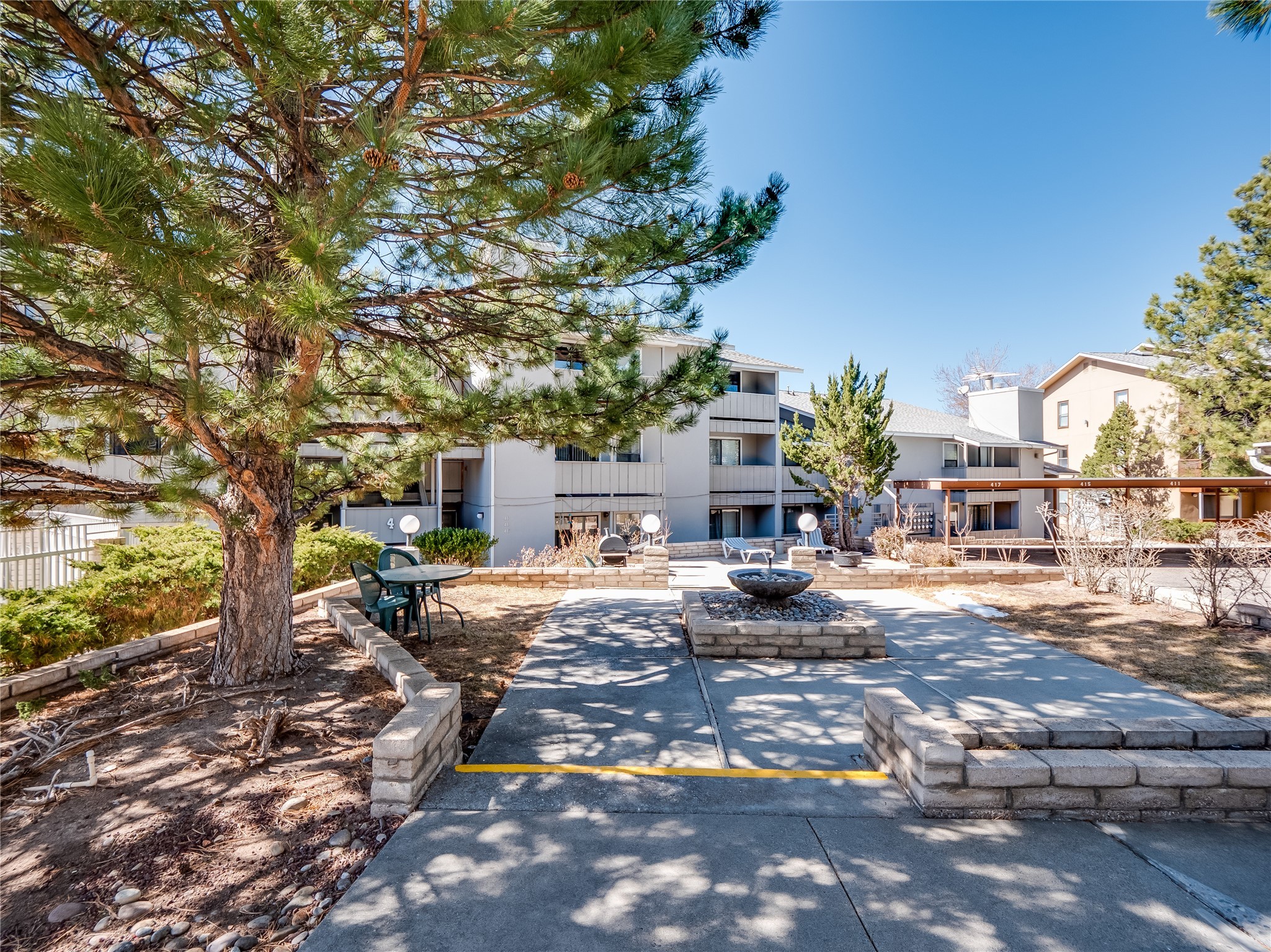Charming ground-level end unit condo in a prime Eastern Area neighborhood! This delightful condo offers a blend of comfort and convenience. Located near the community center, residents can enjoy access to a pool, common gathering spaces, a grill, and a fire pit--perfect for relaxing or entertaining. Enter a welcoming entryway with a coat closet before entering the open floor plan. The living room is designed for comfort, featuring plush carpeting, a cozy wood burning fireplace with a classic mantel, and glass sliders that fill the space with natural light and leads to a covered, enclosed patio. This private outdoor space is perfect for year-round enjoyment, perfect for a small seating area or potted plants making it an ideal spot for morning coffee or an evening unwind. A convenient storage closet on the patio ensures extra space for seasonal items, outdoor gear, or gardening supplies. Adjacent to the living room is a guest bedroom offering flexibility as a home office. Whether you need a private workspace, a cozy reading nook, or a guest retreat, this space adapts to your lifestyle needs. The dining space flows seamlessly into the kitchen, which boasts warm wood cabinetry with black hardware, a pantry/laundry closet with a washer and dryer, and a convenient pass-through window that doubles as bar seating. Down the hallway, you'll find the spacious primary bedroom, complete with its own private enclosed covered patio, a walk-in closet, and a separate single-sink vanity that connects to the main bathroom. The bathroom features tile flooring, an additional single-sink vanity, and a tiled shower/tub combination. This unit also comes with a covered designated parking spot and is situated near shopping, parks, and restaurants, making it an ideal place to call home. Don't miss the opportunity to tour this inviting condo today!