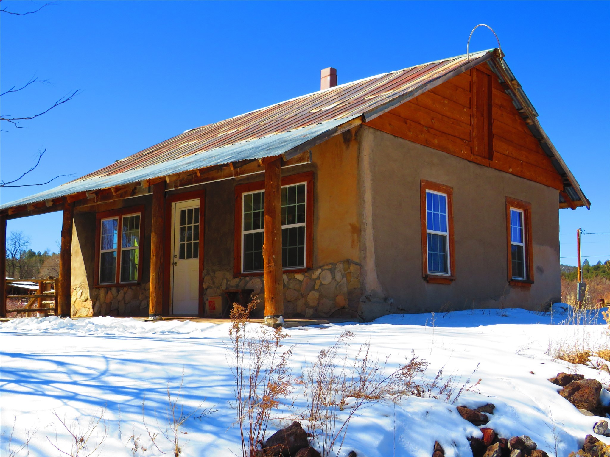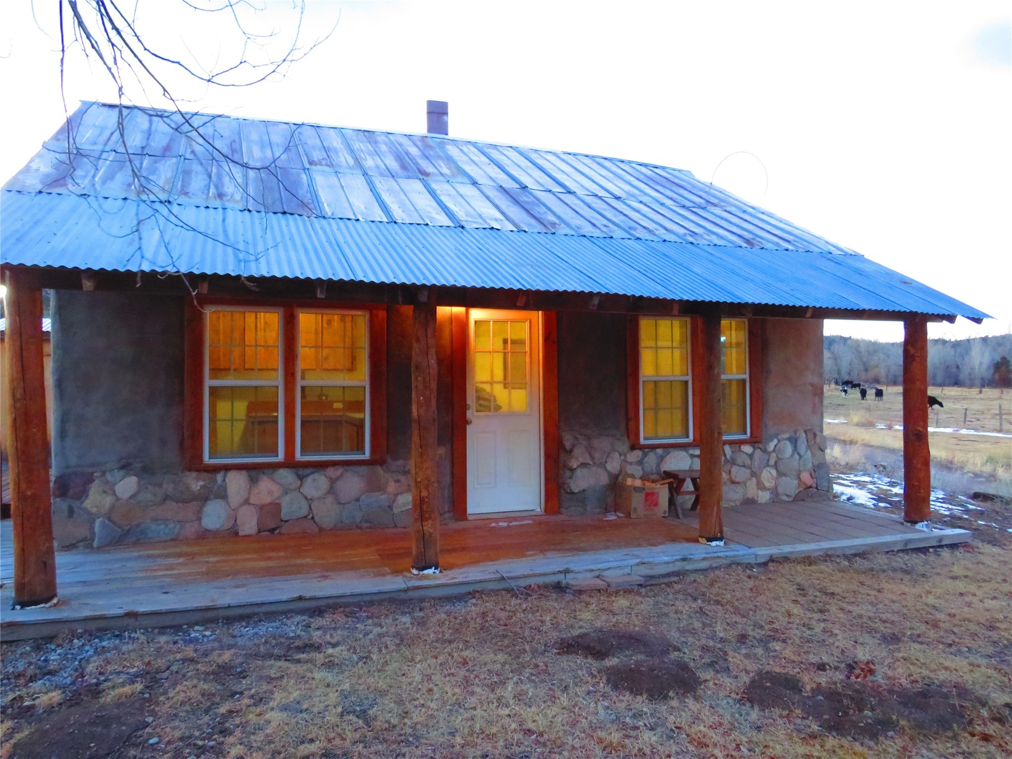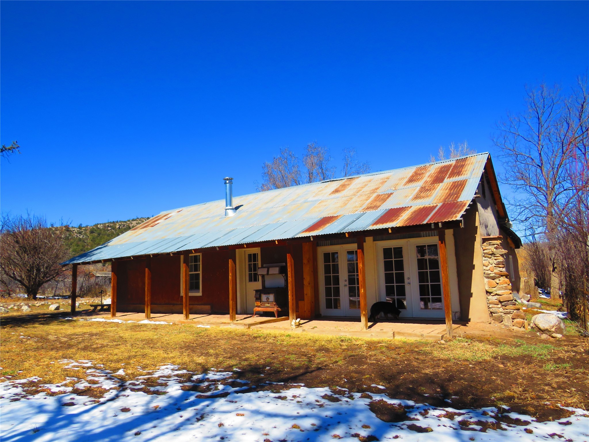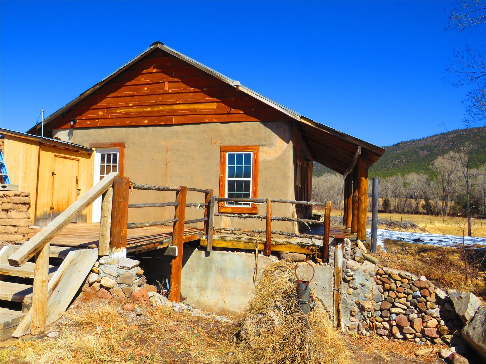 Located in the heart of the historic Northern New Mexico mountain village of Vallecitos, this property offers rural living at its best. Bordered by the Vallecitos River and traversed by the charming Borracho Creek, the land boasts fishing rights, cottonwoods, evergreens, and lush pasture. There are irrigation rights, though the pasture requires little attention. This is the perfect spot for outdoor living and it is a horse lover's paradise, with endless wilderness to explore. The main residence, two bedrooms, and two baths, is traditional double adobe construction, lovingly restored and updated, with sculpted walls, territorial trim. hand hewn beams, and portals. The home is heated by two woodstoves and electric baseboard units. The one-bedroom guest house sits at some distance with a separate driveway, overlooking the pasture and river. This structure offers outdoor space, a rock fireplace and nice finishes. New septic systems are in place, wiring and plumbing is new. Come and make those last few detail complete and you will have a rare gem.