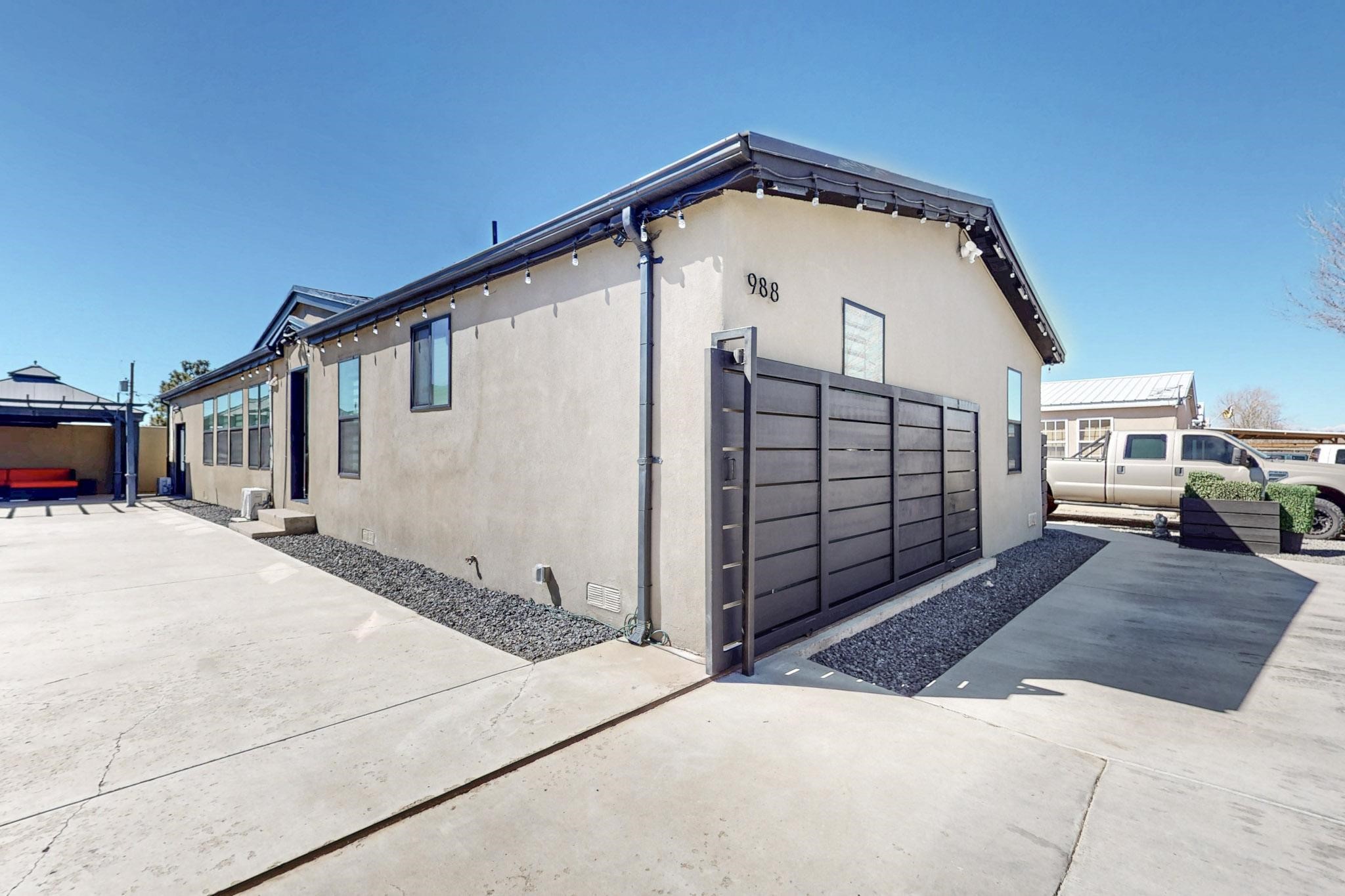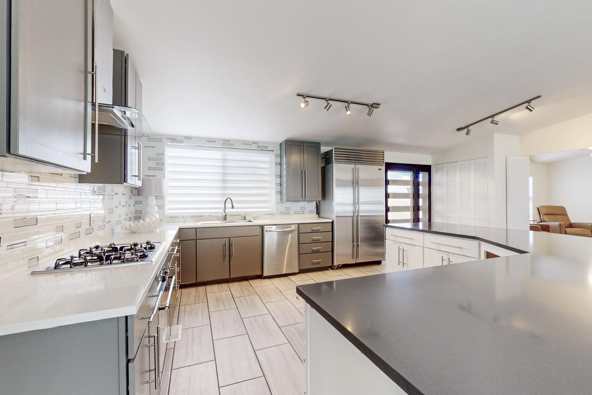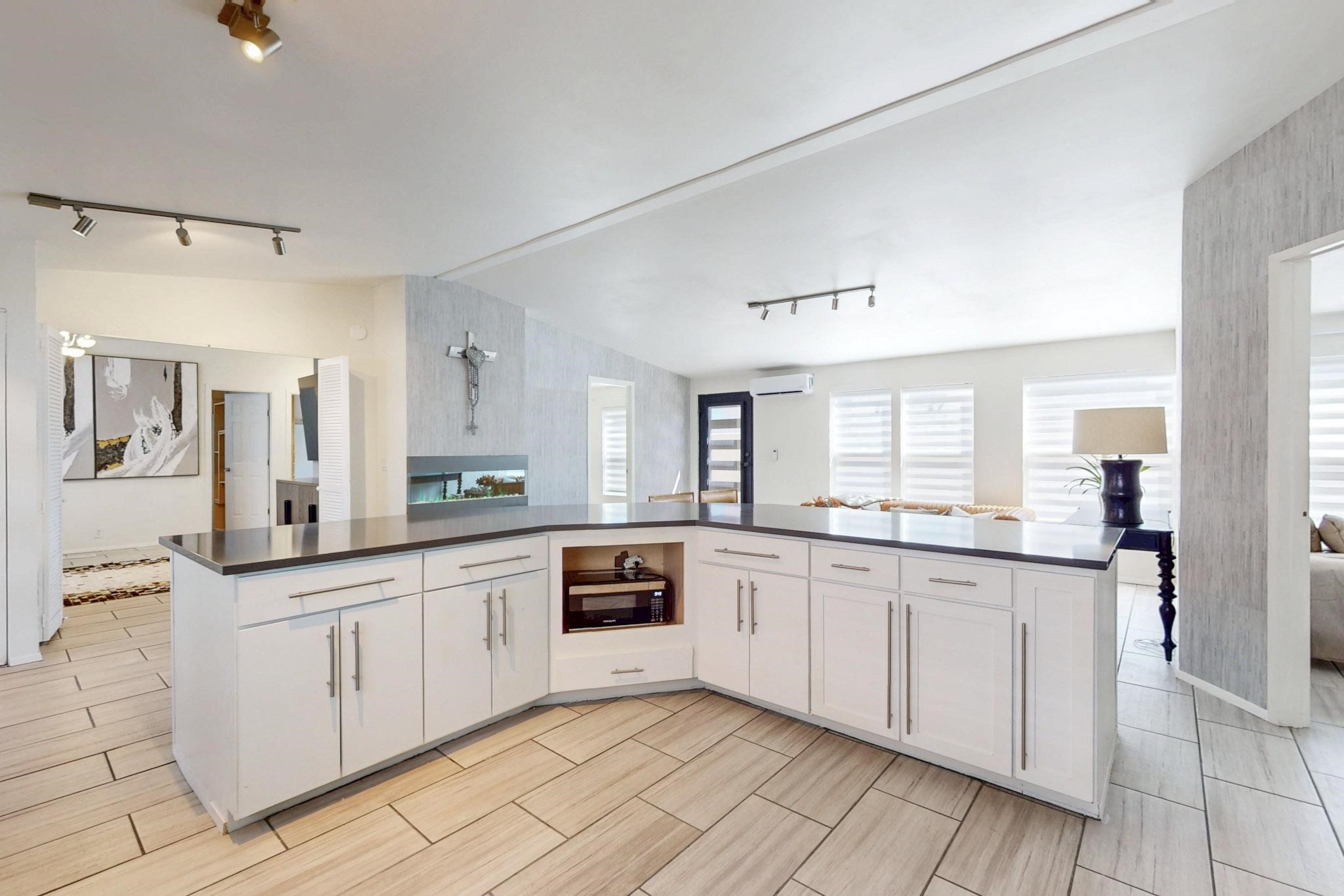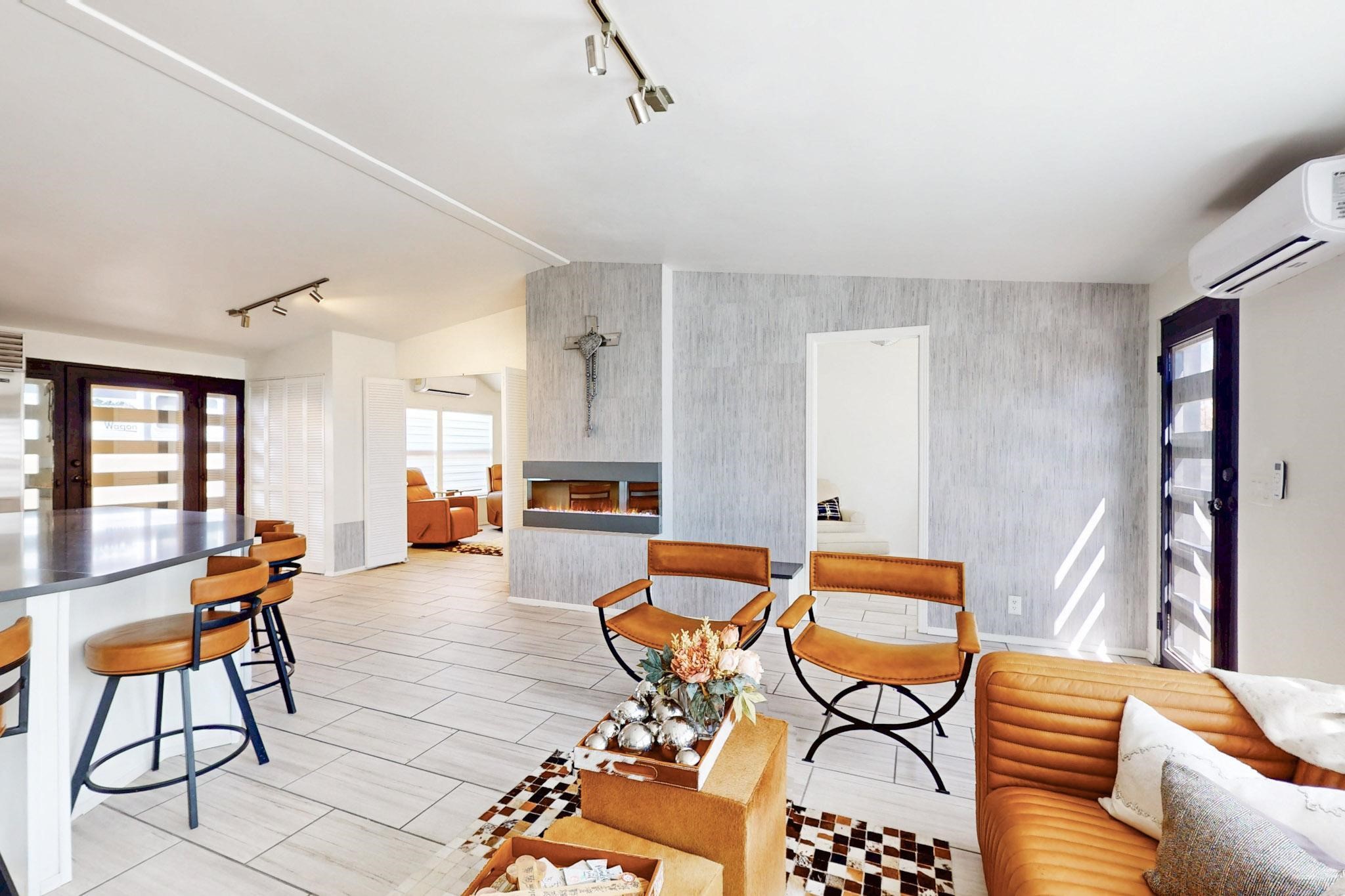 This beautiful single level contemporary style home exudes a modern flair and boasts an updated interior designed to cater to the needs of modern livng. The tasteful neutral color palette creates a warm & inviting atmosphere. Five bedrooms, each equipped with closets & built in cabinetry, offering ample storage and a clean, organized look. The primay bedroom with an adjoining bath features a huge walk-in closet with built in cabinetry. A fabulous kitchen featuring large countertop dining - perfect for casual meals and socializing. Designer cabinetry and upscale appliances including a Subzero refrigerator add to the appeal. The living area open to the kitchen features a stunning electric fireplace, providing both a cativating visual effect and ambiance. Just off this area is a versatile room - currently used as a media room but could be a formal dining room for family gatherings. Enjoy outdoor seating under a charming pergola, perfect for relaxing or entertaining guests. The gated driveway and side entrance offer privacy and security. Mini splits with solar panels providing low energy costs.