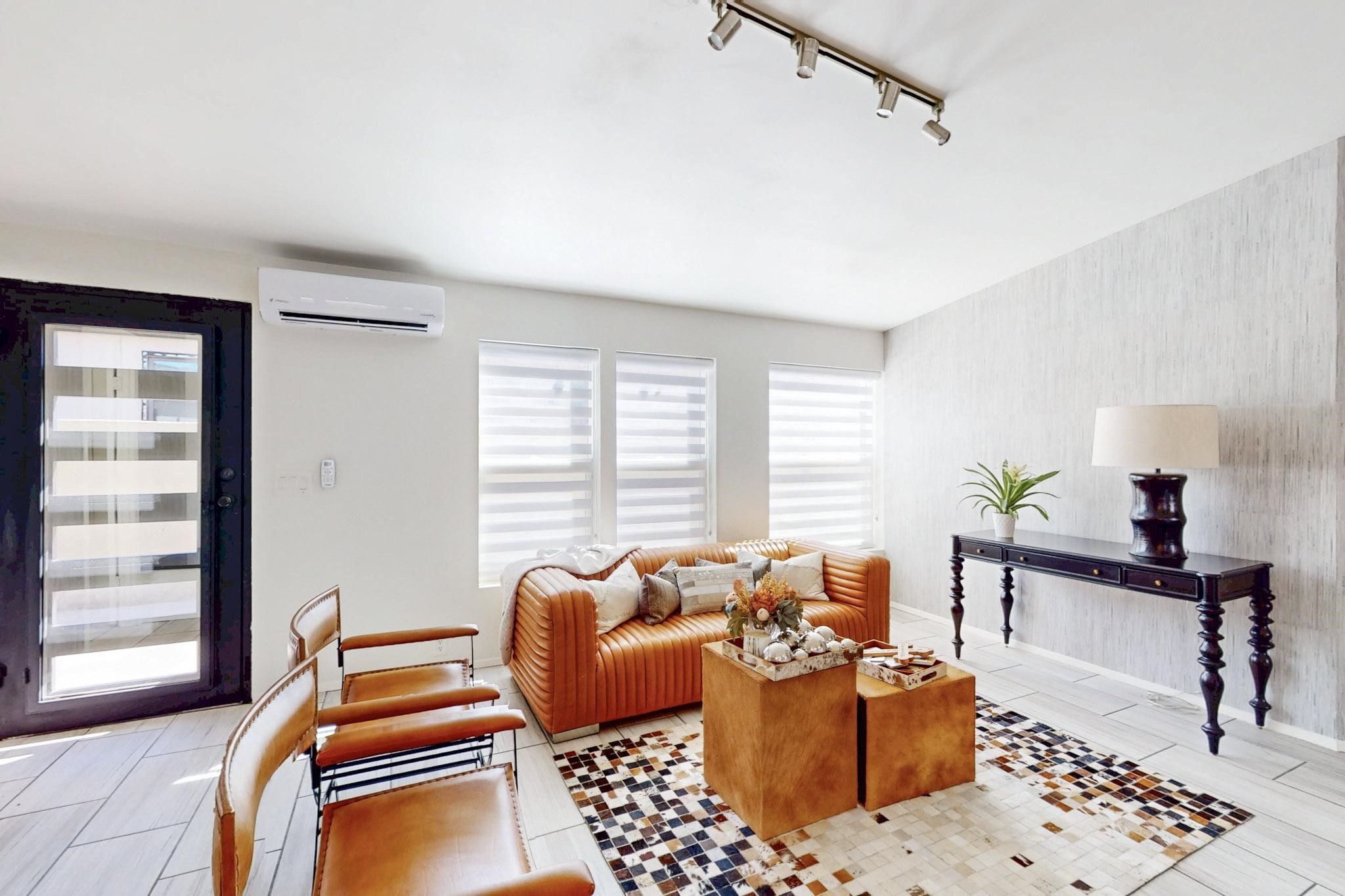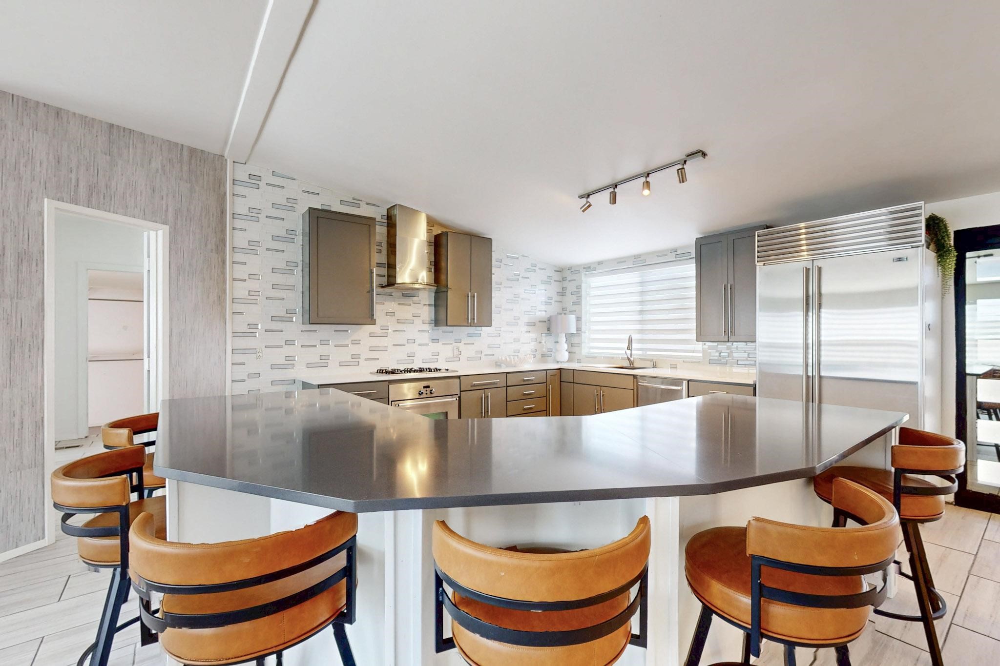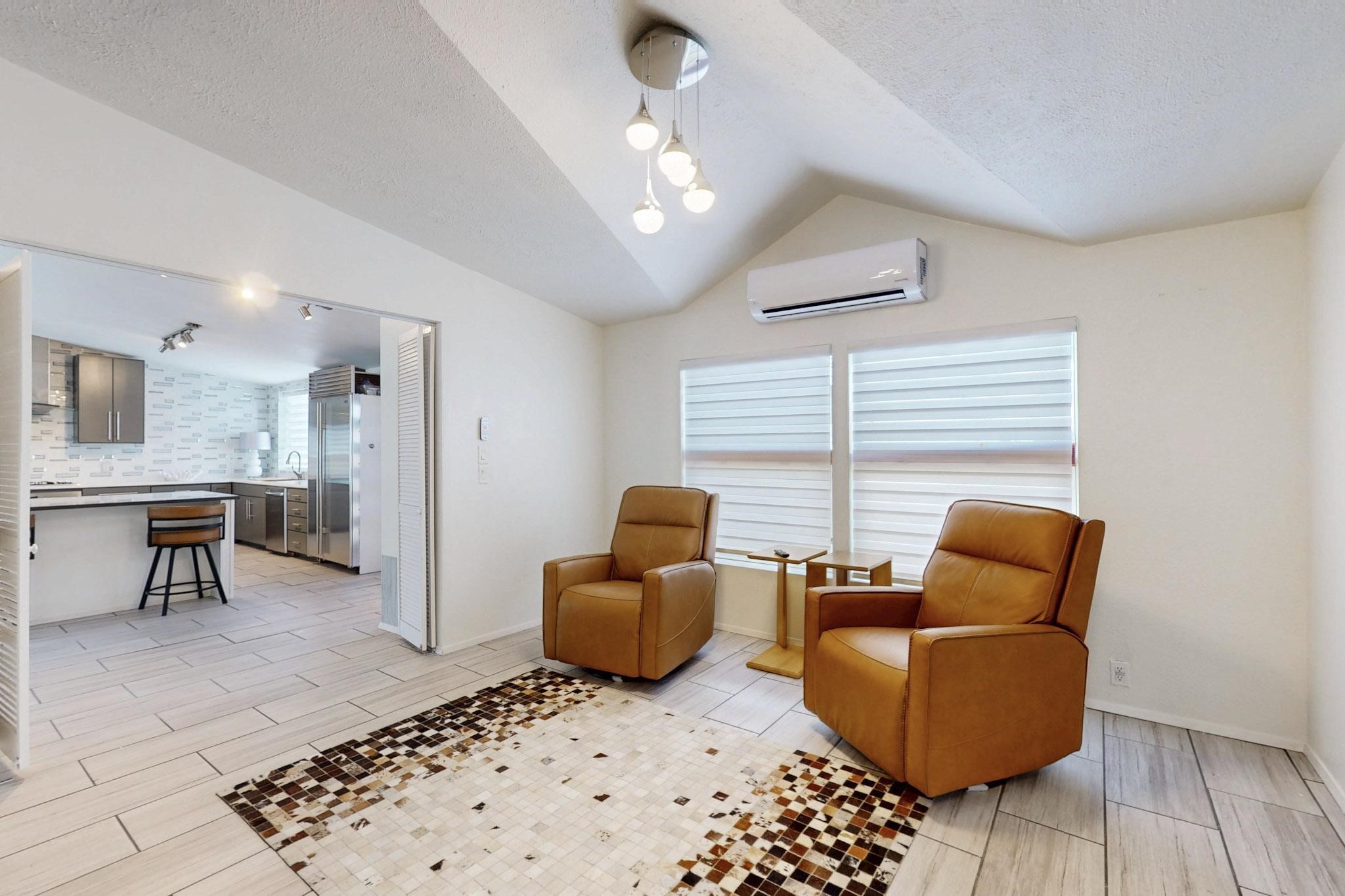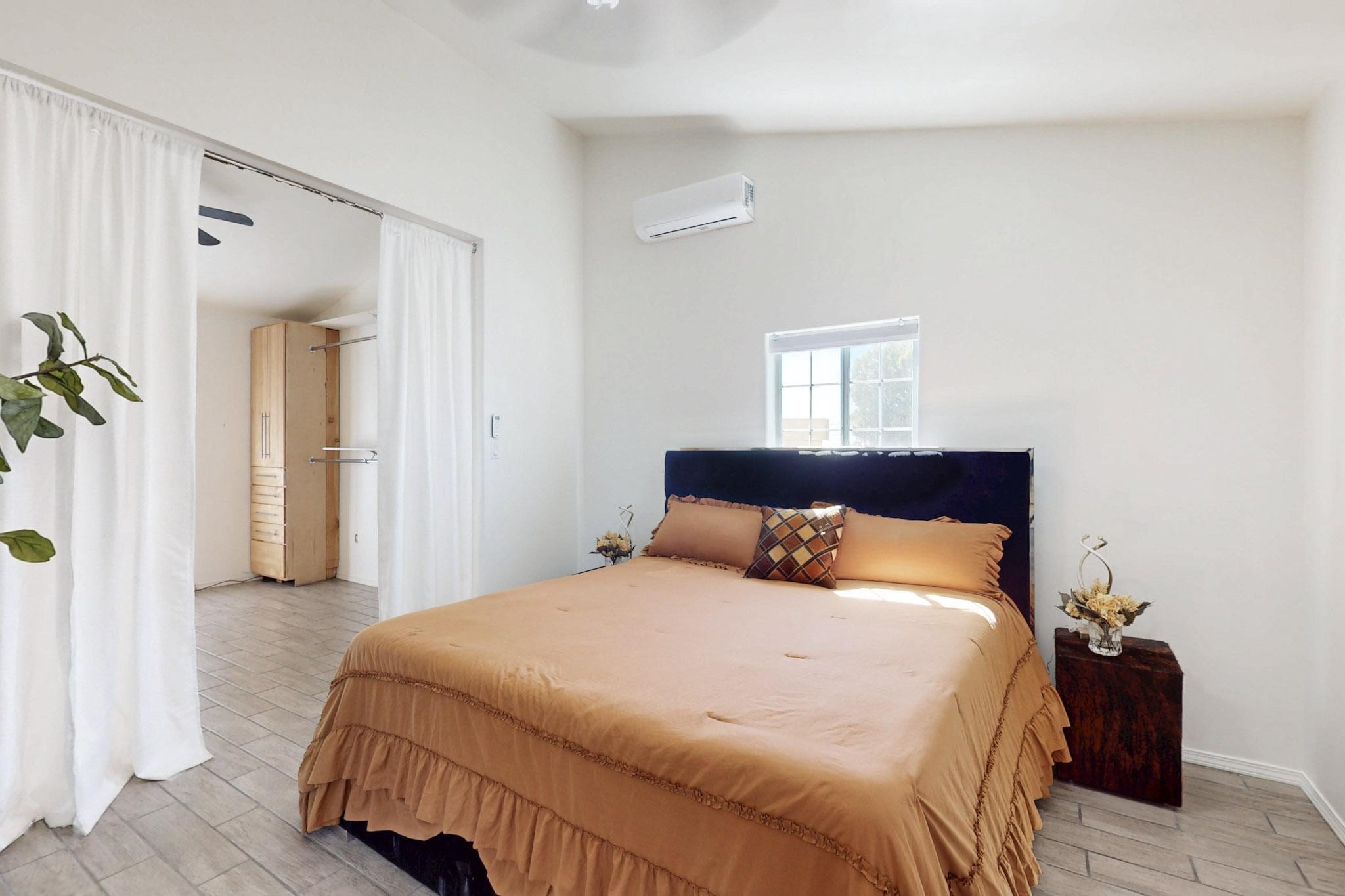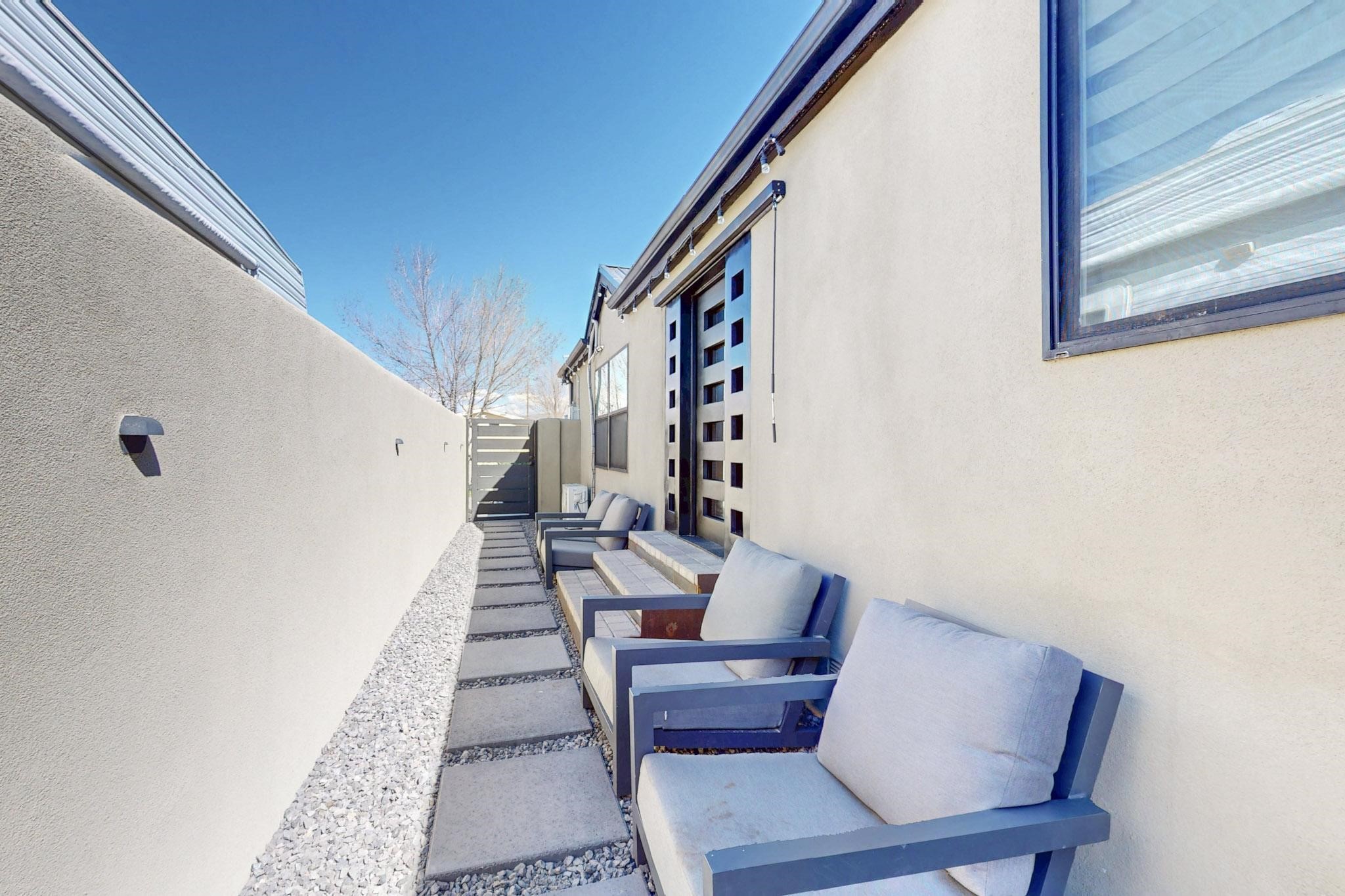 This beautiful single level contemporary style home exudes a modern flair and boasts an updated interior designed to cater to the needs of modern livng. The tasteful neutral color palette creates a warm & inviting atmosphere. Five bedrooms, each equipped with closets & built in cabinetry, offering ample storage and a clean, organized look. The primay bedroom with an adjoining bath features a huge walk-in closet with built in cabinetry. A fabulous kitchen featuring large countertop dining - perfect for casual meals and socializing. Designer cabinetry and upscale appliances including a Subzero refrigerator add to the appeal. The living area open to the kitchen features a stunning electric fireplace, providing both a cativating visual effect and ambiance. Just off this area is a versatile room - currently used as a media room but could be a formal dining room for family gatherings. Enjoy outdoor seating under a charming pergola, perfect for relaxing or entertaining guests. The gated driveway and side entrance offer privacy and security. Mini splits with solar panels providing low energy costs.