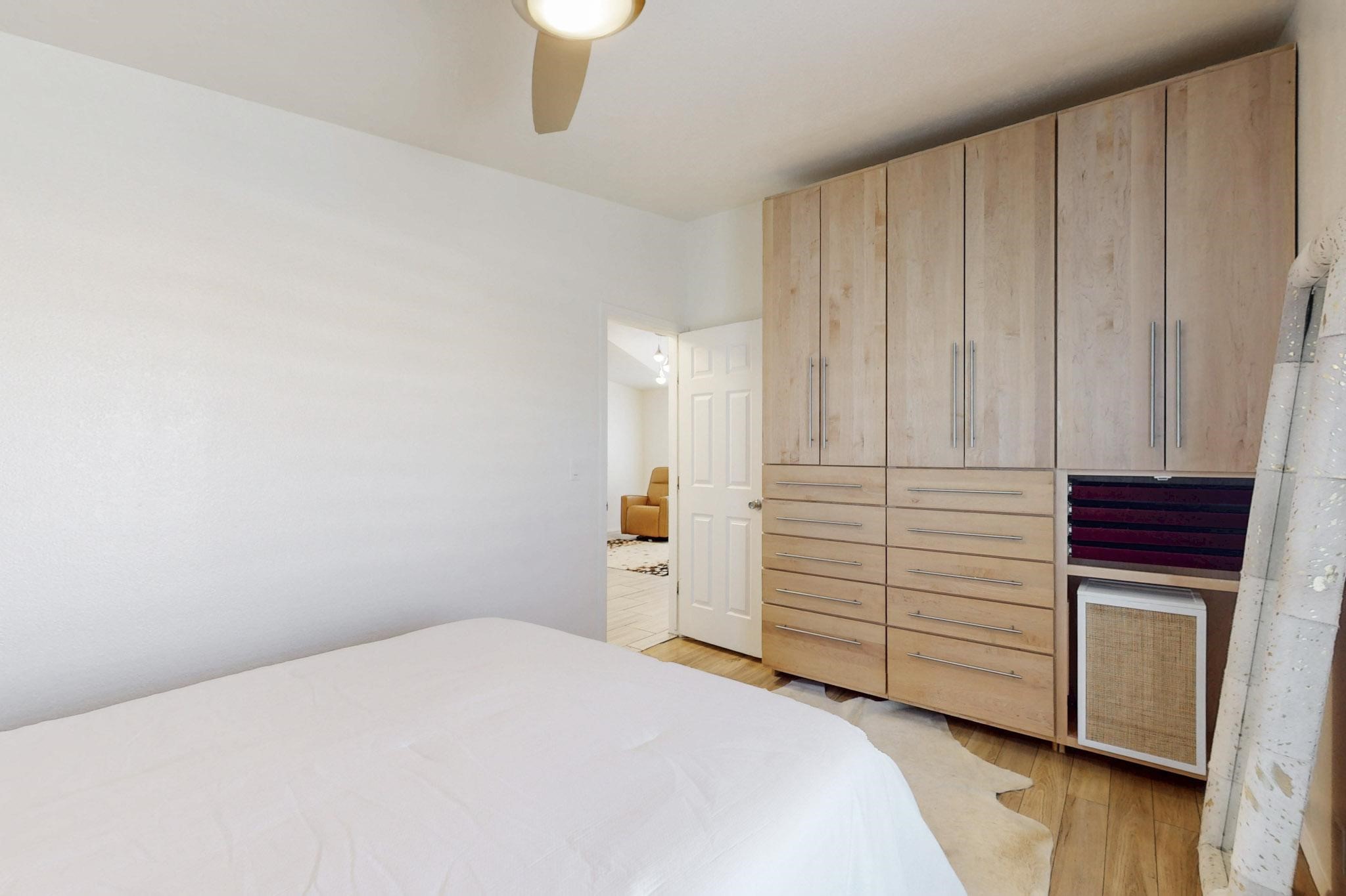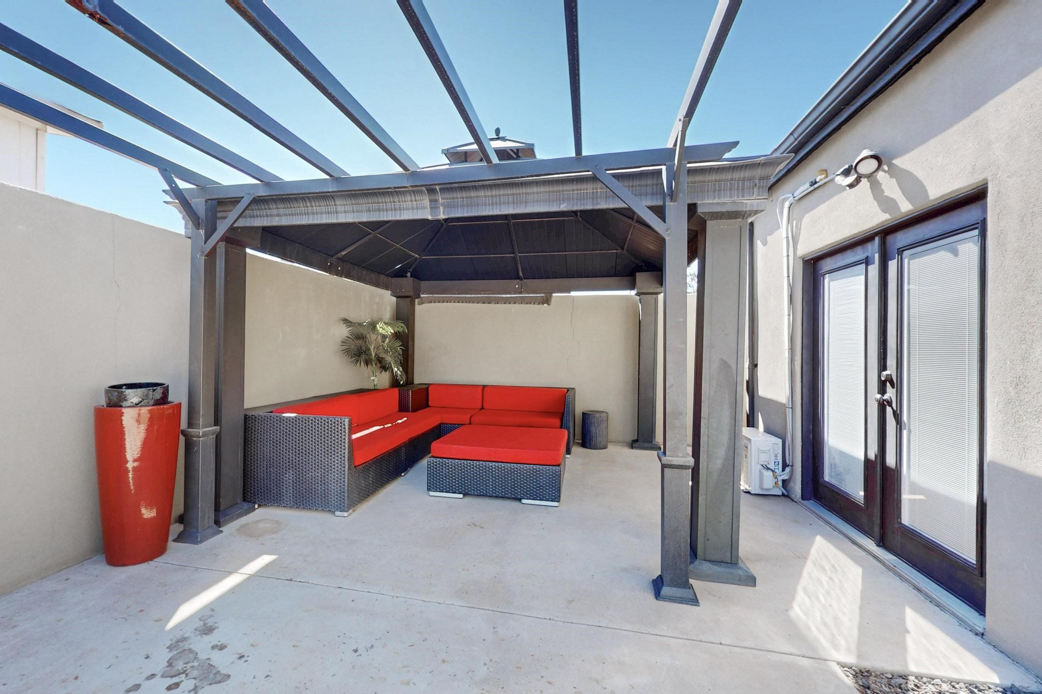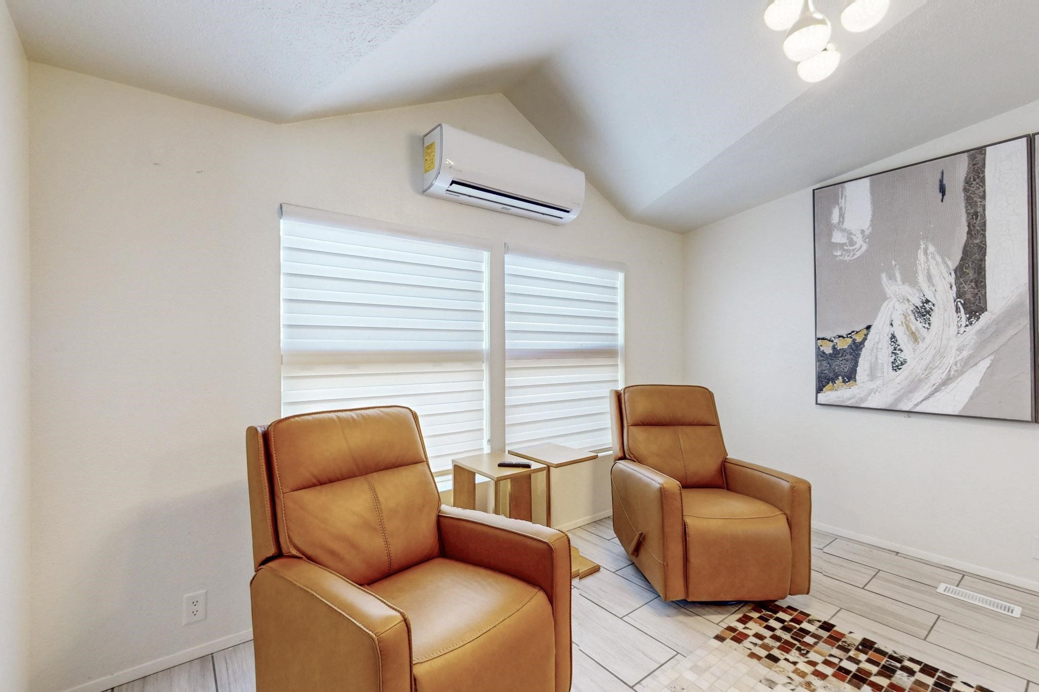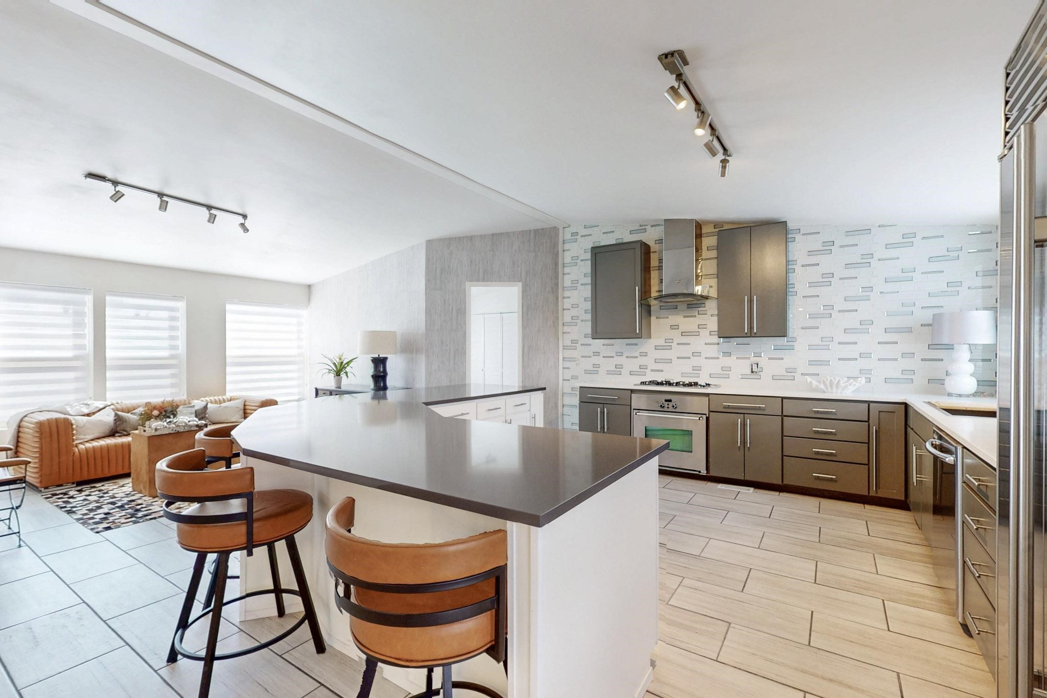 This beautiful single level contemporary style home exudes a modern flair and boasts an updated interior designed to cater to the needs of modern livng. The tasteful neutral color palette creates a warm & inviting atmosphere. Five bedrooms, each equipped with closets & built in cabinetry, offering ample storage and a clean, organized look. The primay bedroom with an adjoining bath features a huge walk-in closet with built in cabinetry. A fabulous kitchen featuring large countertop dining - perfect for casual meals and socializing. Designer cabinetry and upscale appliances including a Subzero refrigerator add to the appeal. The living area open to the kitchen features a stunning electric fireplace, providing both a cativating visual effect and ambiance. Just off this area is a versatile room - currently used as a media room but could be a formal dining room for family gatherings. Enjoy outdoor seating under a charming pergola, perfect for relaxing or entertaining guests. The gated driveway and side entrance offer privacy and security. Mini splits with solar panels providing low energy costs.