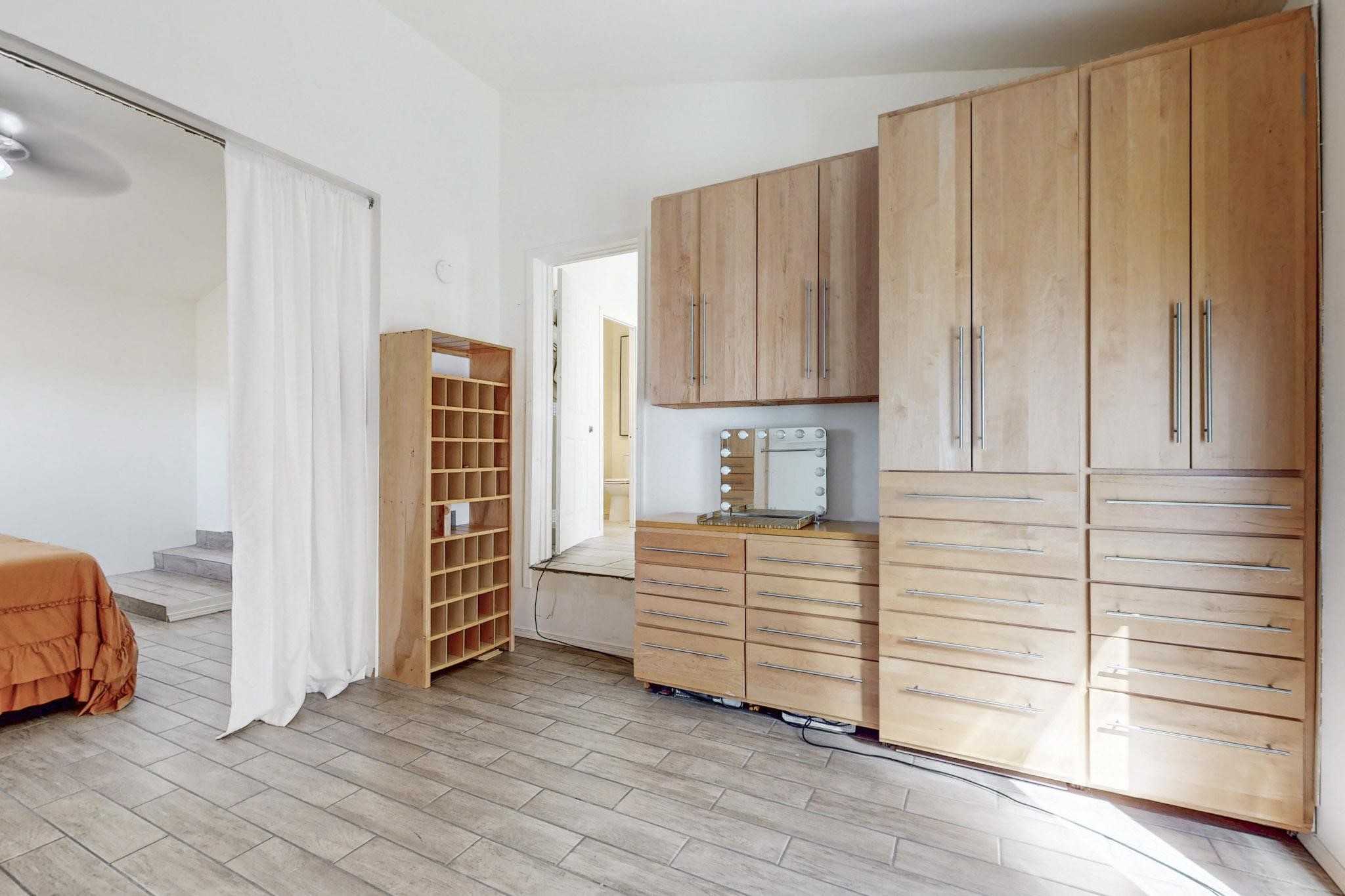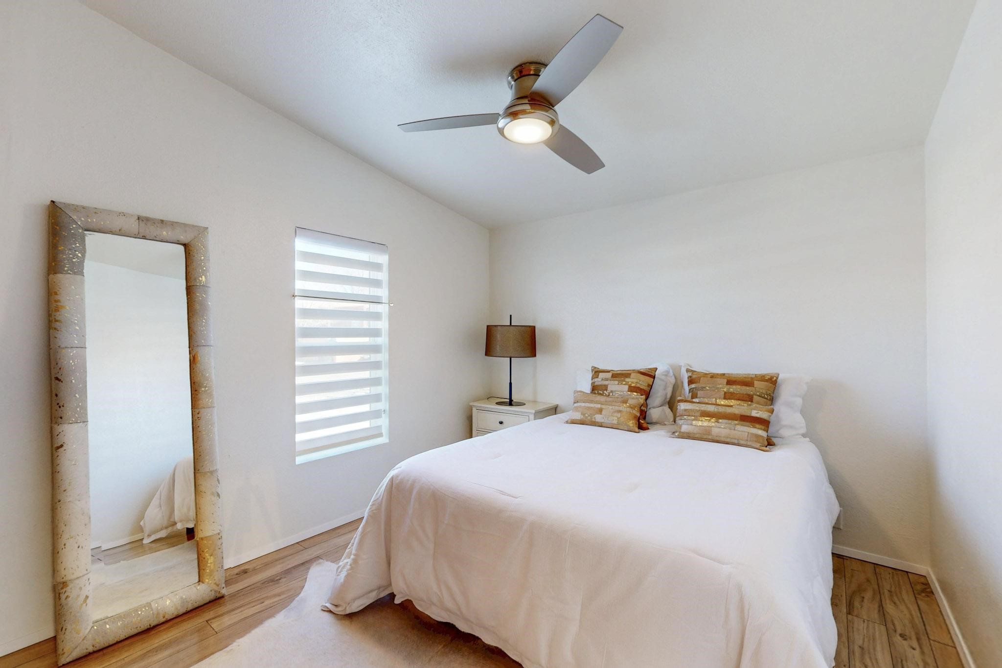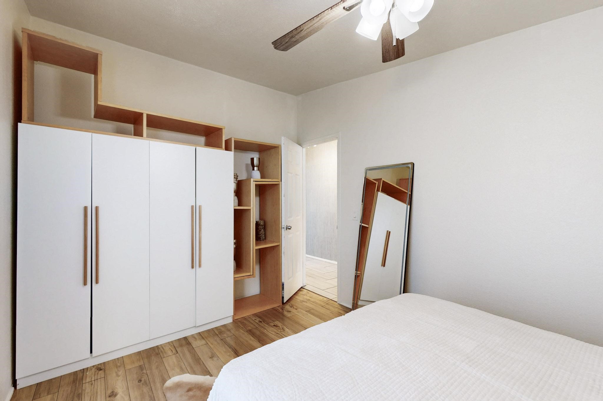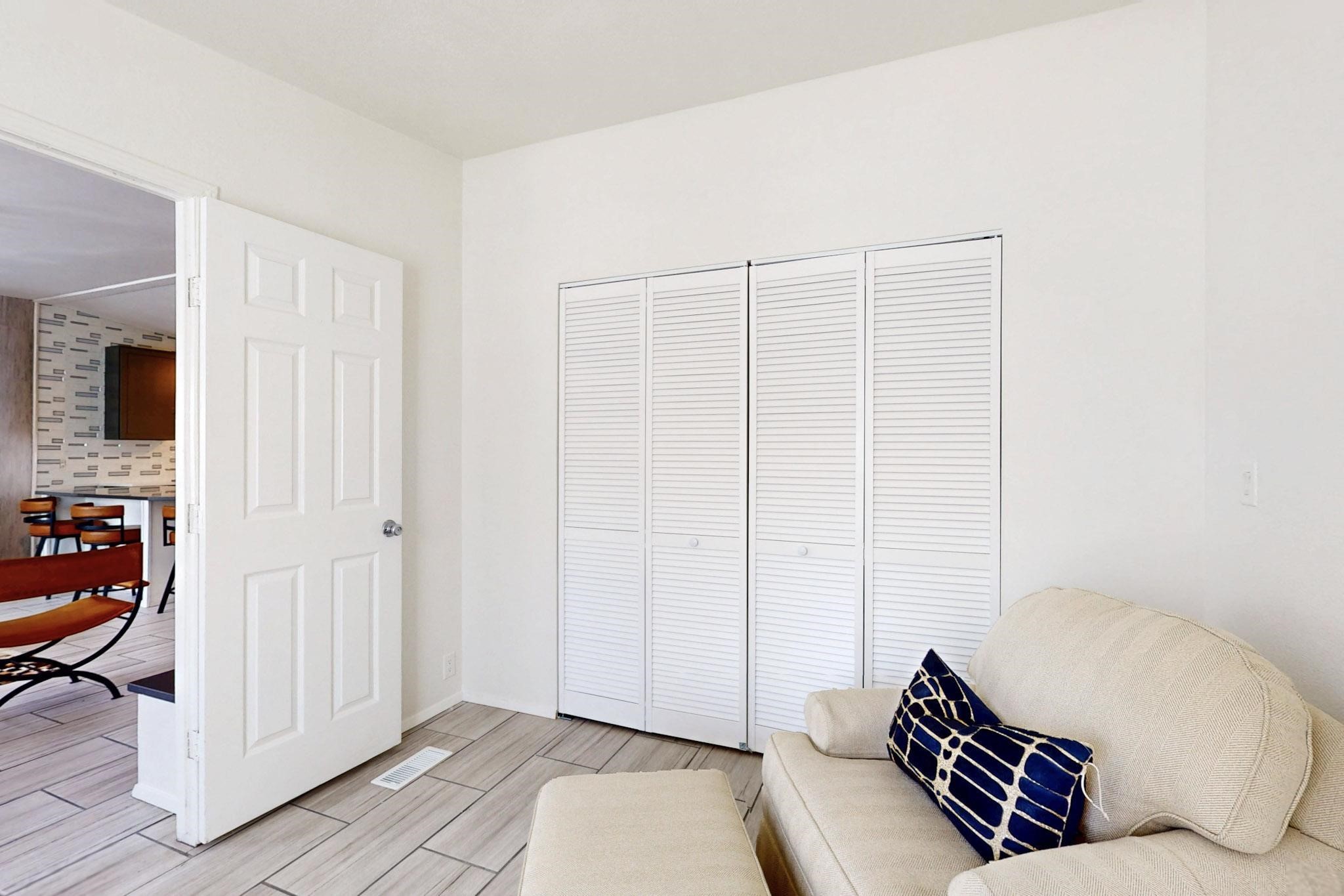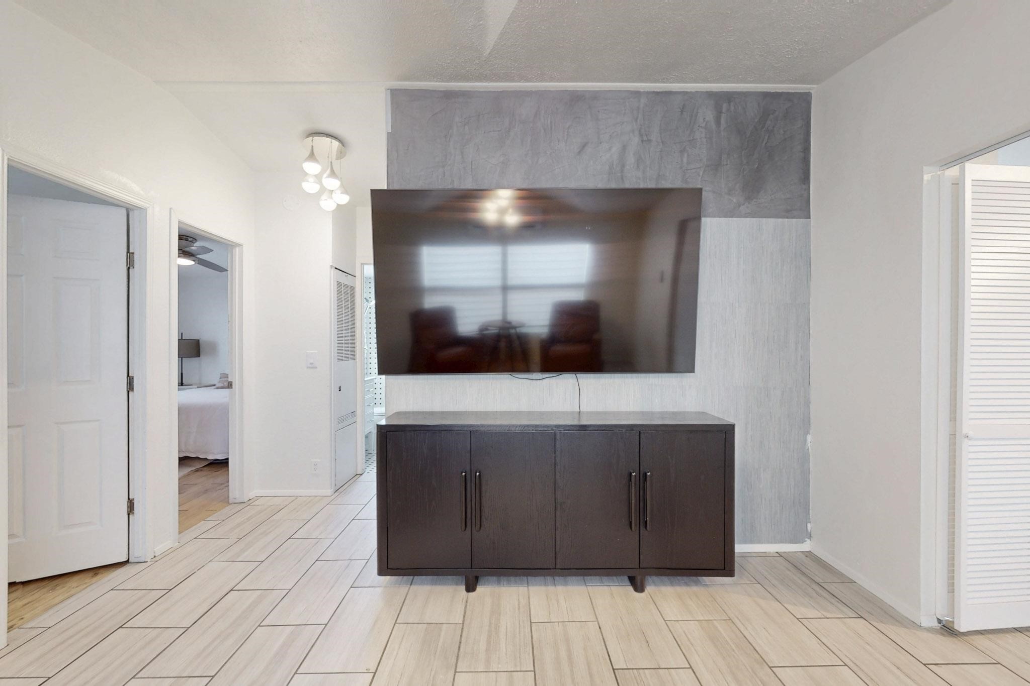 This beautiful single level contemporary style home exudes a modern flair and boasts an updated interior designed to cater to the needs of modern livng. The tasteful neutral color palette creates a warm & inviting atmosphere. Five bedrooms, each equipped with closets & built in cabinetry, offering ample storage and a clean, organized look. The primay bedroom with an adjoining bath features a huge walk-in closet with built in cabinetry. A fabulous kitchen featuring large countertop dining - perfect for casual meals and socializing. Designer cabinetry and upscale appliances including a Subzero refrigerator add to the appeal. The living area open to the kitchen features a stunning electric fireplace, providing both a cativating visual effect and ambiance. Just off this area is a versatile room - currently used as a media room but could be a formal dining room for family gatherings. Enjoy outdoor seating under a charming pergola, perfect for relaxing or entertaining guests. The gated driveway and side entrance offer privacy and security. Mini splits with solar panels providing low energy costs.