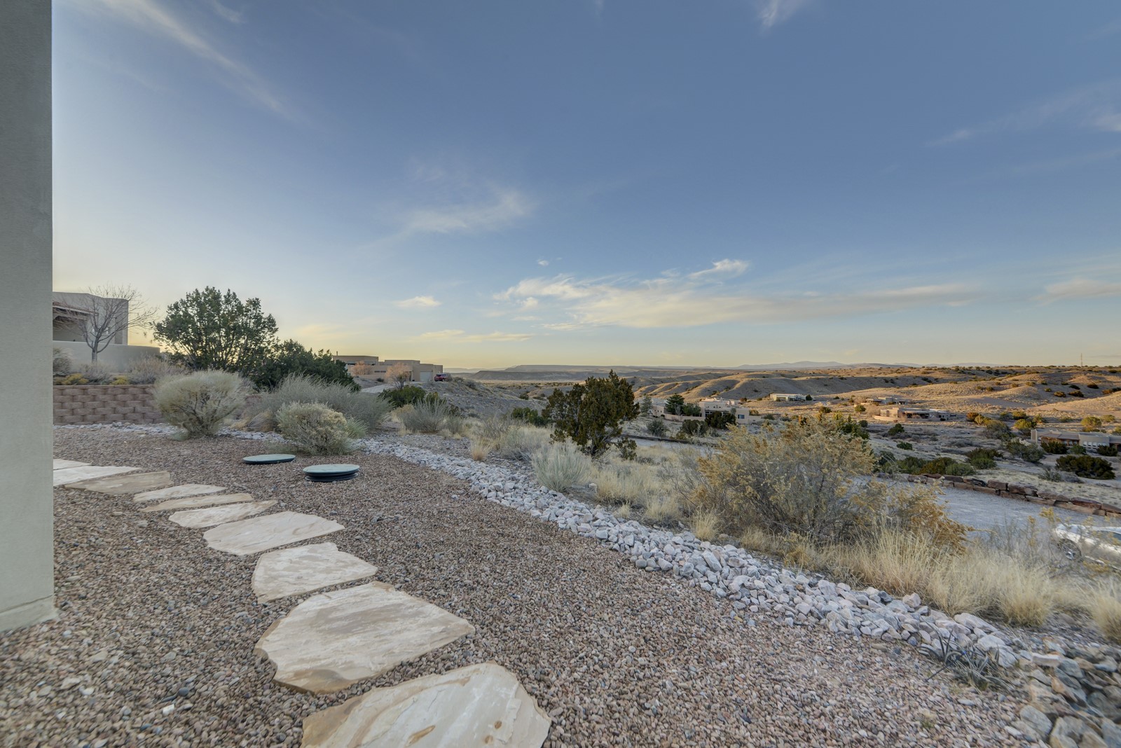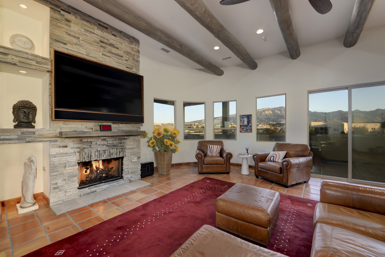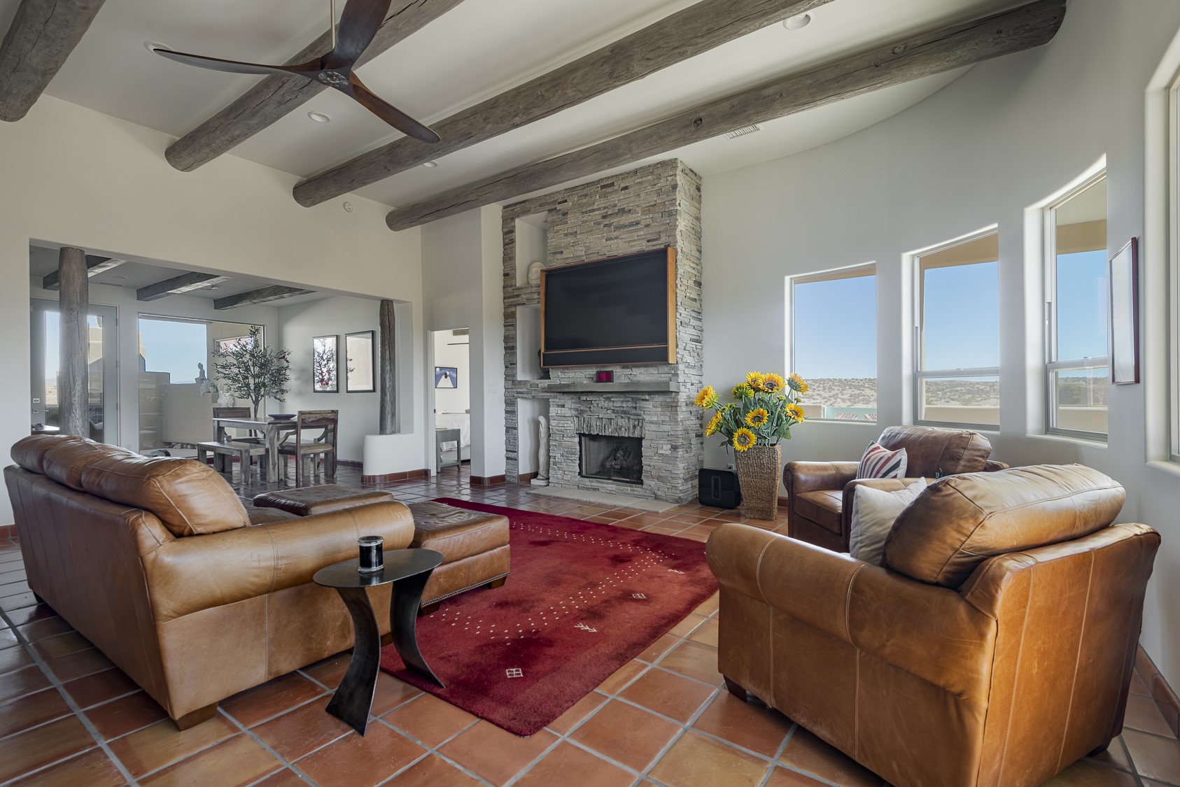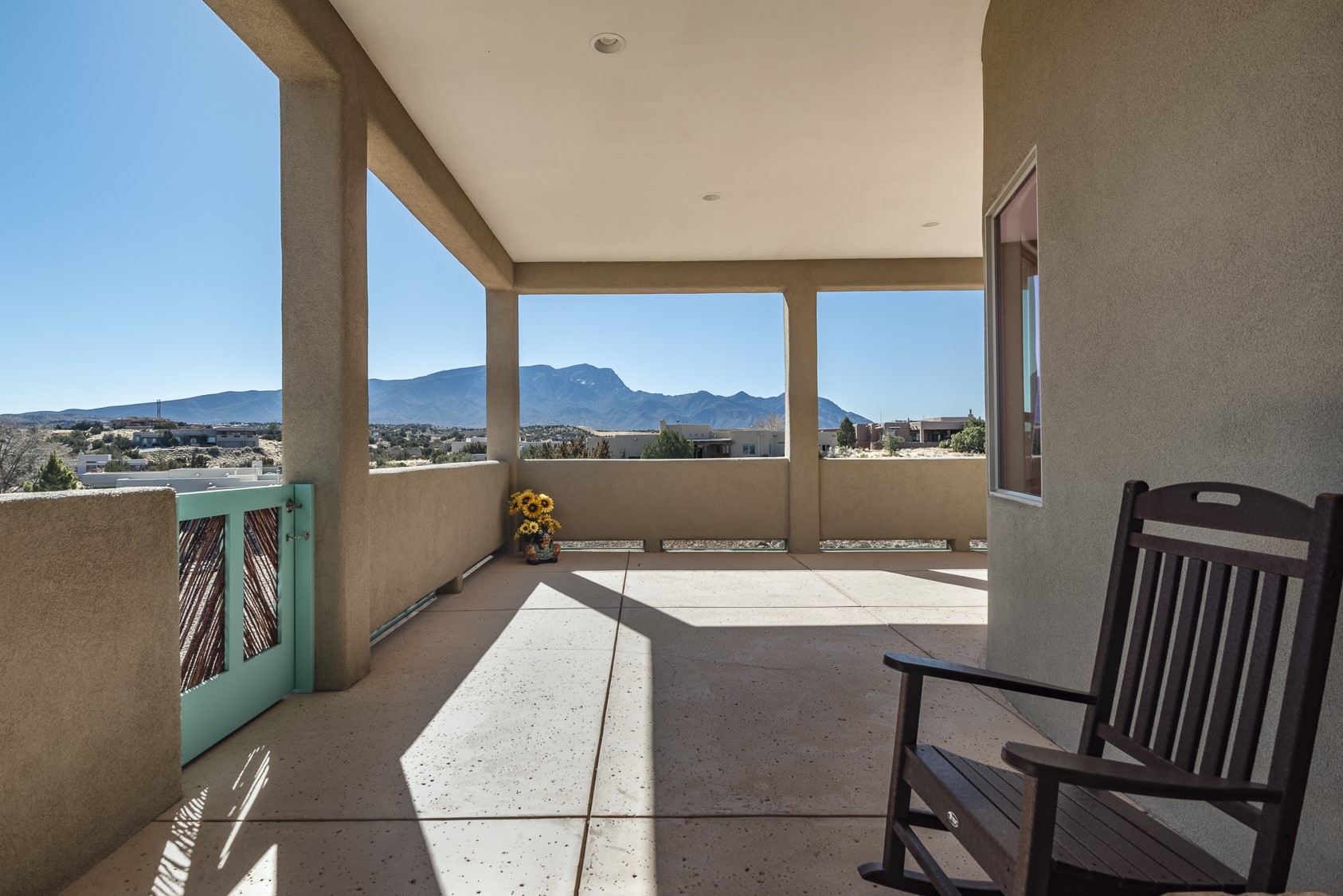 Discover enchanting Mountain & Sunset views from this exquisite, single story retreat in the heart of Sundance Mesa in Placitas, NM a vibrant yet quiet town between Santa Fe & Albuquerque. This meticulously maintained property features high ceilings and large windows that create an open, bright environment for easy living & peaceful relaxation. A contemporary Southwestern style is accented by hand-laid Saltillo tiles throughout, elegant marble & granite countertops, designer tile work, custom cabinetry and professionally painted interior perfect for showcasing art. The chef's kitchen is equipped with a six-burner gas range, SS appliances, large counter dining area & expansive counter space + storage. The primary suite & spa bath are positioned in the most secluded part of the property offering some of the best star gazing opportunities. Almost 1000sf of enclosed outdoor living space to enjoy the serenity & dark skies of Placitas. Nestled in a tranquil neighborhood with a community water system - a perfect balance of seclusion and convenience, just minutes from the vibrancy of town.
