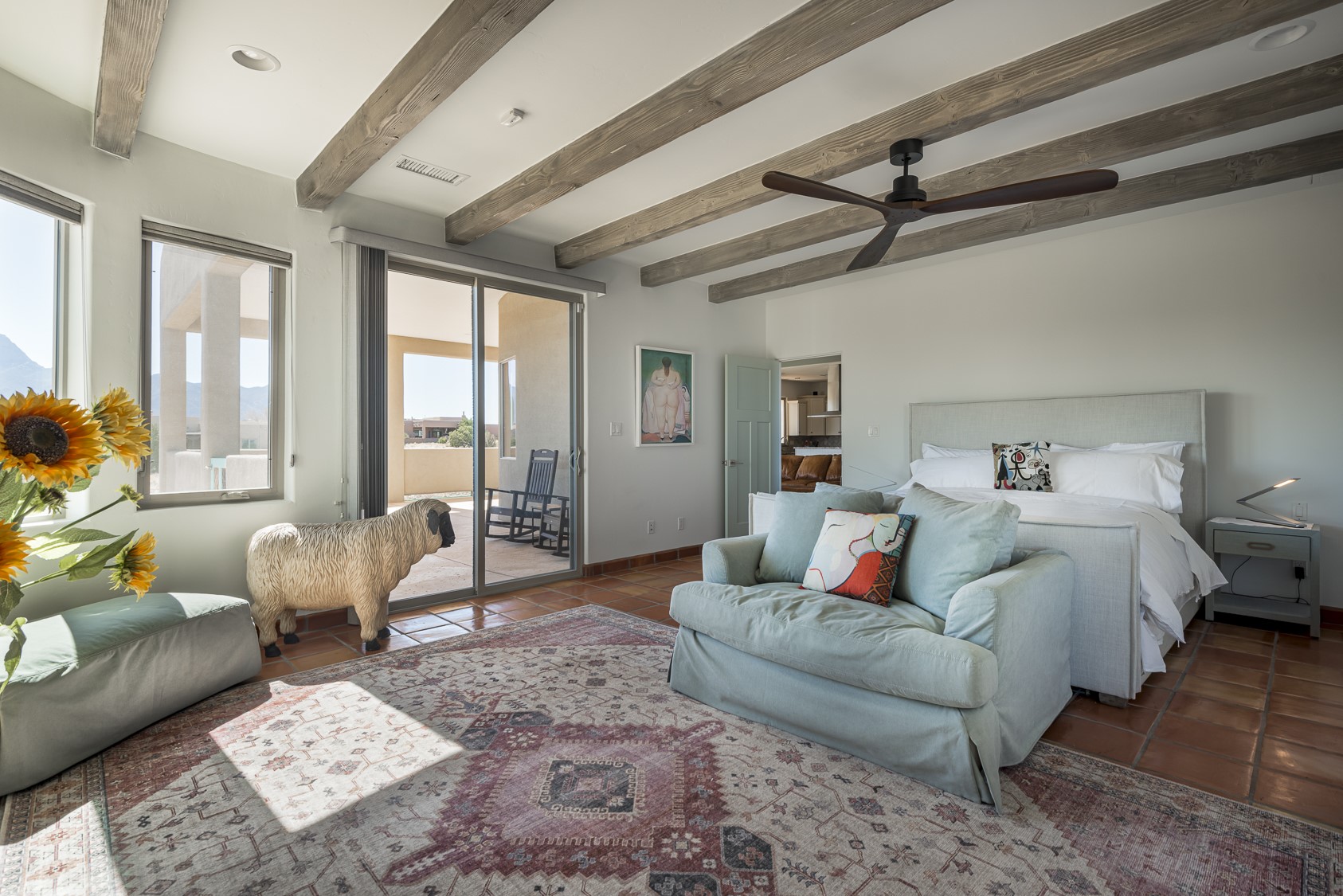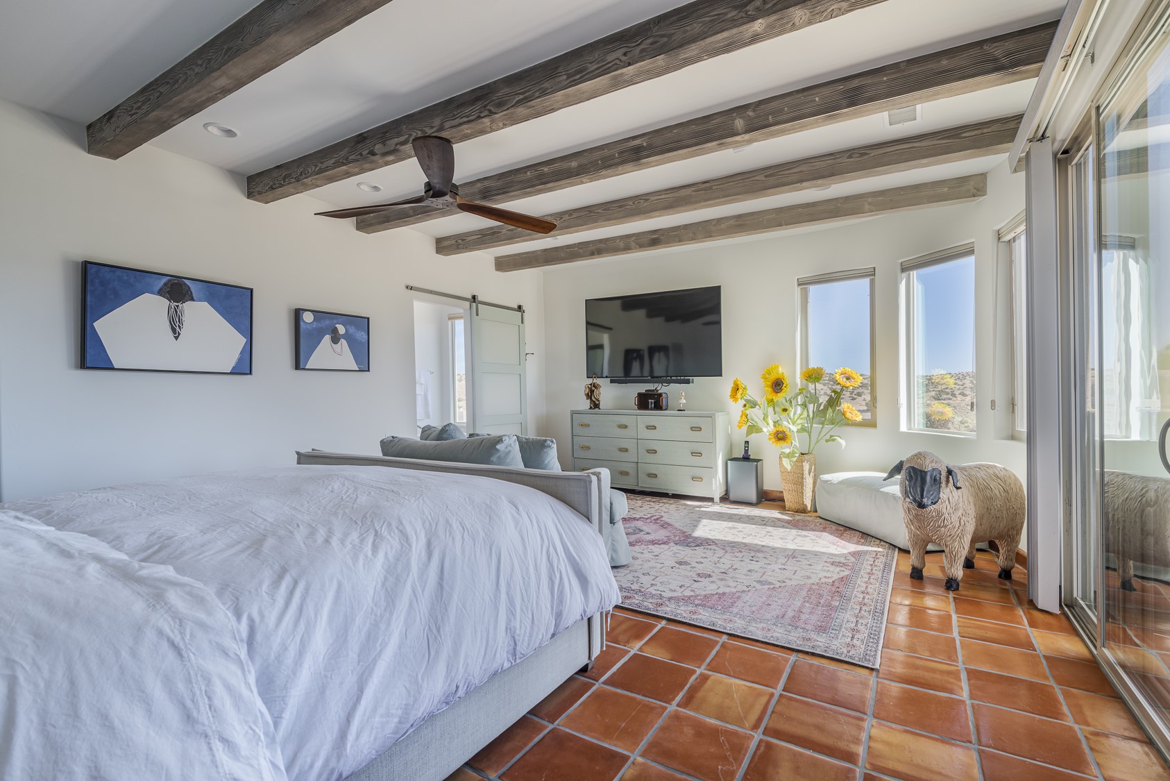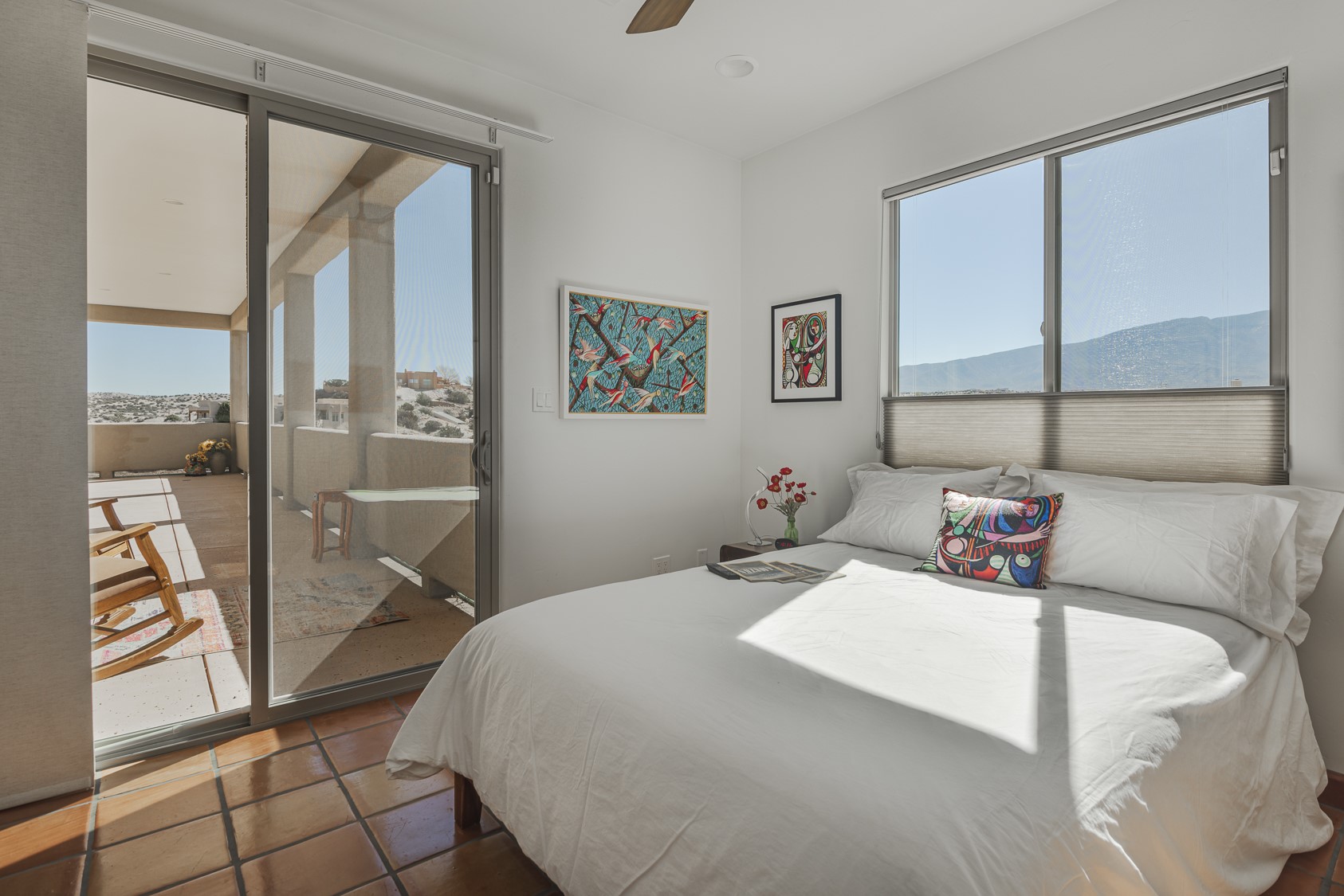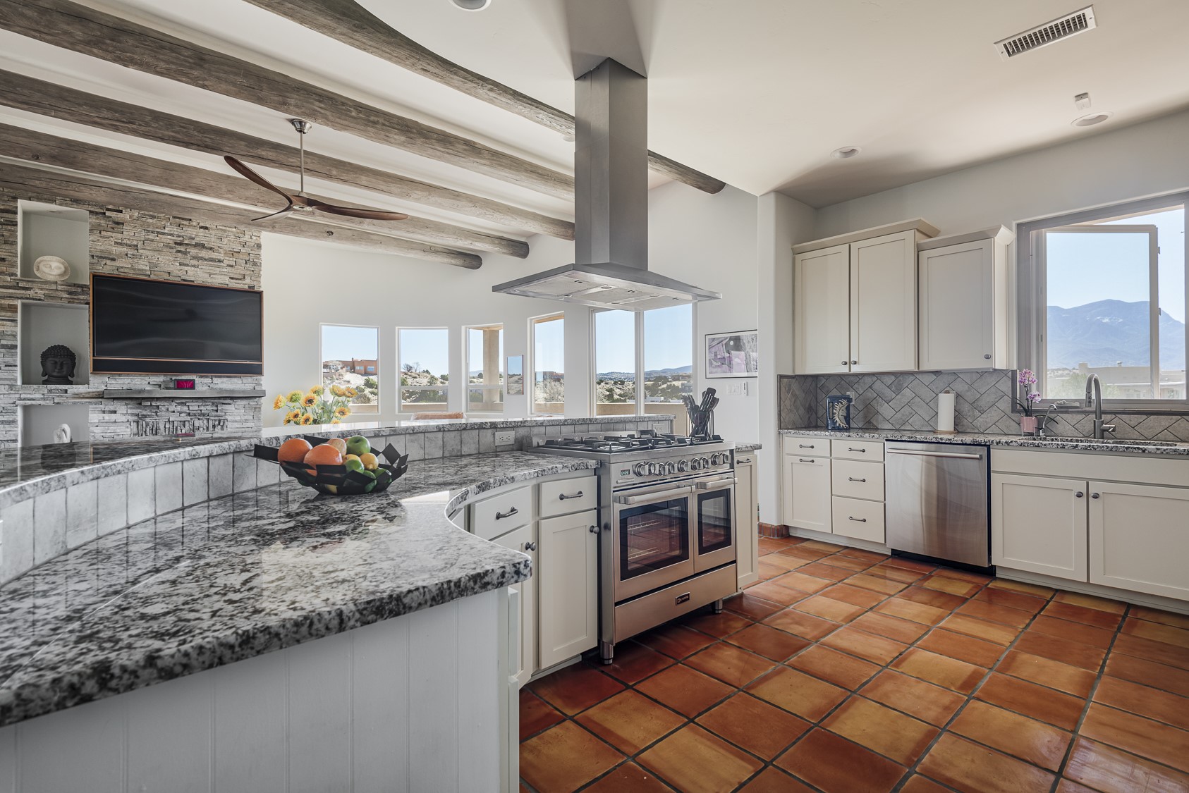 Discover enchanting Mountain & Sunset views from this exquisite, single story retreat in the heart of Sundance Mesa in Placitas, NM a vibrant yet quiet town between Santa Fe & Albuquerque. This meticulously maintained property features high ceilings and large windows that create an open, bright environment for easy living & peaceful relaxation. A contemporary Southwestern style is accented by hand-laid Saltillo tiles throughout, elegant marble & granite countertops, designer tile work, custom cabinetry and professionally painted interior perfect for showcasing art. The chef's kitchen is equipped with a six-burner gas range, SS appliances, large counter dining area & expansive counter space + storage. The primary suite & spa bath are positioned in the most secluded part of the property offering some of the best star gazing opportunities. Almost 1000sf of enclosed outdoor living space to enjoy the serenity & dark skies of Placitas. Nestled in a tranquil neighborhood with a community water system - a perfect balance of seclusion and convenience, just minutes from the vibrancy of town.