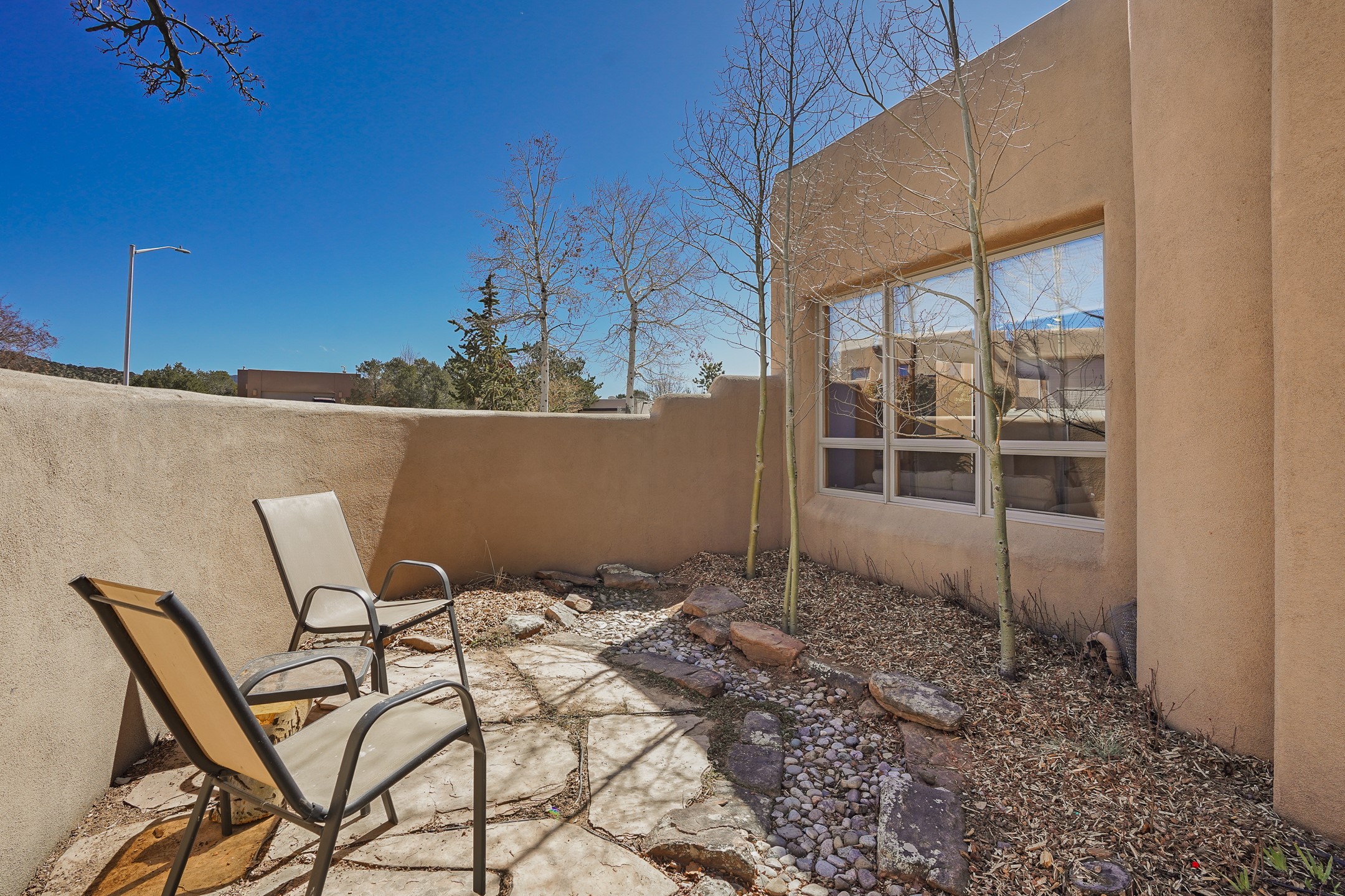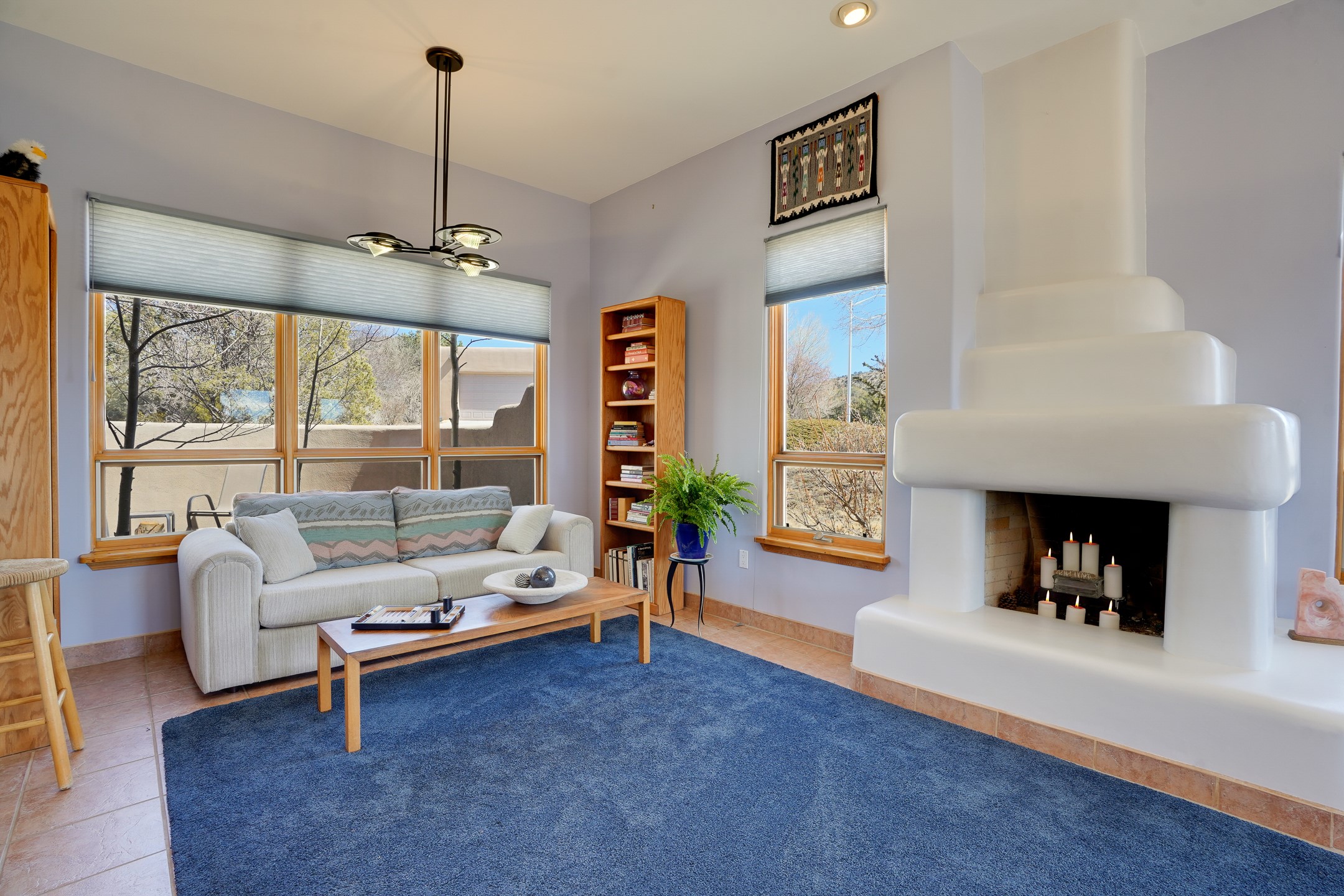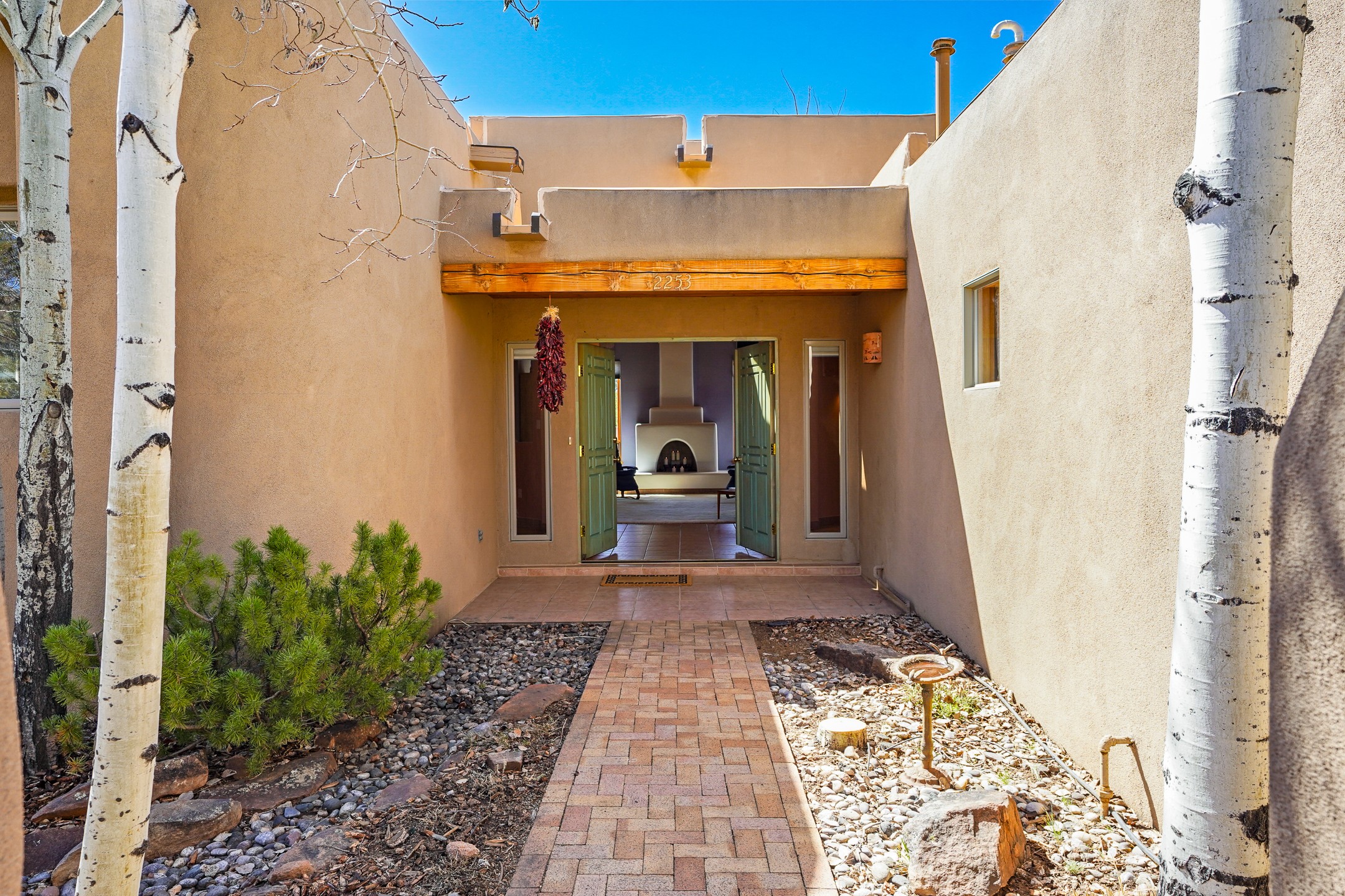 Welcome to this very gracious single level home nestled in the foothills of Santa Fe offering comfort, privacy and convenience with mountain views and spectacular sunsets. It sits on .40 acres just minutes away from museums, shopping, the local hospitals and schools on a cul-de-sac and at the end of the street. The historic plaza is within 4 miles. This home has beautiful high ceilings ( 10 ft,12 ft ,and 14 ft) with vigas in the entryway, dining room and living room. The living room, family room and primary bedroom offer sculpted fireplaces. The primary suite is very spacious and romantic with the stand alone sculpted fireplace, the bathroom has a jetted tub for relaxation, a walk-in shower with grab bars, a large walk-in closet, double sinks, a makeup vanity, tons of light and space. The open kitchen is a 'cooks kitchen' with generous space, double ovens and a center island cooktop. The kitchen and dining room open to a covered back patio with an inline gas barbecue. The patio looks out onto a beautiful garden area offering mature landscaping (with drip irrigation) with cherry and peach trees and dramatic sunset views. This home includes a newer roof (11/2021), new Navien hot water heater and boiler (12/2024), wheelchair accessibility, central air, radiant floor heat, seven skylights and an oversized garage.