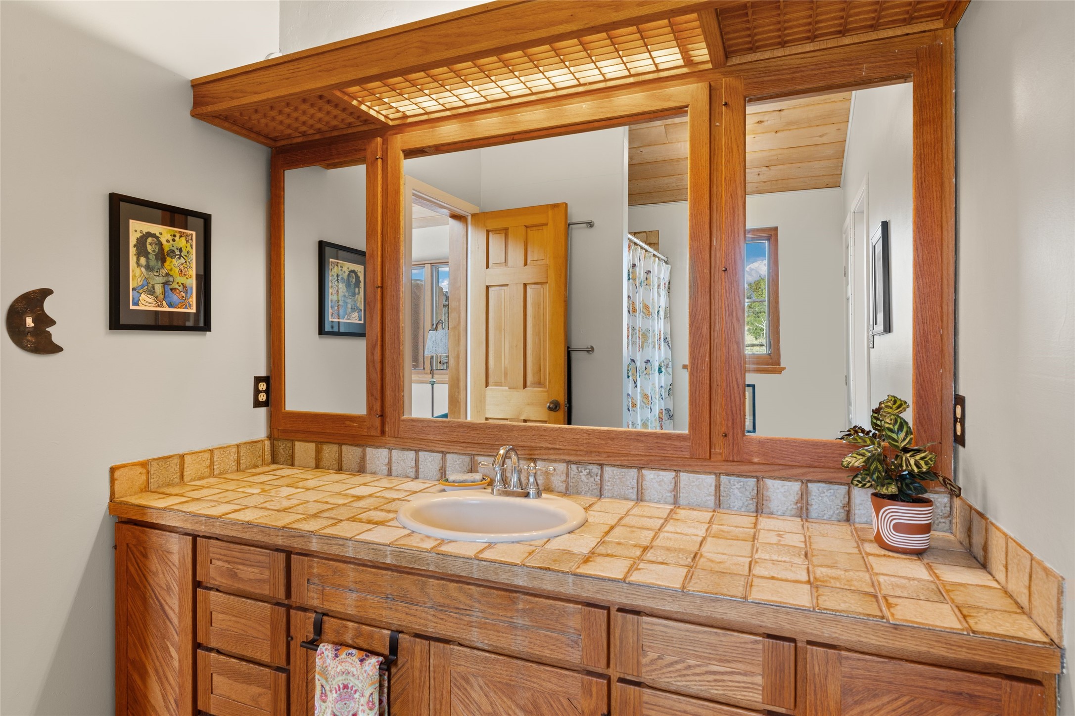 Happy, light and bright adobe designed by award-winning architect Beverley Spears and built by Rational Alternatives. This darling traditional passive solar home has trombe walls, deep window sills and charm galore! Bedrooms have vaulted, planked ceilings with clerestory windows. Mostly brick floors with some hardwood. Oversized heated one-car garage has studio/workshop space and a generous closet for storage. Three splits provide heating and air conditioning. Sited high on a cul-de-sac to maximize the wonderful mountain views. Two steps up to bedrooms. Walled front courtyard and generous and fully fenced backyard. NO CARPET. Radon mitigation in place. Super sweet and ready to go!