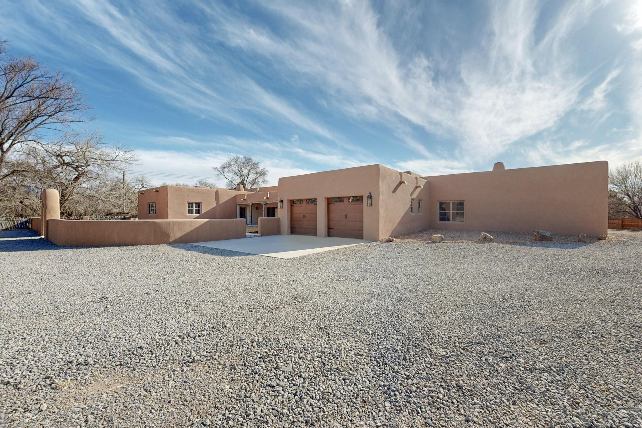 Nestled in the lush Nambe Valley approximately 15 miles to the Historic Santa Fe Plaza lies arare opportunity to own three contiguous lots featuring a newly reimagined adobe estate,featured in the 2024 Haciendas Parade of Homes. This custom-built residence offersapproximately 5,683 square feet of refined living with three spacious bedrooms, each with anensuite bath, plus two additional half baths. A stately office, formal dining room, and informaldining area off the gourmet kitchen provide elegant and versatile spaces for living andentertaining. Interiors showcase hand-applied diamond plaster, brick floors, three fireplaces,and distinctive wood ceiling treatments throughout. Oversized closets with California Closetsystems, a two-car garage, and mature cottonwoods add to the home's comfort and appeal.Covered brick portals wrap the home, offering shaded outdoor spaces perfect for relaxing orentertaining. The property is fully walled and fenced for privacy, and includes two expansive,separately deeded fields offering endless potential--farming, equestrian use, gardens, or futuredevelopment--supported by historic acequia water rights a private well and a professionallyinstalled irrigation system. A $200,000 landscaping allowance is available with an acceptedoffer. Some exterior photos have been virtually staged to show possibilities with property. Fires in fireplaces have been photoshopped.
