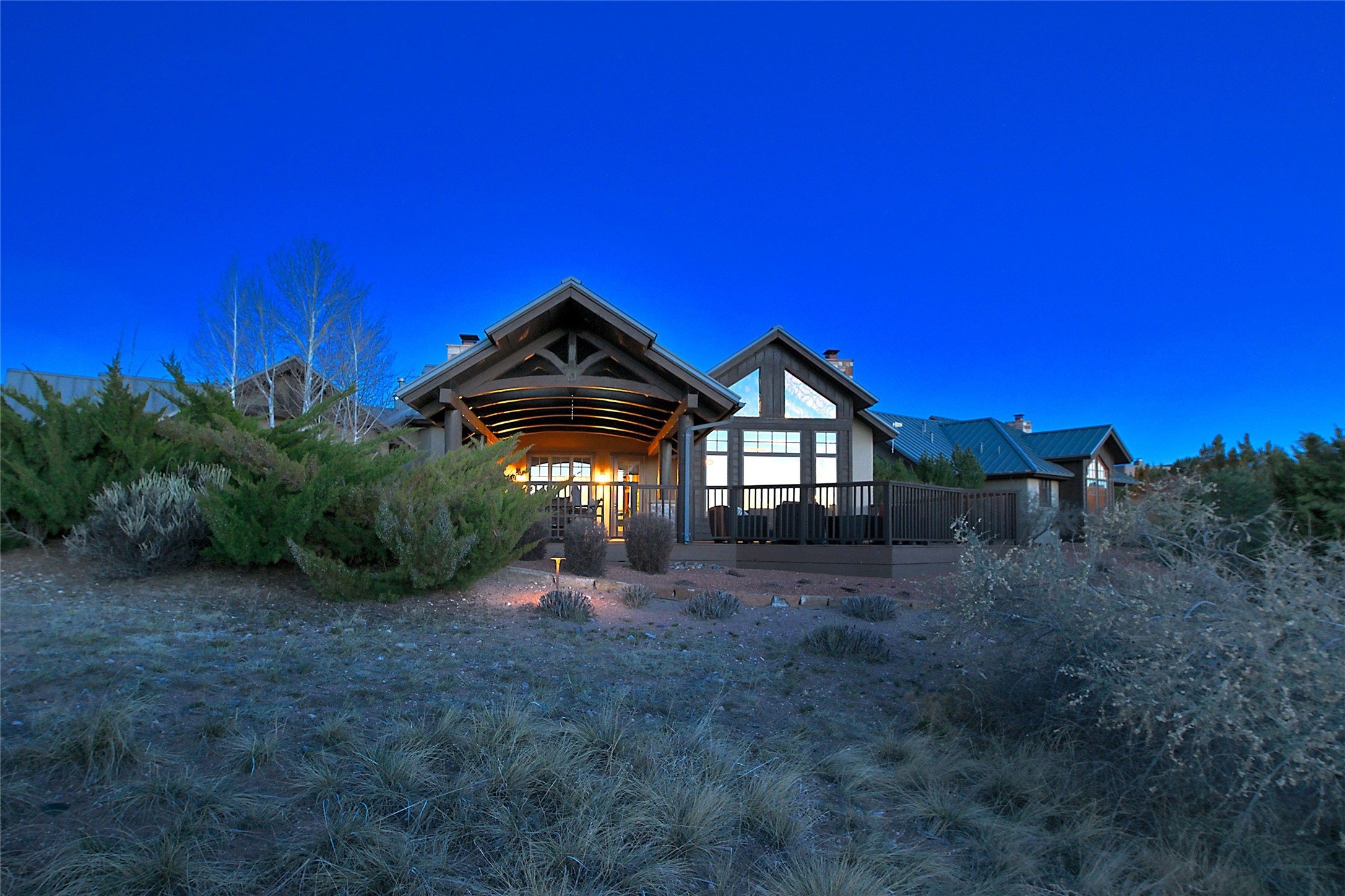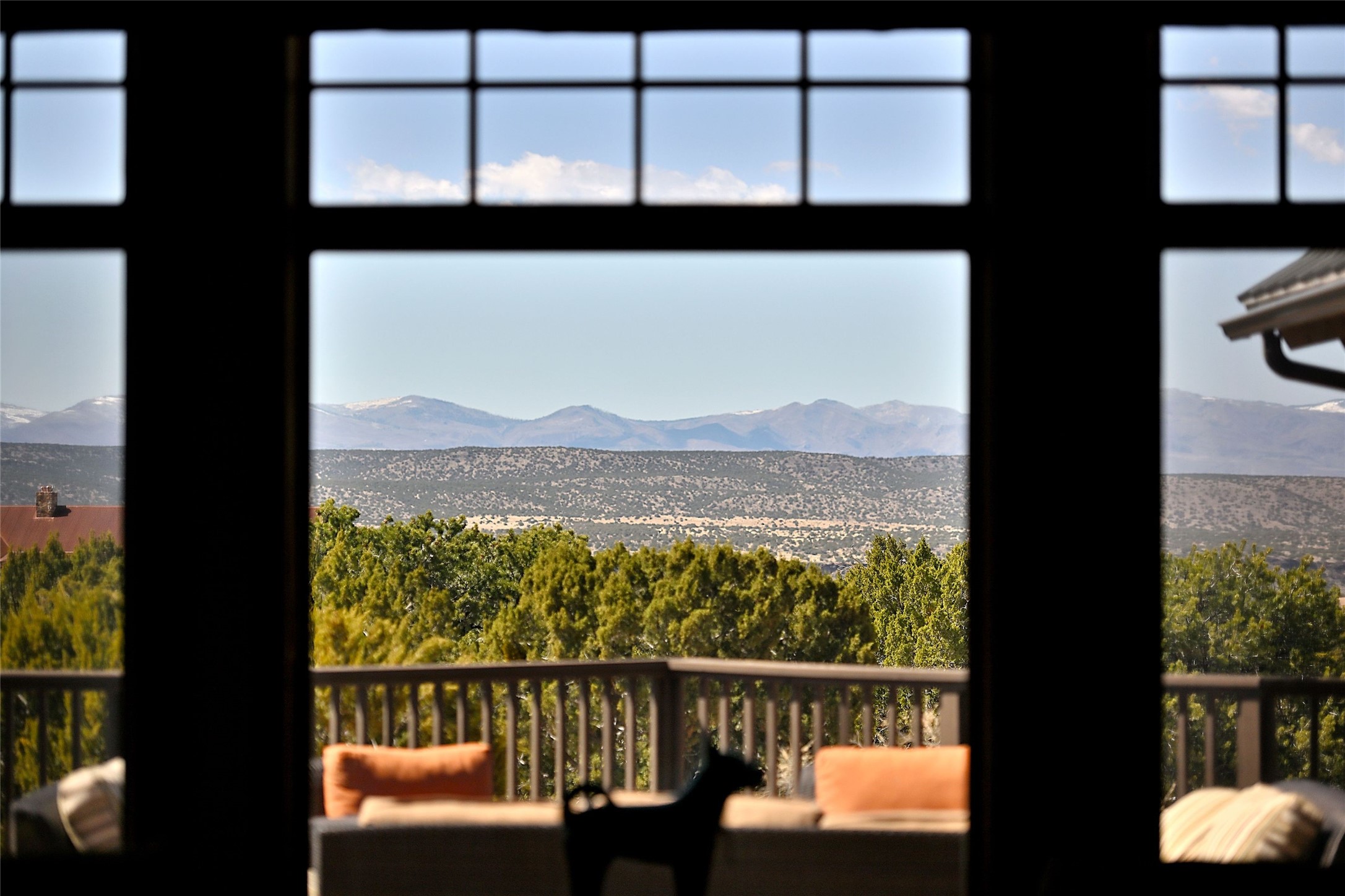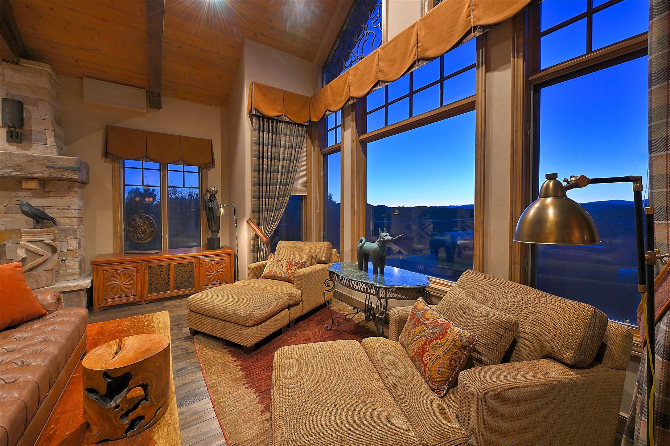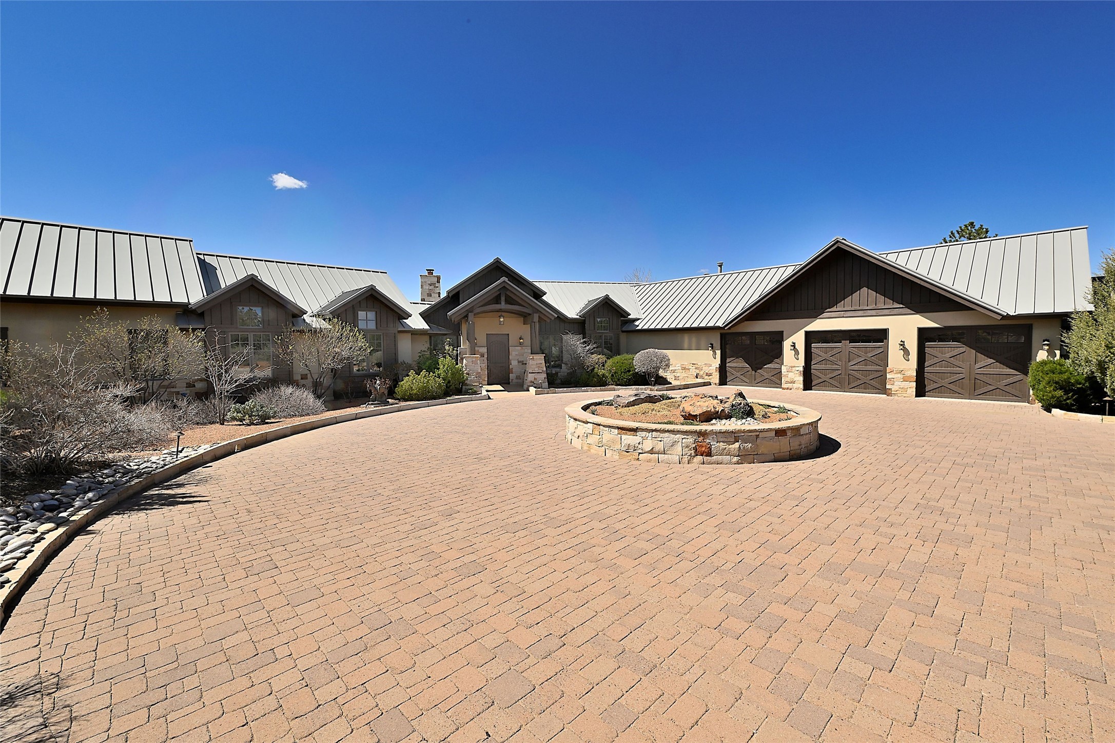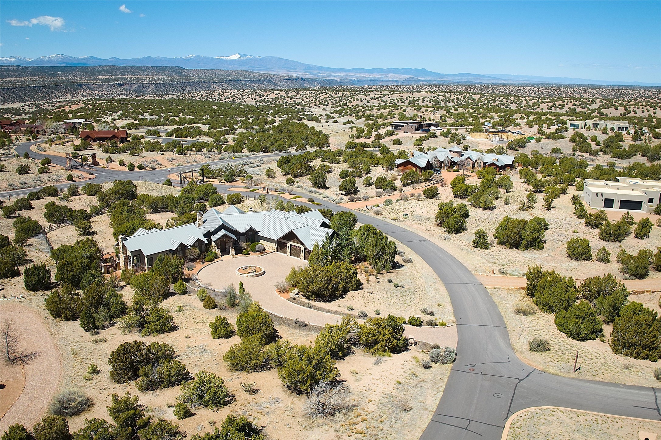 Imagine yourself in this extraordinary 4,080 sq. ft. Northern New Mexico style home by award winning Roger Hunter Builders, nestled in the prestigious gated Estancia enclave of Las Campanas. Perfectly positioned on a premier homesite, this residence captures sweeping views of the Jemez Mountains and overlooks 69,000 acres of undisturbed BLM land for ultimate serenity and privacy. Inside, grand interior trusses and expansive wood floors frame a spacious great room, seamlessly connected to a gourmet kitchen and adjacent butler's pantry--ideal for entertaining. The vast, covered Portal offers generous dining and lounging spaces with panoramic views. The private primary suite features a cozy sitting area with a rock-faced fireplace, his and hers vanities and walk-in closets, and dual offices--each spacious enough for a desk, lounge chair, and ottoman. A separate guest wing offers two guest bedrooms with en-suite baths and walk-in closets. One suite is used as a state-of-the-art media room. A convenient workstation with custom-built cabinetry offers additional office space that could be used by guests or an additional office. thoughtfully designed home blends traditional Santa Fe style with modern luxury--wood, stucco, and rock exteriors, mature landscaping, and an oversized 3-car garage with ample storage. A rare opportunity to own a one-of-a-kind property in Santa Fe's most sought-after community.