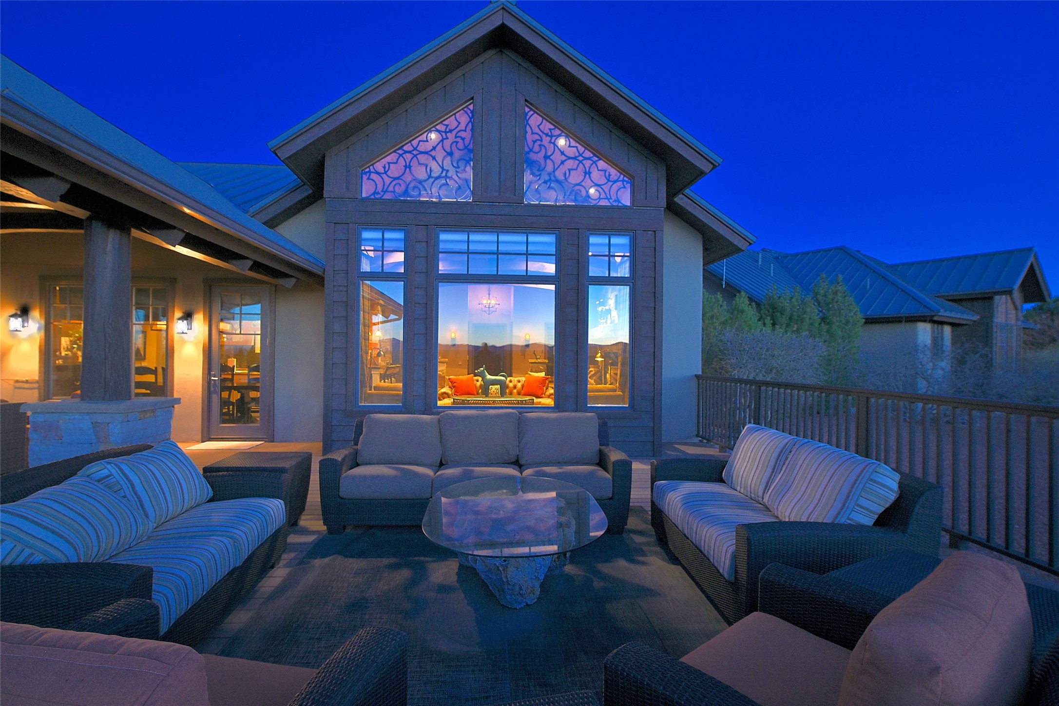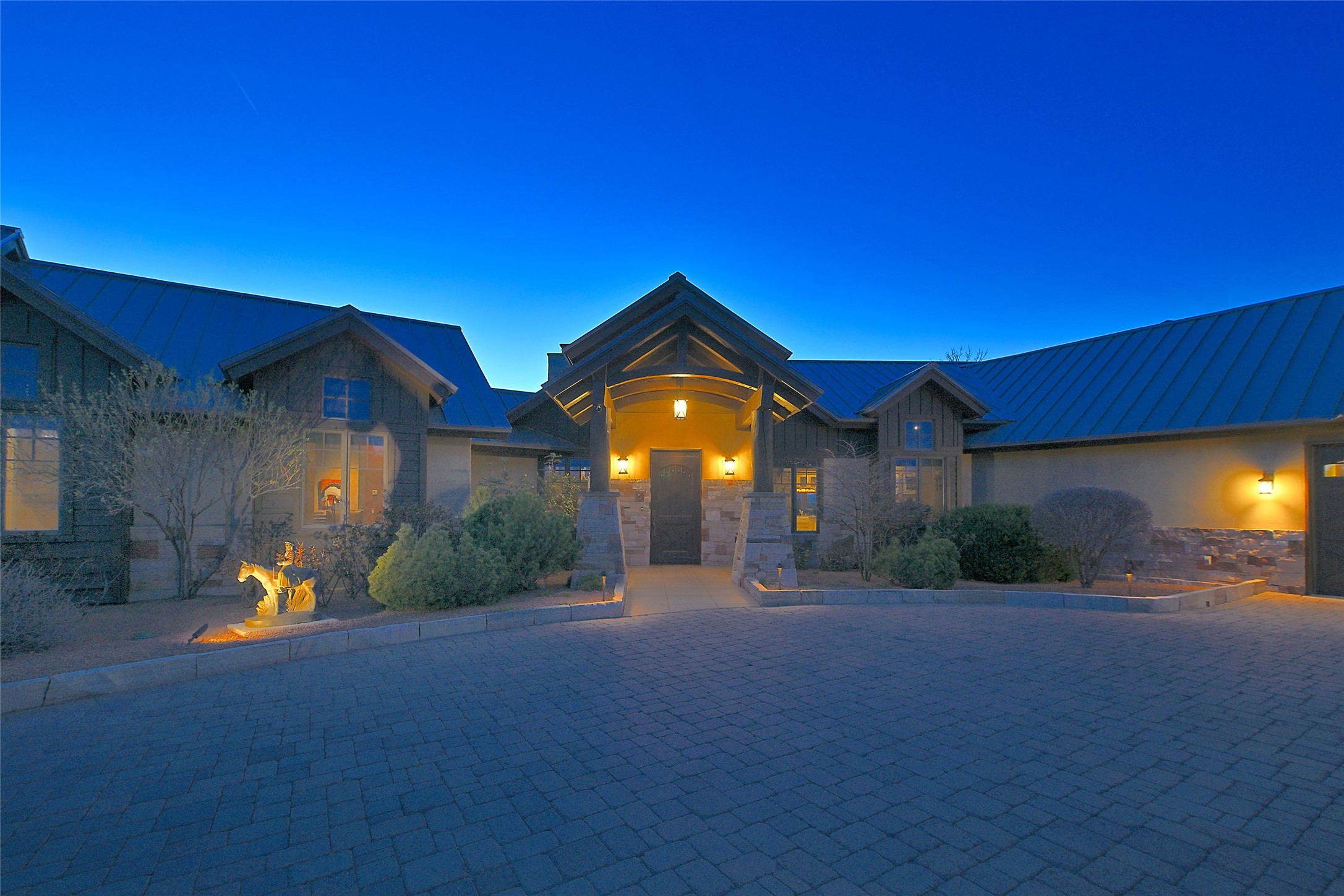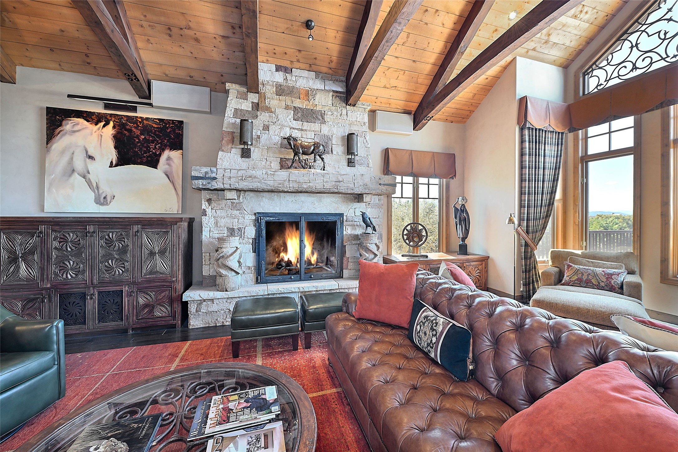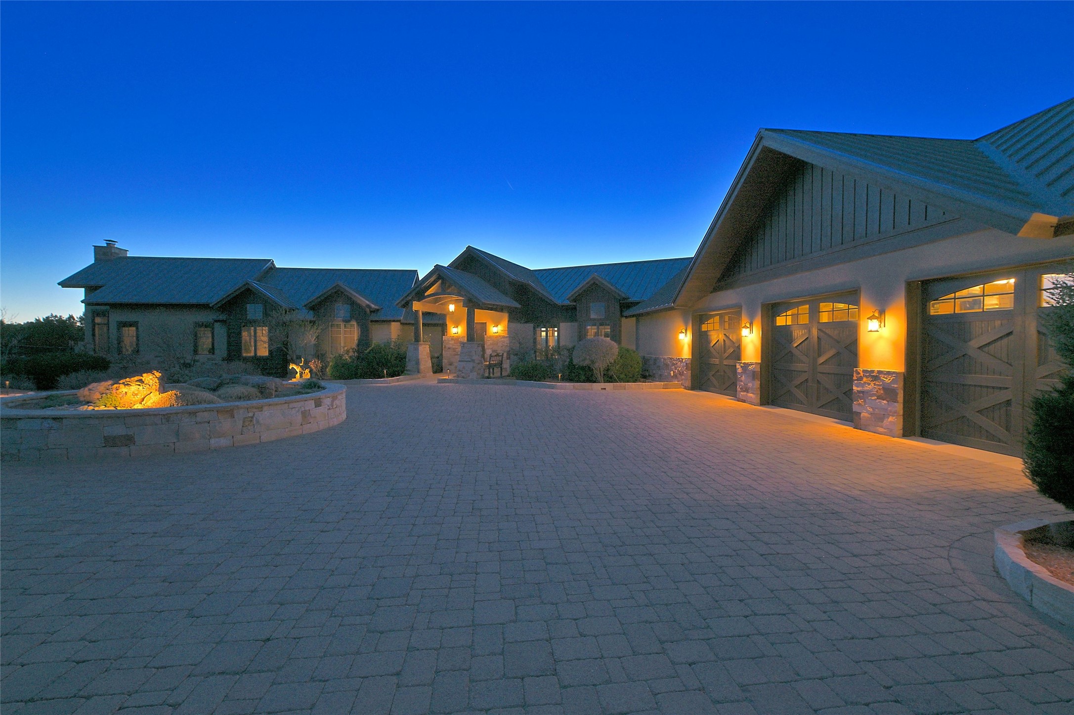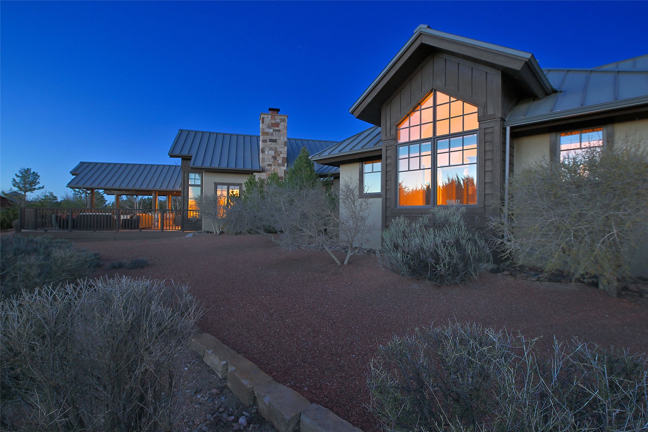 Imagine yourself in this extraordinary 4,080 sq. ft. Northern New Mexico style home by award winning Roger Hunter Builders, nestled in the prestigious gated Estancia enclave of Las Campanas. Perfectly positioned on a premier homesite, this residence captures sweeping views of the Jemez Mountains and overlooks 69,000 acres of undisturbed BLM land for ultimate serenity and privacy. Inside, grand interior trusses and expansive wood floors frame a spacious great room, seamlessly connected to a gourmet kitchen and adjacent butler's pantry--ideal for entertaining. The vast, covered Portal offers generous dining and lounging spaces with panoramic views. The private primary suite features a cozy sitting area with a rock-faced fireplace, his and hers vanities and walk-in closets, and dual offices--each spacious enough for a desk, lounge chair, and ottoman. A separate guest wing offers two guest bedrooms with en-suite baths and walk-in closets. One suite is used as a state-of-the-art media room. A convenient workstation with custom-built cabinetry offers additional office space that could be used by guests or an additional office. thoughtfully designed home blends traditional Santa Fe style with modern luxury--wood, stucco, and rock exteriors, mature landscaping, and an oversized 3-car garage with ample storage. A rare opportunity to own a one-of-a-kind property in Santa Fe's most sought-after community.