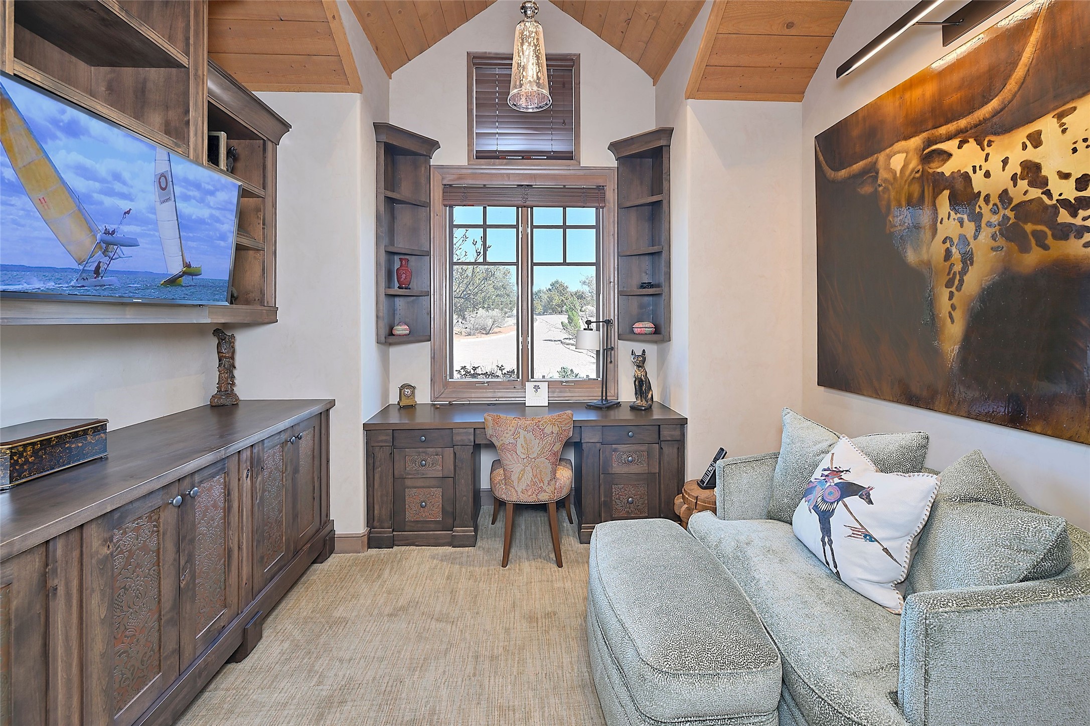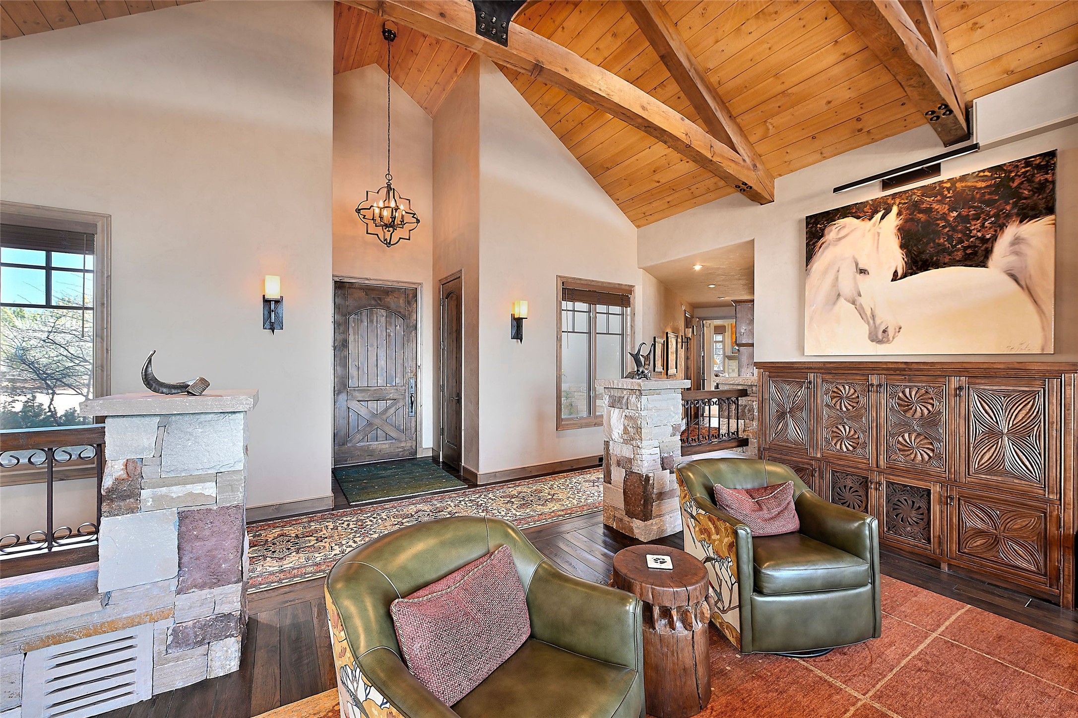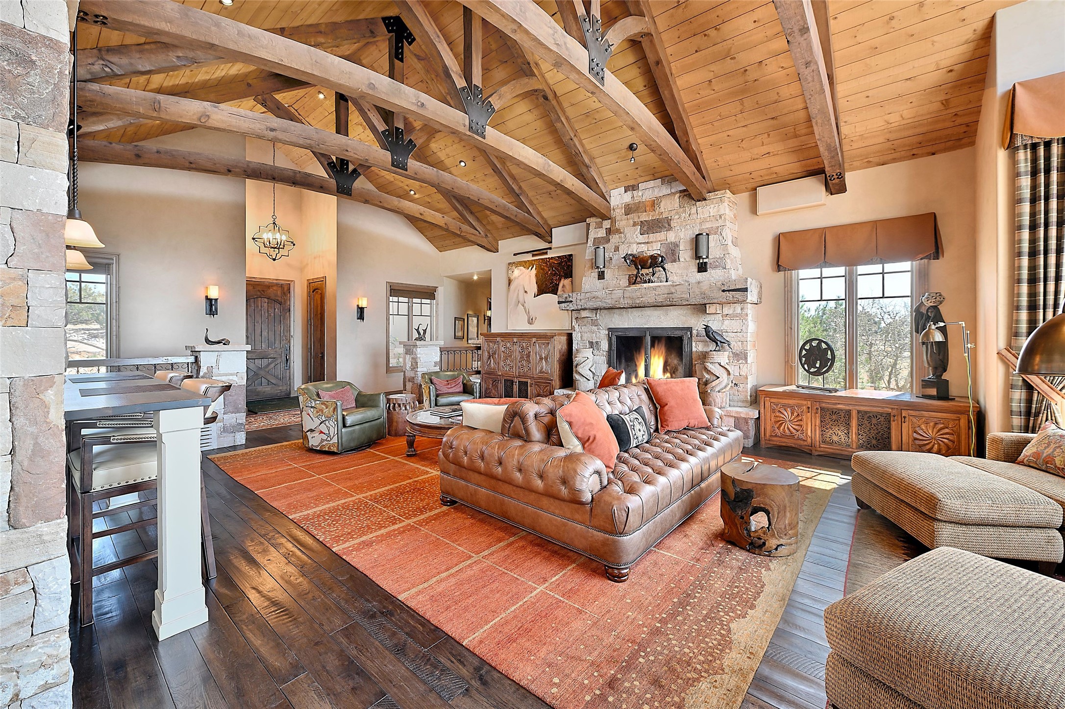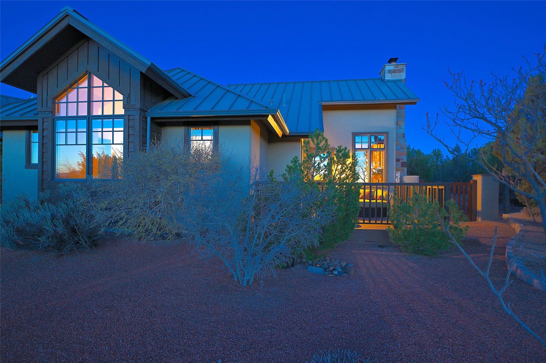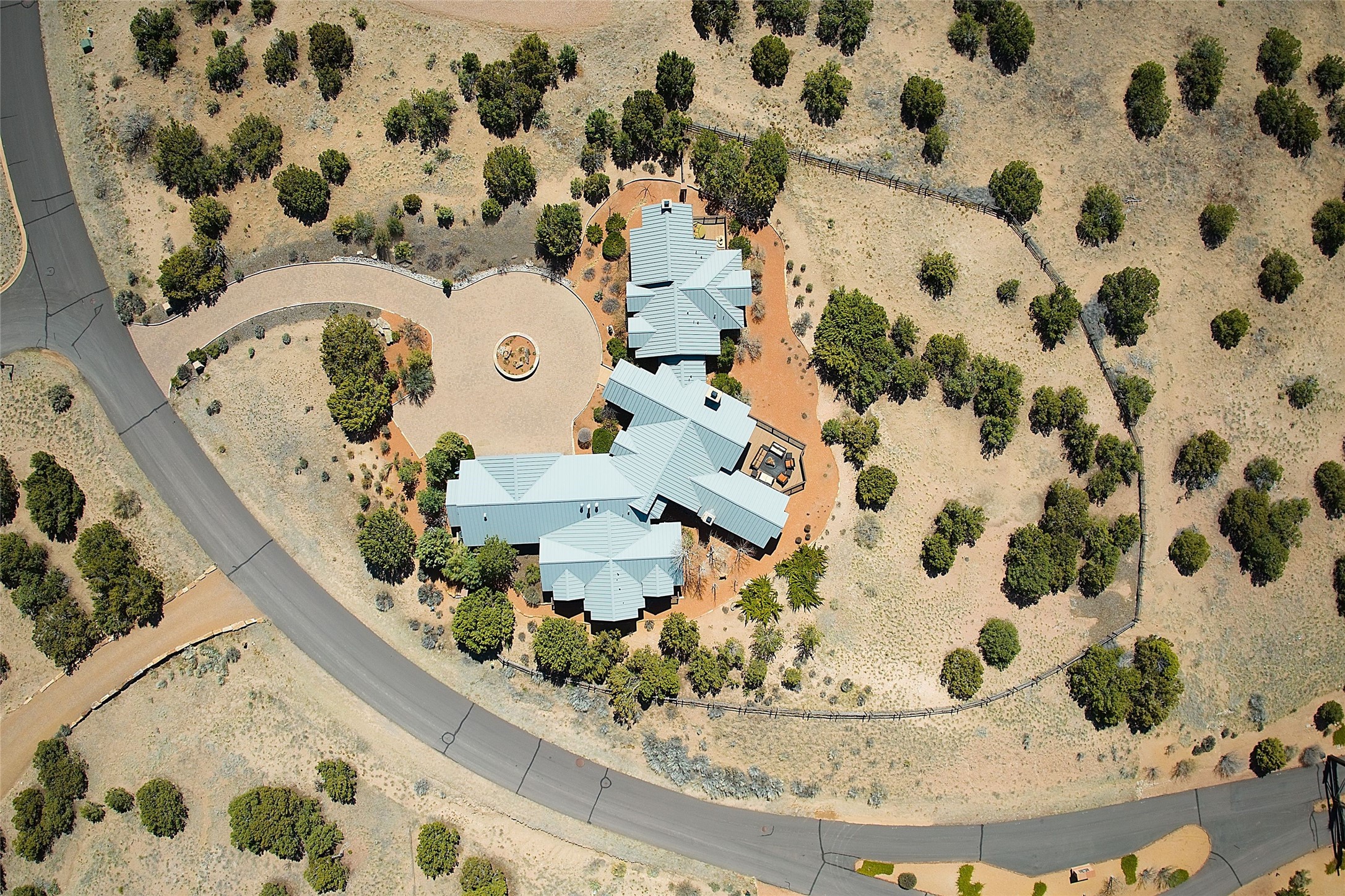 Imagine yourself in this extraordinary 4,080 sq. ft. Northern New Mexico style home by award winning Roger Hunter Builders, nestled in the prestigious gated Estancia enclave of Las Campanas. Perfectly positioned on a premier homesite, this residence captures sweeping views of the Jemez Mountains and overlooks 69,000 acres of undisturbed BLM land for ultimate serenity and privacy. Inside, grand interior trusses and expansive wood floors frame a spacious great room, seamlessly connected to a gourmet kitchen and adjacent butler's pantry--ideal for entertaining. The vast, covered Portal offers generous dining and lounging spaces with panoramic views. The private primary suite features a cozy sitting area with a rock-faced fireplace, his and hers vanities and walk-in closets, and dual offices--each spacious enough for a desk, lounge chair, and ottoman. A separate guest wing offers two guest bedrooms with en-suite baths and walk-in closets. One suite is used as a state-of-the-art media room. A convenient workstation with custom-built cabinetry offers additional office space that could be used by guests or an additional office. thoughtfully designed home blends traditional Santa Fe style with modern luxury--wood, stucco, and rock exteriors, mature landscaping, and an oversized 3-car garage with ample storage. A rare opportunity to own a one-of-a-kind property in Santa Fe's most sought-after community.