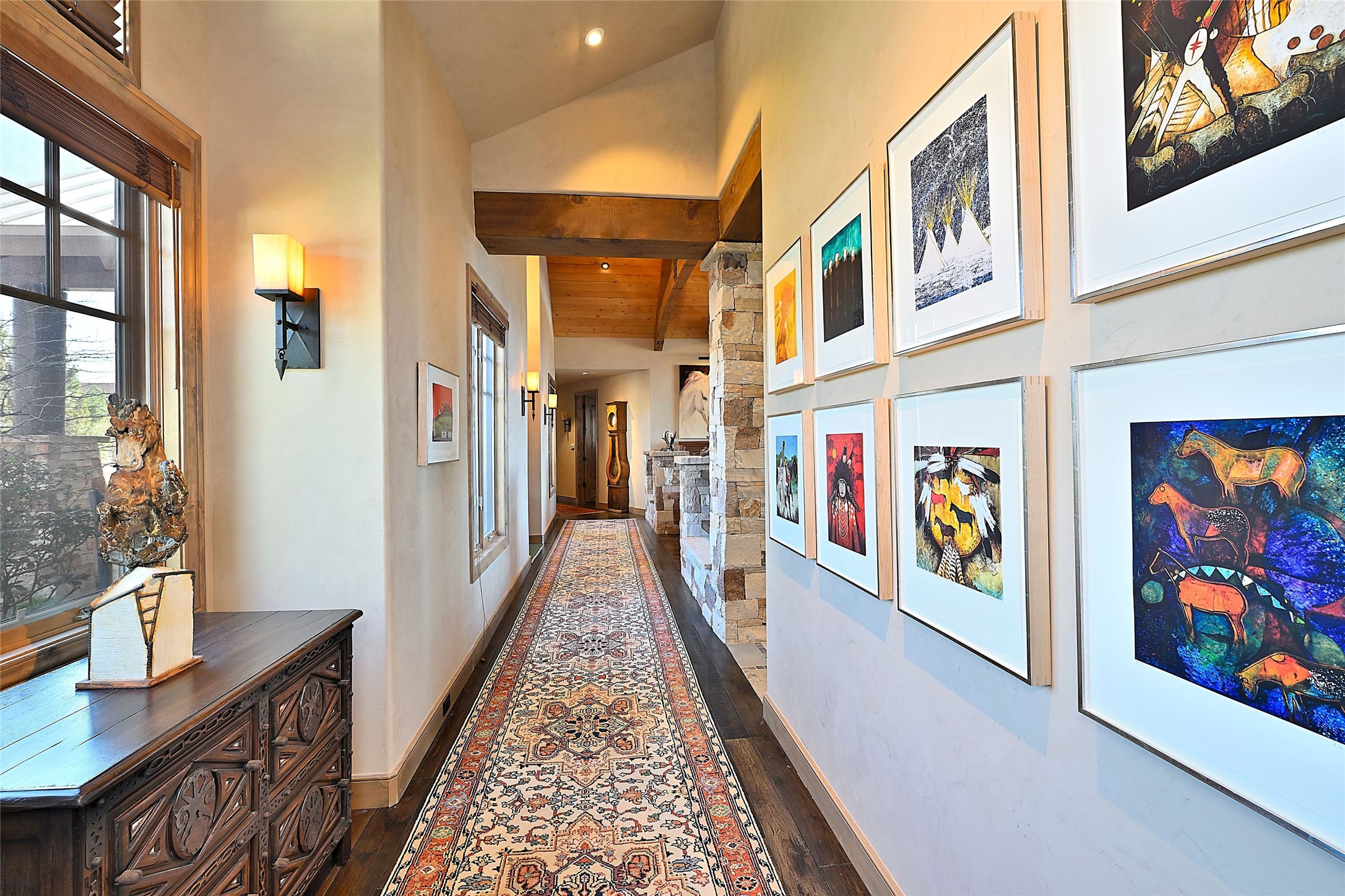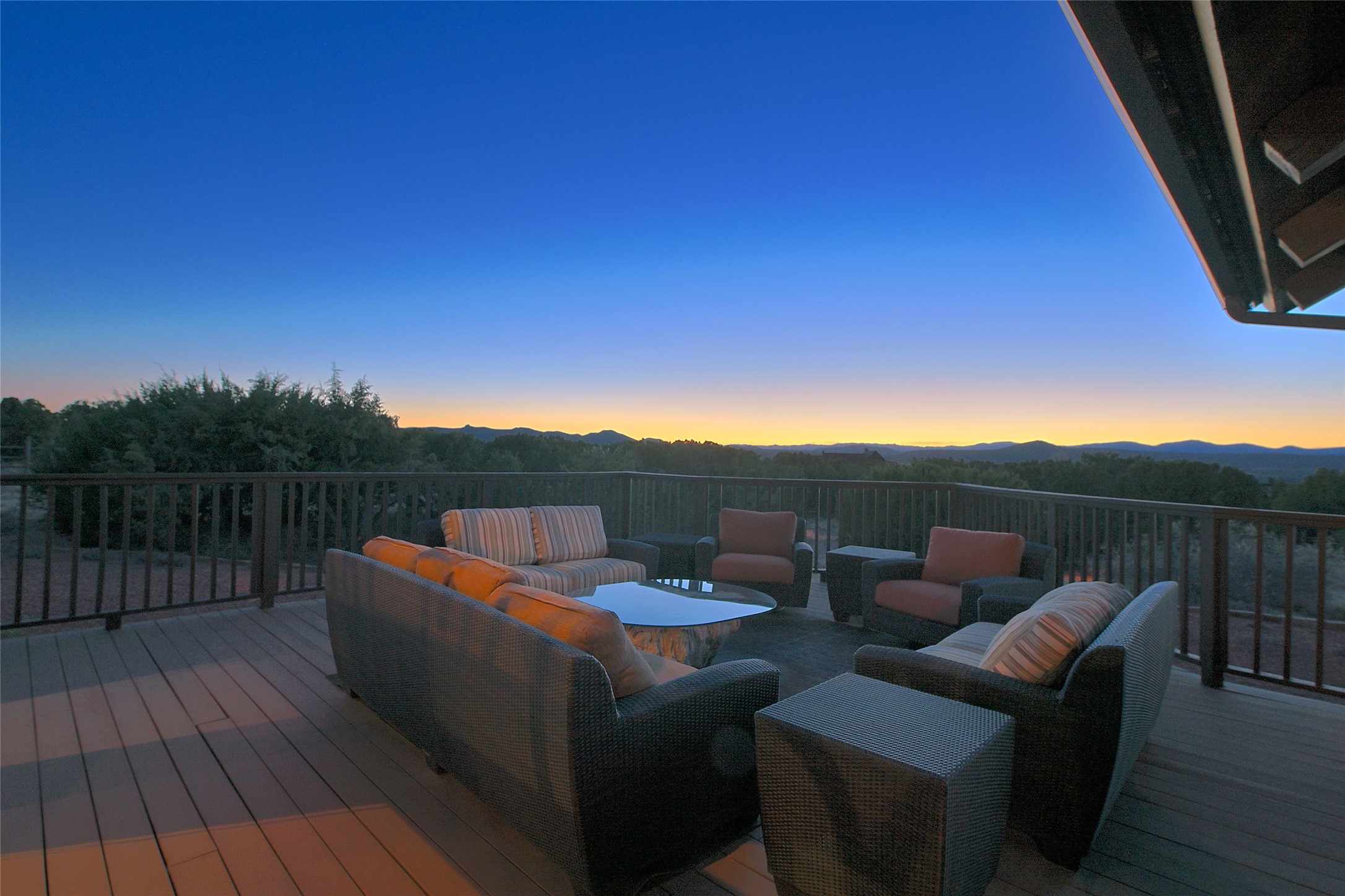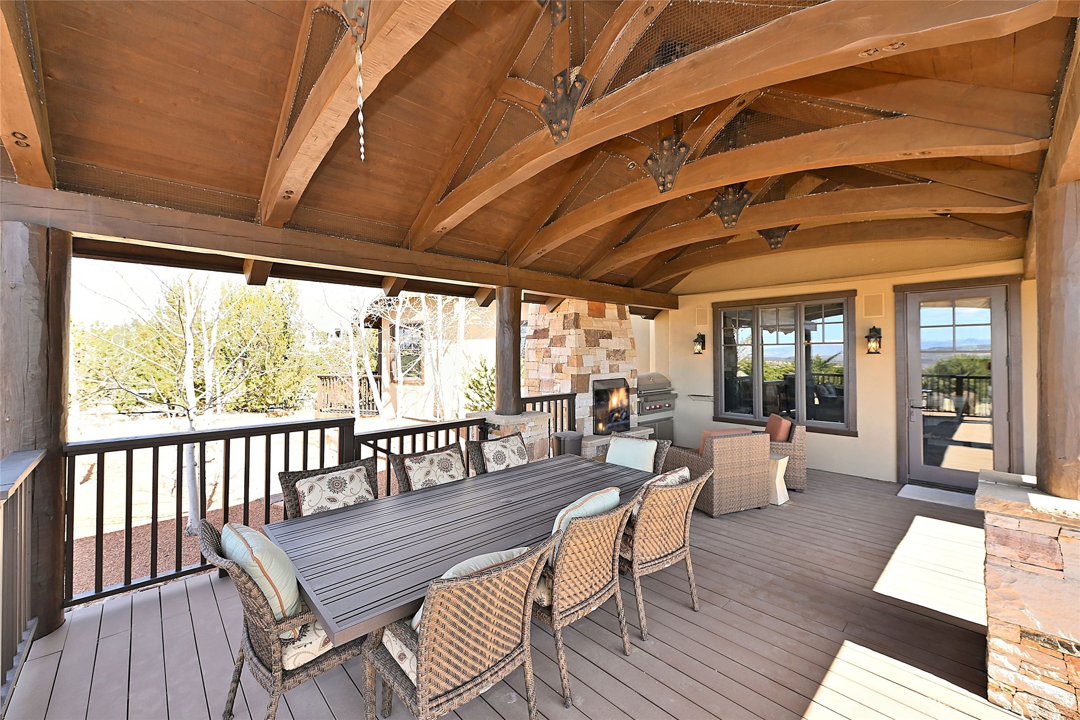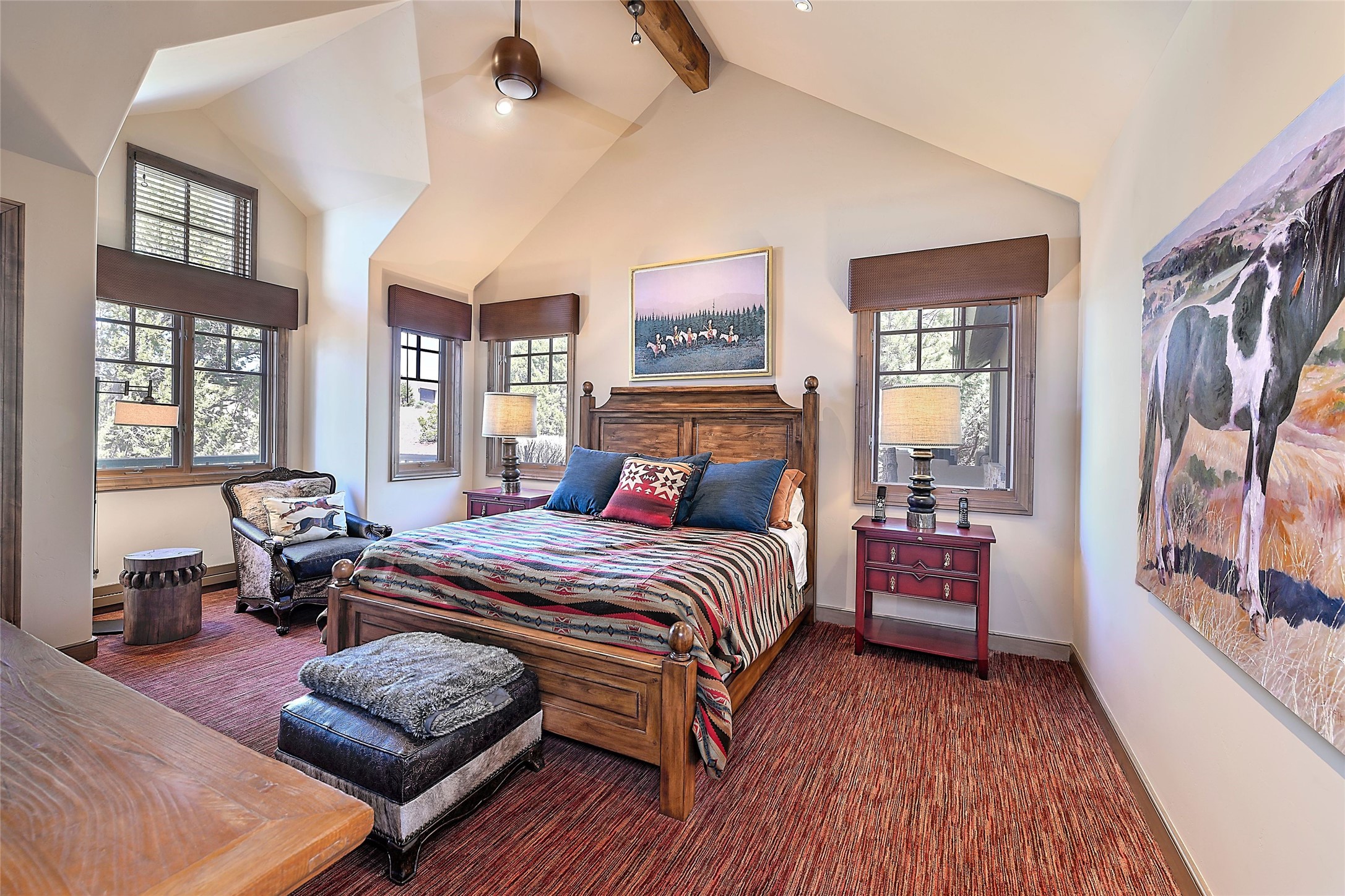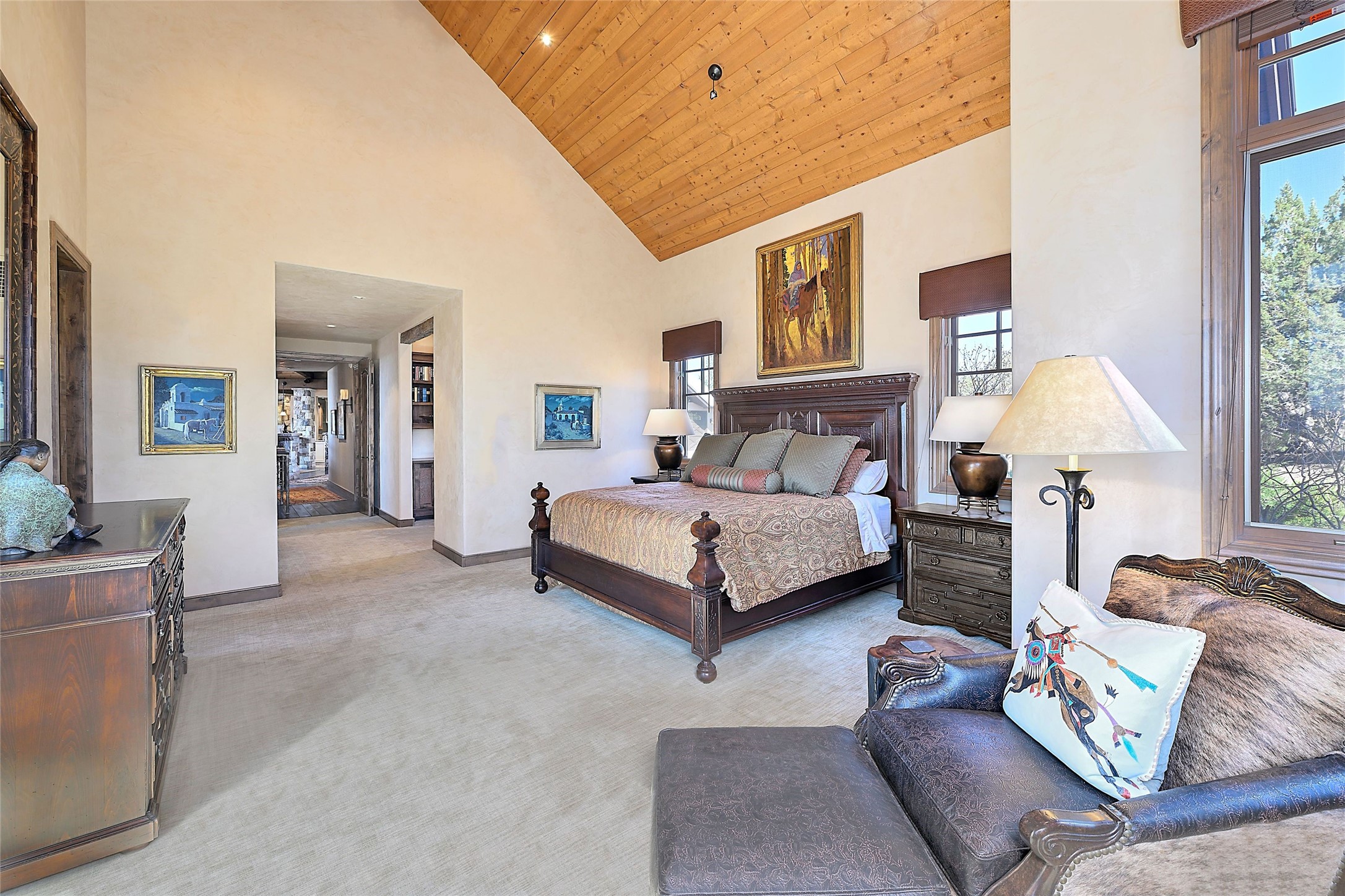 Imagine yourself in this extraordinary 4,080 sq. ft. Northern New Mexico style home by award winning Roger Hunter Builders, nestled in the prestigious gated Estancia enclave of Las Campanas. Perfectly positioned on a premier homesite, this residence captures sweeping views of the Jemez Mountains and overlooks 69,000 acres of undisturbed BLM land for ultimate serenity and privacy. Inside, grand interior trusses and expansive wood floors frame a spacious great room, seamlessly connected to a gourmet kitchen and adjacent butler's pantry--ideal for entertaining. The vast, covered Portal offers generous dining and lounging spaces with panoramic views. The private primary suite features a cozy sitting area with a rock-faced fireplace, his and hers vanities and walk-in closets, and dual offices--each spacious enough for a desk, lounge chair, and ottoman. A separate guest wing offers two guest bedrooms with en-suite baths and walk-in closets. One suite is used as a state-of-the-art media room. A convenient workstation with custom-built cabinetry offers additional office space that could be used by guests or an additional office. thoughtfully designed home blends traditional Santa Fe style with modern luxury--wood, stucco, and rock exteriors, mature landscaping, and an oversized 3-car garage with ample storage. A rare opportunity to own a one-of-a-kind property in Santa Fe's most sought-after community.