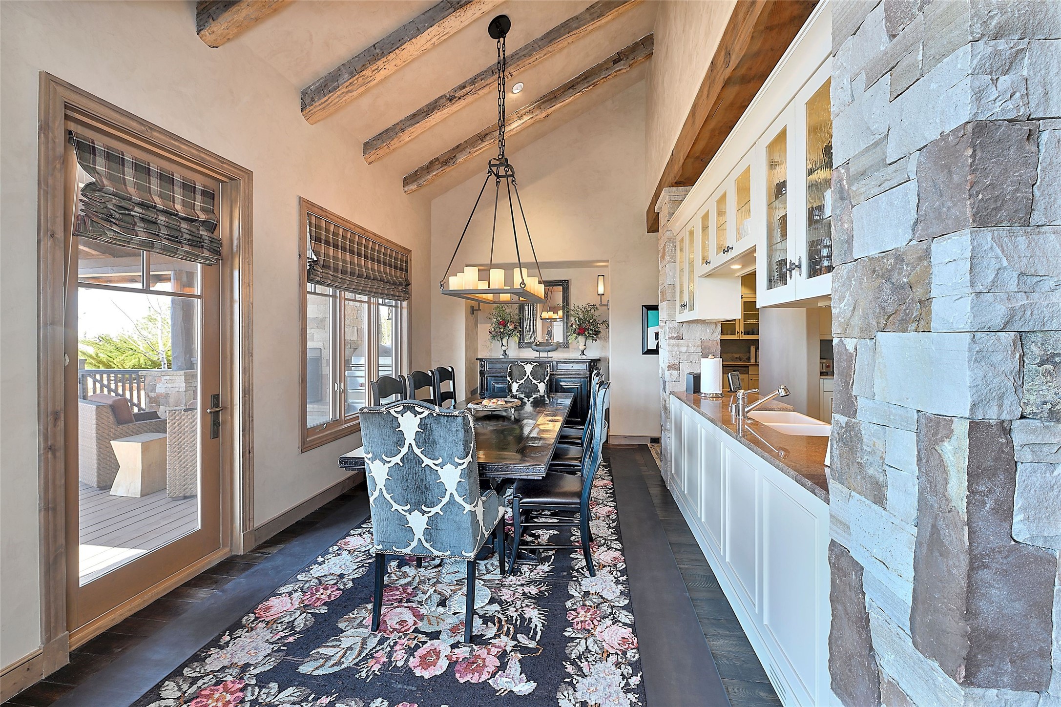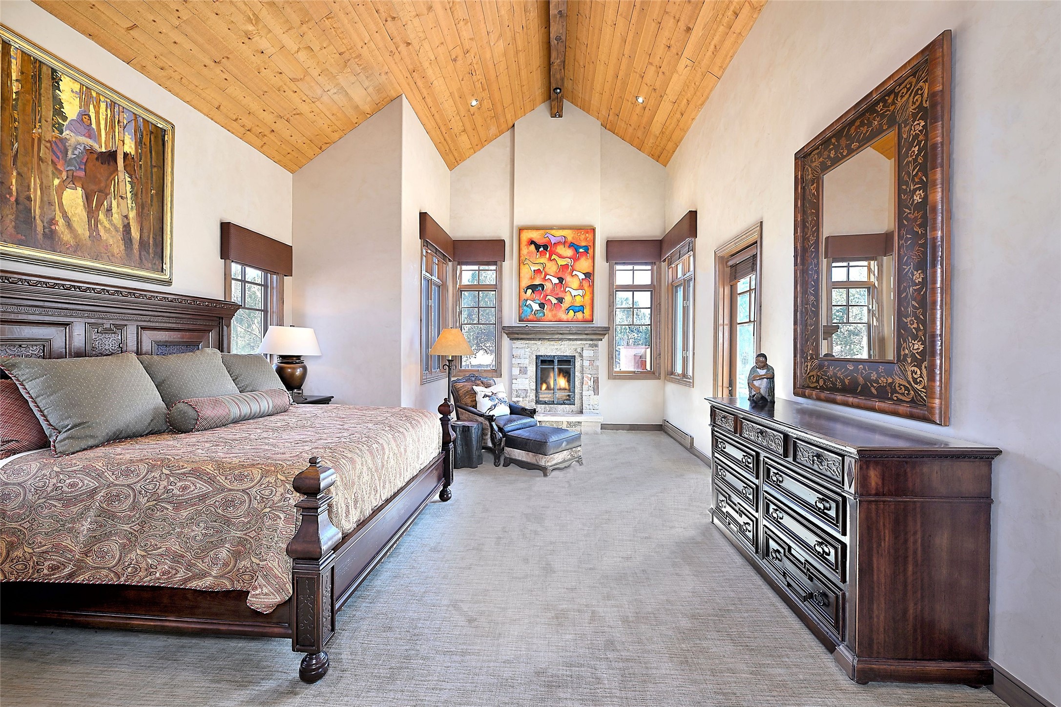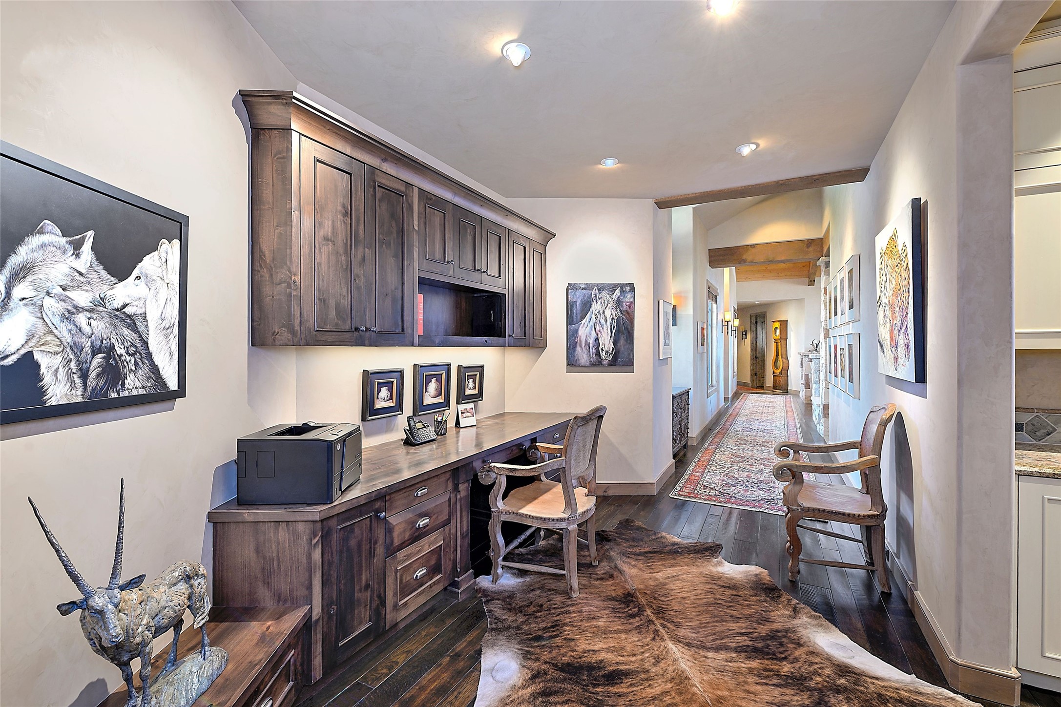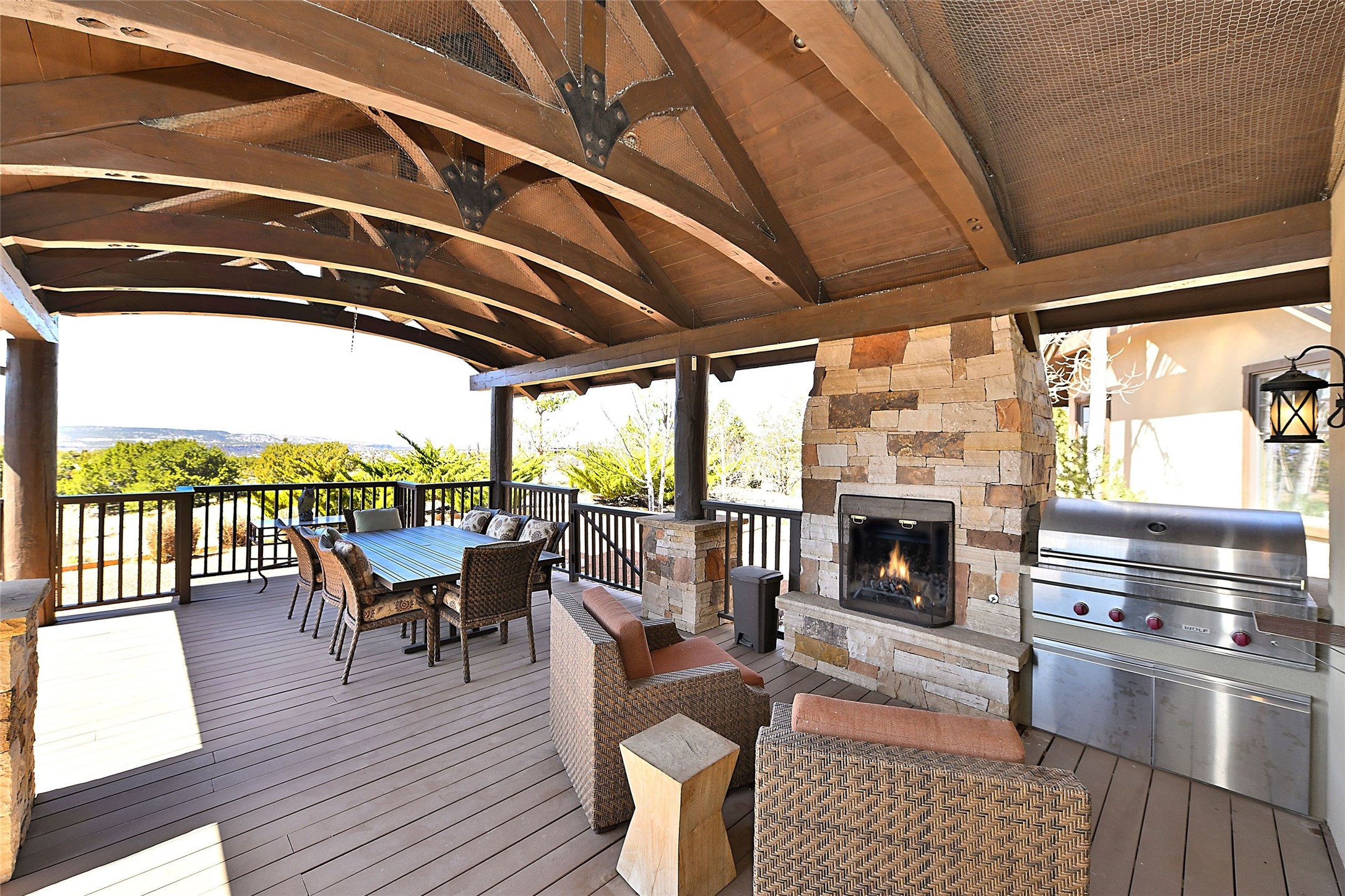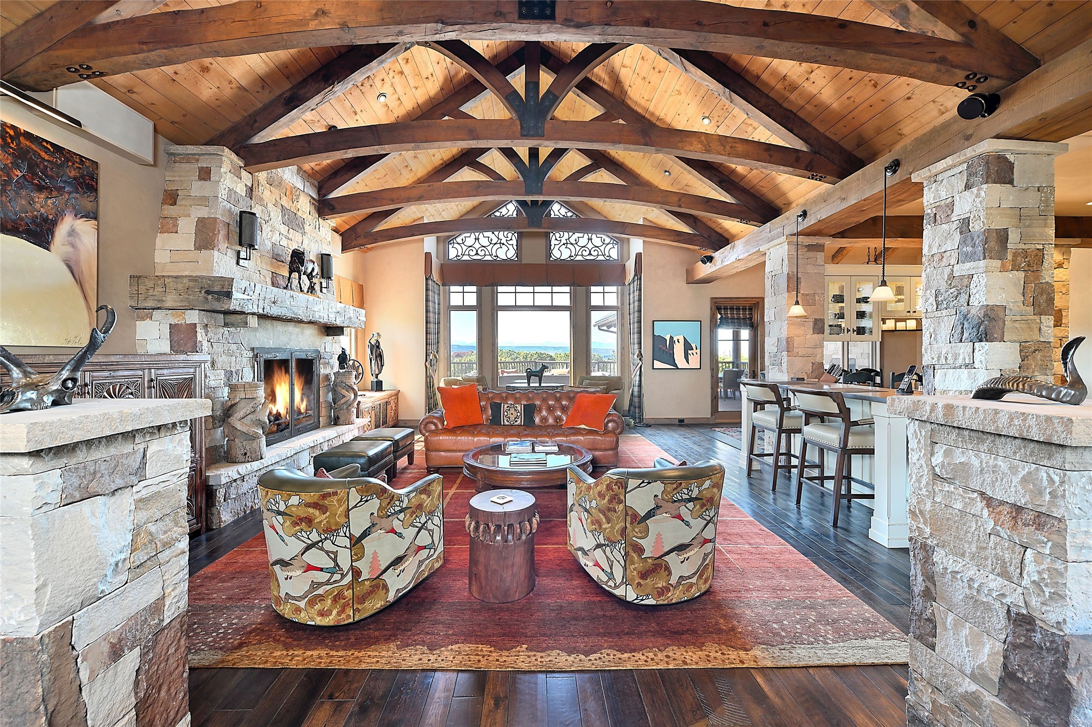 Imagine yourself in this extraordinary 4,080 sq. ft. Northern New Mexico style home by award winning Roger Hunter Builders, nestled in the prestigious gated Estancia enclave of Las Campanas. Perfectly positioned on a premier homesite, this residence captures sweeping views of the Jemez Mountains and overlooks 69,000 acres of undisturbed BLM land for ultimate serenity and privacy. Inside, grand interior trusses and expansive wood floors frame a spacious great room, seamlessly connected to a gourmet kitchen and adjacent butler's pantry--ideal for entertaining. The vast, covered Portal offers generous dining and lounging spaces with panoramic views. The private primary suite features a cozy sitting area with a rock-faced fireplace, his and hers vanities and walk-in closets, and dual offices--each spacious enough for a desk, lounge chair, and ottoman. A separate guest wing offers two guest bedrooms with en-suite baths and walk-in closets. One suite is used as a state-of-the-art media room. A convenient workstation with custom-built cabinetry offers additional office space that could be used by guests or an additional office. thoughtfully designed home blends traditional Santa Fe style with modern luxury--wood, stucco, and rock exteriors, mature landscaping, and an oversized 3-car garage with ample storage. A rare opportunity to own a one-of-a-kind property in Santa Fe's most sought-after community.