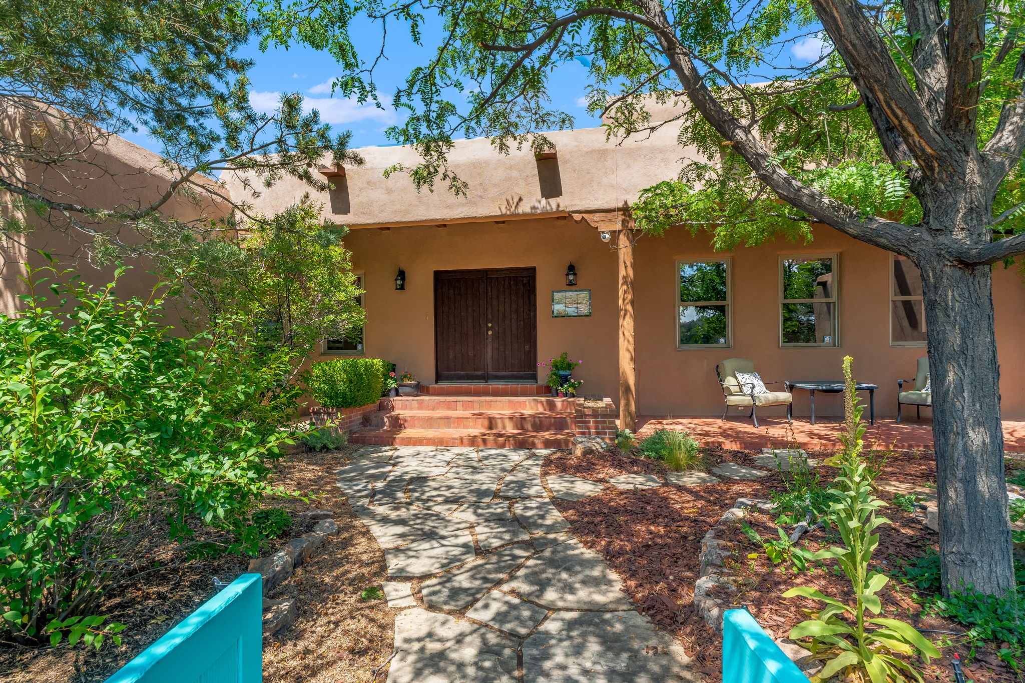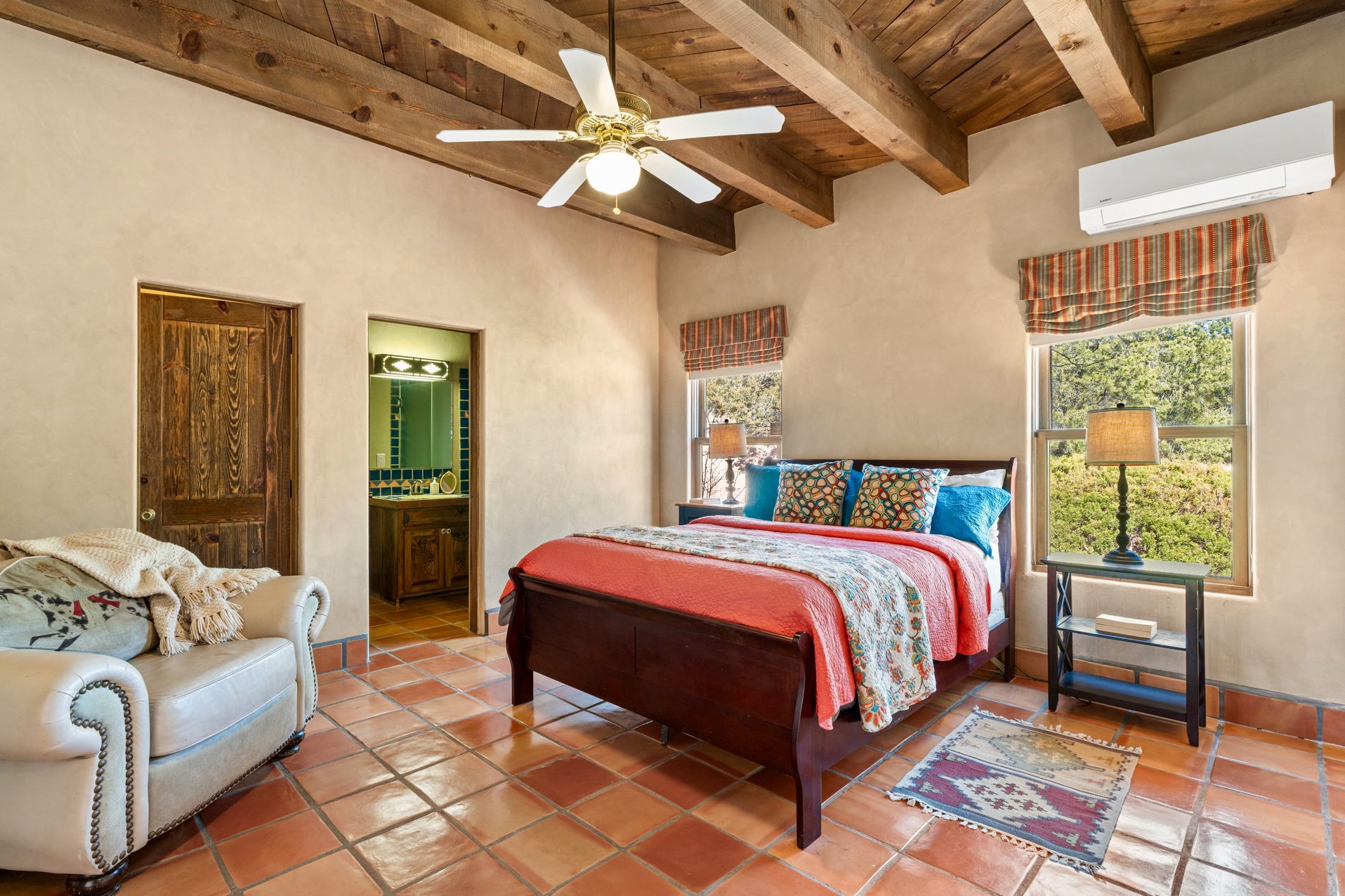 Experience timeless Southwest style in this exceptional La Mariposa home. Natural light highlights beamed ceilings, Saltillo tile, custom wood doors and hand-plastered walls. The spacious living room with a wood-burning fireplace flows seamlessly to multiple outdoor patios--perfect for entertaining or relaxing. The kitchen offers generous storage and a large walk-in pantry. A luxurious primary suite features a spa-like bath with dual sinks, soaking tub, and glass shower. A guest suite with en suite bath, plus an office with fireplace offers flexible living. Just 15 minutes to downtown Santa Fe's shopping, dining, and cultural attractions.