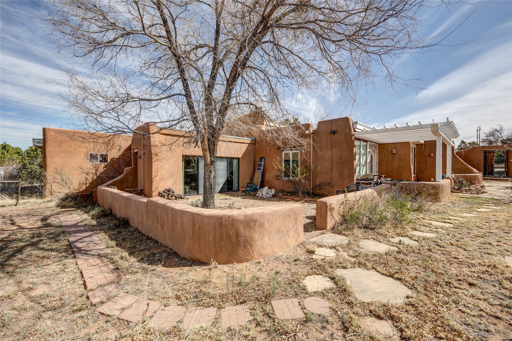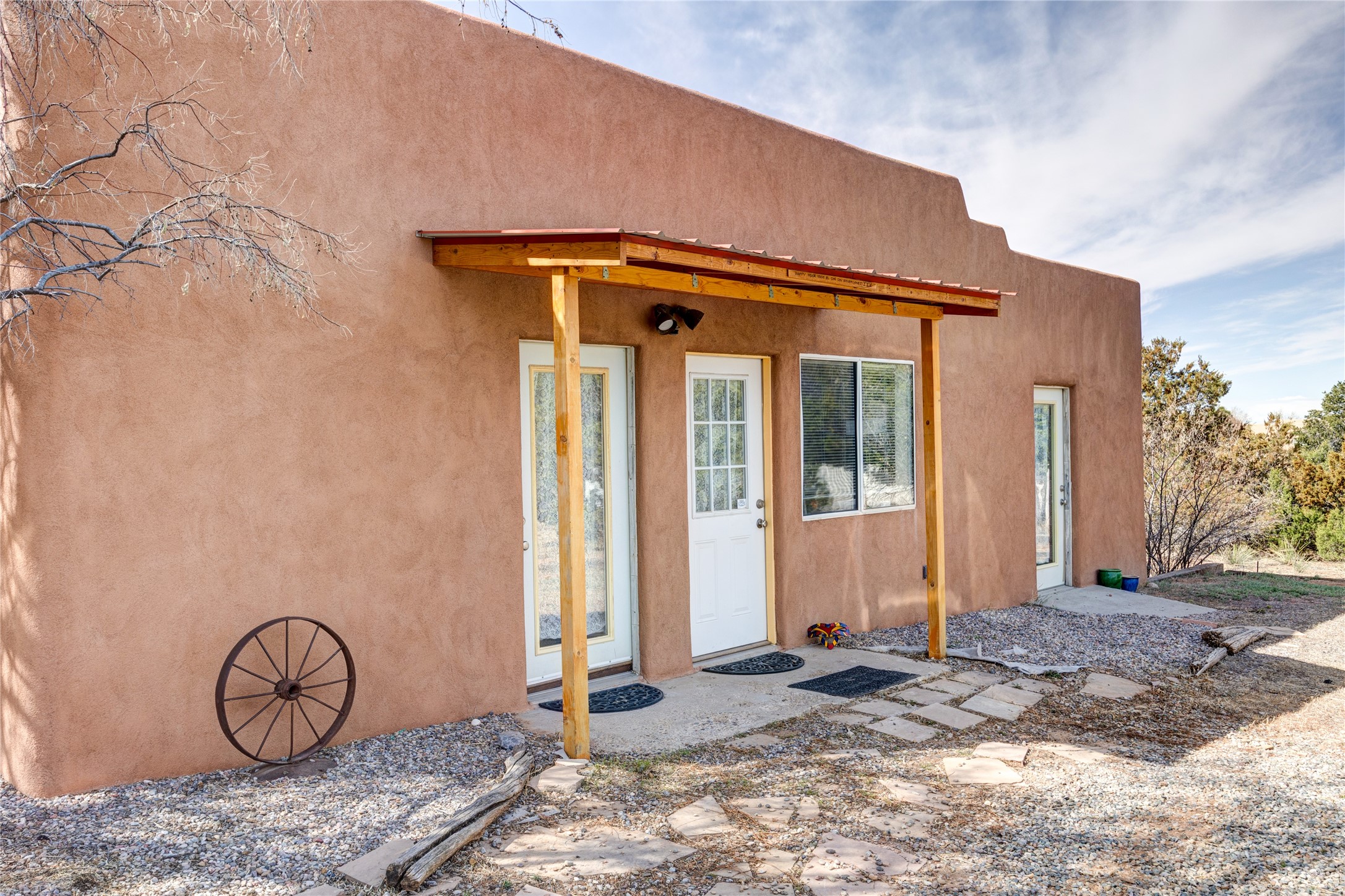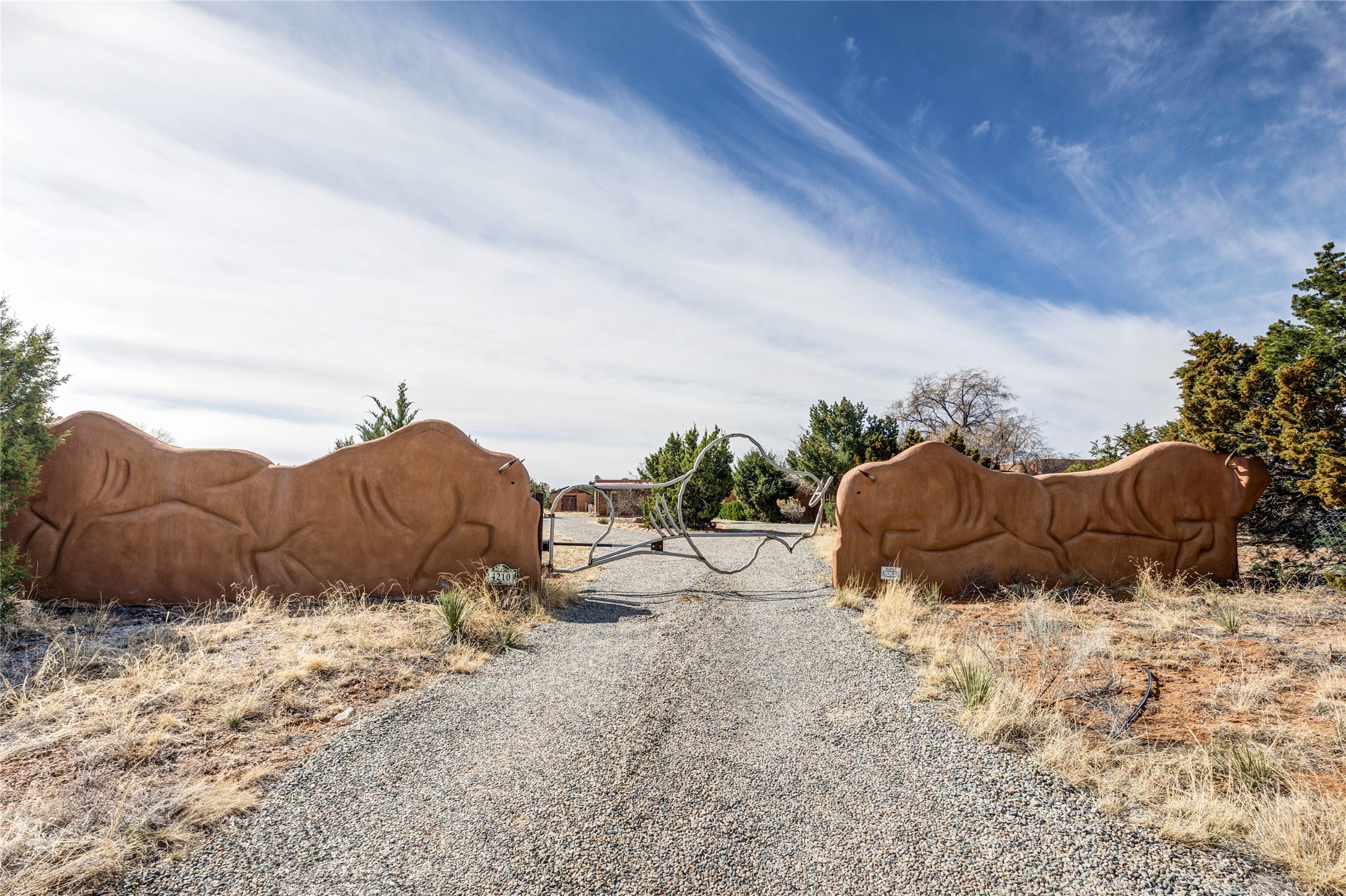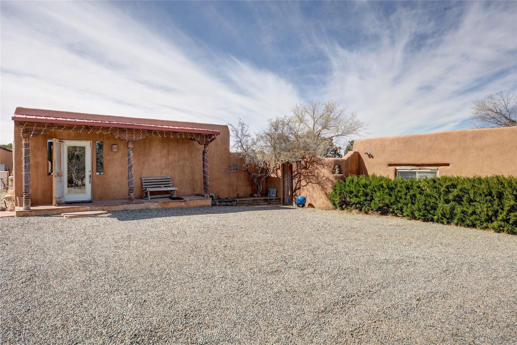 A very cool opportunity is knocking! Convenient in-town location for an adobemain home, plus a detached, spacious Guest House, plus an attached set of(unheated) studio spaces, currently used for music production, plus a detachedoutbuilding, all sited on a 1.8 acre lot! The magic begins as you enter the propertythrough a set of stylized stucco buffalo gates, built by local sculptor, Don Redman; the buffalo theme is repeated in theGuest House's entry. The main home, which has passive solar design, exudes warmth & quintessential Southwestcharm, with brick flooring, a beautifully designed kiva fireplace, high woodaccented ceilings and a Sunroom built by Tent Rock Construction.. An open floor plan and large dining room suggest wonderful times with friends and/or family!! Its two nicely sized bedrooms each featuredoors leading out to the inviting front patio; the primary bedroom also features akiva fireplace. Settings for outdoor gatherings at the home's entry abound. GuestHouse is currently leased. Property to be sold in as is condition.