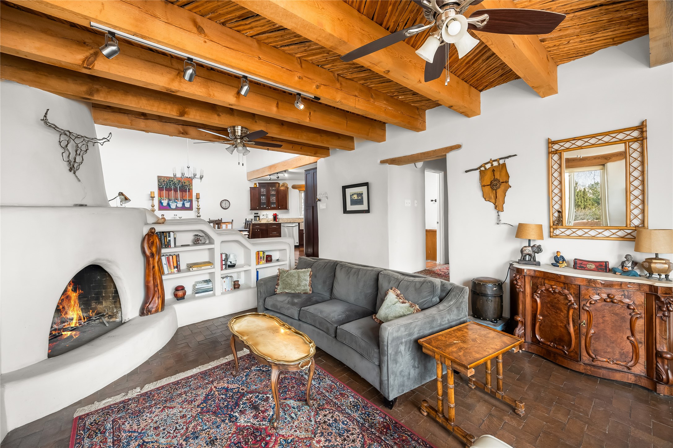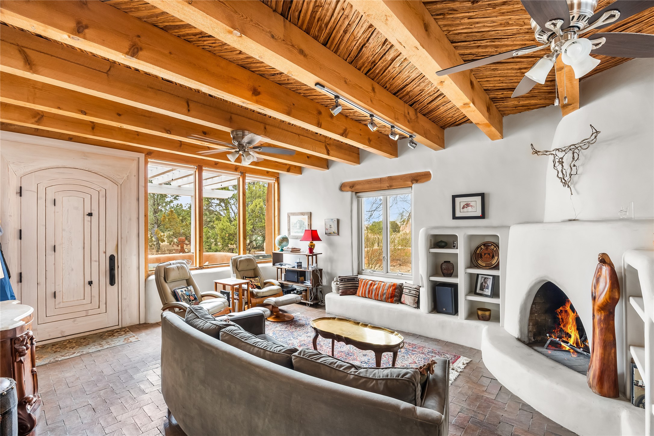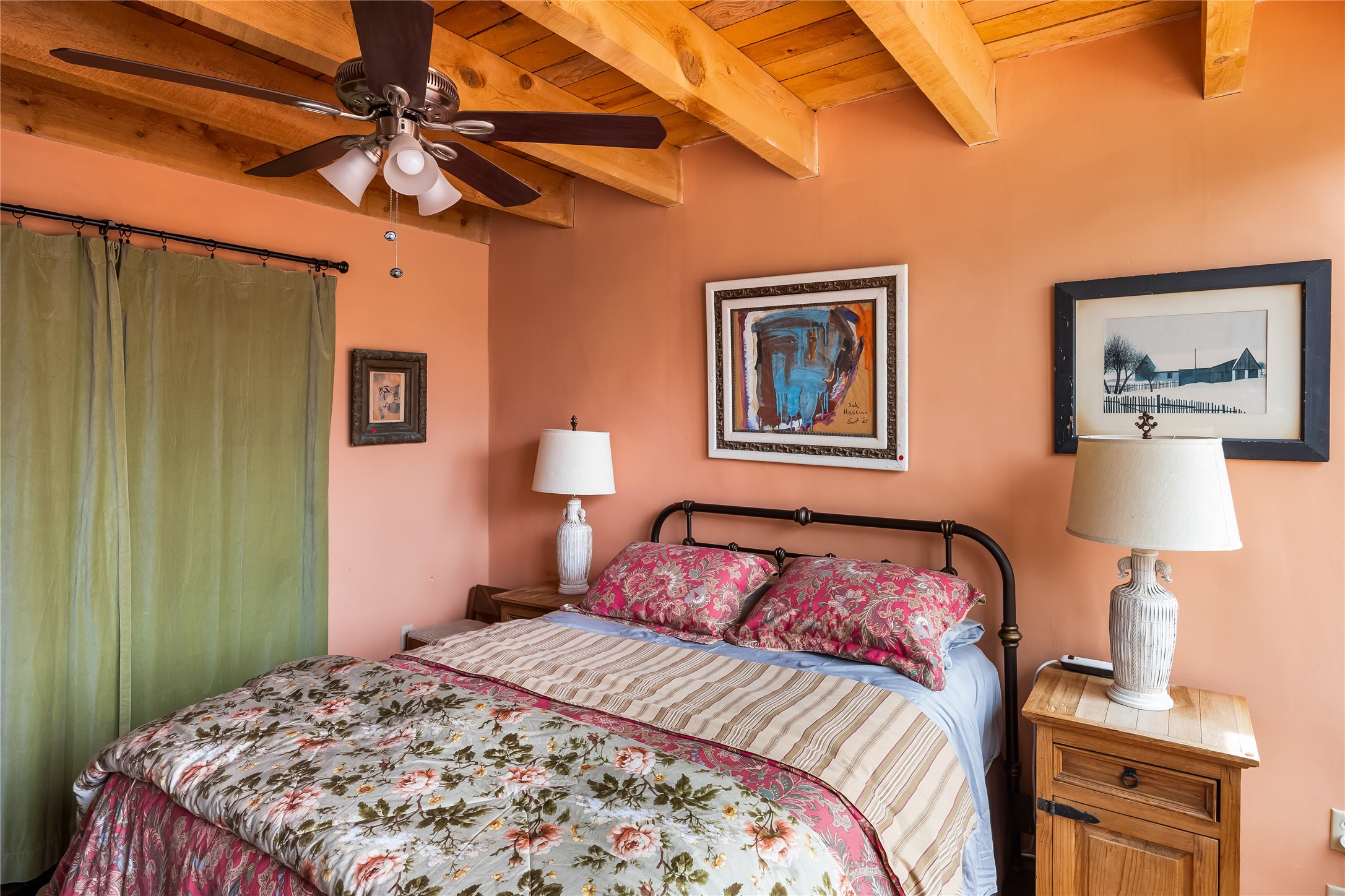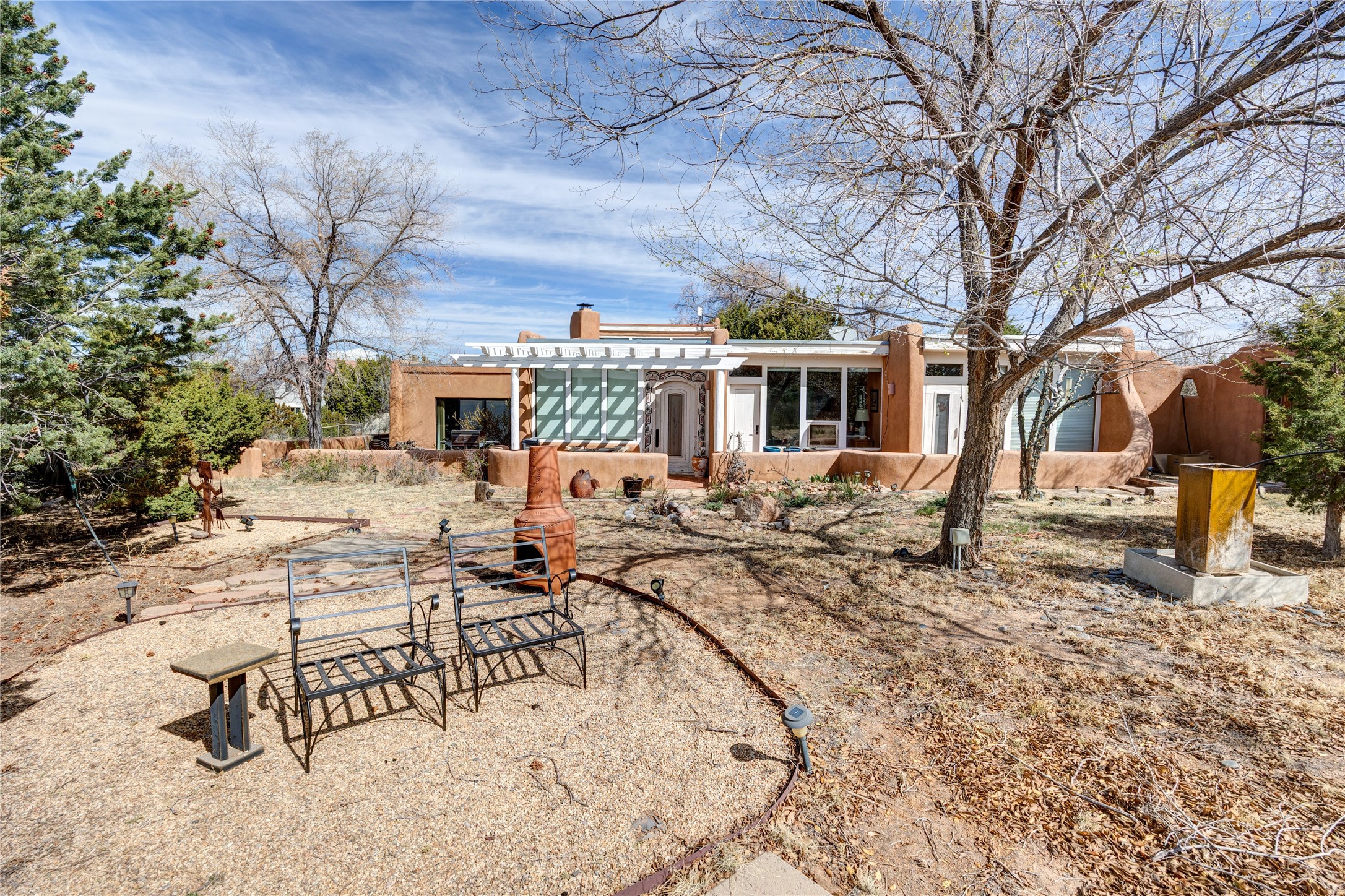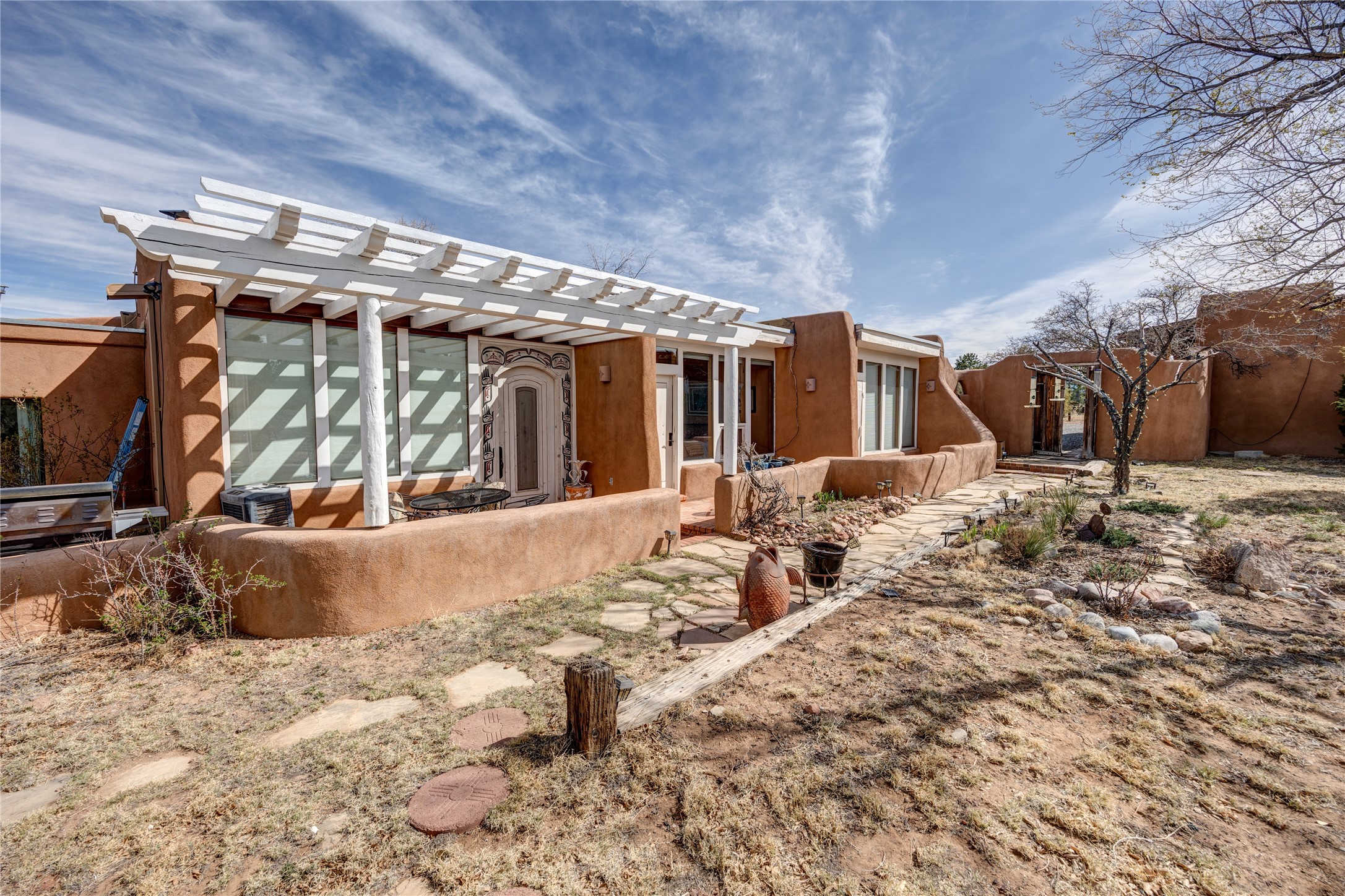 A very cool opportunity is knocking! Convenient in-town location for an adobemain home, plus a detached, spacious Guest House, plus an attached set of(unheated) studio spaces, currently used for music production, plus a detachedoutbuilding, all sited on a 1.8 acre lot! The magic begins as you enter the propertythrough a set of stylized stucco buffalo gates, built by local sculptor, Don Redman; the buffalo theme is repeated in theGuest House's entry. The main home, which has passive solar design, exudes warmth & quintessential Southwestcharm, with brick flooring, a beautifully designed kiva fireplace, high woodaccented ceilings and a Sunroom built by Tent Rock Construction.. An open floor plan and large dining room suggest wonderful times with friends and/or family!! Its two nicely sized bedrooms each featuredoors leading out to the inviting front patio; the primary bedroom also features akiva fireplace. Settings for outdoor gatherings at the home's entry abound. GuestHouse is currently leased. Property to be sold in as is condition.