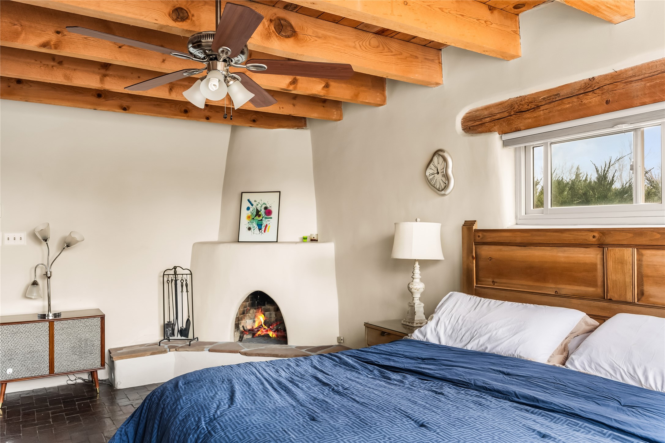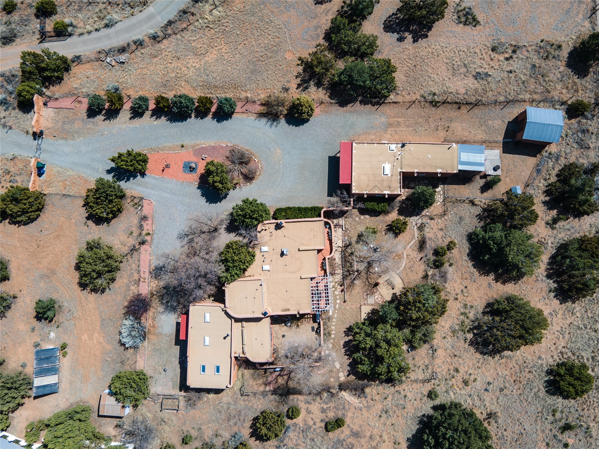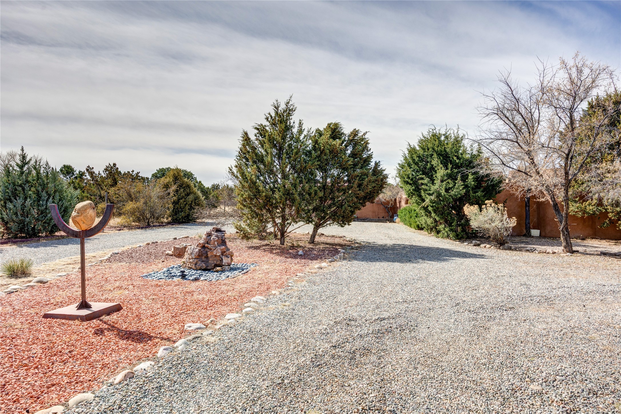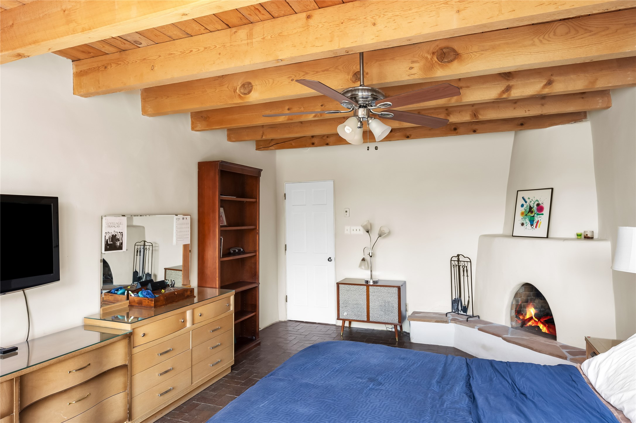 A very cool opportunity is knocking! Convenient in-town location for an adobemain home, plus a detached, spacious Guest House, plus an attached set of(unheated) studio spaces, currently used for music production, plus a detachedoutbuilding, all sited on a 1.8 acre lot! The magic begins as you enter the propertythrough a set of stylized stucco buffalo gates, built by local sculptor, Don Redman; the buffalo theme is repeated in theGuest House's entry. The main home, which has passive solar design, exudes warmth & quintessential Southwestcharm, with brick flooring, a beautifully designed kiva fireplace, high woodaccented ceilings and a Sunroom built by Tent Rock Construction.. An open floor plan and large dining room suggest wonderful times with friends and/or family!! Its two nicely sized bedrooms each featuredoors leading out to the inviting front patio; the primary bedroom also features akiva fireplace. Settings for outdoor gatherings at the home's entry abound. GuestHouse is currently leased. Property to be sold in as is condition.