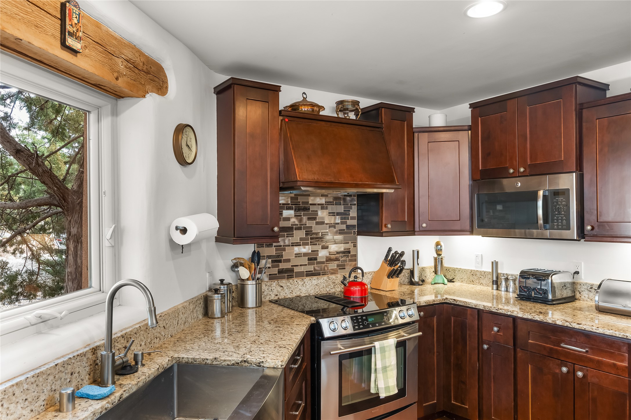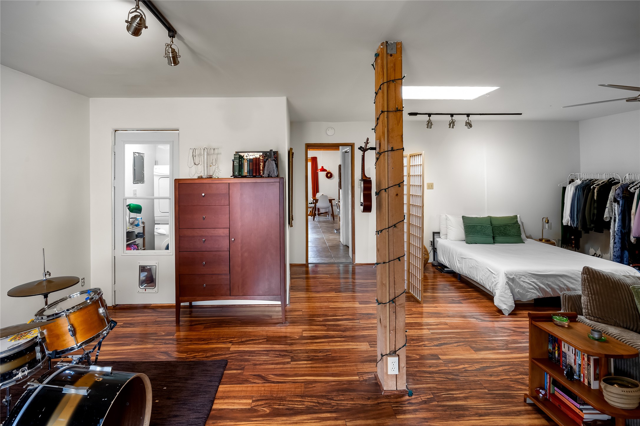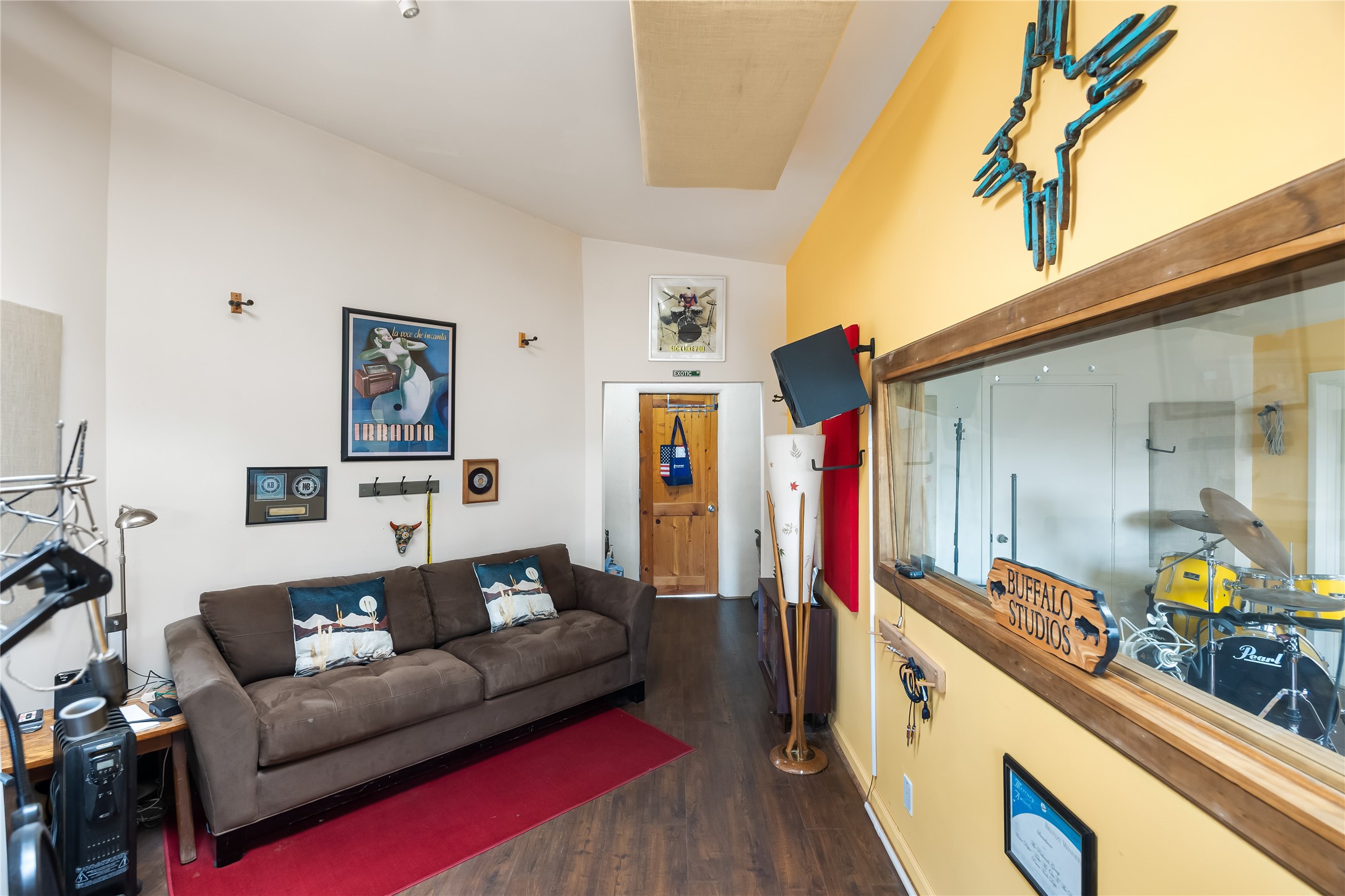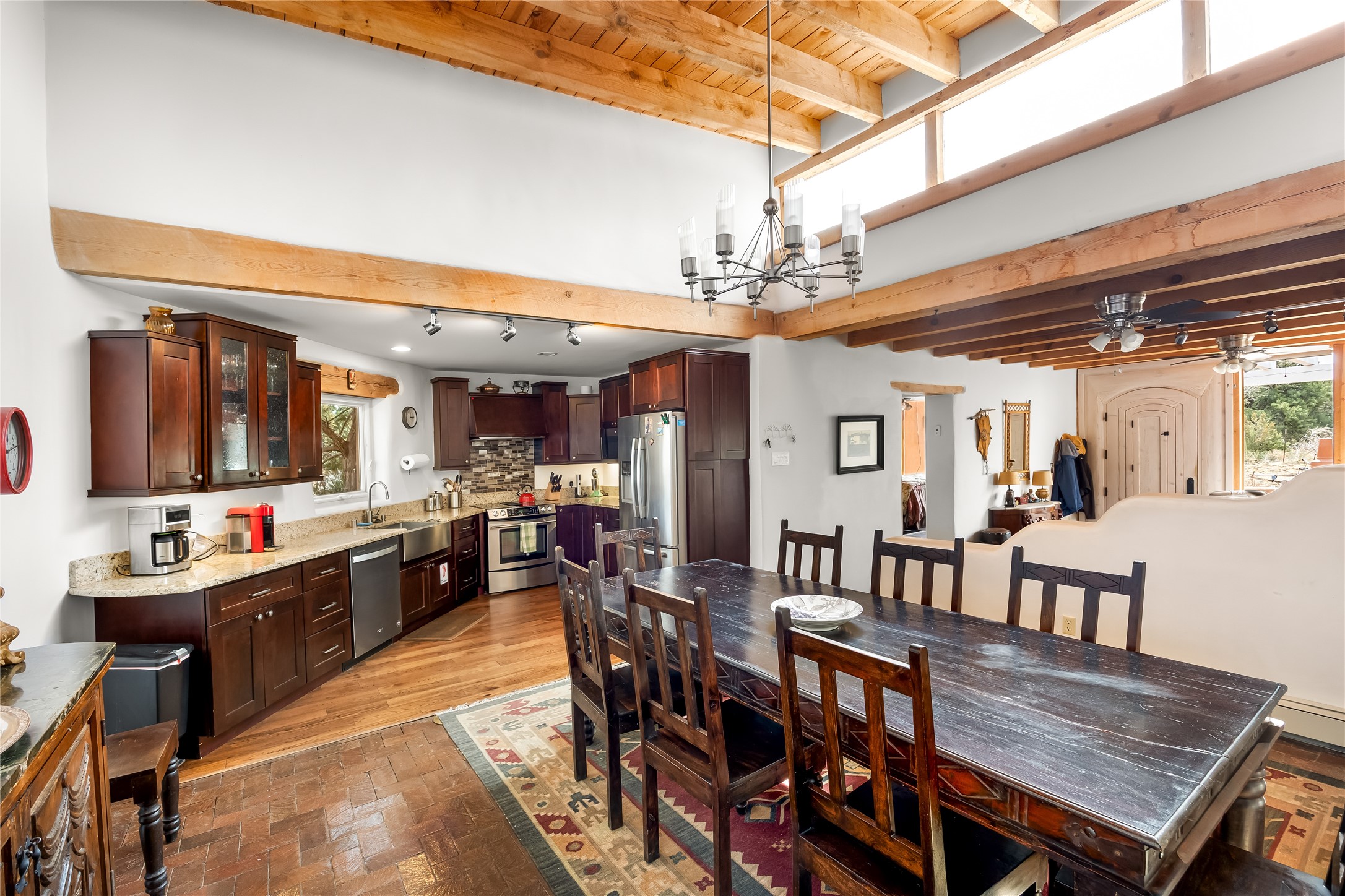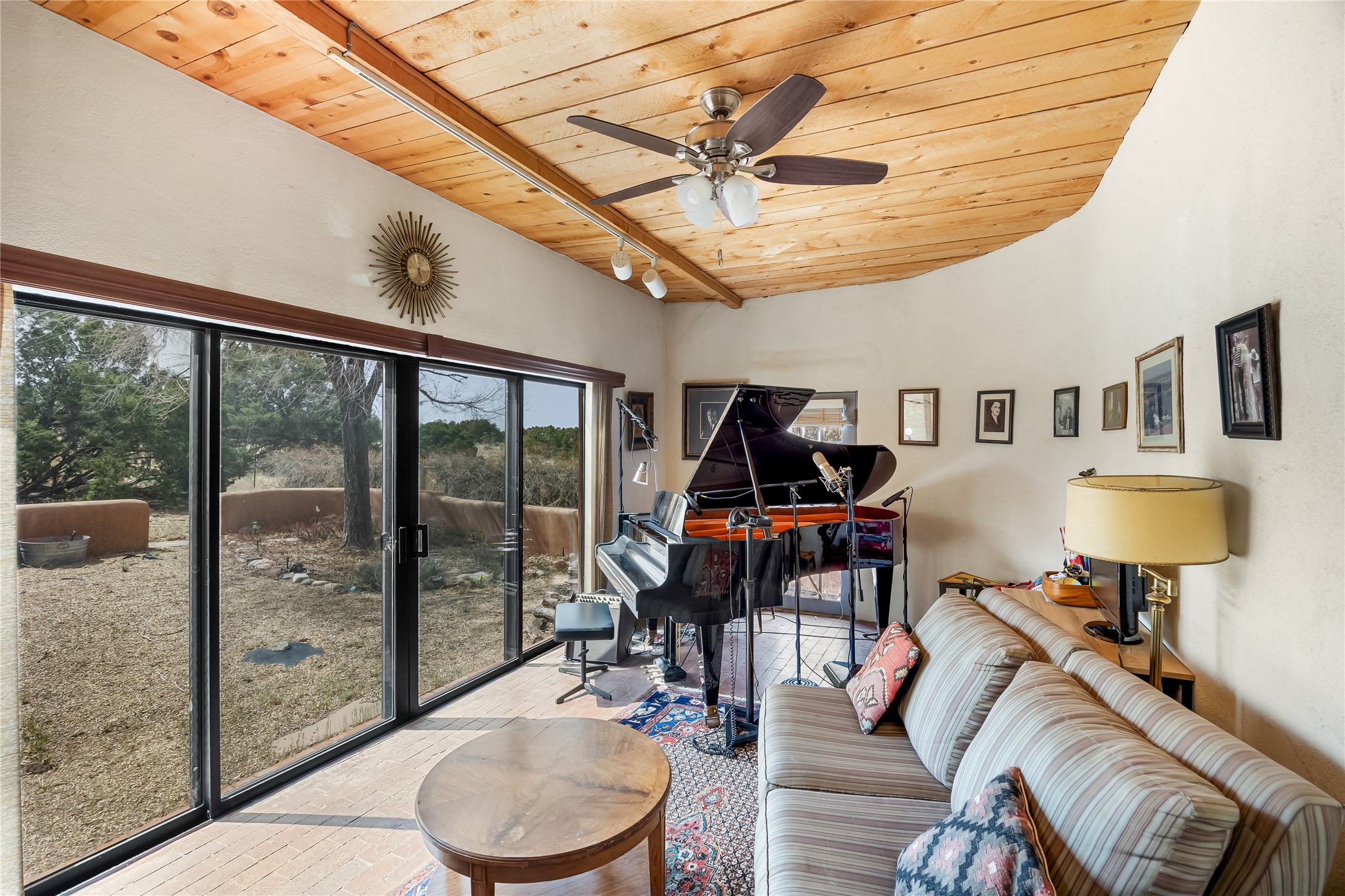 A very cool opportunity is knocking! Convenient in-town location for an adobemain home, plus a detached, spacious Guest House, plus an attached set of(unheated) studio spaces, currently used for music production, plus a detachedoutbuilding, all sited on a 1.8 acre lot! The magic begins as you enter the propertythrough a set of stylized stucco buffalo gates, built by local sculptor, Don Redman; the buffalo theme is repeated in theGuest House's entry. The main home, which has passive solar design, exudes warmth & quintessential Southwestcharm, with brick flooring, a beautifully designed kiva fireplace, high woodaccented ceilings and a Sunroom built by Tent Rock Construction.. An open floor plan and large dining room suggest wonderful times with friends and/or family!! Its two nicely sized bedrooms each featuredoors leading out to the inviting front patio; the primary bedroom also features akiva fireplace. Settings for outdoor gatherings at the home's entry abound. GuestHouse is currently leased. Property to be sold in as is condition.