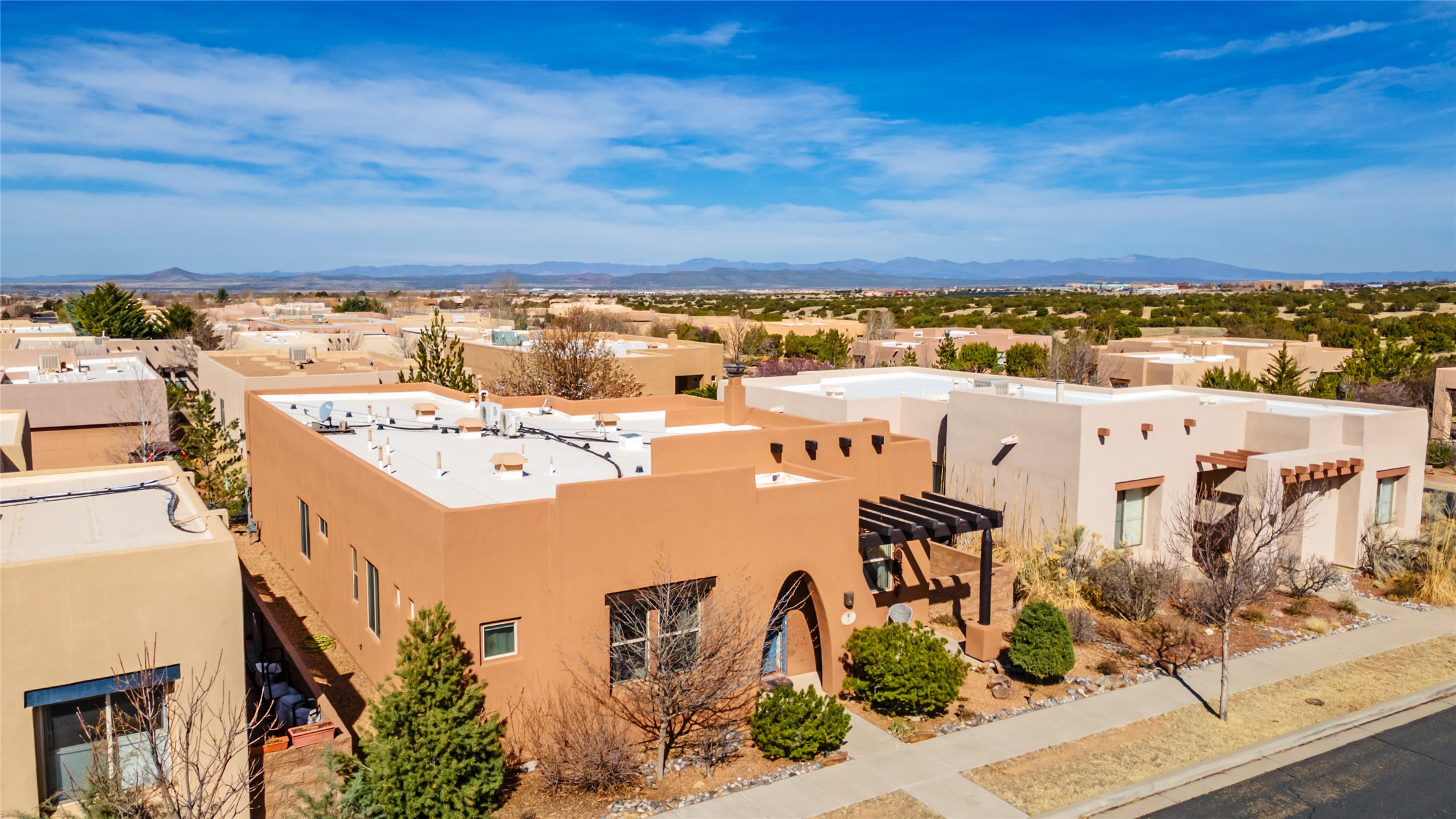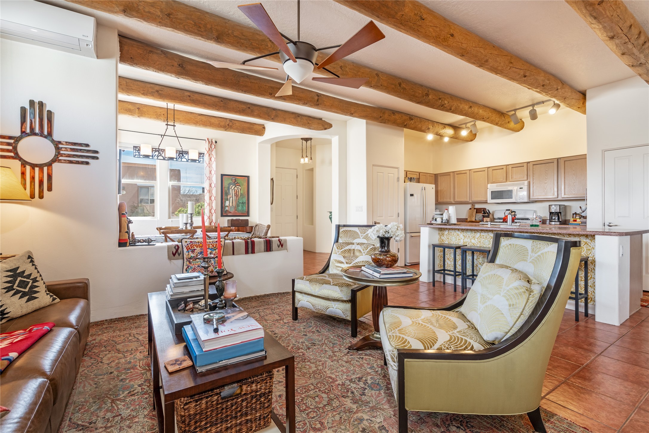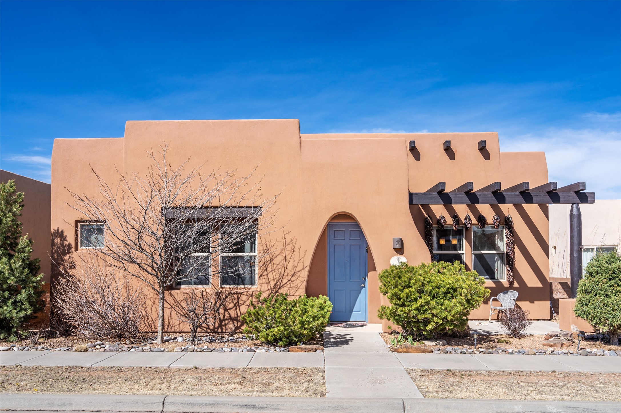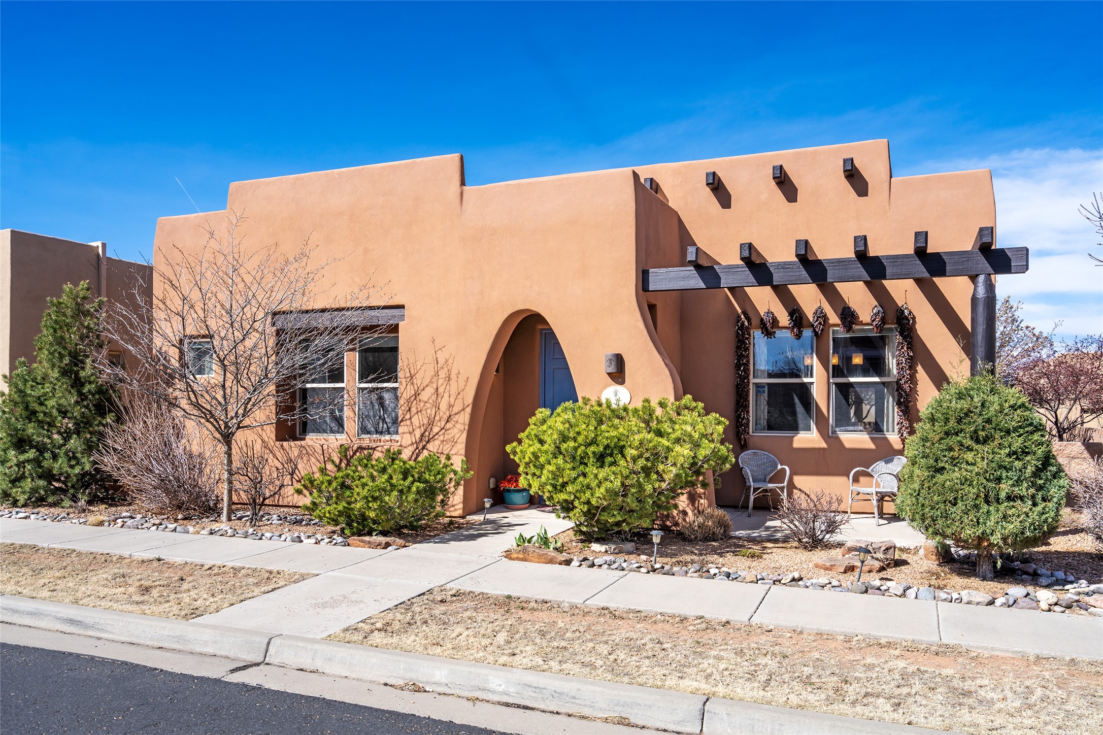 Welcome to 3 Gallina Peak, a beautifully designed home nestled in the sought-after Rancho Viejo community, just 13 miles from the historic Santa Fe Plaza. With a peak of Sangre de Cristo mountain views and a lovely private rear courtyard, this wonderful single-level residence offers both privacy and functionality. Inside, you'll find timeless Southwestern charm with tiled floors throughout, radiant heat, and mini-splits for efficient cooling. The open-concept design enhances modern living, while the wood-burning kiva fireplace and exposed vigas add warmth and character. A pony wall creates separation for the dining room while still allowing the open flow. The kitchen features a large central island and plenty of cabinet space and a pantry for storage. The primary suite is a private retreat, complete with a chic en-suite bath, a soaking tub, a separate shower, and a spacious walk-in closet. Outside, the enclosed backyard is thoughtfully landscaped with native vegetation, providing a serene outdoor space. Unique touches throughout make this home unique. Other upgrades include a high-efficiency tankless system for the radiant heat. Enjoy the Rancho Viejo lifestyle with 15+ miles of paved walking trails, several community parks, and reasonable covenants that help maintain the area's natural beauty.