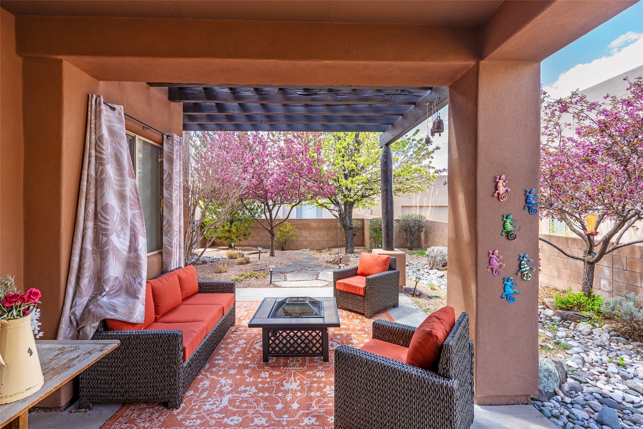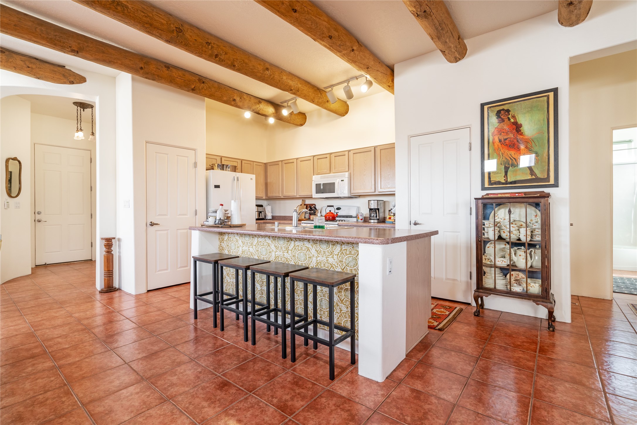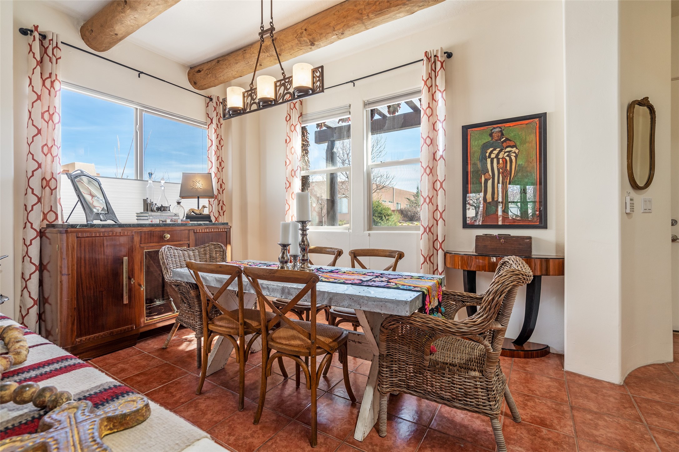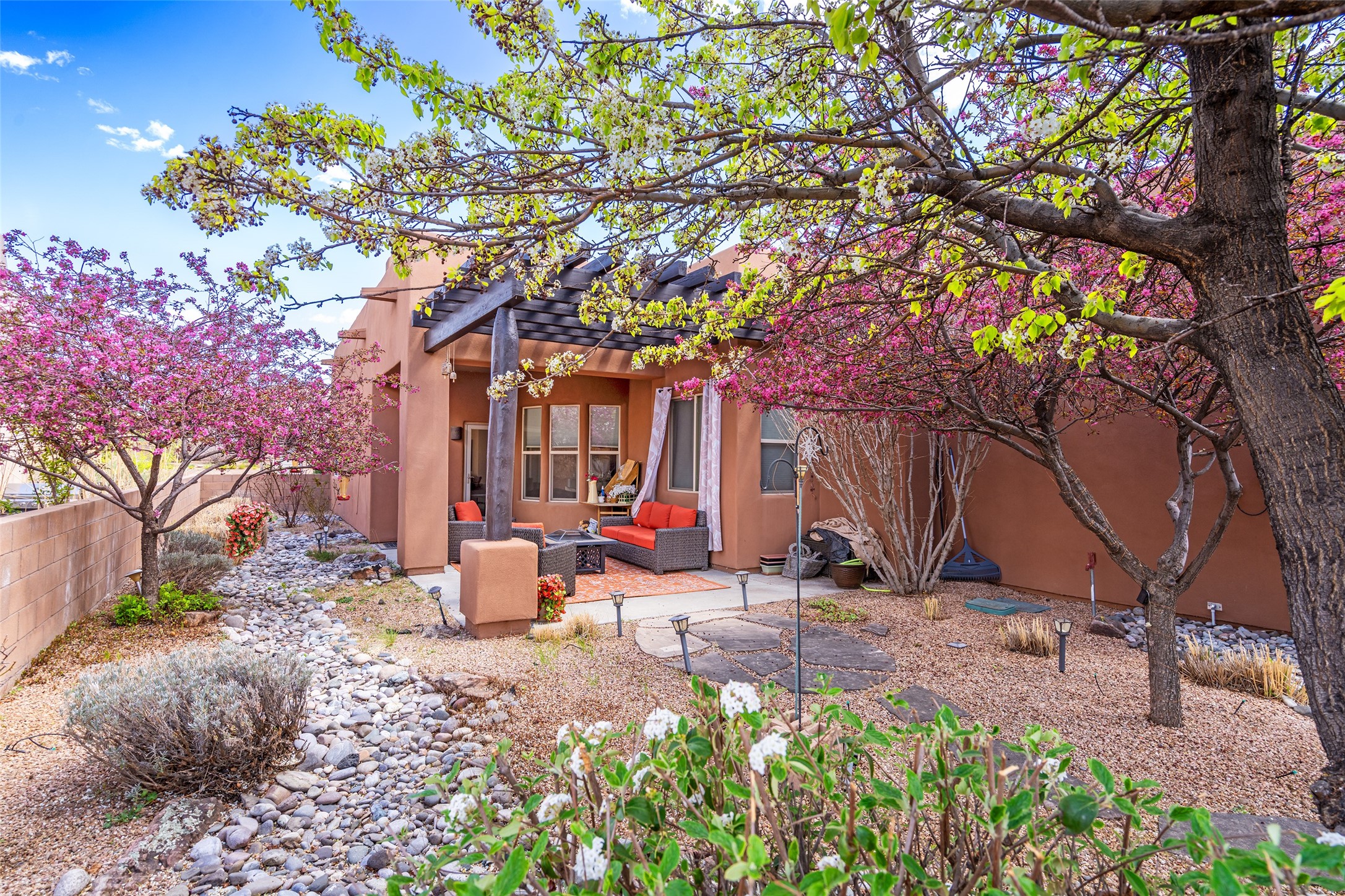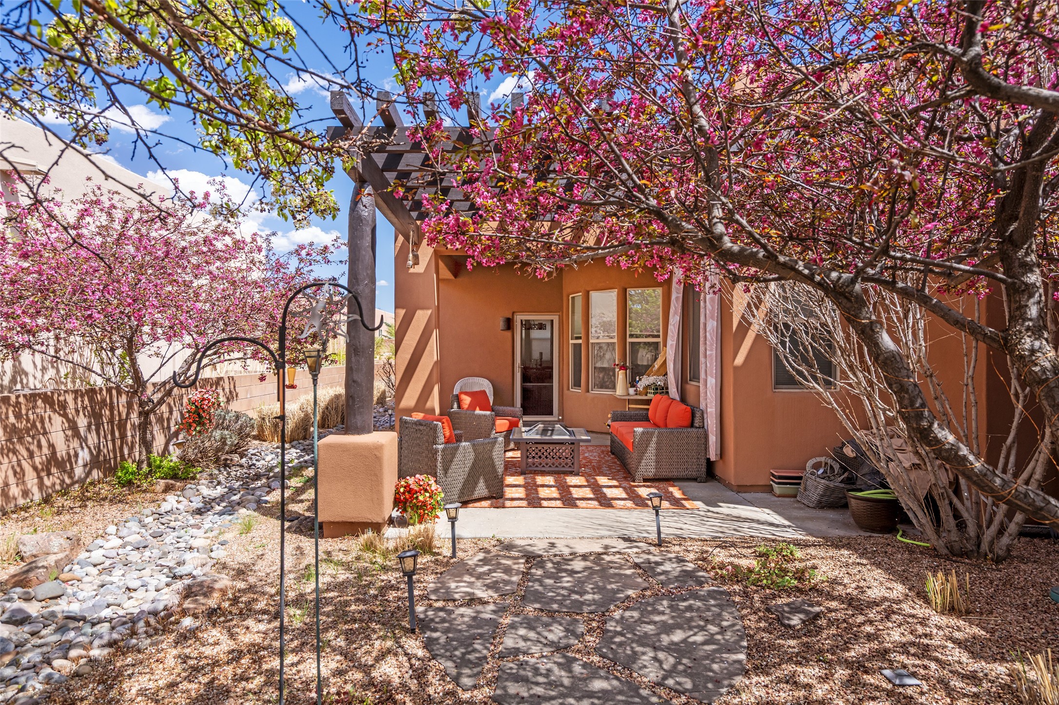 Welcome to 3 Gallina Peak, a beautifully designed home nestled in the sought-after Rancho Viejo community, just 13 miles from the historic Santa Fe Plaza. With a peak of Sangre de Cristo mountain views and a lovely private rear courtyard, this wonderful single-level residence offers both privacy and functionality. Inside, you'll find timeless Southwestern charm with tiled floors throughout, radiant heat, and mini-splits for efficient cooling. The open-concept design enhances modern living, while the wood-burning kiva fireplace and exposed vigas add warmth and character. A pony wall creates separation for the dining room while still allowing the open flow. The kitchen features a large central island and plenty of cabinet space and a pantry for storage. The primary suite is a private retreat, complete with a chic en-suite bath, a soaking tub, a separate shower, and a spacious walk-in closet. Outside, the enclosed backyard is thoughtfully landscaped with native vegetation, providing a serene outdoor space. Unique touches throughout make this home unique. Other upgrades include a high-efficiency tankless system for the radiant heat. Enjoy the Rancho Viejo lifestyle with 15+ miles of paved walking trails, several community parks, and reasonable covenants that help maintain the area's natural beauty.