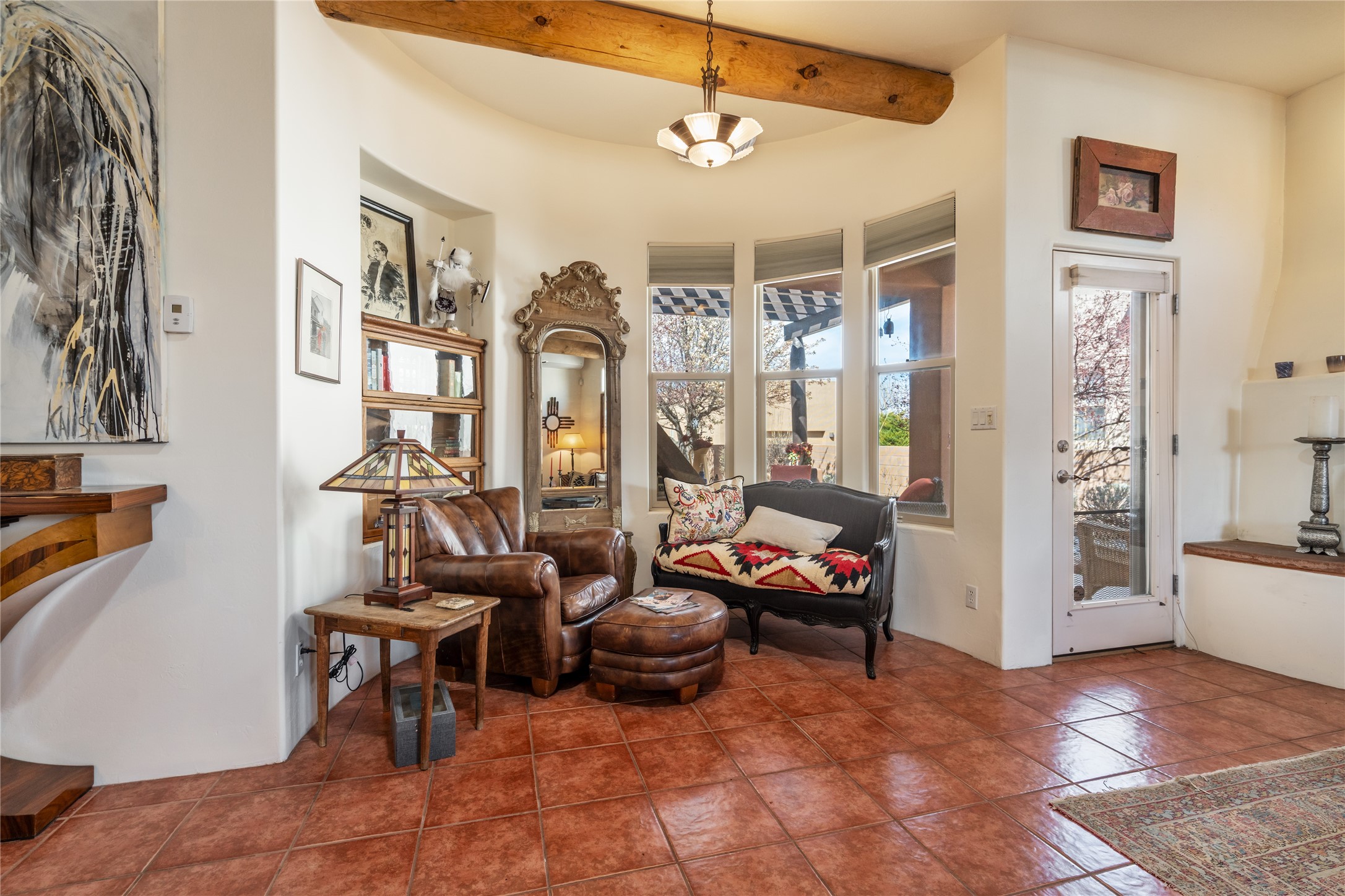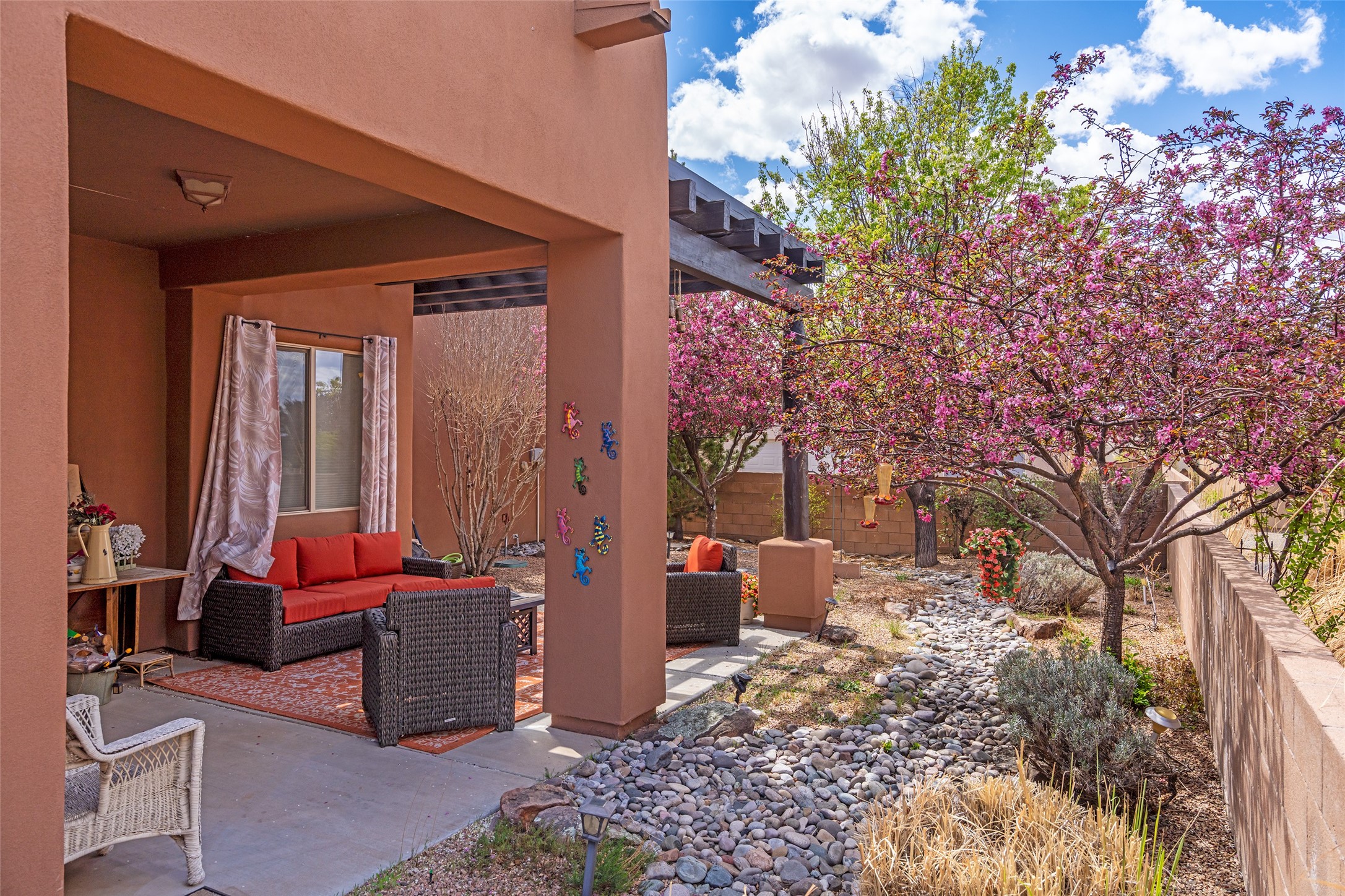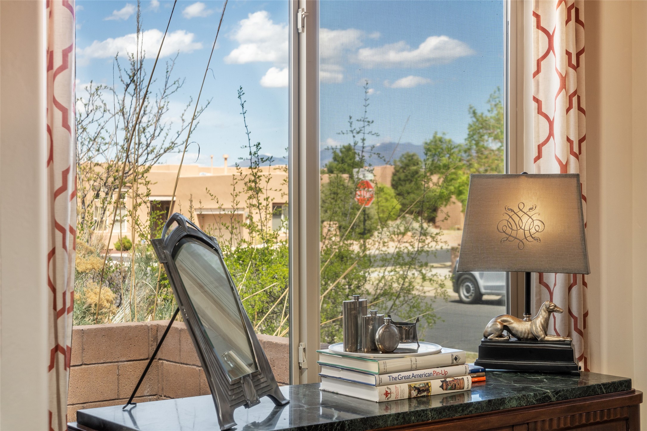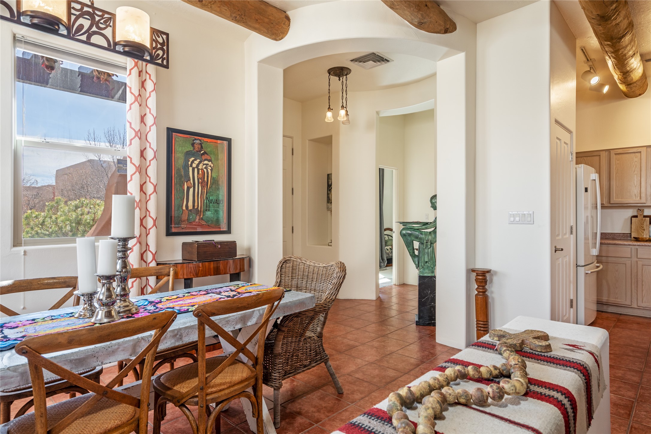 Welcome to 3 Gallina Peak, a beautifully designed home nestled in the sought-after Rancho Viejo community, just 13 miles from the historic Santa Fe Plaza. With a peak of Sangre de Cristo mountain views and a lovely private rear courtyard, this wonderful single-level residence offers both privacy and functionality. Inside, you'll find timeless Southwestern charm with tiled floors throughout, radiant heat, and mini-splits for efficient cooling. The open-concept design enhances modern living, while the wood-burning kiva fireplace and exposed vigas add warmth and character. A pony wall creates separation for the dining room while still allowing the open flow. The kitchen features a large central island and plenty of cabinet space and a pantry for storage. The primary suite is a private retreat, complete with a chic en-suite bath, a soaking tub, a separate shower, and a spacious walk-in closet. Outside, the enclosed backyard is thoughtfully landscaped with native vegetation, providing a serene outdoor space. Unique touches throughout make this home unique. Other upgrades include a high-efficiency tankless system for the radiant heat. Enjoy the Rancho Viejo lifestyle with 15+ miles of paved walking trails, several community parks, and reasonable covenants that help maintain the area's natural beauty.