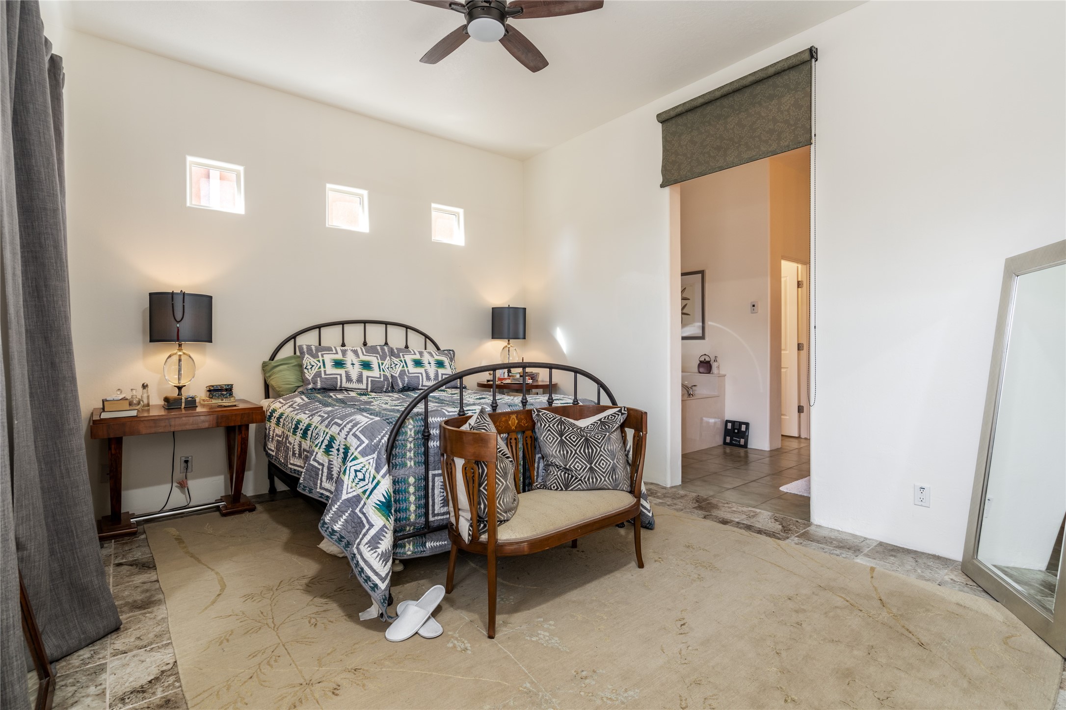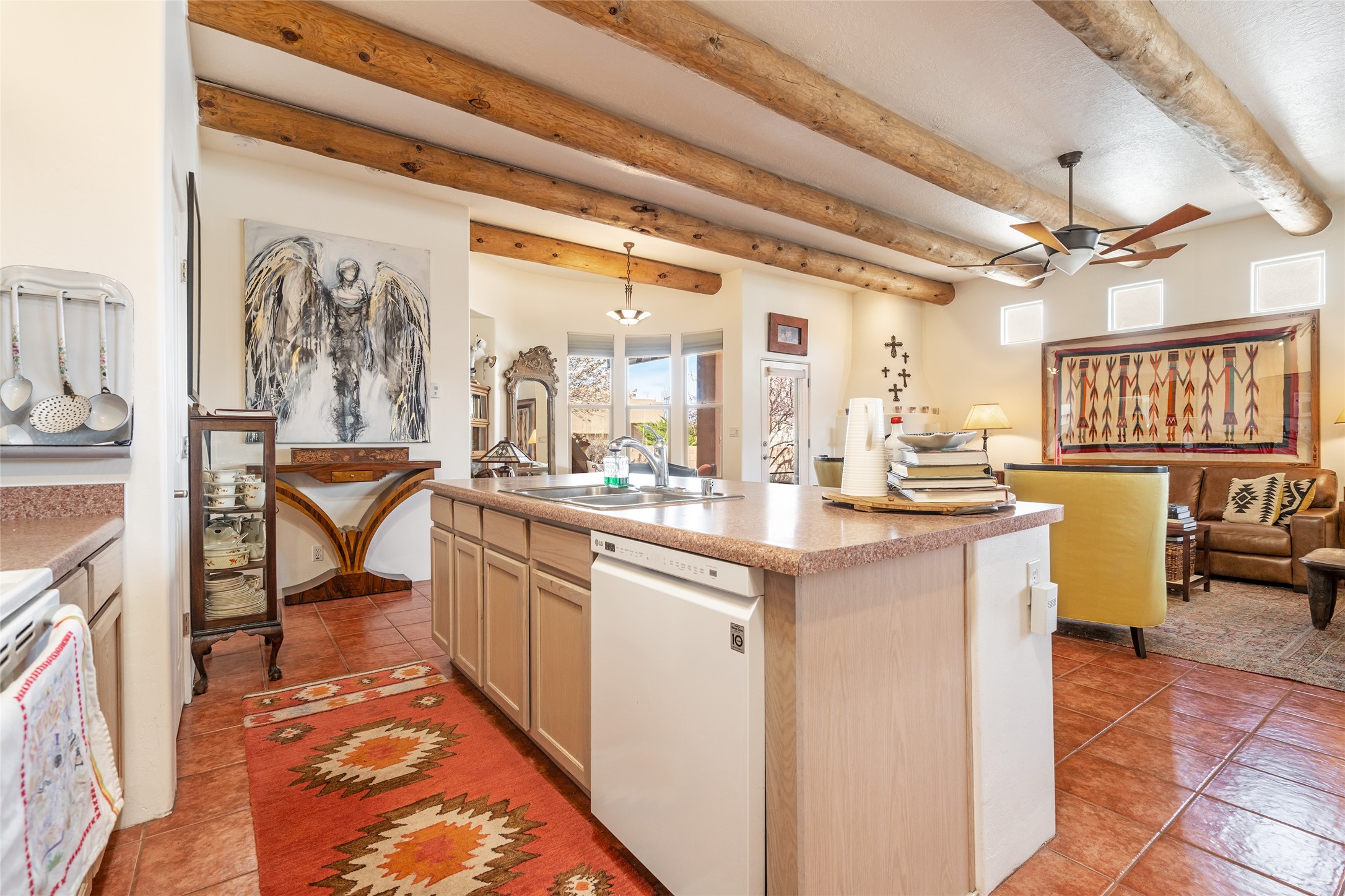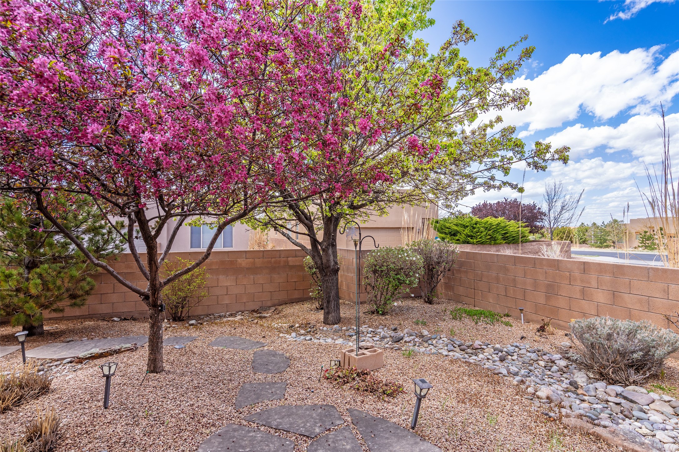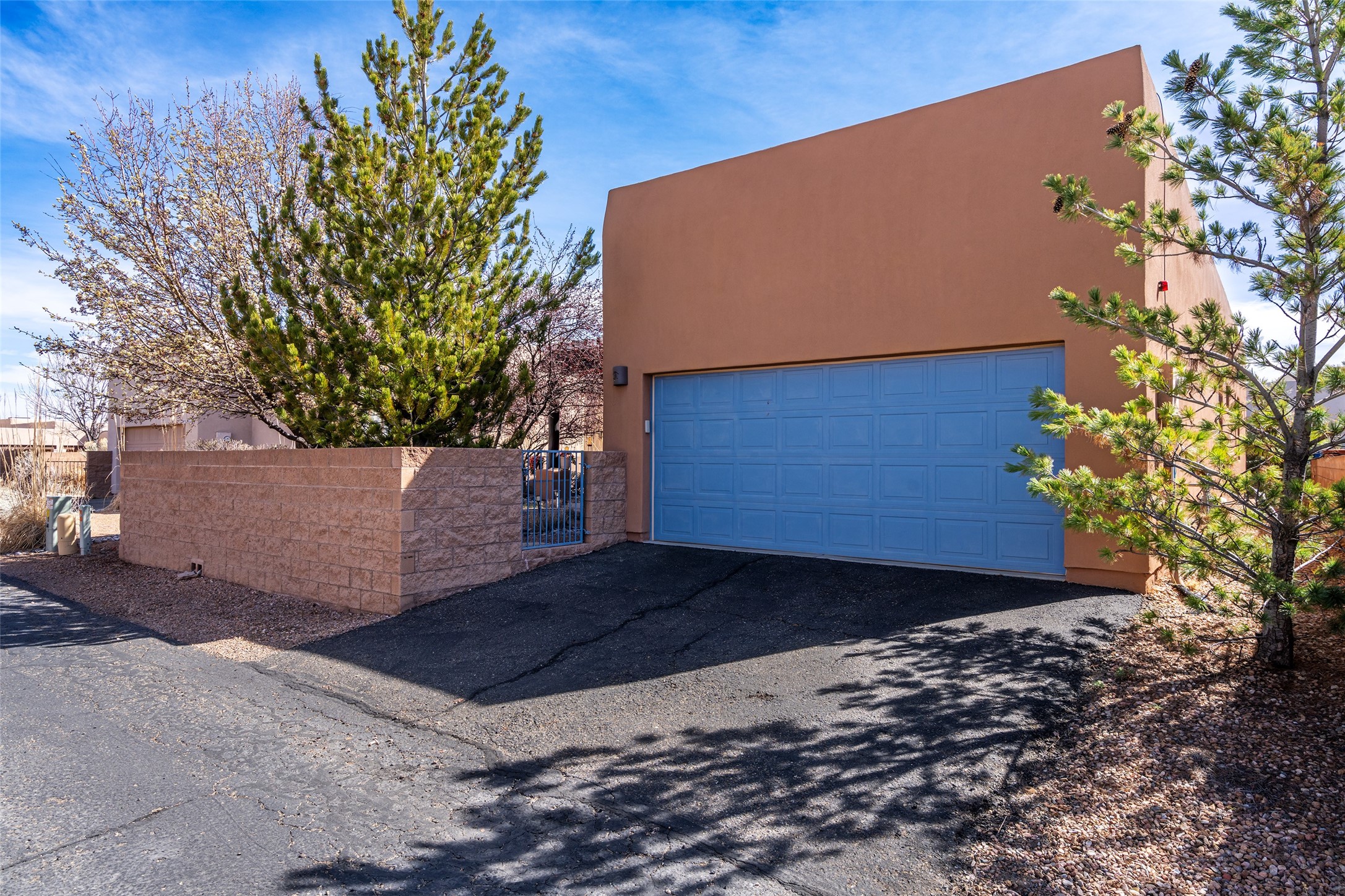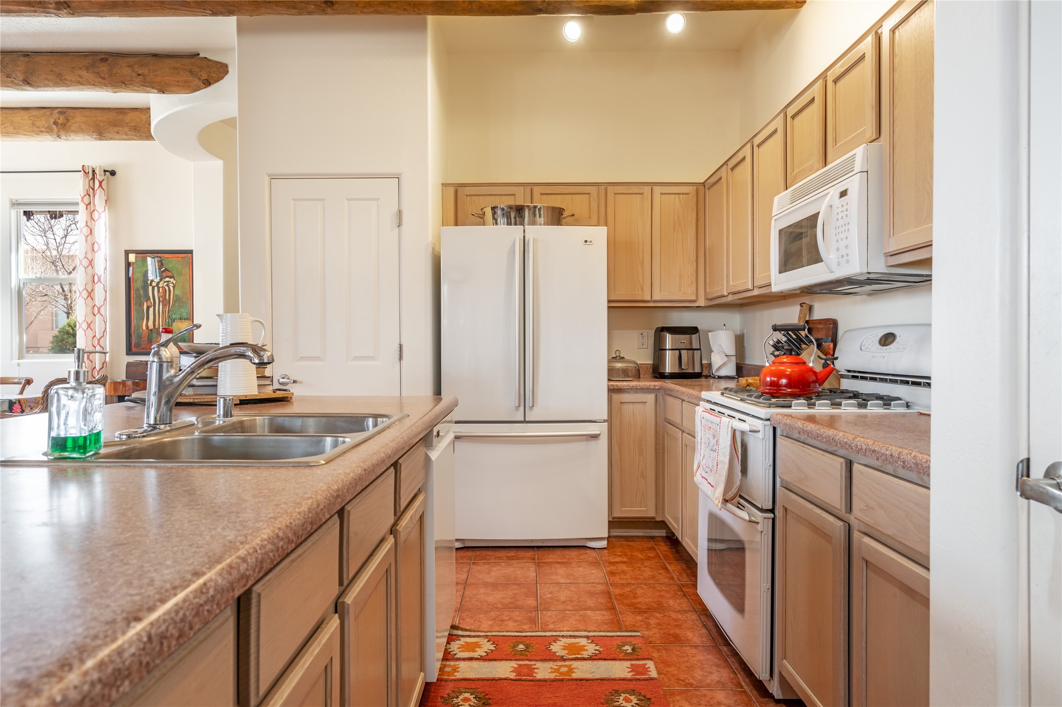 Welcome to 3 Gallina Peak, a beautifully designed home nestled in the sought-after Rancho Viejo community, just 13 miles from the historic Santa Fe Plaza. With a peak of Sangre de Cristo mountain views and a lovely private rear courtyard, this wonderful single-level residence offers both privacy and functionality. Inside, you'll find timeless Southwestern charm with tiled floors throughout, radiant heat, and mini-splits for efficient cooling. The open-concept design enhances modern living, while the wood-burning kiva fireplace and exposed vigas add warmth and character. A pony wall creates separation for the dining room while still allowing the open flow. The kitchen features a large central island and plenty of cabinet space and a pantry for storage. The primary suite is a private retreat, complete with a chic en-suite bath, a soaking tub, a separate shower, and a spacious walk-in closet. Outside, the enclosed backyard is thoughtfully landscaped with native vegetation, providing a serene outdoor space. Unique touches throughout make this home unique. Other upgrades include a high-efficiency tankless system for the radiant heat. Enjoy the Rancho Viejo lifestyle with 15+ miles of paved walking trails, several community parks, and reasonable covenants that help maintain the area's natural beauty.