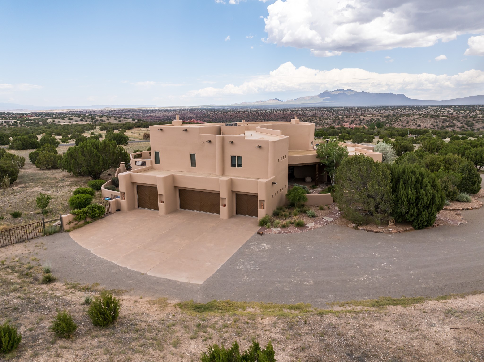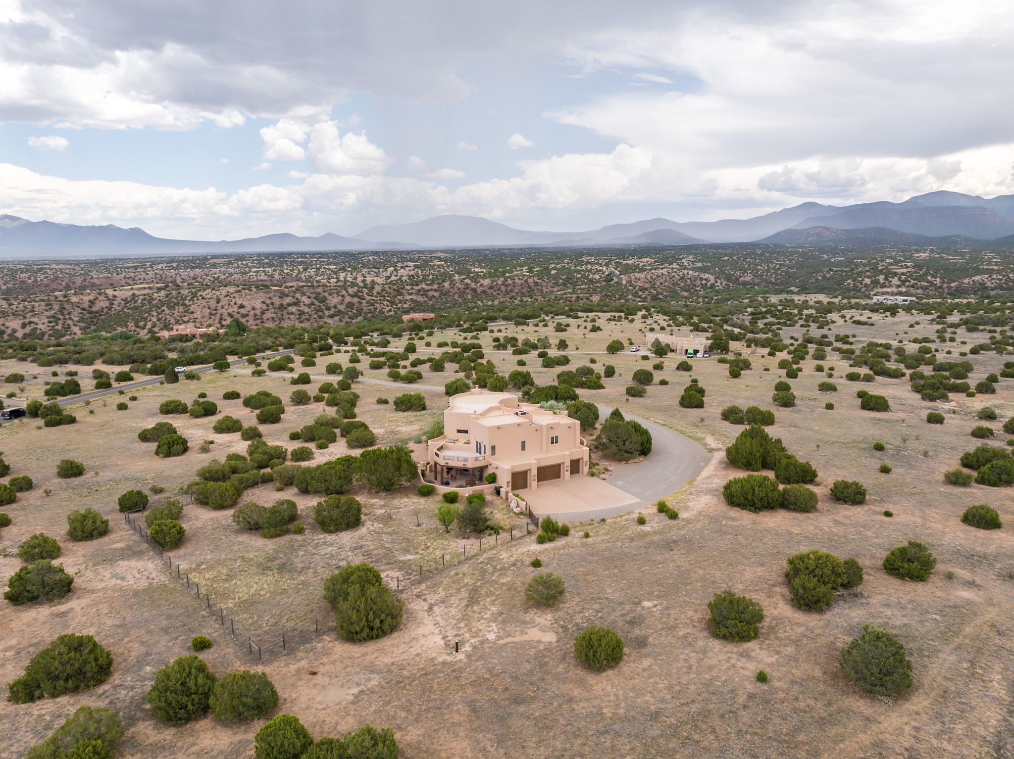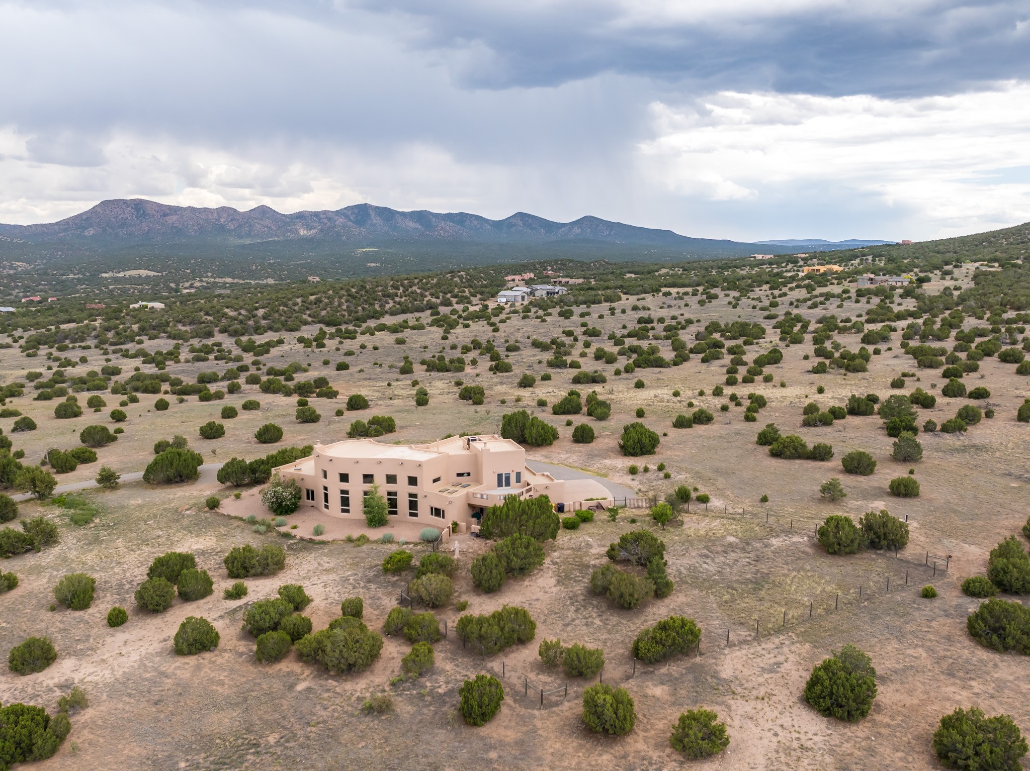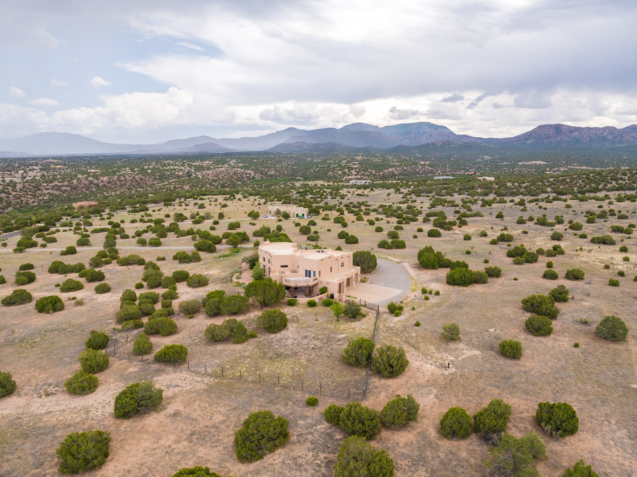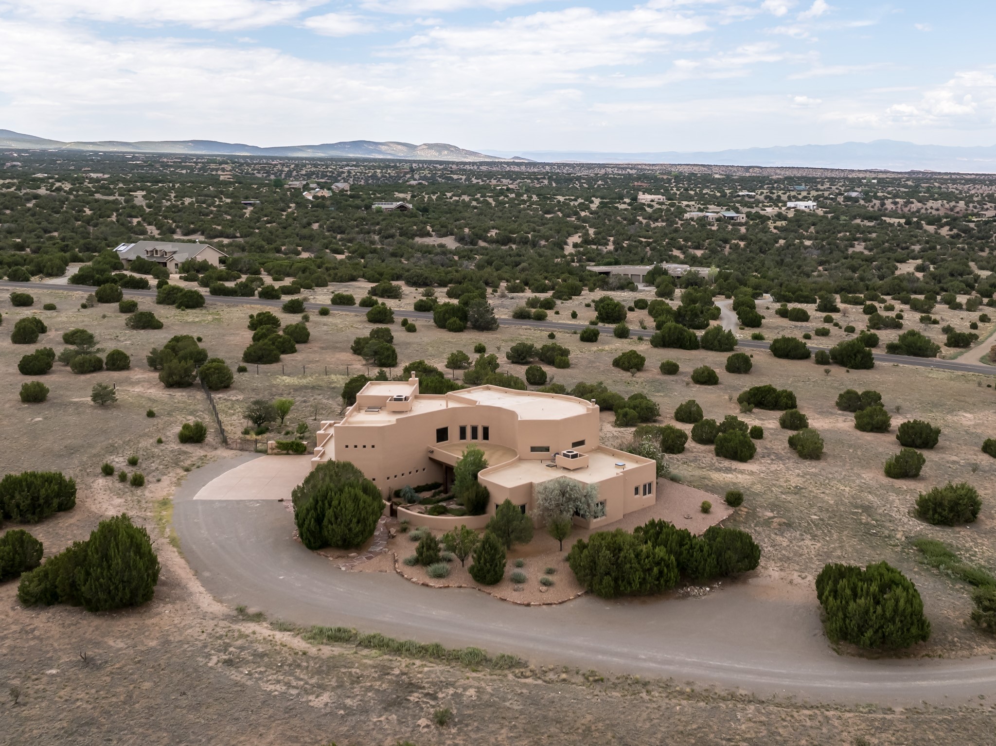 Imagine a home designed to capture the essence of East Mountain living on 10 acres, where expansive walls of glass blur the lines between indoors & out. This custom-built masterpiece boasts soaring ceilings with handcrafted wood beams that amplify light and openness, while every window offers a breathtaking vista. This beauty with a fabulous open floor plan, originally built for the builder, with many custom features. Certified Green Build with ICF Construction and Turkish travertine floors, Pella wood windows, magnificent 22' Kiva in Living room, Chef's kitchen with high-end Kitchen Aid appliances, Thermador Professional range, tons of counter space & butcher block island. Covered patio with kiva fireplace, 4-car oversized garage, fenced yard (2/3 ac) Roof-top deck on 10 acres.