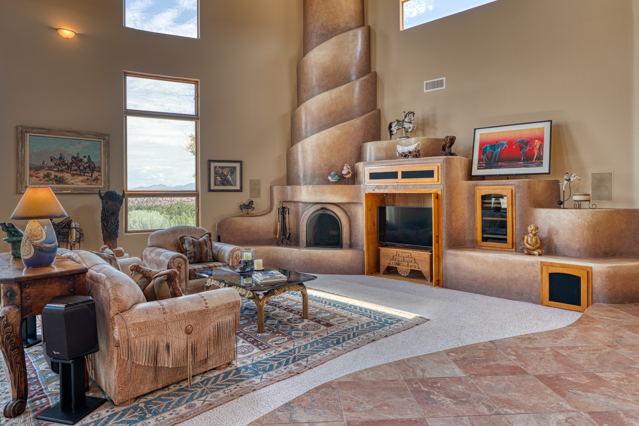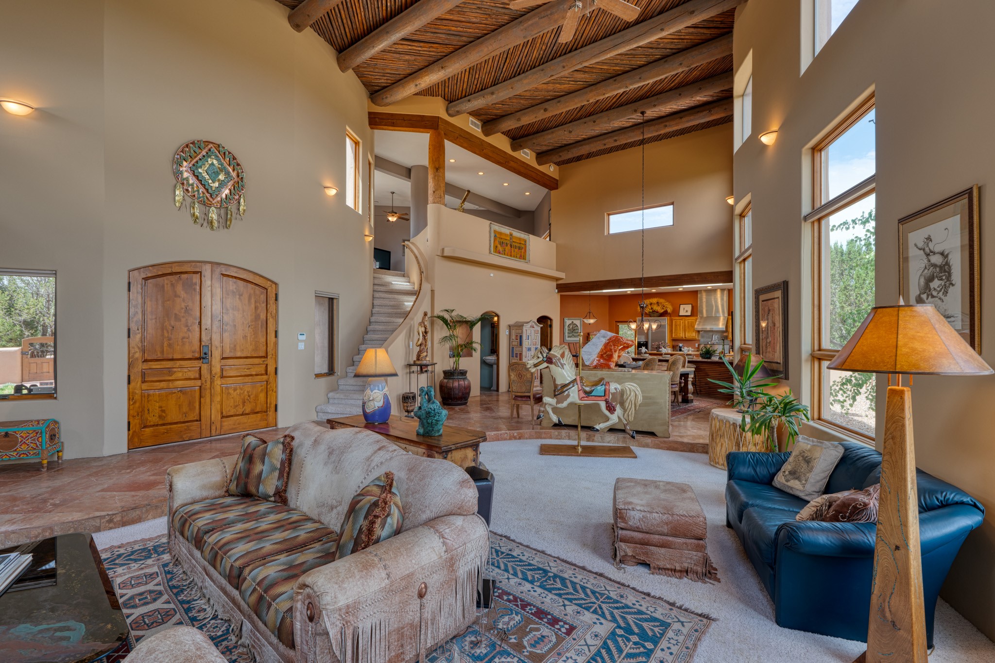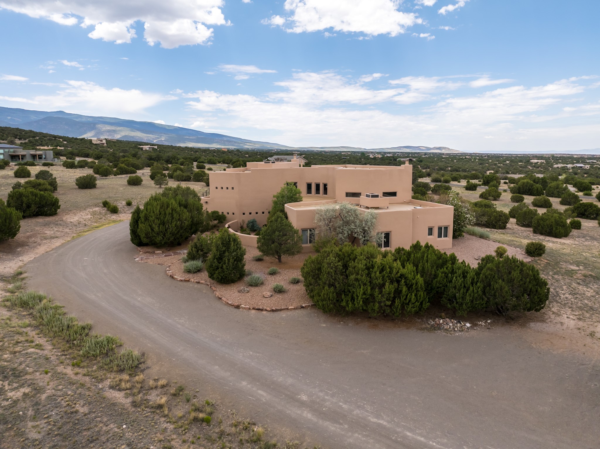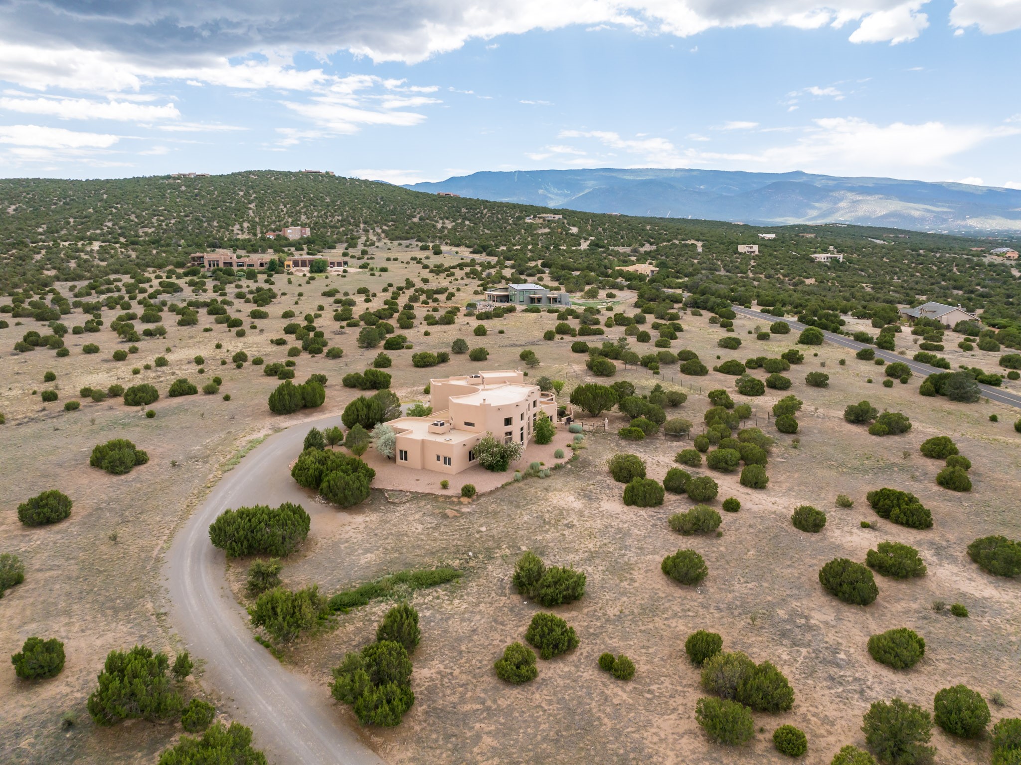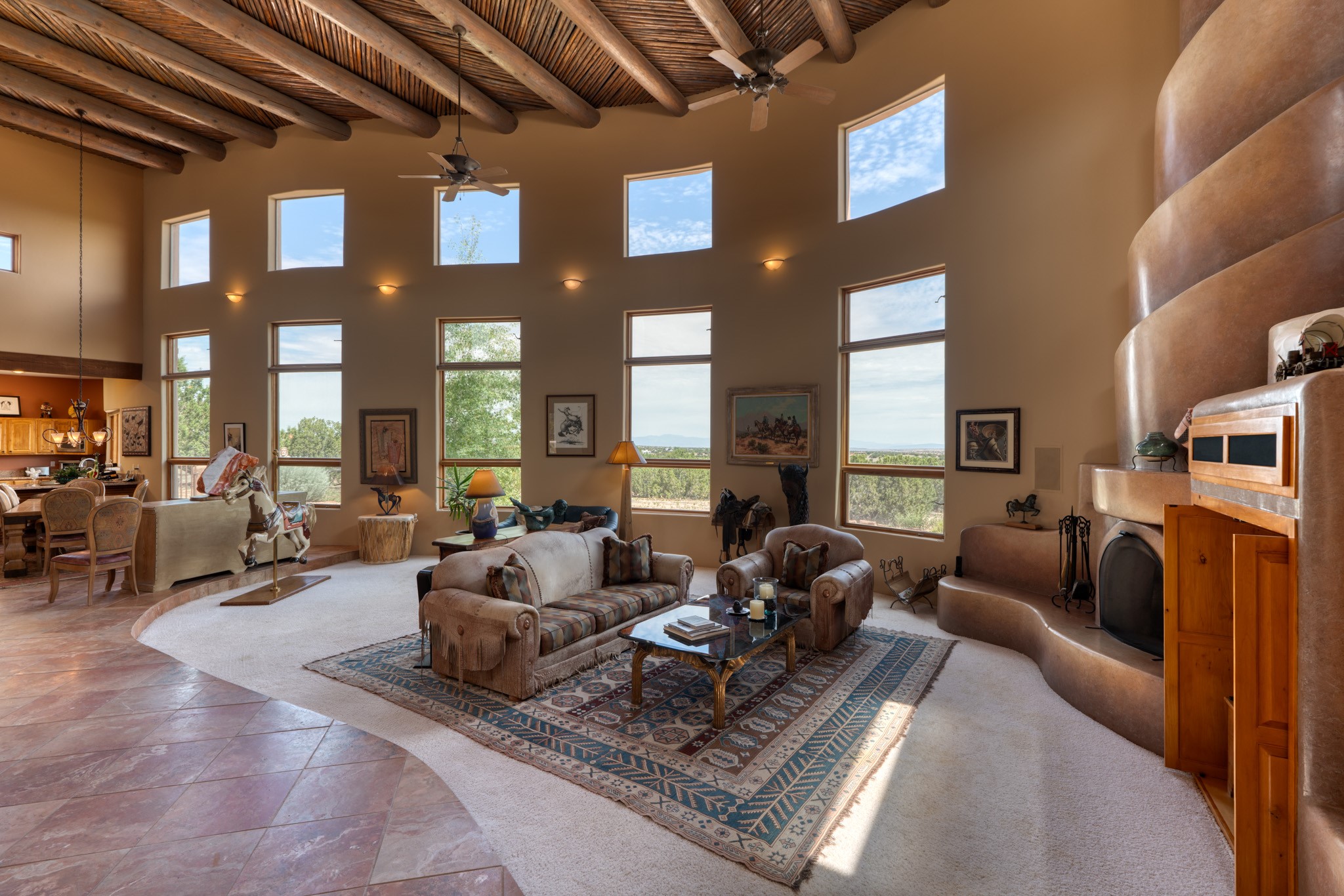 Imagine a home designed to capture the essence of East Mountain living on 10 acres, where expansive walls of glass blur the lines between indoors & out. This custom-built masterpiece boasts soaring ceilings with handcrafted wood beams that amplify light and openness, while every window offers a breathtaking vista. This beauty with a fabulous open floor plan, originally built for the builder, with many custom features. Certified Green Build with ICF Construction and Turkish travertine floors, Pella wood windows, magnificent 22' Kiva in Living room, Chef's kitchen with high-end Kitchen Aid appliances, Thermador Professional range, tons of counter space & butcher block island. Covered patio with kiva fireplace, 4-car oversized garage, fenced yard (2/3 ac) Roof-top deck on 10 acres.